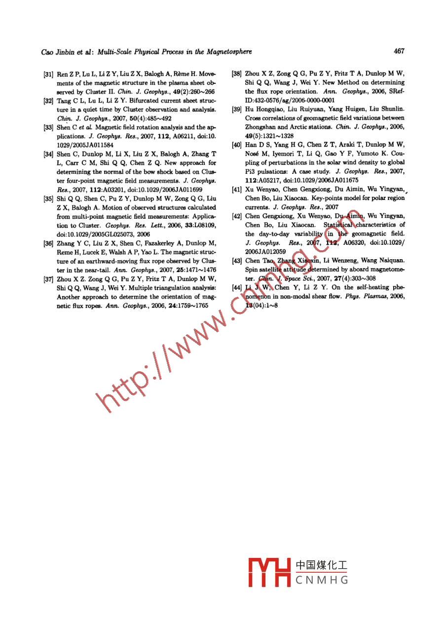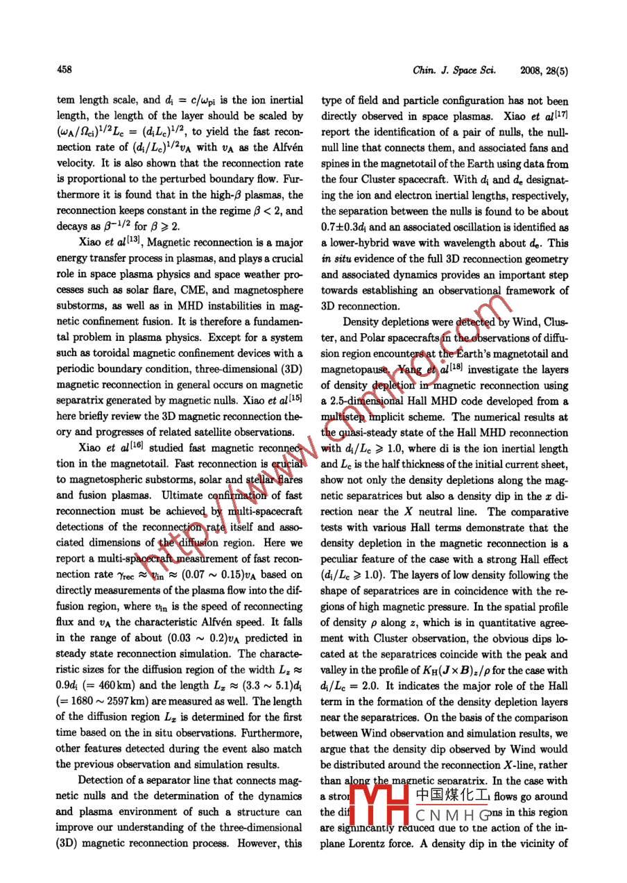 0254-6124/2008/28(5)-454-14Chin. J. Space Sci.Cao Jinbin, Liu Zhenxing. Multi-scale physical proces in the magnetoephere. Chin. J. Space Sei, 2008, 28(6): 454~467Multi-Scale Physical Process in the Magnetosphere*CAO JinbinLIU Zhenxing(State Key Labonatory for Space Weather, Center for Space Sciences and Applied Reseanch,Chinese Academy of Sciences, Beijing 100190)Abstract The brief report presents a part of the research results of the magnetospheric pbysicsresearches in China during the period of 2006- -2008. During the past two years, China-ESA cooperation DSP (Double Star Program) satellites were basically operating normally in its extendedlifetime. The DSP and Cluster missions provide Chinese space physicists high quality data to studymulti-scale physical process in the magnetosphere. The work made based on the data of DSP ispresented in the paper of“Progress of Double Star Program" of this issue.Key words Magnetosphere, Progres1 Geomagnetic Stormsnightside had the nearly same waveforms a8 those ob-served on the ground in the H (northward) compo-Wang et al[1 make a statistical survey of Interplane-ent. We suggest that the SCs observed by Oerstedtary (IP) shocks and Storm Sudden Commencements on the nightside were dominantly c8used by the en-(SSCs) observed between 1995 and 2004. We find hanced magnetopause currents, which were transmit-that 75% of sSCs are associated with shocks, consis-ted by the compressional bydromagnetic waves, andtent with previous work. We use this survey to inves the efectst of the lonospheric Current (IC) were neg-tigate the efect of the interplanetary shock strength ligible on the nightside. The SC waveforms observedand orientation on the SSC rise time. We find that by Oersted on the dayside were apparently diferentthe higher the speed of an IP shock, the less timefrom those observed on the ground. Near the Day-it takes to sweep by the magnetosphere, and thus side Dip Equator (DDE), corresponding to Prelimi-the shorter the rise time of the corresponding SsC.nary Reverse Impulses (PRIs) observed in the groundThe orientation of an IP shock also efectse the SsC H component, Oersted always observed positive im-rise time. Generally speaking, a highly oblique shock pulses in the B11 component, which suggest that thecauses asymmetric compression of the magnetosphere PRIs at the DDE are generated by westward IC8. Onwith respect to the noon -midnight meridian, takes the dayside, corresponding to positive Main Impulsesmore time to sweep by magnetosphere, and thus re(MIs) of SCs observed in the ground H component,sults in a longer rise time of the SSC.the Oersted B11 component always presented clearOersted is a low-altitude (638~849km) polar-decreases, which implies that an eastward IC was ex-orbiting setllite. Using vector magnetic field mea- cited after the PRI. The generation mechanism forsurements obtained from Oersted, Han et al[2the westward and eastward ICs are discussed accord-identified more than 20 geomagnetic Sudden Com-ing to previously proposed models. On the dayside,mencement (SC) events on both dayside (06:00- we suggest that the waveforms observed both on the18:00MLT) and nightside (18:00- -06:00MLT). The ground and at Oersted during the time period of PRIunique properties reflected by these events have never and Nincident compres-been reported before. The SC& observed by Oer-sional中國(guó)煤化工d caused by thested in the B11 (compressional) component on the IC8. 1YHCNMHGedjustabovethe* Supported by the National Natural Science Foundation of China (40390153, 40523006) and 973 Program (2006CB806305)Received 2008-05-10Cao Jinbin et al: Multi- Scale Physical Proce8s in the Magnetophere455ionosphere are significant complementary to our em- by the LANL-97A satllite on 14 June 1998 is 7.1 Re,pirical knowledge for SCs.and the injection time agrees well with the substormonset time identified by the Polar Utraviolet Imager.The method has been applied to an event happened at2 Magnetospheric Substorms22:54 UT on 11 March 1998, when both the satellitesThe properties of proton (0eV < E < 40keV) in the(1991-080 and LANL-97A) observed the dispersion-less character. The results indicate that the radialplasma sheet are examined by He et al3] by meansdistance of injection source locates at 8.1 Re at mag-of a superposed epoch analysis, using 115 magneto-netotail, and particles move earthward from magnetail plasma injection events which are identifed fromtotail into inner magnetosphere at 22:30UT.Cluster magnetotail orbit time in between 2001 andBasing on the data from three stllites of Clus-2004. All events distribute in magnetic local timefrom 20:00UT to 04:00UT. Five clases of magneto-ter (C1, C3 and C4) in the year of 2001 and 2002, Matail injection events are found to be similar with theet al5 examine the relationship between the Rapidgeosynchronous observation: (1) pure ion injections;Convection Event (RCE) and substorm. The observa-(2) ion injections followed a few minutes later by antion of RCE measured by single satellite is not exactlyelectron injection; (3) simultaneous ion and electronwhat happened in the magnetotail. Both C1 and C3injections; (4) electron injections followed a few min-observed the event occurring on July 25, 2002, bututes later by an ion injection; (5) pure electron in-C4 did not. Among the 306 RCEs jointly measuredjections. Proton shows a significant increase in tem-by three satellites, 215 ones were obeerved by C1.perature and density at the onset, and injects earth-C3 and C4 obtained 266 and 227 ones respectively.ward with an increasing velocity more than the pre-The average duration of RCE in the magnetosphereinjection average one. Superposed epoch analysis oncan't be really represented by the outcome surveyedthe simultaneous observation data of dusk -dawn elec-by single satellite. So our analysis has shown thattric field from the EFW (Electric Field and Waves)RCE transports more fractions of energy and mag-instrument, we found two