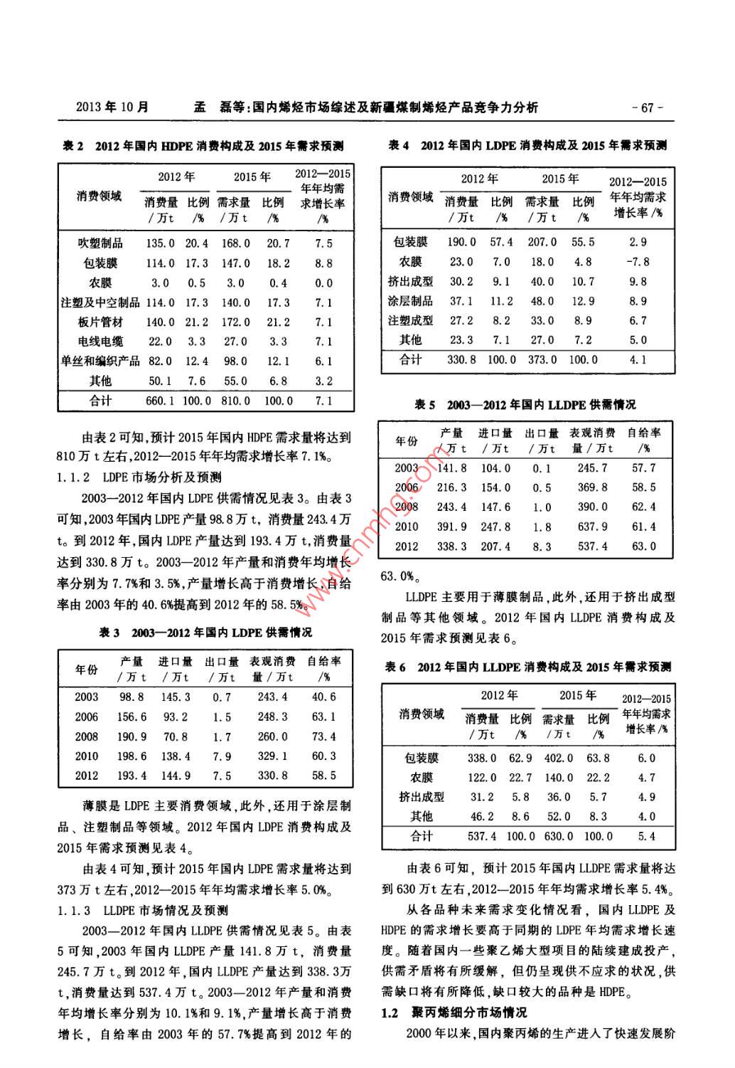 2013年10月孟磊等:國內(nèi)烯烴 市場綜述及新疆H煤制烯烴產(chǎn)品競爭力分析67 -表22012 年國內(nèi)HDPE消費構(gòu)成及2015年需求預(yù)測表42012 年國內(nèi)LDPE消費構(gòu)成及2015年需求預(yù)測2012年2015年2012- -2015年年均需消費領(lǐng)域消費量比例需求量比例求增長率消費量比例需求量比例年年均需求/萬t /% /萬t /9/9增長率/%吹塑制品135.0 20.4 168.0 20. 77. 5包裝膜190.0 57.4 207.0 55. 52.9包裝膜114.0 17.3 147.0 18. 28.8農(nóng)膜23.0 7.0 18. 03.0 0.5 3.0 0. ,0.0擠出成型30.2 9.1 40.0 10.79.8注塑及中空制品114.0 17.3 140.0 17.37.1涂層制品37. 18.9板片管材140.0 21.2 172.0 21.2注塑成型27.2 8.2 33. 06.7電線電纜22.0 3.3 27.0 3.3其他23.3 7.1 27.0 7.2單絲和編織產(chǎn)品82.0 12.4 98.0 12.6.1合計330.8 100.0 373.0 100.04.150.17.6 55.0 6.83. 2660.1 100.0 810.0 100. 0表52003- -2012年國內(nèi)LLDPE供需情況由表2可知,預(yù)計2015年國內(nèi)HDPE需求量將達(dá)到年份產(chǎn)量進口量出口量表觀消費自給率/萬t/萬t/萬t量/萬t/%810萬t左右,2012- -2015 年年均需求增長率7.1%。,2003141.8 104.0 0.1245. 757. 71.1.2 LDPE 市場分析及預(yù)測2006 216.3 154.0 0. 5369. 858. 52003- -2012 年國內(nèi)LDPE供需情況見表3。由表32008 243.4 147.6 1. 0390. 062. 4可知,2003年國內(nèi)LDPE產(chǎn)量98.8萬t,消費量243.4萬2010 391.9 247.8 1. 8637. 961.4t。到2012年,國內(nèi)LDPE產(chǎn)量達(dá)到193.4萬t,消費量2012 338.3 207.4 8. 3537.4.63. 0達(dá)到330.8萬t。2003- -2012 年產(chǎn)量和消費年均增長率分別為7.7%和3.5%,產(chǎn)量增長高于消費增長,自給.63. 0%。LLDPE主要用于薄膜制品,此外,還用于擠出成型率由2003年的40. 6%提高到2012年的58. 5%。制品等其他領(lǐng)域。2012 年國內(nèi)LLDPE消費構(gòu)成及表32003- -2012 年國內(nèi)LDPE供需情況2015年需求預(yù)測見表6。產(chǎn)量進口量 出口量表觀消費自給率表62012 年國內(nèi)LLDPE消費構(gòu)成及2015年需求預(yù)測/萬t /萬t /萬t量/萬t /%98.8 145.3 0. 7243.440. 62006 156.6 93. 21.5248. 363. 12008 190.9 70. 81. 7260. 0.73. 4/萬t/%2010198.6 138.4 7. 9329. 160.3338.0 62.9 402.0 63. 83.02012 193.4 144.9 7. 5330. 8122.0 22.7 140.0 22. 24. 7擠出成型31.2 5.8 36.0 5.7 4. 9薄膜是LDPE主要消費領(lǐng)域,此外,還用于涂層制46.2 8.6 52.0 8.4.0品、注塑制品等領(lǐng)域。2012 年國內(nèi)LDPE消費構(gòu)成及537.4 100.0 630.0 100. 05.42015年需求預(yù)測見表4。由表4可知,預(yù)計2015年國內(nèi)LDPE需求量將達(dá)到由表6可知,預(yù)計2015年國內(nèi)LLDPE需求量將達(dá)373萬t左右,2012- -2015 年年均需求增長率5. 0%。到630萬t左右,2012- -2015 年年均需求增長率5.4%。1.1.3 LLDPE 市場情況及預(yù)測從各品種未來需求變化情況看,國內(nèi)LLDPE及.2003- 2012 年國內(nèi)LLDPE供需情況見表5。由表HDPE的需求增長要高于同期的LDPE年均需求增長速5可知,2003年國內(nèi)LLDPE產(chǎn)量141.8萬t,消費量度。隨著國內(nèi)一些聚乙烯大型項目的陸續(xù)建成投產(chǎn),245.7萬t。到2012年,國內(nèi)LLDPE產(chǎn)量達(dá)到338.3萬供需矛盾將有所緩解,但仍呈現(xiàn)供不應(yīng)求的狀況,供t,消費量達(dá)到537.4萬t。2003- -2012 年產(chǎn)量和消費需缺口將有所降低,缺口較大的品種是HDPE。年均增長率分別為10. 1%和9.1%,產(chǎn)量增長高于消費1.2聚丙烯細(xì)分 市場情況增長,自給率由2003年的57.7%提高到2012年的2000年以來,國內(nèi)聚丙烯的生產(chǎn)進入了快速發(fā)展階-68-煤化工2013年第5期段。到2012年,國內(nèi)聚丙烯生產(chǎn)能力達(dá)到1272萬t/a左表8 2012 年國內(nèi)聚丙烯消費構(gòu)成及2015年需求預(yù)測右,產(chǎn)量達(dá)到1121.6萬t, 全年平均開工率88.2%。預(yù)計2012年2015年2012- -20152015年國內(nèi)聚丙烯生產(chǎn)能力將達(dá)到1600萬t/a左右,消費領(lǐng)域.消費量比例需求量比例年年均需求2020年生產(chǎn)能力將達(dá)到2160萬t/a左右。1萬t/%/萬t /%增長率/%近年來我國聚丙烯總體供需情況見表7。2003年國.編織制品508.0 34. 8605.0 32. 56.0內(nèi)聚丙烯表觀消費量699.1萬t ,2007年首次超過千萬注塑制品371.0 25.4 495.0 26. 610. 1噸達(dá)到1016.6萬t,2008年受國際金融危機沖擊影響薄膜289. 019.8363.0 19. 57.9而小幅下降至1007.9萬t,2009年在國內(nèi)基礎(chǔ)設(shè)施投維127. 08.7174.0 9. 411. 0資和內(nèi)需拉動下,大幅增加到1232.2萬t,2012年消費量管材板材916.2128.0 6.12. 0達(dá)到1 460.8萬t。2003- -2012 年國內(nèi)聚丙烯產(chǎn)量和消費其他74. 85.195.0 5.18.3年均增長率分別為11. 3%和8.5%,產(chǎn)量增長高于消費增合計1 460.8 100.0 1 860.0 100.08.4長,自給率由2003年的61.1%提高到2012年的76.8%。BOPP薄膜專用料已幾乎全部使用國產(chǎn)原料,而高挺括表72003- -2012 年國內(nèi)聚丙烯供需情況度煙膜、電工膜、高透膜等高檔BOPP薄膜專用料主要年份產(chǎn)量進口量 出口量表觀消費自給率依靠進口。/萬t /萬t /萬t量/萬t用于單絲及纖維、短絲、無紡布等的原材料主要2003426.9 273.4 1. 2699. 1.61.1是均聚聚丙烯;從產(chǎn)品供應(yīng)情況來看,無紡布的原料2006613.1 294.5 2. 6905. 067.7進口占50%左右;膨體連續(xù)長絲(BCF紗)目前以國產(chǎn)2008733.2 278. 94.21007.972. 7原料為主;丙綸短纖目前國產(chǎn)原料占80%以上;丙綸2010 977.0 386.8 8.3 1 355.5 72. 12012 1 121.6 353.3 14. 11 460. 876. 8長絲、丙綸強力絲、丙綸煙用過濾絲束的原料也基本采用國產(chǎn)樹脂。2012年,國內(nèi)聚丙烯表觀消費量1 460.8萬t。其用于生產(chǎn)管材/板材的原材料是均聚、