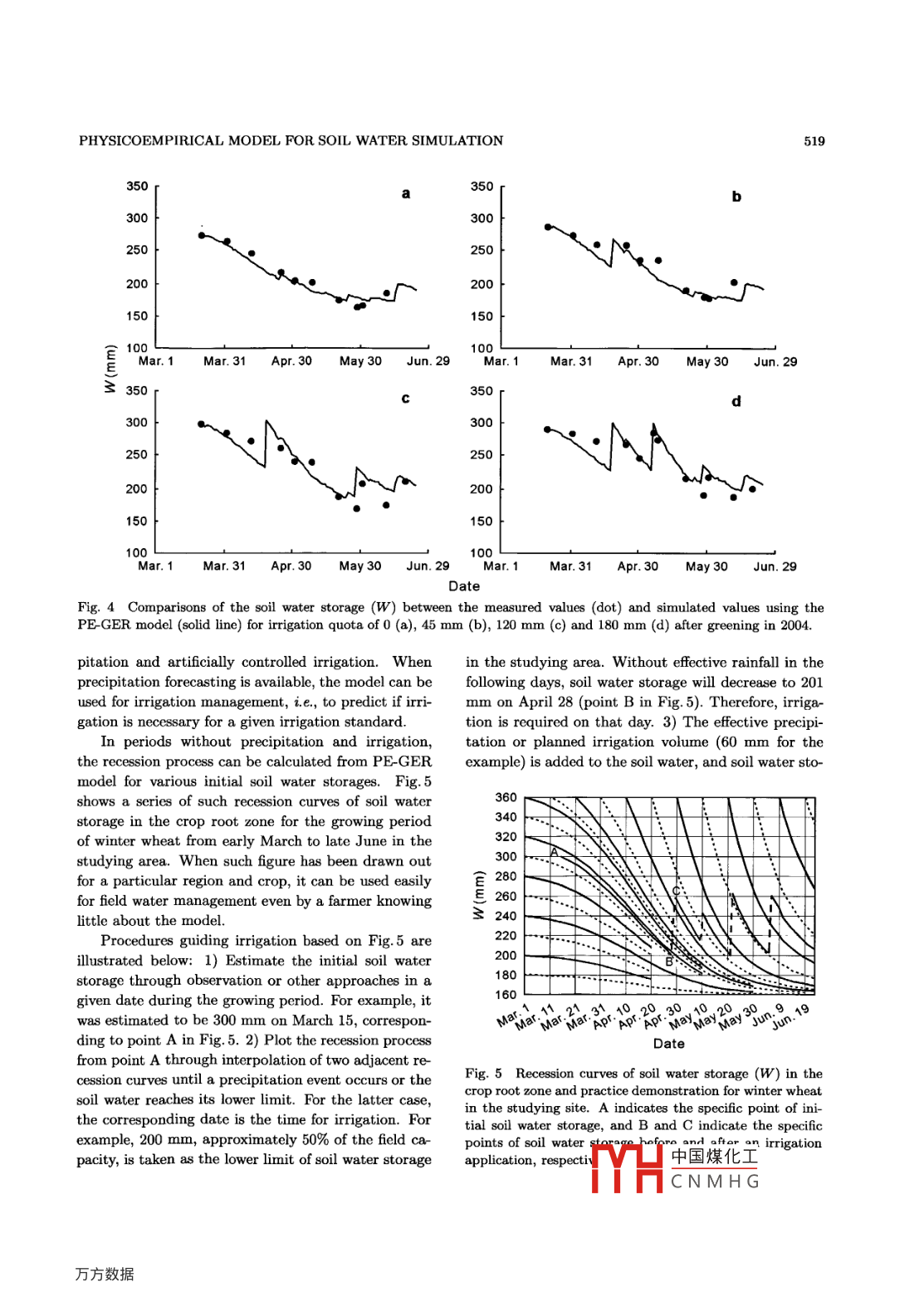 Pedosphene 21(4): 512- -521, 2011ISSN 1002-0160/CN 32-1315/PPEDOSPHERE回2011 Soil Science Society of ChinaPublished by Elsevier B.V. and Science Presswww .elsevier com/locate/pedosphereA Physicoempirical Model for Soil Water Simulationin Crop Root Zone*lSHANG Song -Hao1,*2 and MAO Xiao-Min21 State Key Laboratory of Hydroscience and Engineering, Department of Hydraulic Engineering, Tsinghua University, Beijing100084 (China)2 Center for Agricultural Water Research in China, College of Water Conservancy and Civril Engineering, China AgriculturalUniversity, Beijing 100083 (China)(Received September 13, 2010; revised May 5, 2011)ABSTRACTTo predict soil water variation in the crop root zone, a general exponential recession (GER) model was developed todepict the ecession process of soil water storage. Incorporating the GER model into the mass balance model for soil water,a GER-based physicoempirical (PE-GER) model was proposed for simulating soil water variation in the crop root zone. ThePE GER model was calibrated and validated with experimental data of winter wheat in North China. Simulation resultsagreed well with the field experiment results, as well as were consistentdeveloped soil water balance model which required more detailed parameters and inputs. Compared with a previouslydeveloped simple exponential recession (SER) based physicoempirical (PE -SER) model, PE-GER was more suitable forapplication in a broad range of soil texture, from light soil to heavy soil. Practical application of PE-GER showed thatPE-GER could provide a convenient way to simulate and predict the variation of soil water storage in the crop root zone,especially in case of insufficient data for conceptual or hydrodynamic models.Key Words: general exponential recession model, irrigation scheduling, recession process, soil textureCitation: Shang, S. H. and Mao, X. M. 2011. A physicoempirical model for soil water simulation in crop root zone.Pedosphere. 21(4): 512- -521.INTRODUCTIONgement to predict soil water content in the crop rootzone (Panigrahi and Panda, 2003; Ranatunga et al,Soil water is the main source for crop root uptake in2008). The soil water dynamics is mainly influencedthe field and usually taken as a key index for field waterby meteorological, soil and crop factors. Various simu-management. Soil water dynamics also has great infue-lation models have been proposed with different setsnce on nutrients and contaminants transport in soils,of model parameters, inputs and outputs (Ranatungaplant growth, meteorological processes and groundwa-et al, 2008; Shang et al, 2009), which can be classi-ter dynamics (Daly and Porporato, 2005). Therefore,fied into three types, i.e., empirical models, conceptualresearch on soil water has aroused the interest of soilmodels and hydrodynamic models (Shang et al, 2009).scientist, agronomist, hydrologist, meteorologist, etC.,Empirical models are usually data-driven black-boxand greatly facilitated the development of theoreticalbasis and application of soil water models (Raats, 2001;and outputs. Examples of empirical models for soil wa-Bastiaanssen et al, 2007; Shang et al, 2009).ter simulation include regression model (Kang, 1987),Because long-term in situ monitoring of soil watersupport vector machines model (Wu et al, 2008), arti-is time consuming and costly, the simulation-modelingficial neural networks model (Shang et al, 2009), andapproach was widely used in agricultural water mana-time series analysis model (Wu et al, 1997; Oliveira,*lSupported by the National Natural Science Foundation of China (Nos. 50879041 and 50939004) and the Program for NewCentury Excellent Talents in University of the Ministry of Education of China (Nim 7F-9059中國煤化工*2Corresponding author. E mail: shangsh@tsinghua.edu.cn.TYHCNMHGPHYSICOEMPIRICAL MODEL FOR SOIL WATER SIMULATION5132001). These empirical models are not established onmodels require fewer inputs and can be easily usedthe physical mechanism of the soil water flow and relyin practice, but they consider little of the mechanismheavily on field observation results at specified site andgoverning soil water flow. Therefore, a physicormpiri-weather conditions. However, they benefit from hav-cal model that combines the advantages of conceptualing fewer parameters and requiring fewer inputs thanmodel and empirical model may be more appropriate :hydrodynamic or conceptual models, and are thereforefor modeling soil water variation in case of insuficientmore convenient to be used in specified conditions.data. Shang et al. (2000) proposed a physicoempiri-Conceptual models are based on the mass bala~cal model, which considered the principle of soil waternce of soil water in the crop root zone (e.g, Shangbalance and used a simple exponential recession (SER)and Mao, 2006; Nishat et al, 2007; Jiang et al,curve to depict the recession process of soil water in2008),where soil water variations were derived fromthe crop root zone. This SER model based physicoem-other measured or estimated water balance compo-pirical (PE-SER) model can avoid the estimation ofnents, such 88 precipitation, irrigation, evapotranspi-evapotranspiration and require fewer inputs to simu-ration, and deep percolation. These models mainlylate the dynamic variation of soil water in the cropconsider the soil water quantity in the root zone, whilezone. It has been validated with field data for lightthe mechanism of soil water flow was not fully consi-soils (Shang et al, 2000; Ma et al, 2002), but its ap-dered. They are more widely used in agricultural waterplicability for heavy soils is still questionable.The main purposes of this study were to extend thequire fewer inputs and can be easily used at the fieldSER model to a general exponential recession (GER)scale (Panigrahi and Panda, 2003).model and to develop a GER model based physicoem-Hydrodynamic models, or physically-based models,pirical (PE-GER) model to simulate the variation ofare based on general laws of the physical me
