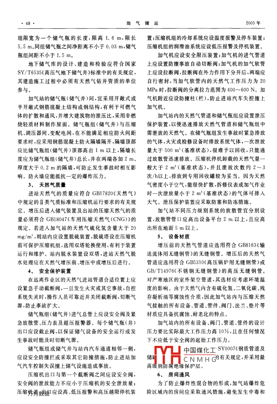 油氣儲(chǔ)運(yùn)2005年)oooeoeoe經(jīng)驗(yàn)交流壓縮天然氣加氣站的安全設(shè)計(jì)黃鄭華·李建華張良(中國人民武裝警察學(xué)院消防工程系)黃鄭華李建華等:壓縮天然氣加氣站的安全設(shè)計(jì),油氣儲(chǔ)運(yùn),2005,24(6)46~49。摘要介紹了壓縮天然氣加氣站類型及其工作原理,分析了壓縮天然氣加氣站天然氣易燃易爆、易泄漏、高壓運(yùn)行、質(zhì)量差和站內(nèi)多種引火源的火災(zāi)危險(xiǎn)性,并從站的總體布局、天然氣儲(chǔ)存和質(zhì)量、站內(nèi)安全保護(hù)裝置、設(shè)備材質(zhì)、房間通風(fēng)、可燃?xì)怏w檢測報(bào)警和預(yù)防電火花、靜電、雷擊等方面指出了壓縮天然氣加氣站在消防安全設(shè)計(jì)中應(yīng)注意的事項(xiàng)主題詞壓縮天然氣汽車加氣站消防安全設(shè)計(jì)天然氣具有燃燒完全、污染少、費(fèi)用低等優(yōu)點(diǎn),氣體壓縮、氣體儲(chǔ)存、設(shè)備控制和售氣6個(gè)系統(tǒng)組已廣泛地應(yīng)用在生產(chǎn)和生活各個(gè)領(lǐng)域。隨著我國天成。壓縮天然氣加氣站的工作原理是,通過管道輸然氣的開發(fā)利用和汽車業(yè)對(duì)壓縮天然氣的需求量日至加氣站的天然氣先送入調(diào)壓計(jì)量系統(tǒng)和凈化干燥益增長,近年來我國相繼建成并投運(yùn)了一批壓縮天系統(tǒng)進(jìn)行凈化處理,再經(jīng)壓縮系統(tǒng)使天然氣壓力達(dá)然氣(CNG)加氣站,在滿足車用天然氣燃料的同到25MPa后,由高壓儲(chǔ)氣瓶組和售氣機(jī)將壓縮天時(shí),又對(duì)壓縮天然氣加氣站的消防安全技術(shù)提出了然氣加入車輛儲(chǔ)氣瓶更高的要求,尤其是高壓運(yùn)載與儲(chǔ)存、油氣雙燃料站2、類型等安全技術(shù)問題。壓縮天然氣加氣站按使用功能分為天然氣汽車加氣站、油氣混合加氣站和子、母加氣站三種類型。壓縮天然氣加氣站工作(1)天然氣加氣站僅提供單一的天然氣燃料原理及其類型121的加注服務(wù)(2)油氣混合加氣站可加注油、氣兩種燃料。1、工作原理(3)子、母加氣站子站無需供氣管道,依靠母壓縮天然氣加氣站通常由調(diào)壓計(jì)量、凈化干燥、站的氣瓶拖車供氣;母站與輸氣管道相連,完成天然較大。定系統(tǒng)的嚴(yán)密性進(jìn)行檢查和必要的試驗(yàn),被檢流量(4)采用流量計(jì)出口檢定閥調(diào)節(jié)檢定點(diǎn)流量,會(huì)計(jì)出口閥及其它未檢流量計(jì)的檢定閥都必須關(guān)嚴(yán),造成此閥的前后壓差較大,破壞了檢定系統(tǒng)所需的四通閥無滲漏,流程切換需專人負(fù)責(zé),統(tǒng)一指揮;通壓力場。過理論推導(dǎo)和分析,得出修正所需的溫度、壓力參數(shù)記錄偏差與示值誤差之間的內(nèi)在聯(lián)系,流量計(jì)檢定五、結(jié)束語所需的各類參數(shù)必須準(zhǔn)確可靠。否則還可能引入新中國煤化工流量計(jì)檢定的目的是為了發(fā)現(xiàn)誤差并及時(shí)進(jìn)行CNMHG器差調(diào)整,消除誤差,從而保證油品公正、準(zhǔn)確計(jì)量(收稿日期:200409-24)為獲得可靠檢定結(jié)果,在流量計(jì)檢定之前,必須對(duì)檢編輯:孟凡強(qiáng)09數(shù)據(jù)廊坊市;電話:(031620965第24卷第6期黃鄭華等:壓縮天然氣加氣站的安全設(shè)計(jì)·47氣的凈化和壓縮,使天然氣增壓至25MPa,給氣瓶系統(tǒng)高壓運(yùn)行容易發(fā)生超壓,當(dāng)系統(tǒng)壓力超過或氣瓶拖車充氣;子、母站都可以提供天然氣燃料的了其能夠承受的最大許用壓力時(shí),必將導(dǎo)致設(shè)備及加注服務(wù)。子、母加氣站可節(jié)省建站資金和土地,有配件的強(qiáng)度超限發(fā)生爆炸或局部炸裂。利于母站集中凈化,子站的火災(zāi)危險(xiǎn)性較低,可建在4、天然氣的質(zhì)量交通樞紐附近,便于使用在天然氣中的游離水未脫凈的情況下,積水中3、結(jié)構(gòu)的硫化氫容易引起鋼瓶腐蝕。從理論上講,含有硫加氣站可分為開放式和撬裝式兩種結(jié)構(gòu)化氫的水溶液在高壓狀態(tài)下對(duì)鋼瓶或容器的腐蝕速(1)開放式結(jié)構(gòu)按照工藝流程,在廠房內(nèi)將加度比在4MPa以下的管網(wǎng)中腐蝕得更快、更容易。氣站的高、低壓管道和各種閥門等設(shè)備組裝起來,形1995年8月12日,某壓縮天然氣加氣站因脫水工序成一個(gè)開環(huán)工藝系統(tǒng)。處理不凈,在給鋼瓶充氣時(shí)發(fā)生爆炸而引起火災(zāi)(2)撬裝式結(jié)構(gòu)將加氣站的凈化、壓縮、冷卻5、多種引火源的存在控制和儲(chǔ)氣等主要設(shè)備集中在一個(gè)撬裝的底座上,商業(yè)性汽車加氣站絕大多數(shù)建在車輛來往頻繁形成一個(gè)可閉環(huán)控制的整體設(shè)備系統(tǒng)。從安全性上的交通干道一側(cè)周圍環(huán)境較復(fù)雜,受外部點(diǎn)火源的講,撬裝式結(jié)構(gòu)優(yōu)于開放式結(jié)構(gòu)。威脅較大。操作中也存在多種引火源,加氣站設(shè)備控制系統(tǒng)是對(duì)站內(nèi)各種設(shè)備實(shí)施手動(dòng)或自動(dòng)控制的二火災(zāi)危險(xiǎn)性3分析系統(tǒng),潛在著電氣火花;售氣系統(tǒng)工作時(shí),天然氣在管道中高速流動(dòng),易產(chǎn)生靜電火源等。易燃易爆天然氣的主要成分甲烷屬一級(jí)可燃?xì)怏w,甲類三消防安全設(shè)計(jì)3,中應(yīng)火災(zāi)危險(xiǎn)性,爆炸濃度極限為5%~15%,最小點(diǎn)火注意的事項(xiàng)能量僅為0.28