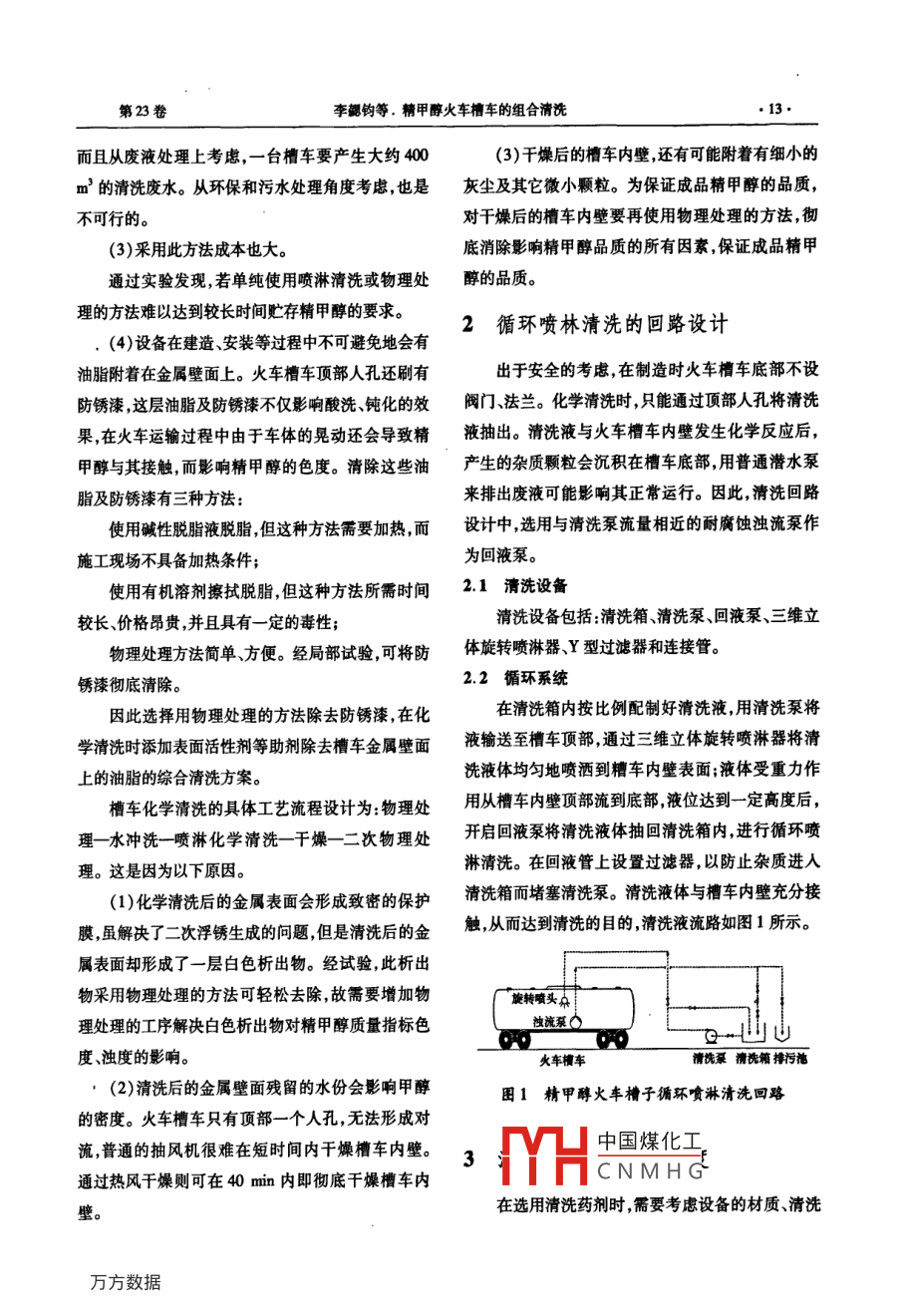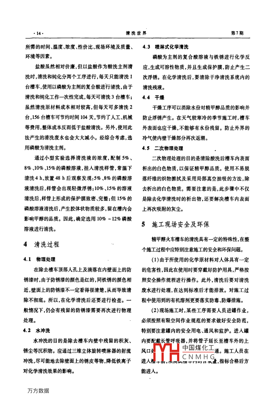 實(shí)周拉術(shù)清洗世界第23卷第7期Cleaning World2007年7月文章編號(hào):1671-8909(2007)07-0012-04精甲醇火車槽車的組合清洗李勰鈞王忠太邵瑜徐生軍(中國(guó)藍(lán)星集團(tuán)總公司西北分公司,甘肅蘭州70060)摘要:敘述精甲醇火車槽車啟用前進(jìn)行清洗的必要性。采用組合清洗工藝對(duì)槽豐內(nèi)壁進(jìn)行清洗,達(dá)到了非常好的效果。關(guān)鍵詞:甲醇;槽車;組合清洗中圖分類號(hào):TE976文獻(xiàn)標(biāo)識(shí)碼BCombined type cleaning for train tanker of purifying methanolLI Xiejun, WANG Zhongtai, SHAo Yu, XU shengjunNorthwest Co., Bluestar Co, Ltd., Lanzhou, Gansa 730060, China)Abstract: The cleaning necessity of new train tanker of purifying methanol were discribed. The com-bined type cleaning process used to cleaning inner surace of train tanker to achieve very good resultsey words: methanol陜北某甲醇裝置一期規(guī)劃建設(shè)規(guī)模20萬(wàn)ta,1清洗工藝與方案由于地處毛烏素沙漠邊緣,冬季氣溫常達(dá)到-30℃左右,霜凍期長(zhǎng)達(dá)5個(gè)月,一遇到下雪路面就結(jié)冰,在常規(guī)的化學(xué)清洗工藝中清洗的步驟一般為:嚴(yán)重時(shí)導(dǎo)致道理癱瘓給公路運(yùn)輸帶來(lái)了很大不便。水沖洗堿洗一水沖洗一酸洗一水沖洗一漂洗一中為保證成品精甲醇的順利運(yùn)輸,生產(chǎn)商購(gòu)置了156和、鈍化。對(duì)于火車槽車一類設(shè)備,既可采用全充滿式清洗也可采用噴淋式清洗。如果火車槽車的清臺(tái)75G型火車槽車來(lái)進(jìn)行精甲醇的安全運(yùn)輸。洗采用全充滿常規(guī)工藝,存在以下的缺點(diǎn)這種火車槽內(nèi)壁在制造過(guò)程中存在較多油脂、(1)從工期上考慮常規(guī)工藝所花費(fèi)的時(shí)間較防銹漆、鐵銹等雜質(zhì)。在精甲醇的質(zhì)量指標(biāo)中,最易長(zhǎng)。清洗一臺(tái)槽車,一般為堿洗8-10h,酸洗6~8受到貯存運(yùn)輸過(guò)程影響的指標(biāo)有外觀色度、水分b,漂洗2h,中和鈍化4-8h。如果再加上水沖洗等而鐵銹油分、防銹漆、水分及其它化學(xué)成份是影時(shí)間則清洗一臺(tái)槽車需要近40h。這么長(zhǎng)的清洗響精甲醇品質(zhì)的主要因素。因此要保證精甲醇長(zhǎng)工期,是不可行的。途運(yùn)輸后的品質(zhì),僅對(duì)火車槽車進(jìn)行簡(jiǎn)單的化學(xué)清(2)火車槽車僅在頂部有一個(gè)人孔。若采用充洗是不夠的需要采用與一般清洗不同的工藝。YH中國(guó)煤化工,廢液很難排出CNMHG收稿日期:2007-06-14作者簡(jiǎn)介:李勰鉤(1974-)男山東掖縣人,化學(xué)清洗技師主要從事化學(xué)清洗工作。第23卷李勰鉤等.精甲醇火車槽車的組合清洗13而且從廢液處理上考慮,一臺(tái)槽車要產(chǎn)生大約400(3)干燥后的槽車內(nèi)壁還有可能附著有細(xì)小的m3的清洗廢水。從環(huán)保和污水處理角度考慮也是灰塵及其它微小顆粒。為保證成品精甲醇的品質(zhì),不可行的。對(duì)干燥后的槽車內(nèi)壁要再使用物理處理的方法,徹(3)采用此方法成本也大。底消除影響精甲醇品質(zhì)的所有因素保證成品精甲通過(guò)實(shí)驗(yàn)發(fā)現(xiàn)若單純使用噴淋清洗或物理處醇的品質(zhì)。理的方法難以達(dá)到較長(zhǎng)時(shí)間貯存精甲醇的要求2循環(huán)噴林清洗的回路設(shè)計(jì)(4)設(shè)備在建造、安裝等過(guò)程中不可避免地會(huì)有油脂附著在金屬壁面上?;疖嚥圮図敳咳丝走€刷有出于安全的考慮,在制造時(shí)火車槽車底部不設(shè)防銹漆,這層油脂及防銹漆不僅影響酸洗、鈍化的效閥門法蘭?;瘜W(xué)清洗時(shí),只能通過(guò)頂部人孔將清洗果,在火車運(yùn)輸過(guò)程中由于車體的晃動(dòng)還會(huì)導(dǎo)致精液抽出。清洗液與火車槽車內(nèi)壁發(fā)生化學(xué)反應(yīng)后,甲醇與其接觸而影響精甲醇的色度。清除這些油產(chǎn)生的雜質(zhì)顆粒會(huì)沉積在槽車底部用普通潛水泵脂及防銹漆有三種方法:來(lái)排出廢液可能影響其正常運(yùn)行。因此清洗回路使用堿性脫脂液脫脂但這種方法需要加熱而設(shè)計(jì)中選用與清洗泵流量相近的耐腐蝕濁流泵作施工現(xiàn)場(chǎng)不具備加熱條件;為回液泵使用有機(jī)溶劑擦拭脫脂但這種方法所需時(shí)間1清洗設(shè)備較長(zhǎng)、價(jià)格昂貴,并且具有一定的毒性;清洗設(shè)備包括清洗箱、清洗泵、回液泵、三維立物理處理方法簡(jiǎn)單、方便。經(jīng)局部試驗(yàn)可將防體旋轉(zhuǎn)噴淋器、Y型過(guò)濾器和連接管銹漆徹底清除。2.2循環(huán)系統(tǒng)因此選擇用物理處理的方法除去防銹漆,在化在清洗箱內(nèi)按比例配制好清洗液,用清洗泵將學(xué)清洗時(shí)添加表面活性劑等助劑除去槽車金屬壁面液輸送至槽車頂部通過(guò)三維立體旋轉(zhuǎn)噴淋器將清上的油脂的綜合清洗方案。洗液體均勻地噴灑到糟車內(nèi)壁表面;液體受重力作槽車化學(xué)清洗的具體工藝流程設(shè)計(jì)為:物理處用從槽車內(nèi)壁頂部流到底部液位達(dá)到一定高度后,理一水沖洗一噴淋化學(xué)清洗一干燥一二次物理處開(kāi)啟回液泵將清洗液體抽回清洗箱內(nèi)進(jìn)行循環(huán)噴理。這是因?yàn)橐韵略?。淋清洗。在回液管上設(shè)置過(guò)濾器,以防止雜質(zhì)進(jìn)入(1)化學(xué)清洗后的金屬表面會(huì)形成致密的保護(hù)清洗箱而堵塞清洗泵。清洗液體與槽車內