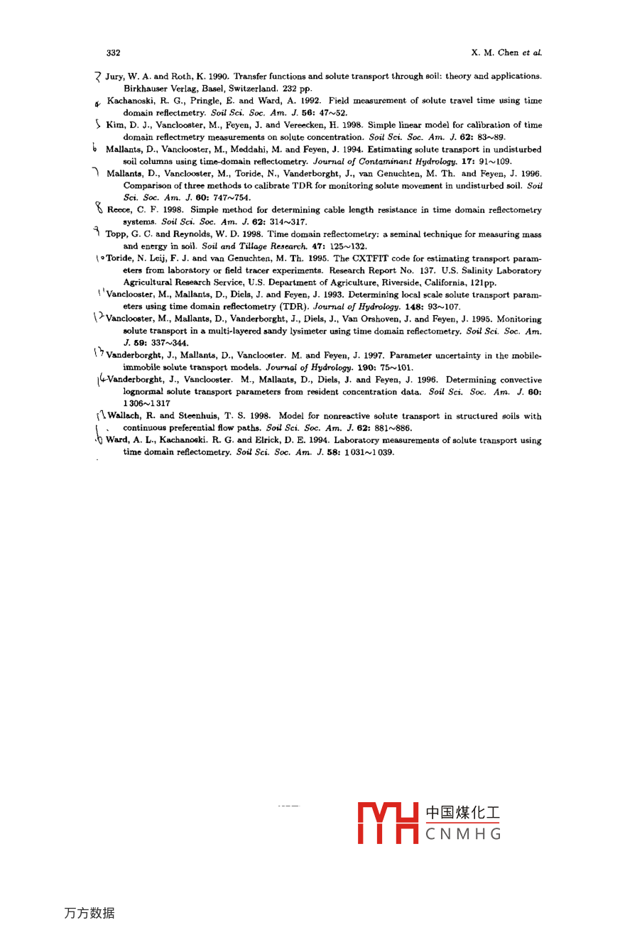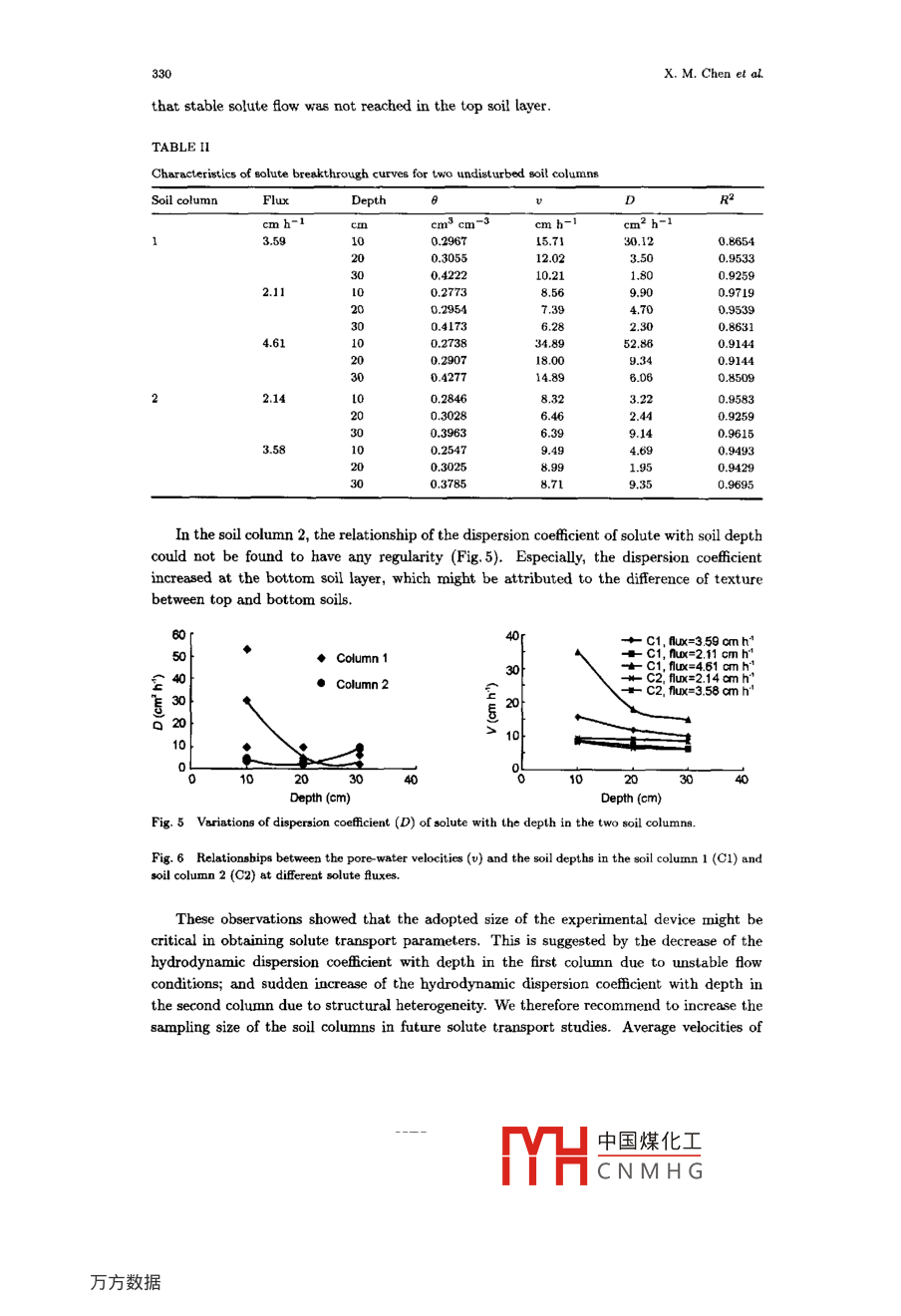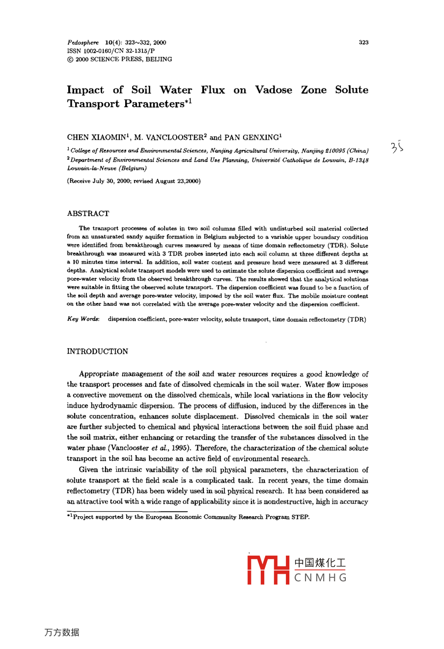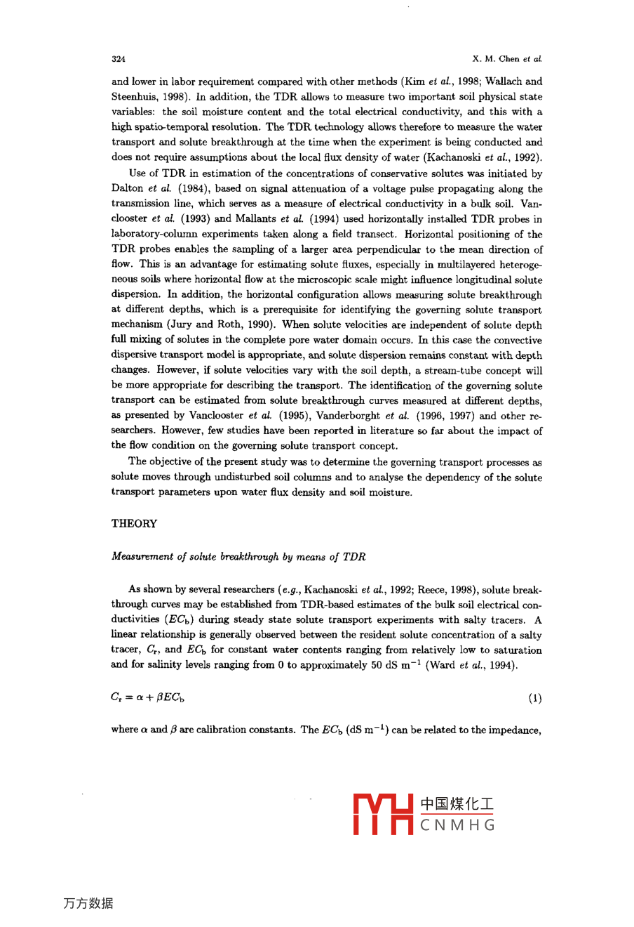 Pedosphere 10(4): 323~332, 2000323ISSN 1002-0160/CN 32-1315/P@ 2000 SCIENCE PRESS, BEIJINGImpact of Soil Water Flux on Vadose Zone SoluteTransport Parameters*1CHEN XIAOMINI, M. VANCLOOSTER2 and PAN GENXING11 College of Resources and Environmental Sciences, Nanjing Agricultural University, Nanjing 210095 (China)352 Department of Enrironmental Sciences and Land Use Planning, Universite Catholique de Louvain, B-1348Louuain-la-Neuue (Belgium)(Receive July 30, 2000; revised August 23,200)ABSTRACTThe transport proceses of solutes in two soil columns flled with undisturbed soil material collectedfrom an unsaturated sandy aquifer formation in Belgium ubjected to a variable upper boundary conditionwere identified from breakthrough curves measured by means of time domain relectometry (TDR). Solutebreakthrough was measured with 3 TDR probes inserted into each soil column at three different depths ata 10 minutes time interval. In addition, soil water content and pressure head were measured at 3 diferentdepths. Analytical solute transport models were used to estimate the solute dispersion coffcient and averngepore-water velocity from the obeerved breakthrough curves. The results showed that the analytical solutionswere suitable in ftting the observed solute transport. The dispersion coeficient was found to be a function ofthe soil depth and average pore water velocity, imposed by the soil water fux. The mobile moisture contenton the other band was not correlated with the average pore water velocity and the dispersion coeficient.Key Words: dispersion ceficient, pore water velocity, solute transport, time domain rflectometry (TDR)INTRODUCTIONAppropriate management of the soil and water resources requires a good knowledge ofthe transport processes and fate of dissolved chemicals in the soil water. Water fow imposesa convective movement on the dissolved chemicals, while local variations in the fow velocityinduce hydrodynamic dispersion. The process of difusion, induced by the difterences in thesolute concentration, enhances solute displacement. Dissolved chemicals in the soil waterare further subjected to chemical and physical interactions between the soil fuid phase andthe soil matrix, either enhancing or retarding the transfer of the substances dissolved in thewater phase ( Vanclooster et al, 1995). Therefore, the characterization of the chemical solutetransport in the soil has become an active feld of environmental research.Given the intrinsic variability of the soil physical parameters, the characterization ofsolute transport at the field scale is a complicated task. In recent years, the time domainrefectometry (TDR) has been widely used in soil physical research. It has been considered asan attractive tool with a wide range of applicability since it is nondestructive, high in accuracy*1Projcct supported by the European Economic Community Research Program STEP.中國煤化工MYHCNMHG324x. M. Chen et al.and lower in labor requirement compared with other methods (Kim et al, 1998; Wallach andSteenhuis, 1998). In addition, the TDR allows to measure two important soil physical statevariables: the soil moisture content and the total electrical conductivity, and this with ahigh spatio temporal resolution. The TDR technology allows therefore to measure the watertransport and solute breakthrough at the timne when the experiment is being conducted anddoes not require assumptions about the local fux density of water (Kachanoski et al, 1992).Use of TDR in estimation of the concentrations of conservative solutes was initiated byDalton et al. (1984), based on signal attenuation of a voltage pulse propagating along thetransmission line, which serves as a measure of electrical conductivity in a bulk soil. Van-clooster et al. (1993) and Mallants et al. (1994) used horizontally installed TDR probes inlaboratory-colunn experiments taken along a field transect. Horizontal positioning of theTDR probes enables the sampling of a larger area perpendicular to the mean direction ofAow. This is an advantage for estimating solute fuxes, especially in multilayered heteroge-neous soils where horizontal flow at the microscopic scale might inAuence longitudinal solutedispersion. In addition, the borizontal configuration allows measuring solute breakthroughat diferent depths, which is a prerequisite for identifying the governing solute transportmechanism {Jury and Roth, 1990). When solute velocities are independent of solute depthfull mixing of solutes in the complete pore water domain occurs. In this case the convectivedispersive transport model is appropriate, and solute dispersion remains constant with depthchanges. However, if solute velocities vary with the soil depth, a stream- tube concept willbe more appropriate for describing the transport. The identification of the governing solutetransport can be estimated from solute breakthrough curves measured at diferent depths,as presented by Vanclooster et al. (1995), Vanderborght et al. (1996, 1997) and other re-searchers. However, few studies have been reported in literature so far about the impact ofthe fow condition on the governing solute transport concept.The objective of the present study was to determine the governing transport processes assolute moves through undisturbed soil columns and to analyse the dependency of the solutetransport parameters upon water fAux density and soil moisture.THEORYMeasurement of solute brealkthrough by means of TDRAs shown by several researchers (e.g., Kachanoski et al, 1992; Reece, 1998), solute break-through curves may be established from TDR-based estimates of the bulk soil electrical con-ductivities (ECb) during steady state solute transport experiments with salty tracers. Alinear relationship is generally observed between the resident solute concentration of a saltytracer, Cr, and EC, for constant water contents ranging from relatively low to saturationand for salinity levels ranging from 0 to approximately 50 dS m-1 (Ward et al, 1994).C,=