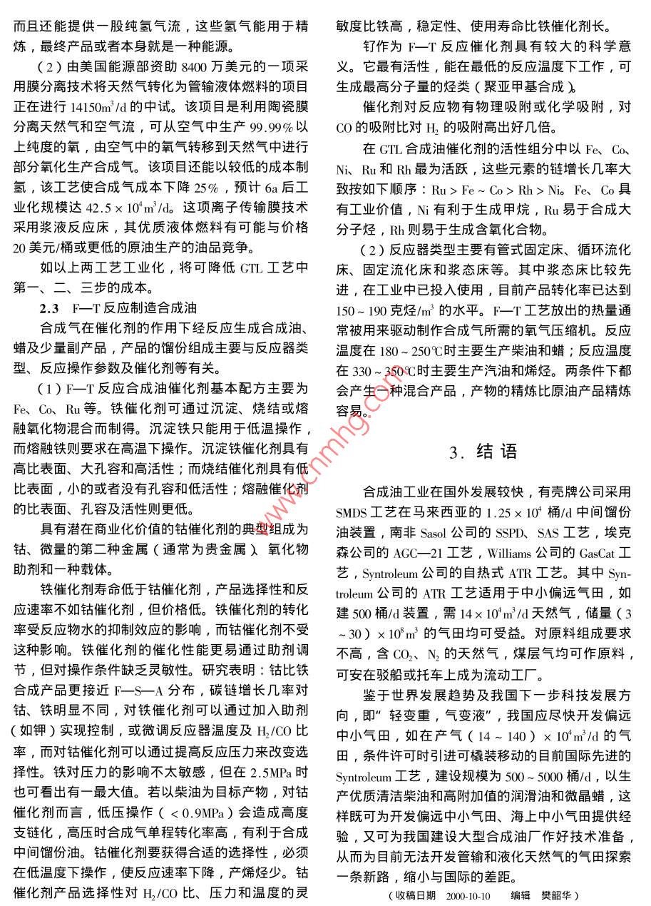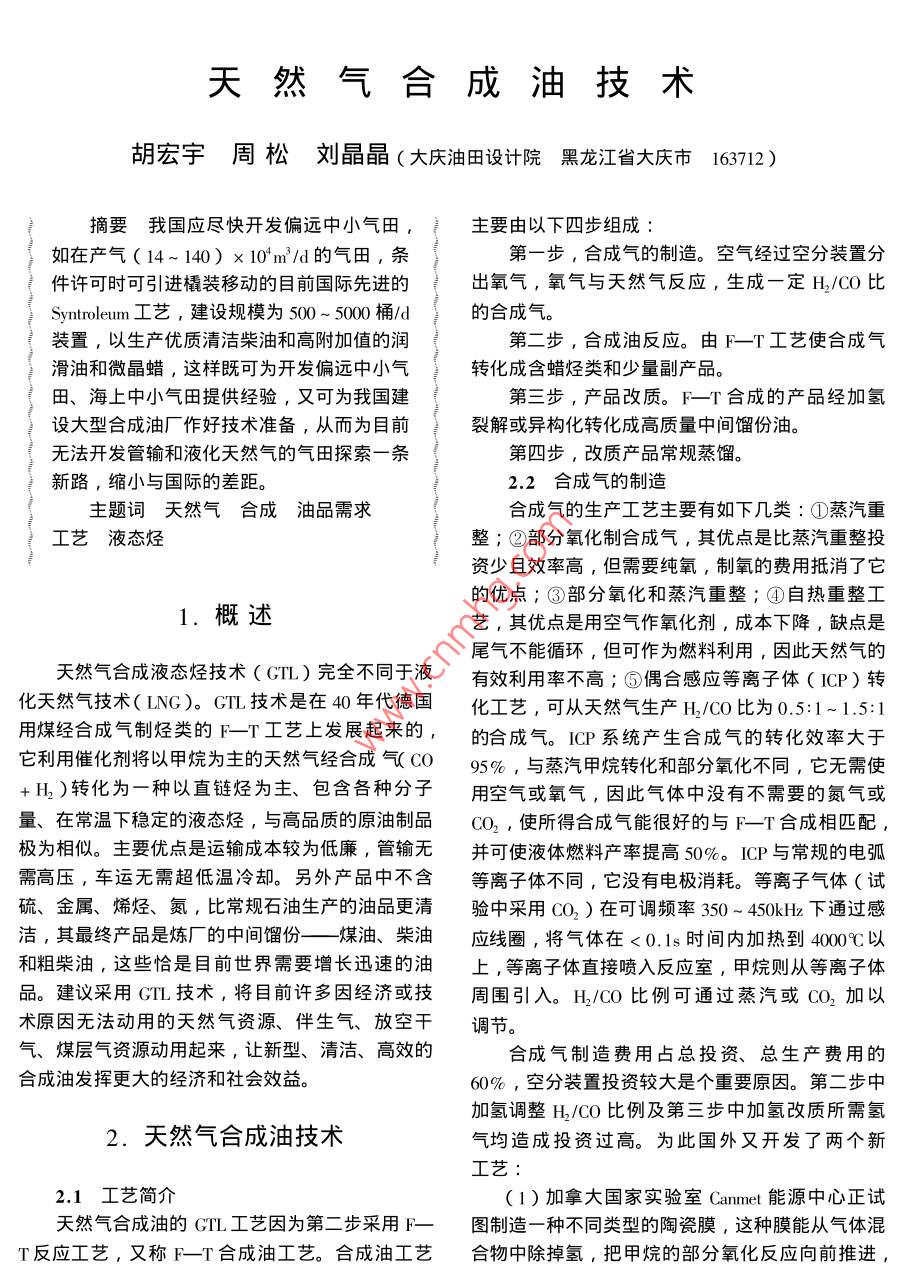 天然氣合成油技術胡宏宇周松劉晶晶 (大慶油田設計院黑龍江省大慶市 163712)摘要我國應盡快開 發(fā)偏遠中小氣田,主要由以下四步組成:如在產(chǎn)氣( 14~ 140) x 10*m2/d的氣田,條第一步,合成氣的制造。空氣經(jīng)過空分裝置分件許可時可引進橇裝移動的目前國際先進的出氧氣,氧氣與天然氣反應,生成一定H/CO比Syntroleum工藝,建設規(guī)模為500 ~ 5000桶/d .的合成氣。裝置,以生產(chǎn)優(yōu)質清潔柴油和高附加值的潤第二步,合成油反應。由F- -T工藝使合成氣滑油和微晶蠟,這樣既可為開發(fā)偏遠中小氣轉化成含蠟烴類和少量副產(chǎn)品。田、海上中小氣田提供經(jīng)驗,又可為我國建第三步,產(chǎn)品改質。F-T 合成的產(chǎn)品經(jīng)加氫設大型合成油廠作好技術準備,從而為目前.裂解或異構化轉化成高質量中間餾份油。無法開發(fā)管輸和液化天然氣的氣田探索一條.第四步,改質產(chǎn)品常規(guī)蒸餾。新路,縮小與國際的差距。2.2合成氣的制造主題詞天然氣合成油品需求合成氣的生產(chǎn)工藝主要有如下幾類:①蒸汽重工藝液態(tài)烴整;②部分氧化制合成氣,其優(yōu)點是比蒸汽重整投資少且效率高,但需要純氧,制氧的費用抵消了它的優(yōu)點;③部分氧化和蒸汽重整;④自熱重整工1.概述藝,其優(yōu)點是用空氣作氧化劑,成本下降,缺點是尾氣不能循環(huán),但可作為燃料利用,因此天然氣的天然氣合成液態(tài)烴技術( GTL)完全不同于液有效利用率不高;⑤偶合感應等離子體( ICP)轉化天然氣技術( LNG)。GTL 技術是在40年代德國化工藝,可從天然氣生產(chǎn)H/CO比為0.5:1~1.5:1用煤經(jīng)合成氣制烴類的F一-T 工藝上發(fā)展起來的,的合成氣。ICP 系統(tǒng)產(chǎn)生合成氣的轉化效率大于它利用催化劑將以甲烷為主的天然氣經(jīng)合成氣( Co95% ,與蒸汽甲烷轉化和部分氧化不同,它無需使+H2)轉化為一種以直鏈烴為主、包含各種分子用空氣或氧氣,因此氣體中沒有不需要的氮氣或量、在常溫下穩(wěn)定的液態(tài)烴,與高品質的原油制品CO2 ,使所得合成氣能很好的與F- -T合成相匹配,極為相似。主要優(yōu)點是運輸成本較為低廉,管輸無并可使液體燃料產(chǎn)率提高50%。ICP 與常規(guī)的電弧需高壓,車運無需超低溫冷卻。另外產(chǎn)品中不含等離子體不同,它沒有電極消耗。等離子氣體(試硫、金屬、烯烴、氮,比常規(guī)石油生產(chǎn)的油品更清驗中采用CO2 )在可調頻率350 ~ 450kHz下通過感潔,其最終產(chǎn)品是煉廠的中間餾份一-煤油、 柴油應線圈,將氣體在<0.1s時間內(nèi)加熱到4000C以和粗柴油,這些恰是目前世界需要增長迅速的油上,等離子體直接噴入反應室,甲烷則從等離子體品。建議采用GTL技術,將目前許多因經(jīng)濟或技周圍引入。H/CO 比例可通過蒸汽或CO2加以術原因無法動用的天然氣資源、伴生氣、放空干調節(jié)。氣、煤層氣資源動用起來,讓新型、清潔、高效的合成氣制造費用占總投資、總生產(chǎn)費用的合成油發(fā)揮更大的經(jīng)濟和社會效益。60% ,空分裝置投資較大是個重要原因。第二步中加氫調整H/CO比例及第三步中加氫改質所需氫2.天然氣合成油技術氣均造成投資過高。為此國外又開發(fā)了兩個新工藝:2.1工藝簡介(1)加拿大國家實驗室Canmet能源中心正試天然氣合成油的GTL工藝因為第二步采用F-圖制造-種不同類型的陶瓷膜,這種膜能從氣體混T反應工藝,又稱F- -T合成油工藝。合成油工藝合物中除掉氫,把甲烷的部分氧化反應向前推進,而且還能提供一股純氫氣流,這些氫氣能用于精敏度比鐵高,穩(wěn)定性、使用壽命比鐵催化劑長。煉,最終產(chǎn)品或者本身就是一種能源。釕作為F- -T反應催化劑具有較大的科學意(2)由美國能源部資助8400萬美元的一項采義。它最有活性,能在最低的反應溫度下工作,可用膜分離技術將天然氣轉化為管輸液體燃料的項目生成最高分子量的烴類(聚亞甲基合成2正在進行14150m^/d的中試。該項目是利用陶瓷膜催化劑對反應物有物理吸附或化學吸附,對分離天然氣和空氣流,可從空氣中生產(chǎn)999%以co的吸附比對H,的吸附高出好幾倍。上純度的氧,由空氣中的氧氣轉移到天然氣中進行在GTL合成油催化劑的活性組分中以Fe、Co,部分氧化生產(chǎn)合成氣。該項目還能以較低的成本制Ni、Ru和Rh最為活躍,這些元素的鏈增長幾率大氫,該工藝使合成氣成本下降25% ,預計6a后工致按如下順序: Ru> Fe~Co> Rh> Ni。Fe、 Co具業(yè)化規(guī)模達42.5x 10*m2/d。這項離子傳輸膜技術有工業(yè)價值, Ni 有利于生成甲烷, Ru易于合成大采用漿液反應床,其優(yōu)質液體燃料有可能與價格分子烴,Rh則易于生成含氧化合物。20美元/桶或更低的原油生產(chǎn)的油品競爭。(2)反應器類型主要有管式固定床、循環(huán)流化如以上兩工藝工業(yè)化,將可降低GTL工藝中床、固定流化床和漿態(tài)床等。其中漿態(tài)床比較先第一、二、三步的成本。進,在工業(yè)中已投入使用,目前產(chǎn)品轉化率已達到2.3F--T反應制造合成油150~ 190 克烴/m'的水平。F- -T工藝放出的熱量通合成氣在催化劑的作用下經(jīng)反應生成合成油、常被用來驅動制作合成氣所需的氧氣壓縮機。反應蠟及少量副產(chǎn)品,產(chǎn)品的餾份組成主要與反應器類溫度在180 ~ 250時主要生產(chǎn)柴油和蠟;反應溫度型、反應操作參數(shù)及催化劑等有關。在330 ~ 350C時