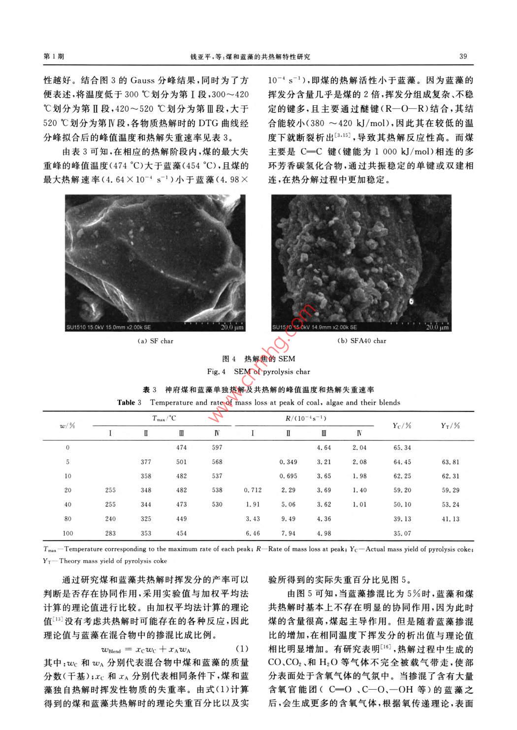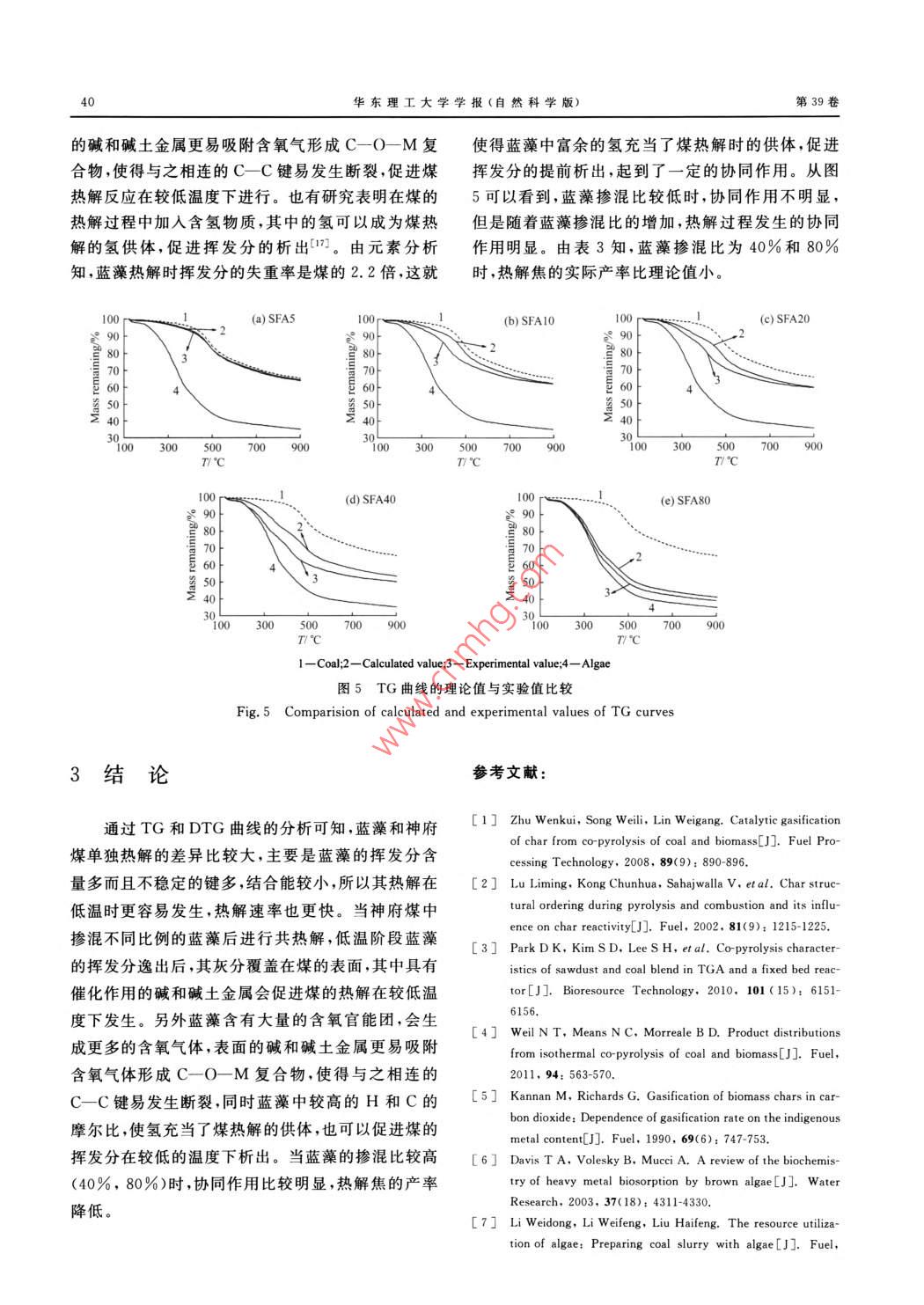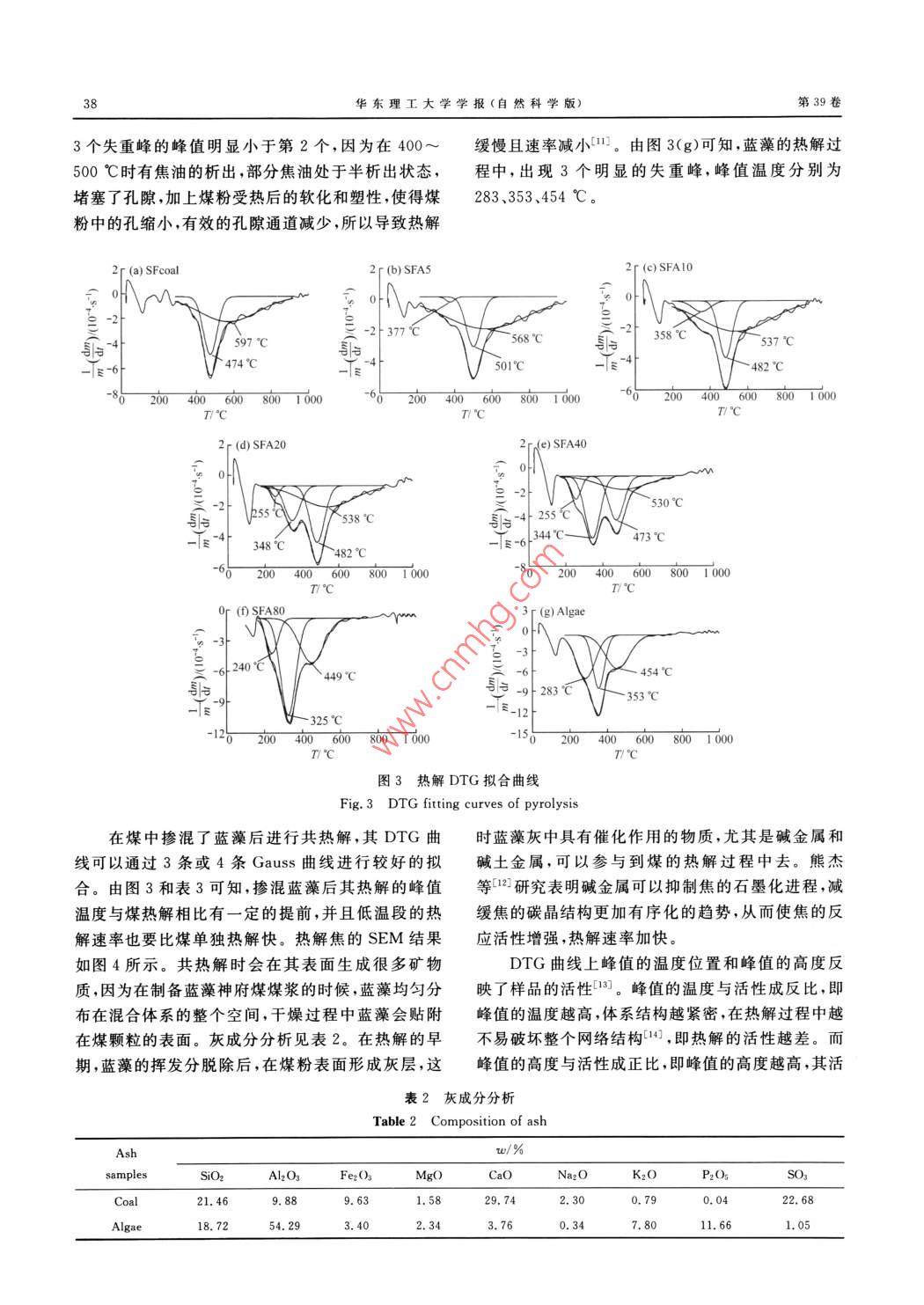 Vol 39 No I華東理工大學(xué)學(xué)報(bào)(自然科學(xué)版)2013-02Journal of East China University of Science and Technology( Natural Science Edition文章編號(hào):1006-3080(2013)01-003507煤和藍(lán)藻的共熱解特性研究錢(qián)亞平,李偉鋒,陳雪莉,張強(qiáng),劉海峰華東理工大學(xué)煤氣化及能源化工教育部重點(diǎn)實(shí)驗(yàn)室,上海煤氣化工程技術(shù)研究中心,上海200237)摘要:采用熱重分析法,對(duì)神府煤和藍(lán)藻單獨(dú)熱解及共熱解(藍(lán)藻摻混比,即藍(lán)藻與干基混合物的質(zhì)量比為5%,10%,20%,40%和80%)特性進(jìn)行了研究。研究表明:藍(lán)藻揮發(fā)分析出的極值溫度比煤低,而且熱解速率比煤快。藍(lán)藻組成復(fù)雜、揮發(fā)分含量高且含有的不穩(wěn)定鍵多,所以在較低溫度下就會(huì)被破壞,從而以較高的速率揮發(fā)出去。當(dāng)藍(lán)藻與神府煤共熱解時(shí),低溫下藍(lán)藻的揮發(fā)分析出后,暴露出來(lái)的灰分覆蓋在煤的表面,灰分中具有催化作用的堿和堿土金屬會(huì)加快煤的熱解反應(yīng),使煤的揮發(fā)分提前析出。當(dāng)藍(lán)藻的摻混比為40%和80%時(shí),協(xié)冋作用較明顯,熱解焦的產(chǎn)率比理論值低。關(guān)鍵詞:煤;生物質(zhì);共熱解中圖分類(lèi)號(hào):TQ530.2文獻(xiàn)標(biāo)志碼:ACo-Pyrolysis of Coal and algaeQIAN Ya-ping, LI Wei-feng, CHEN Xue-li, ZHANG Qiang, LIU Hai-feng(Key Laboratory of Coal Gasification and Energy Chemical, Ministry of EducationShanghai Engineering Research Center of Coal Gasificationeast China University of Science and Technology, Shanghai 200237, China)Abstract: The pyrolysis of Shenfu (SF)coal, algae and their blends (with 5%,10%,20%.40%80% of algae in dry mass)was investigated by thermogravimetric analysis. The results indicate that theextremum temperature of devolatilisation of algae is lower, and the pyrolysis rate is faster than that of SFcoal. Due to the complex composition, high content of volatiles and instable bonds, the algae is destroyedeasily at low temperature and has a high devolatilisation rate. After the devolatilisation of algae at lowtemperature, the exposed ash covers the surface of the coal when algae co-pyrolysises with Shenfu coalThe alkali and alkaline earth metals in algae ash have catalytic effects, and can accelerate the pyrolysisreaction, bringing forward the devolatilisation of coal. When the mixing ratios of algae are 40% and 80%the synergy effect is significant, and the char yield is lower than the theoretical value.Ke隨著化石能源的消耗和環(huán)境污染的加劇,人們化、共液化等)。生物質(zhì)的利用近乎是CO2的零排開(kāi)始嘗試使用清潔能源,并將目光逐漸聚集到新生放過(guò)程,但是生物質(zhì)和煤的物理化學(xué)性質(zhì)差別很大能源領(lǐng)域比如煤和生物質(zhì)的共利用(共燃燒、共氣比如揮發(fā)性物質(zhì)的含量及組成、灰分組成"、密度收稿日期:2012-09-01基金項(xiàng)目:國(guó)家自然科學(xué)基金(20906024);國(guó)家重點(diǎn)基礎(chǔ)研究發(fā)展(973)計(jì)劃(201CB200906)作者簡(jiǎn)介:錢(qián)亞平(1987-),女,浙江平湖人,碩士生,研究方向?yàn)槊簹饣夹g(shù),E-mail:emma98787@126.com通信聯(lián)系人:劉海峰,E-mail:hfliu@ecust.edu.cn華東理工大學(xué)學(xué)報(bào)(自然科學(xué)版第39卷熱值、H和C以及O和C的摩爾比、熱解焦的有序性。將藍(lán)藻的處理納入現(xiàn)代潔凈煤技術(shù)領(lǐng)域,不僅化程度等。這些差異導(dǎo)致了共利用過(guò)程中不同的能有效地解決藍(lán)藻造成的環(huán)境問(wèn)題,還能充分利用反應(yīng)活性以及熱學(xué)特性口。煤和生物質(zhì)共燃燒是減藍(lán)藻中的熱能,變廢為寶,實(shí)現(xiàn)藍(lán)藻的無(wú)害化、資源少CO2以及NO、SO、PAHs、VOCs和TOCs等化。李偉東等8系統(tǒng)地研究了添加藍(lán)藻對(duì)神府煤污染氣體排放的良好選擇。但是對(duì)煤和生物質(zhì)共熱漿成漿濃度、流變性和靜態(tài)穩(wěn)定性的影響。但要綜解的研究還很缺乏。熱解可以說(shuō)是一個(gè)獨(dú)立的過(guò)合利用藍(lán)藻這種生物質(zhì),還需進(jìn)一步研究藍(lán)藻與煤程,能產(chǎn)生各種化學(xué)品和燃料,是含碳物質(zhì)熱轉(zhuǎn)化的熱解氣化特性,為充分利用生物質(zhì)資源提供理論(燃燒和氣化)的第一步5。在熱轉(zhuǎn)化過(guò)程中,固體基礎(chǔ)。本文采用常壓熱重分析儀,研究了神府煤和含碳物質(zhì)首先經(jīng)歷熱解,產(chǎn)生合成氣、焦油、酚類(lèi)和藍(lán)藻單獨(dú)熱解及共熱解的特性,考察了藍(lán)藻的不同渣。揮發(fā)性產(chǎn)物可以在氣相中反應(yīng),如催化裂化、重?fù)交毂葘?duì)神府煤熱解產(chǎn)生的影響。組和燃燒等,焦則在氣化反應(yīng)中生成合成氣,在燃燒反應(yīng)中生成CO2和H2O,但是由于H2與C的摩1實(shí)驗(yàn)部分爾比較低會(huì)導(dǎo)致煤熱解的產(chǎn)物偏少,為了增加產(chǎn)物,會(huì)額外地添加H2到煤的熱解過(guò)程中。生物質(zhì)的高1.1實(shí)驗(yàn)樣品反應(yīng)性及高含量的揮發(fā)分會(huì)加快共熱解的轉(zhuǎn)化率,本文所用的藍(lán)藻為太湖打撈壓濾后的藍(lán)藻,煤以及生物質(zhì)中較高的H2與C的摩爾比可以在煤和樣是氣化用煤的代表煤種——神府煤,兩種樣品均生物質(zhì)的共熱解過(guò)程中充當(dāng)氫的供體,減少外源H2在105℃的烘箱中烘24h。神府原煤與藍(lán)藻的工業(yè)的加入,從而降低成本。因此,煤和生物質(zhì)的連續