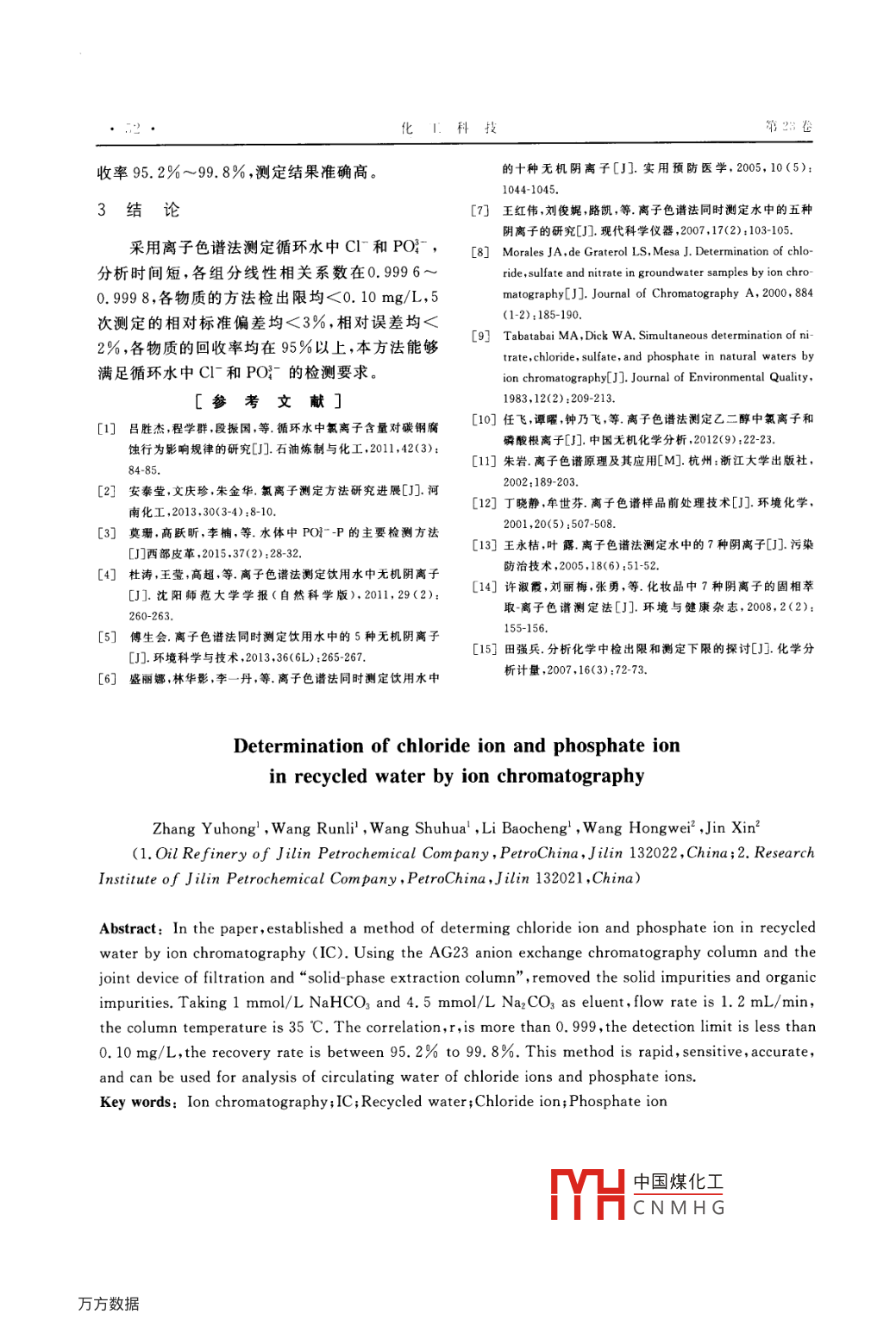 分析測(cè)試化工科技,2015,23(4):50science & TECHNOLOGY IN CHEMICAL INDUSTRY離子色譜法測(cè)定循環(huán)水中C和PO張玉紅1,王潤(rùn)禮,王淑華,李寶城,王宏偉2,金鑫2(1.中國(guó)石油吉林石化公司煉油廠,吉林吉林132022;2.中國(guó)石油吉林石化公司研究院,吉林吉林132021)摘要:建立了離子色譜法測(cè)定循環(huán)水中Clˉ和PO-的方法。采用AG23陰離子交換色譜柱,使用過(guò)濾頭和“固相萃取柱”組成的聯(lián)合裝置除去國(guó)體雜質(zhì)和有機(jī)雜質(zhì)。以1mmol/ L NaHco3和4.5mmol/LNa2CO3為淋洗液,流速為1.2mL/min,柱溫為35℃。各組分的相關(guān)性好(r>0.999),組分的檢出限均<0.10mg/L,各物質(zhì)的加標(biāo)回收率為95,2%~99.8%。該方法快速、靈敏、準(zhǔn)確,可用于循環(huán)水中Cl和PO的分析。關(guān)鍵詞:離子色譜;循環(huán)永;氯離子;磷酸根離子中圖分類(lèi)號(hào):TQ085.4文獻(xiàn)標(biāo)識(shí)碼:A文章編號(hào):1008-0511(2015)04-0050-03循環(huán)水在運(yùn)行過(guò)程中不可避免地會(huì)引入各種體電導(dǎo)池抑制器、電導(dǎo)檢測(cè)器、自動(dòng)進(jìn)樣器、恒溫腐蝕性離子,從而引起管線(xiàn)特別是換熱器發(fā)生嚴(yán)重柱溫箱溶劑托盤(pán)、智能色譜工作站, Ion PacAG分離腐蝕。循環(huán)水中C含量大,對(duì)不銹鋼的腐蝕起到柱:D234mm×250mm,美國(guó)進(jìn)口, Ion PacAS保護(hù)柱加速作用,有機(jī)磷酸鹽緩蝕劑對(duì)高濃度Cl溶液中D234mm×50mm,均為北京歷元電子儀器有限公碳鋼的腐蝕有抑制作用,準(zhǔn)確測(cè)定循環(huán)水中司;超聲波振蕩器:中科儀儀器有限公司。p(C)和p(PO),對(duì)防止設(shè)備腐蝕和產(chǎn)品質(zhì)量的2實(shí)驗(yàn)方法監(jiān)控有著重要的意義。Cl測(cè)定方法2有滴定法淋洗液1mmol/ L NaHco3和4.5mmol/L電位滴定法離子色譜法、分光光度法、原子吸收法N2CO3,流速1.2mL/min,色譜柱溫度35℃,檢測(cè)和流動(dòng)注射法。PO的測(cè)定法有分光光度法、池溫度40℃,檢測(cè)器為化學(xué)抑制型電導(dǎo)檢測(cè)器。色譜法、電化學(xué)法和比色管法。離子色譜法作為樣品前處理包括采樣,凈化樣品,基體消除,稀釋4種公認(rèn)有效的微量離子分析技術(shù),已有報(bào)道應(yīng)用于個(gè)步驟1。所有水樣均應(yīng)經(jīng)0.45m濾膜過(guò)濾。飲用水47、地下水、天然水中的陰離子分析由于離子色譜不能進(jìn)入大量的有機(jī)雜質(zhì),也不可以取得了良好的效果。進(jìn)入固體雜質(zhì),上述2種雜質(zhì)均對(duì)色譜柱造成危作者采用1mmol/ L NaHcO3和4.5mmol/害,所以使用“過(guò)濾頭”和“固相萃取柱”組成的聯(lián)合Na2CO3為淋洗液,AG23陰離子交換色譜柱測(cè)定循環(huán)水中C|和PO。此法具有樣品用量少、簡(jiǎn)裝置除去固體雜質(zhì)和有機(jī)雜質(zhì)1首先打開(kāi)“固相萃取柱”上下接頭,將“過(guò)濾便、快速、準(zhǔn)確的特點(diǎn)。頭”插入“固相萃取柱”上方口中,使用20mL注1實(shí)驗(yàn)部分射器吸取20mL超純水,注入聯(lián)合裝置,此步驟為活化萃取柱。使用20mL注射器吸取20mL1.1試劑與儀器NahcO3、Na2CO:優(yōu)級(jí)純,市售;配制淋洗液樣品,緩慢注入聯(lián)合裝置,在下方接口接取后面的和其它試劑用水,全部要使用優(yōu)質(zhì)超純水。水的電15mL樣品,舍棄前5mL樣品。接取的15mL阻率應(yīng)大于18M·cm(電導(dǎo)值小于0.056pS樣品即為除去固體和有機(jī)雜質(zhì)的干凈樣品,可以cm),并要求水中所含顆粒粒度應(yīng)小于0.2pm1直接在色譜裝置上使用。使用g(乙醇)=50%EP20型離子色譜儀配有全塑高壓恒流泵、的混合溶液,使用注射器緩慢將100mL混合溶液注入上述聯(lián)合裝置,除去固相萃取柱14中的有作者簡(jiǎn)介:張玉紅(1967-),女吉林市人中國(guó)石油吉林機(jī)雜質(zhì),使得固相萃取柱可以重復(fù)使用。因?yàn)楣淌緹捰蛷S分析車(chē)間任檢驗(yàn)工程師,從事環(huán)保、分析相萃取柱中國(guó)煤化工mL純水同收稿日期:2015-06-13樣步驟通過(guò)CNMHGE中的乙醇?xì)埖?期張玉紅,等,離子色譜法測(cè)定循環(huán)水中C和P(留,至此,固相萃取柱處理完畢,可以進(jìn)樣?;€(xiàn)20.0mL,加超純水定容至100mnL。制成20.0穩(wěn)定,進(jìn)樣,進(jìn)樣量10μL。由校準(zhǔn)曲線(xiàn)查相應(yīng)的mg/LPO標(biāo)準(zhǔn)溶液。再稀釋配成5種不同濃離子濃度,換算成mg/L。度的標(biāo)準(zhǔn)溶液,進(jìn)行色譜分析,數(shù)據(jù)見(jiàn)表1。將各p=A×F組分的峰面積和質(zhì)量濃度進(jìn)行線(xiàn)性擬合,各組分式中P為樣品中陰離子濃度,A為校準(zhǔn)曲線(xiàn)上讀的線(xiàn)性相關(guān)性見(jiàn)表2。出的濃度數(shù)值,F為稀釋倍數(shù)。表1C-和PO-標(biāo)樣質(zhì)量濃度和峰面積2結(jié)果與討論項(xiàng)目p/(mg:L")峰面積保留時(shí)間2.1色譜條件的選擇0.50000367.801935.2287.123循環(huán)水樣品的測(cè)試選用EX2000系統(tǒng),用2.500002826.973Ion PacAs23分離柱,并且使用氫化學(xué)抑制器6136.2607.132在色譜柱條件不變的情況下,影響色譜分離的主w10.000012272.527,132要因素是淋洗液的種類(lèi)、濃度、配比和流速,色譜2.00000582.00914.475柱工作環(huán)境溫度,以及抑制器的性能。1716.70214.48510.0000014.484對(duì)本檢測(cè)方法而言,淋洗液一般為CO和20,000007317.30014.485HCO的混合液,借電解產(chǎn)生的H即可有效的抑制淋出液的背景電導(dǎo)值,通過(guò)調(diào)節(jié)v(HOO):表2方