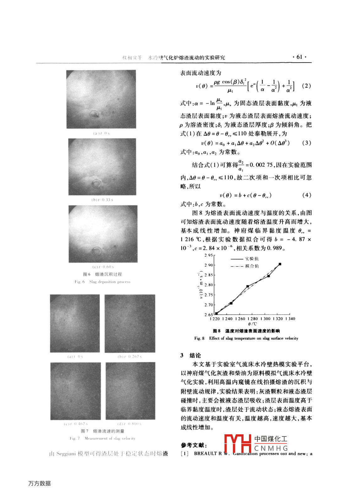第40卷第3期化學(xué)T、程Vol. 40 No. 32012年3月CHEMICAL ENGINEERING( CHINA)Mar. 2012水冷壁氣化爐熔渣流動(dòng)的實(shí)驗(yàn)研究程相宣,侯國君,梁欽鋒,許建良,劉海峰(華東理T.大學(xué)煤氣化教育部重點(diǎn)實(shí)驗(yàn)室,上海200237)摘要:水冷壁氣流床氣化爐的核心思想是“以渣抗渣”,因此對熔渣沉積形態(tài)與流動(dòng)規(guī)律的研究尤為重要。文中在實(shí)驗(yàn)室小型水冷壁氣化爐熱模裝置上,以神府煤氣化灰渣柴油和純氧氣為原料模擬氣流床水冷璧氣化實(shí)驗(yàn),采用高溫內(nèi)窺鏡并結(jié)合數(shù)字圖像處理技術(shù)研究了熔渣的沉積.流動(dòng)過程。實(shí)驗(yàn)結(jié)果表明:氣化爐操作溫度高于熔渣臨界黏度溫度時(shí),渣層表面灰渣處于熔融狀態(tài);運(yùn)動(dòng)到壁面處的灰渣顆粒主要被熔融渣層吸收;熔渣的流動(dòng)速度和渣層表面溫度有關(guān)系,渣層表面溫度越高,熔渣流動(dòng)速度越大。在實(shí)驗(yàn)條件下,熔渣層表面速度約為0.002 6- -0.003 m/s。關(guān)鍵詞:氣化爐;水冷壁;熔渣流動(dòng);熔渣沉積;內(nèi)窺鏡中圖分類號:TQ 54文獻(xiàn)標(biāo)識碼:A文章編號:1005-9954(2012)03-0058-05Experimental study of slag flow on membrane wall in entrained-flow gasiferCHENG Xiang-xuan, HOU Guo-jun, LIANG Qin-feng, XU Jian-liang, LIU Hai-feng( Key Laboratory of Coal Gasification of Ministry of Education, East China University ofScience and Technology , Shanghai 200237, China)Abstract:The core idea of membrane wall-lined gasifier is‘ using slag to protect the gasifier' , so the study on theslag deposition and flow law is especially important. With Shenfu slag, diesel oil and pure oxygen as raw materials,the slag deposition and flow were studied in a lab- scale membrane wall-lined entrained-flow gasifer via endoscopeand digital image processing technology. The results show that when the temperature of gasifier is higher than that atslag cnitical viscosity, the slag in the surface is in molten state; the char particles reached the reactor wall aremainly captured by the molten slag layer; the slag flow velocity is inluenced by the slag surface temperature, thatis, the higher the temperature, the faster the speed. The slag velocity is about 0. 002 6-0. 003 m/s under theexperimental conditions.Key words : gasifier; membrane wall; slag flow; slag deposition; endoscope氣流床煤氣化是煤炭潔凈利用的重要途徑,而有效地保護(hù)了水冷壁,使氣化裝置可以長周期運(yùn)轉(zhuǎn)。氣化爐又是煤氣化過程中的關(guān)鍵設(shè)備。水冷壁氣流因此,對熔渣流動(dòng)、渣層形態(tài)的研究尤為重要。國內(nèi)床氣化技術(shù)以其煤種適應(yīng)性強(qiáng)、生產(chǎn)能力大碳轉(zhuǎn)化外學(xué)者就氣化爐熔渣的沉積與附壁流動(dòng)進(jìn)行了大量率高和使用壽命長等特點(diǎn)得到廣泛關(guān)注,是大規(guī)模的研究,袁宏字等(4]以石蠟作為熔渣模擬介質(zhì)研究煤氣化技術(shù)發(fā)展的主流方向。目前Shell, Prenflo和了不同條件下氣化爐內(nèi)熔渣厚度的整體分布規(guī)律。Siemens等都采用了水冷壁技術(shù)[2]。國內(nèi)西安熱工貢文政等[5]在小型熱模裝置上進(jìn)行了熔渣沉積形研究院開發(fā)的二段式粉煤加壓氣化技術(shù)和華東理工態(tài)研究,研究了熔渣在氣化爐內(nèi)的沉積特性。張建大學(xué)開發(fā)的水冷壁粉煤加壓氣化爐也正在進(jìn)行工業(yè)法等[°以糖漿為模擬介質(zhì)研究了氣化爐渣口熔渣示范')]。水冷壁氣流床氣化爐的核心思想是“以渣的流動(dòng)特性。Seggani(7] 提出了描述渣層生成模型,抗渣" ,即利用煤在氣化過程中產(chǎn)生的大量熔渣,附通過建立質(zhì)量、能量和動(dòng)量守恒,然后運(yùn)用有限差分著在氣化爐內(nèi)壁上形成具有較大熱阻的渣層,從而法進(jìn)行離散求解,研究了氣化爐內(nèi)渣層溫度以及厚收稿日期:201109-22基金項(xiàng)目:國家重點(diǎn)基礎(chǔ)研究發(fā)展計(jì)劃"973"項(xiàng)目(2010C227005);國家自然科學(xué)基金資助中國煤化工作者簡介:程相宜( 1983- -).男 ,碩士研究生,研究方向?yàn)闅饬鞔矚饣癄t熔渣流動(dòng),E-mail:cher:YHCNMHC數(shù)授.通信聯(lián)系人,E- mail:hfiu@ ecust. edu. cn。程相宣等水冷壁氣化爐熔渣流動(dòng)的實(shí)驗(yàn)研究●59●度分布規(guī)律。Bingzhi等[8]基于Seggiani模型研究了氣保護(hù)通道,防止柴油潤濕灰渣導(dǎo)致噴嘴堵塞。鍋爐熔渣沿渣層方向的速度分布。劉升等191利用CFD商業(yè)軟件計(jì)算了Texaco氣化爐內(nèi)分層流動(dòng)特性。Michael等[10]研究了渣層厚度沿爐膛高度的變化規(guī)律。Ni等["]研究了不同操作溫度下氣化爐內(nèi)渣層內(nèi)部的速度分布。但目前關(guān)于氣流床水冷壁氣化爐內(nèi)壁面熔渣流動(dòng)與沉積的實(shí)驗(yàn)結(jié)果仍極為缺乏,也限制了模型研究的進(jìn)-一步發(fā)展。本文基于實(shí)驗(yàn)室小型氣流床水冷壁熱模平臺,以神府煤氣化灰渣、柴油和純氧為原料模擬氣流床水冷壁氣化實(shí)驗(yàn),采用高溫內(nèi)窺鏡在線拍攝,圖2四通道 噴嘴結(jié)構(gòu)示意圖成功觀測到了熔渣在氣化爐壁面的流動(dòng)與沉積現(xiàn)Fig.2 Schematie diagram of sructure of four -channel burmer象,得到了熔渣表面的流動(dòng)速度與爐壁溫度對應(yīng)關(guān)系。為了縮短實(shí)驗(yàn)周期,增強(qiáng)結(jié)渣效果,采用氣化灰渣代替粉煤進(jìn)料,輔以柴油伴燒,模擬氣流床水冷壁1實(shí)驗(yà