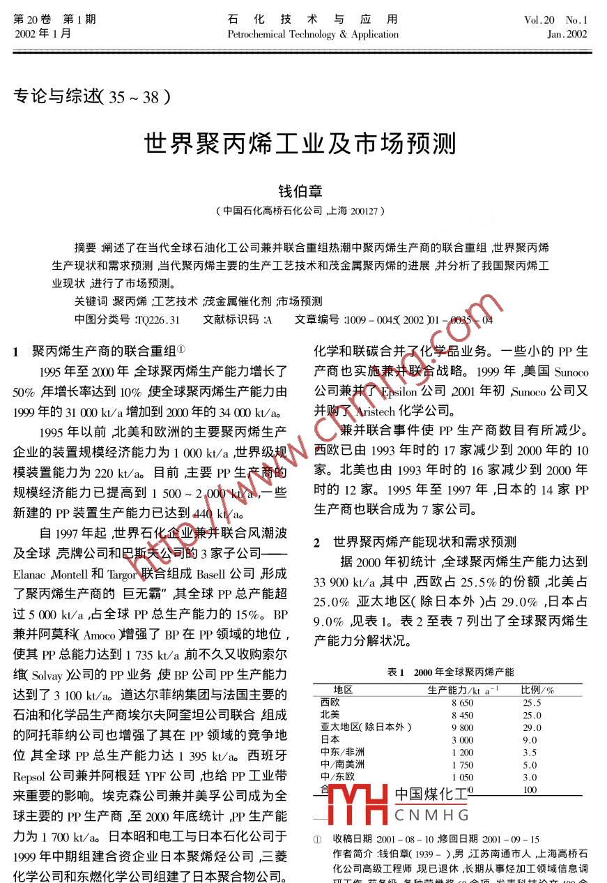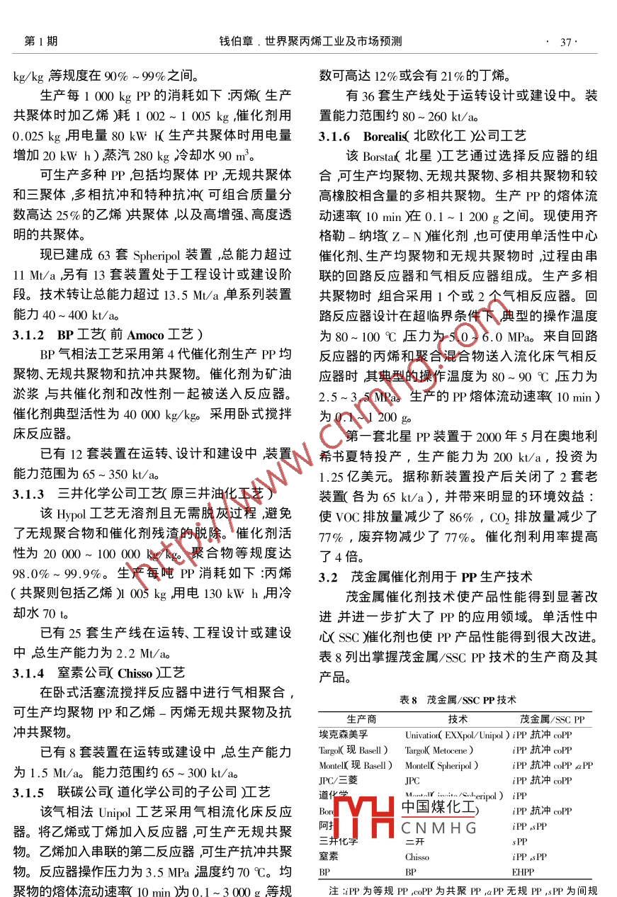 第20卷第1期石化技術(shù)應(yīng)用2002年1月Petrochemical Technology ApplicatJan.2002專論與綜述(35~38)世界聚丙烯工業(yè)及市場(chǎng)預(yù)測(cè)錢(qián)伯章中國(guó)石化高橋石化公司上海200127)摘要闡述了在當(dāng)代全球石油化工公司兼并聯(lián)合重組熱潮中聚丙烯生產(chǎn)商的聯(lián)合重組世界聚丙烯生產(chǎn)現(xiàn)狀和需求預(yù)測(cè)當(dāng)代聚丙烯主要的生產(chǎn)工藝技術(shù)和茂金屬聚丙烯的進(jìn)展并分析了我國(guó)聚丙烯工業(yè)現(xiàn)狀進(jìn)行了市場(chǎng)預(yù)測(cè)。關(guān)鍵詞聚丙烯江藝技術(shù)茂金屬催化劑市場(chǎng)預(yù)測(cè)中圖分類號(hào)Q26文獻(xiàn)標(biāo)識(shí)碼文章編號(hào)1009-00420001-0035-04聚丙烯生產(chǎn)商的聯(lián)合重組①化學(xué)和聯(lián)碳合并了化學(xué)品業(yè)務(wù)。一些小的PP生1995年至2″00年全球聚丙烯生產(chǎn)能力增長(zhǎng)了產(chǎn)商也實(shí)施兼并聯(lián)合戰(zhàn)略。1999年美國(guó)Sun∞cσ50%年增長(zhǎng)率達(dá)到10%使全球聚丙烯生產(chǎn)能力由公司兼并了 Epsilon公司2001年初Smo公司又199年的31000kt/a增加到200年的34000k/a并購(gòu)了 Aristech化學(xué)公司1995年以前北美和歐洲的主要聚丙烯生產(chǎn)兼并聯(lián)合事件使PP生產(chǎn)商數(shù)目有所減少企業(yè)的裝置規(guī)模經(jīng)濟(jì)能力為1000kta,世界級(jí)規(guī)西歐已由1993年時(shí)的17家減少到2000年的10模裝置能力為220k/a。目前主要P生產(chǎn)商的家。北美也由1993年時(shí)的16家減少到2000年規(guī)模經(jīng)濟(jì)能力已提高到1500~2000ka,些時(shí)的12家。199年至1997年,日本的14家P新建的PP裝置生產(chǎn)能力已達(dá)到440kt/ao生產(chǎn)商也聯(lián)合成為7家公司。自1997年起,世界石化企業(yè)兼并聯(lián)合風(fēng)潮波2世界聚丙烯產(chǎn)能現(xiàn)狀和需求預(yù)測(cè)及全球殼牌公司和巴斯夫公司的3家子公司據(jù)2000年初統(tǒng)計(jì)全球聚丙烯生產(chǎn)能力達(dá)到Elanac Montel和 Targor聯(lián)合組成Bac公司形成了聚丙烯生產(chǎn)商的巨無(wú)霸”其全球PP總產(chǎn)能超33900k/a其中,西歐占25.5%的份額北美占25.0%亞太地區(qū)(除日本外)占29.0%日本占過(guò)500Ma全球P總生產(chǎn)能力的15%。BP9.0%見(jiàn)表1。表2至表7列出了全球聚丙烯生兼并阿莫科Am∞o增強(qiáng)了B在P領(lǐng)域的地位,產(chǎn)能力分解狀況。使其PP總能力達(dá)到1735kt/a前不久又收購(gòu)索爾維 Solvay)司的PP業(yè)務(wù)使BP公司PP生產(chǎn)能力表12000年全球聚丙烯產(chǎn)能達(dá)到了3100kt/a道達(dá)爾菲納集團(tuán)與法國(guó)主要的地區(qū)生產(chǎn)能力/kta-1比例/%西歐石迪和化學(xué)品生產(chǎn)商埃爾夫阿至坦公司聯(lián)合組成北太地區(qū)除日本外)8如29.0日本9.0位其全球P總生產(chǎn)能力達(dá)1395ka西班牙東非洲3,5Repsol公司兼并阿根廷YPF公司也給PP工業(yè)帶中/東歐3.0來(lái)重要的影響。??松炯娌⒚梨诠境蔀槿袊?guó)煤化工°球主要的P生產(chǎn)商至2000年底統(tǒng)計(jì)PP生產(chǎn)能TyHCNMHG力為1700kta。日本昭和電工與日本石化公司于④收稿日期2001-08-10修回日期2001-00-151999年中期組建合資企業(yè)日本聚烯烴公司三菱作者簡(jiǎn)介錢(qián)伯章(1939-)男江蘇南通市人,上海高橋石化學(xué)公司和東燃化學(xué)公司組建了日本聚合物公司?;靖呒?jí)工程師現(xiàn)已退休,長(zhǎng)期從事烴加工領(lǐng)域信息調(diào)研工作獲各級(jí)、各種榮譽(yù)獎(jiǎng)60余項(xiàng)發(fā)表科技論文400余2001年三殲存拳司又兼并了住友化學(xué)公司。道篇撰寫(xiě)著作、論文、短文、調(diào)研報(bào)告共400余萬(wàn)字。石化技術(shù)與應(yīng)用第20卷表2北美美國(guó)和加拿大洛公司聚丙烯產(chǎn)能的占4%。生產(chǎn)能力/kta表5中東/非洲各國(guó)聚丙烯產(chǎn)能家生產(chǎn)能力/kta1阿托-菲納97孓總生產(chǎn)能力1395)伊朗Epsilon以色列??顾仆匕?松梨?05總生產(chǎn)能力1240)尼日利亞臺(tái)塑集團(tuán)340總生產(chǎn)能力570)赫斯曼沙特阿拉伯南非1475總生產(chǎn)能力4355)土耳其菲利浦斯- Sumika爾維410總生產(chǎn)能力810聯(lián)碳加托斯科)2000年底已達(dá)900kt/a北美合計(jì)844.52000年底達(dá)1700k/a表6日本各公司聚丙烯產(chǎn)能公司生產(chǎn)能力/kta表3西歐各公司聚丙烯產(chǎn)能窒素石化Grand聚合物公司生產(chǎn)能力/kta-1出光石化阿托菲納42總能力1395)日本聚合化學(xué)Montell-SDK-Sunrise住友化學(xué)Boreali(北歐化工)0gp德山曹達(dá)BP490總生產(chǎn)能力1735)3017道化學(xué)213總生產(chǎn)能力315)DSM820??松梨?8總生產(chǎn)能力1240)表7亞太(除日本外瞰地區(qū)巖丙烯產(chǎn)能160總生產(chǎn)能力4355)Repsd-YPF40總生產(chǎn)能力480)國(guó)家〔地區(qū))生產(chǎn)能力/kta-1索爾維40(總生產(chǎn)能力810)澳大利亞Tao(巴斯夫中國(guó)2西歐合計(jì)印度1400印度尼西亞馬來(lái)西亞表4中歐/東歐各國(guó)聚丙烯產(chǎn)能菲律賓國(guó)家生產(chǎn)能力/ta-1新加坡韓國(guó)保加利亞中國(guó)臺(tái)灣省捷克匈牙利卡扎克斯9785羅馬尼亞俄羅斯聯(lián)邦3聚丙烯主要生產(chǎn)技術(shù)斯洛伐尼亞3.1典型工藝技術(shù)3.1.1 Basel公司工藝合計(jì)采用 Spheripol工藝運(yùn)用液相預(yù)聚合同液相均聚和氣相共聚相結(jié)合的聚合工藝。液體丙烯在全球聚丙烯需求從2000年的30000kt/a增環(huán)中