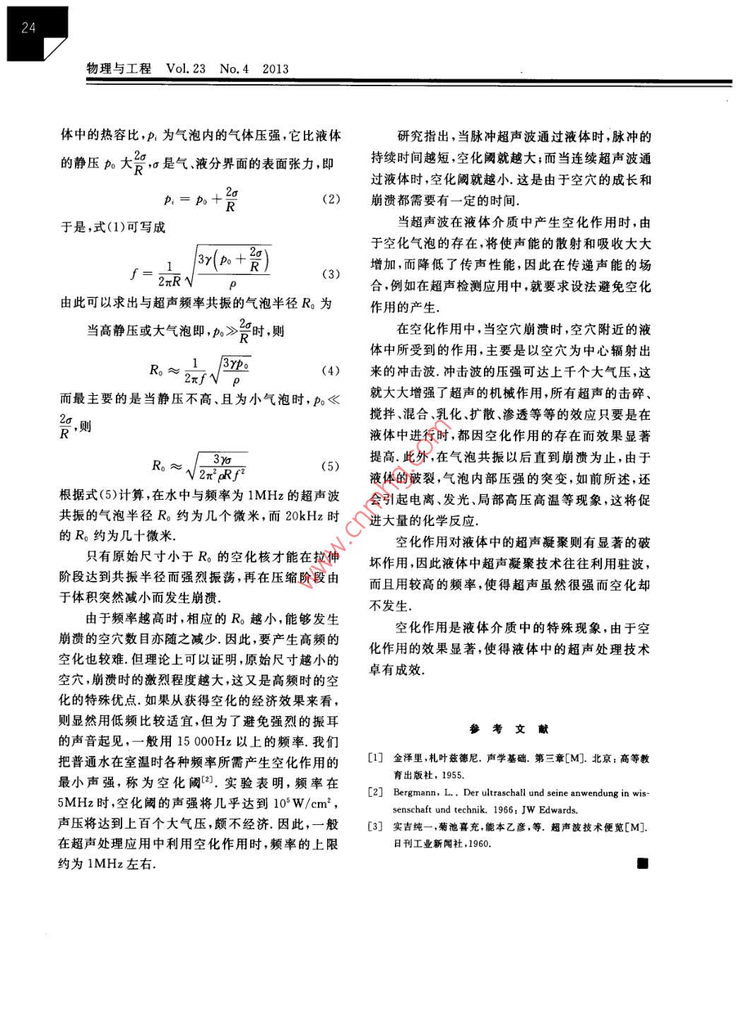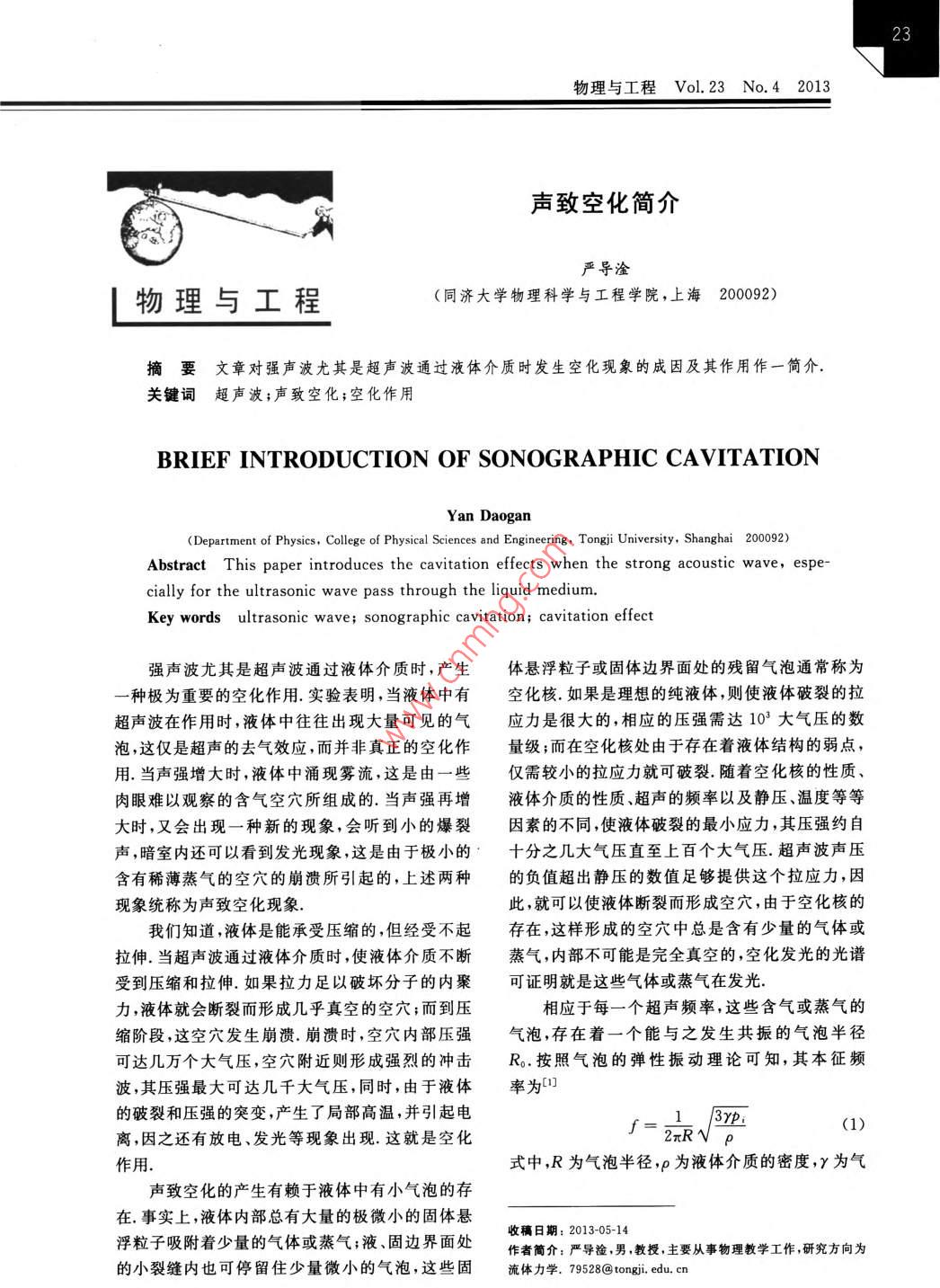 物理與工程Vol.23No.42013聲致空化簡介嚴導淦物理與工程(同濟大學物理科學與工程學院,上海200092)摘要文章對強聲波尤其是超聲波通過液體介質(zhì)時發(fā)生空化現(xiàn)象的成因及其作用作一簡介關鍵詞超聲波;聲致空化;空化作用BRIEF INTRODUCTION OF SONOGRAPHIC CAVITATIONYan DoganDepartment of Physics, College of Physical Sciences and Engineering, Tongji University, Shanghai 200092)Abstract This paper introduces the cavitation effects when the strong acoustic wave, espe-cially for the ultrasonic wave pass through the liquid medium.Key words ultrasonic wave; sonographic cavitation; cavitation effect強聲波尤其是超聲波通過液體介質(zhì)時,產(chǎn)生體懸浮粒子或固體邊界面處的殘留氣泡通常稱為一種極為重要的空化作用.實驗表明,當液體中有空化核如果是理想的純液體,則使液體破裂的拉超聲波在作用時,液體中往往出現(xiàn)大量可見的氣應力是很大的,相應的壓強需達103大氣壓的數(shù)泡,這僅是超聲的去氣效應,而并非真正的空化作量級;而在空化核處由于存在著液體結構的弱點,用.當聲強增大時,液體中涌現(xiàn)霧流,這是由一些僅需較小的拉應力就可破裂隨著空化核的性質(zhì)、肉眼難以觀察的含氣空穴所組成的當聲強再增液體介質(zhì)的性質(zhì)超聲的頻率以及靜壓溫度等等大時,又會出現(xiàn)一種新的現(xiàn)象,會聽到小的爆裂因素的不同,使液體破裂的最小應力,其壓強約自聲,暗室內(nèi)還可以看到發(fā)光現(xiàn)象,這是由于極小的分之幾大氣壓直至上百個大氣壓.超聲波聲壓含有稀薄蒸氣的空穴的崩潰所引起的,上述兩種的負值超出靜壓的數(shù)值足夠提供這個拉應力,因現(xiàn)象統(tǒng)稱為聲致空化現(xiàn)象此,就可以使液體斷裂而形成空穴,由于空化核的我們知道,液體是能承受壓縮的,但經(jīng)受不起存在,這樣形成的空穴中總是含有少量的氣體或拉伸.當超聲波通過液體介質(zhì)時,使液體介質(zhì)不斷蒸氣,內(nèi)部不可能是完全真空的,空化發(fā)光的光譜受到壓縮和拉伸.如果拉力足以破壞分子的內(nèi)聚可證明就是這些氣體或蒸氣在發(fā)光力,液體就會斷裂而形成幾乎真空的空穴;而到壓相應于每一個超聲頻率,這些含氣或蒸氣的縮階段,這空穴發(fā)生崩潰崩潰時,空穴內(nèi)部壓強氣泡存在著一個能與之發(fā)生共振的氣泡半徑可達幾萬個大氣壓,空穴附近則形成強烈的沖擊R按照氣泡的彈性振動理論可知,其本征頻波,其壓強最大可達幾千大氣壓,同時,由于液體率為的破裂和壓強的突變,產(chǎn)生了局部高溫,并引起電1 3yp(1)離,因之還有放電、發(fā)光等現(xiàn)象出現(xiàn)這就是空化2πRNp作用.式中R為氣泡半徑,p為液體介質(zhì)的密度,y為氣聲致空化的產(chǎn)生有賴于液體中有小氣泡的存在事實上,液體內(nèi)部總有大量的極微小的固體懸浮粒子吸附著少量的氣體或蒸氣;液、固邊界面處收稿日期:2013-05-14作者簡介:嚴導淦,男,教授,主要從事物理教學工作,研究方向為的小裂縫內(nèi)也可停留住少量微小的氣泡,這些固流體力學.79528@ tongji,edu,cn物理與工程Vol.23No.42013體中的熱容比,p為氣泡內(nèi)的氣體壓強,它比液體研究指出,當脈沖超聲波通過液體時,脈沖的的靜壓po大,是氣液分界面的表面張力,即持續(xù)時間越短,空化闕就越大;而當連續(xù)超聲波通過液體時,空化閾就越小.這是由于空穴的成長和p,=p+(2)崩潰都需要有一定的時間于是,式(1)可寫成當超聲波在液體介質(zhì)中產(chǎn)生空化作用時,由于空化氣泡的存在,將使聲能的散射和吸收大大3y po增加,而降低了傳聲性能,因此在傳遞聲能的場合,例如在超聲檢測應用中,就要求設法避免空化由此可以求出與超聲頻率共振的氣泡半徑R0為作用的產(chǎn)生當高靜壓或大氣泡即,p>R時,則在空化作用中,當空穴崩潰時,空穴附近的液體中所受到的作用,主要是以空穴為中心輻射出2πfNp(4)來的沖擊波沖擊波的壓強可達上千個大氣壓,這而最主要的是當靜壓不高、且為小氣泡時,p<就大大增強了超聲的機械作用,所有超聲的擊碎攪拌、混合、乳化、擴散、滲透等等的效應只要是在則液體中進行時,都因空化作用的存在而效果顯著(5)提高.此外,在氣泡共振以后直到崩潰為止,由于液體的破裂,氣泡內(nèi)部壓強的突變,如前所述,還根據(jù)式(5)計算,在水中與頻率為1MHz的超聲波會引起電離、發(fā)光、局部高壓高溫等現(xiàn)象,這將促共振的氣泡半徑R0約為幾個微米,而20kHz時進大量的化學反應的R。約為幾十微米空化作用對液體中的超聲凝聚則有顯著的破只有原始尺寸小于Rn的空化核才能在拉伸壞作用,因此液體中超聲凝聚技術往往利用駐波,階段達到共振半徑而強烈振蕩,再在壓縮階段由而且用較高的頻率,使得超聲雖然很強而空化卻于體積突然減小而發(fā)生崩潰不發(fā)生由于頻率越高時,相應的R。越小,能夠發(fā)生崩潰的空穴數(shù)目亦隨之減少.因此,要產(chǎn)生高頻的空化作用是液體介質(zhì)中的特殊現(xiàn)象,由于空空化也較難但理論上可以證明,原始尺寸越小的化作用的效果顯著,使得液體中的超聲處理技術空穴,崩潰時的激烈程度越大,這又是高頻時的空卓有成效化的特殊優(yōu)點如果從獲得空化的經(jīng)濟效果來看則顯然用低頻比較適宜,但為了避免強烈的振耳的聲音起見,一般用15000Hz以上的頻率.我們把普通水在室溫時各種頻率所需產(chǎn)生空化作