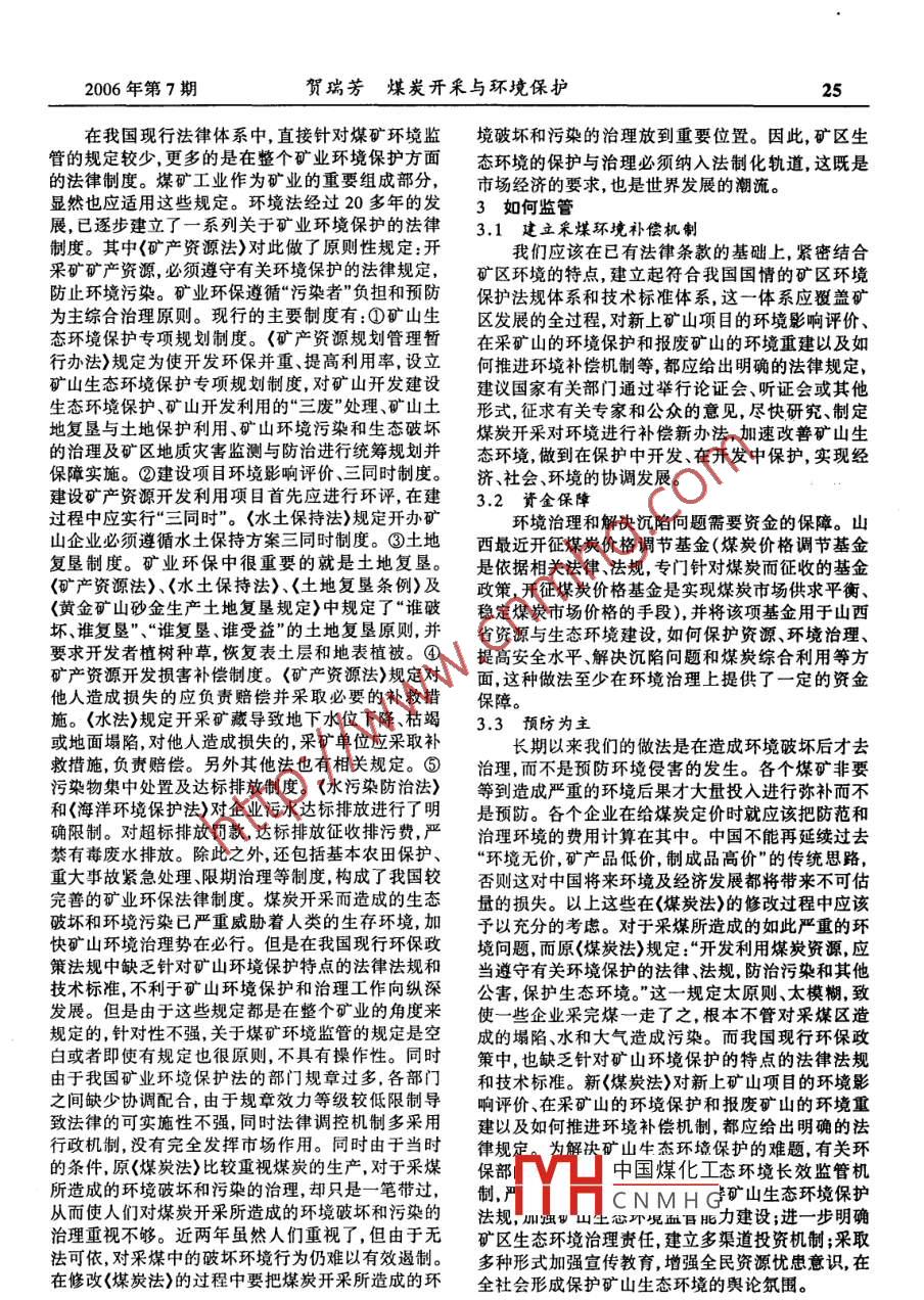 24內(nèi)蒙古石油化工2006年第7期煤炭開采與環(huán)境保護(hù)賀瑞芳(神華準(zhǔn)格爾能源有限責(zé)任公司行政環(huán)保處)摘要本文主要介紹了煤炭開采過程中造成的環(huán)境污染問題及對(duì)煤礦進(jìn)行監(jiān)管的必要性和監(jiān)管辦法。關(guān)鍵詞煤炭開采;監(jiān)管煤炭是我國(guó)的主要能源,對(duì)經(jīng)濟(jì)建設(shè)和社會(huì)發(fā)礦區(qū)經(jīng)過80多年開采,已形成地表采煤沉陷區(qū)193展具有重要作用,是我國(guó)可持續(xù)發(fā)展戰(zhàn)略實(shí)施的資平方公里;鶴崗礦區(qū)有63.73平方公里的沉陷區(qū),其源保證。但是,長(zhǎng)期以來,由于我們對(duì)煤炭資源保中最深的地方下沉了30米,在地面上造成6米多的護(hù)認(rèn)識(shí)不足,對(duì)環(huán)境和生態(tài)保護(hù)重視不夠,從而形成裂縫,而且現(xiàn)在仍在以每年1.3米的速度下沉。.了煤炭工業(yè)粗放經(jīng)營(yíng)的經(jīng)濟(jì)增長(zhǎng)模式,這一模式在1.2 水位下降造成供水緊張?jiān)斐擅禾抠Y源嚴(yán)重浪費(fèi)的同時(shí),也帶來了- -系列的煤炭開采除了造成采空塌陷外,還危及地下水環(huán)境問題,在一些地區(qū)已表現(xiàn)的十分嚴(yán)重。針對(duì)這資源,加劇缺水地區(qū)的供水緊張。煤炭開采過程中-現(xiàn)狀,為了實(shí)現(xiàn)社會(huì)經(jīng)濟(jì)的可持續(xù)發(fā)展,用法律的的礦井水、洗煤水和矸石淋溶水等未經(jīng)完善凈化就手段對(duì)煤礦進(jìn)行環(huán)境監(jiān)管便顯得十分重要。被直接排放,對(duì)周圍水環(huán)境造成了嚴(yán)重的污染,僅山1煤礦造成的環(huán)境問題十分嚴(yán)峻西省水資源的破壞造成的經(jīng)濟(jì)損失就達(dá)300個(gè)億。長(zhǎng)期以來,我國(guó)對(duì)煤炭開發(fā)采取了“大、中、小型公開資料顯示,山西省社科院從20世紀(jì)80年代起,煤礦并舉,國(guó)家、集體、個(gè)人一起上”的方針,導(dǎo)致鄉(xiāng)曾經(jīng)多次對(duì)環(huán)境污染的經(jīng)濟(jì)損失進(jìn)行過核算。核算鎮(zhèn)、個(gè)體煤礦迅猛發(fā)展,而這些小煤礦大多布局不合表明,山西省每年的污染損失大約占到GDP的理,設(shè)備簡(jiǎn)陋陳舊,技術(shù)力量薄弱,環(huán)保設(shè)施不到位,15%左右,而新增的GDP大約占9%左右,據(jù)調(diào)查,其回采率僅10%,遠(yuǎn)遠(yuǎn)低于國(guó)家規(guī)定,這種“掠奪全國(guó)96個(gè)國(guó)有重點(diǎn)礦區(qū)中,缺水礦區(qū)占71%,其中式”的亂采、濫挖使寶貴的煤炭資源遭到嚴(yán)重浪費(fèi),嚴(yán)重缺水礦區(qū)占40%。隨著煤炭開采強(qiáng)度和延伸并且造成了當(dāng)?shù)氐纳鷳B(tài)破壞和環(huán)境污染,成為制約速度的不斷加大提高,礦區(qū)地下水位大面積下降,使我國(guó)經(jīng)濟(jì)杜會(huì)可持續(xù)發(fā)展的重要因素。煤礦造成的缺水礦區(qū)供水更為緊張,以至影響當(dāng)?shù)鼐用竦纳a(chǎn)環(huán)境問題包括這樣幾個(gè)方面:和生活。另-方面,大量地下水資源因煤系地層破1.1 采空塌陷加劇生態(tài)惡化壞而滲漏礦井并被排出,這些礦井水被凈化利用的多年來,由于煤炭開采沉陷造成我國(guó)東部平原不足20%,對(duì)礦區(qū)周邊環(huán)境造成了新的污染,嚴(yán)重礦區(qū)土地大面積積水受淹或鹽漬化,使西部礦區(qū)水影響了社會(huì)經(jīng)濟(jì)的可持續(xù)發(fā)展。據(jù)統(tǒng)計(jì),我國(guó)煤礦土流失和土地荒漠化加劇。據(jù)東方網(wǎng)2005年1月每年生產(chǎn)的各種廢污水約占全國(guó)總廢污水量的7日?qǐng)?bào)道,山西省社科院研究員李連濟(jì)在其已完成25%。同時(shí)地下水位的嚴(yán)重下降,也使區(qū)域內(nèi)的作的國(guó)家哲學(xué)社會(huì)科學(xué)基金重點(diǎn)課題<我國(guó)煤炭城市物大面積減產(chǎn),抗御自然災(zāi)害能力下降,嚴(yán)重危害農(nóng)采空塌陷災(zāi)害及防治對(duì)策研究>中統(tǒng)計(jì)的數(shù)據(jù)是截業(yè)生產(chǎn)。至2004年12月3日,全國(guó)煤礦累計(jì)采空塌陷面積1.3 廢氣排放危害大氣環(huán)境超過70萬公頃,造成的損失已經(jīng)超過500億元。我煤炭開采導(dǎo)致廢氣排放,危害大氣環(huán)境。因煤國(guó)重點(diǎn)煤礦,平均采空塌陷面積約占礦區(qū)含煤面積炭開采形成的廢氣主要指礦井瓦斯和地面矸石山自的十分之一。 其中,山西作為產(chǎn)煤大省,是采空塌陷燃釋放的氣體。據(jù)統(tǒng)計(jì),我國(guó)每年從礦井開采中排災(zāi)害最嚴(yán)重的地區(qū)。由于采煤,山西省每年新增加放甲烷70- -90億立方米,礦區(qū)地面矸石山自燃釋放塌陷區(qū)面積94平方公里。近二十年的能源基地建出大量含SO2、CO2、CO等有毒有害氣體,嚴(yán)重污染設(shè),大規(guī)模開采煤炭,造成礦區(qū)土地塌陷、地表擾動(dòng)大氣環(huán)境并直接損害周圍居民的身體健康。據(jù)國(guó)家等地質(zhì)災(zāi)害。據(jù)調(diào)查,僅1993 - 2003年全省因煤炭煤礦安全監(jiān)察局統(tǒng)計(jì),我國(guó)目前國(guó)有煤礦共有矸石開采就有40余萬畝水澆地變成旱地,平均每年4萬山1500余座.其中長(zhǎng)期白愀矸石山389座,嚴(yán)重污余畝。在黑龍江省,采煤業(yè)的發(fā)展使其土地塌陷問染了中國(guó)煤化工境,影響著周邊居民.題也較為嚴(yán)重。七臺(tái)河礦區(qū)從1958年開始開發(fā),在的身YHCNM H G,5