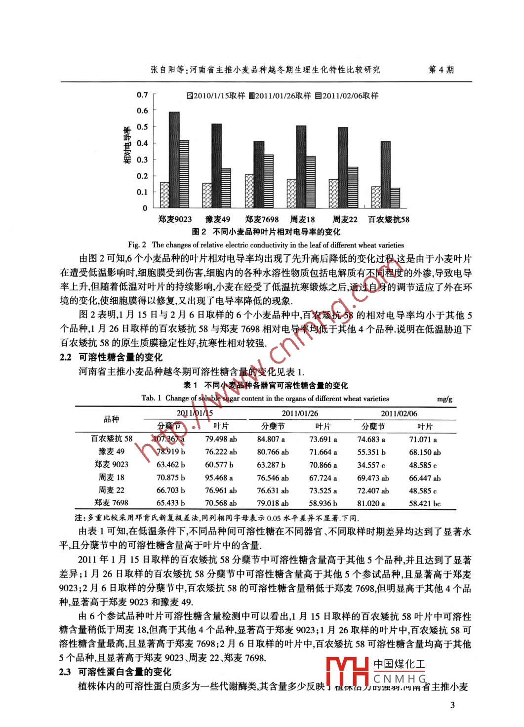 第40卷第4期河南科技學(xué)院學(xué)報2012年8月Vol. 40 No. 4Journal of Henan Institute of Science and TechnologyAug. 2012do1i03969/j.ss.10088 -7516.2012.04.001河南省主推小麥品種越冬期生理生化特性比較研究張自陽,馮素偉,姜小苓,李淦,胡鐵柱,茹振鋼(河南科技學(xué)院,河南新鄉(xiāng)453003)摘要:田間自然條件下,在小麥越冬期對百農(nóng)矮抗58、鄭麥9023.周麥18、周麥22鄭麥7698、豫麥49的葉片和分蘗節(jié)取樣,測定與抗寒性相關(guān)的生理生化指標(biāo)結(jié)果表明:與其他品種相比,百農(nóng)矮抗58分蘗節(jié)和葉片中的可溶性糖、可溶性蛋白以及游離脯氨酸含量,P0D活性整體高于鄭麥9023、周麥18、周麥22、鄭麥7698、豫麥49,相對電導(dǎo)率低于鄭麥9023、周麥18、周麥22、鄭麥7698、豫麥49.說明百農(nóng)矮抗58的抗寒性較好,這些特點為其高產(chǎn)穩(wěn)產(chǎn)廣適奠定了生理基礎(chǔ);同時,百農(nóng)矮抗58可溶性糖電導(dǎo)率脯氨酸含量變化規(guī)律較強(qiáng),可以作為輔助鑒定半冬性小麥品種抗寒性的生理指標(biāo).關(guān)鍵詞:小麥;抗寒性;生理生化中圖分類號:S512.1文獻(xiàn)標(biāo)志碼:A文章編號:1008-7516(2012)04 -001-06Comparative study on physiologicaland biochemical characteristicsduring wheat overwintering period of major wheat varieties in HenanZhang Ziyang,Feng Suwei,Jiang Xiaoling,Li Gan,Hu Tiezhu,Ru Zhengang(Henan Institute of Science and Technology,Xinxiang 453003,China)Abstract:To detemine some physiologcal and biochemical indexs related to cold-resistance use tlein node andleaves of Bainongaikang 58,Zhengmai 9023,Zhoumai 18,Zhoumai 22,Zhengmai 7698 and Yumai 49 in wheatoverwintering period.The result showed that compared with Zhengmai 9023,Zhoumai 18,Zhoumai 22,Zhengmai 7698,Yumai 49,The soluble sugars,soluble protein,proline and peroxidase (POD) activity of Bainongaikang 58 were higherthan those five cultivars.The relative conductivity were lower than those five cutivars,indicating Bainongaikang 58had better cold resistance.These physiological characteristics established a foundation for high and stable yield andwide adaptability .Meanwhile,the change of soluble sugars,prolnerelative conductivity which in Bainongaikang 58 aremore regular.So,the soluble sugars,relative conductive,proline were usually as the guideline of cold hardiness.Key words:wheat;cold resistance ;physiological and biochemical characteristics河南省屬暖溫帶向亞熱帶、濕潤向半濕潤過渡的季風(fēng)氣候區(qū),冬季寒冷雨雪少,低溫凍害是黃淮麥區(qū)小麥生產(chǎn)上的主要氣象災(zāi)害之一.近年來河南省 災(zāi)害性天氣頻繁,給農(nóng)業(yè)生產(chǎn)造成巨大損失,特別是低溫對河南省小麥生產(chǎn)構(gòu)成巨大威脅.據(jù)2005年1月12日統(tǒng)計",小麥凍害面積143.79 萬hm?,嚴(yán)重凍害面積24.73萬hm?;2007年3月7日.4月3日河南省出現(xiàn)兩次強(qiáng)度較大的降溫過程造成大部分小麥品種受凍害,全省小麥?zhǔn)軆龊γ娣e達(dá)16.04萬hm',有0.67萬hm2絕收,對小麥生產(chǎn)造成了巨大影響;2010收稿日期:2012-07-05基金項目:“973"國家重點基礎(chǔ)研究發(fā)展計劃項目(2012CB114300)中國煤化工作者簡介:張自陽(1984-),男,河南舞鋼人,碩士,助理實驗師.主要從事小麥CHCNMHG通信作者:茹振鋼(1958-),男,河南焦作人,教授,碩士生導(dǎo)師.主要從事小麥遺傳育種教學(xué)與研究L作.12012年河南科技學(xué)院學(xué)報(自然科學(xué)版)年出現(xiàn)了零下16C的極端低溫等小麥凍害已成為小麥生產(chǎn)發(fā)展亟待解決的重要問題,而選用抗凍性強(qiáng)的小麥品種是有效防止或減輕凍害損失的基本途徑.對于小麥的抗寒機(jī)理已有較多的研究叫,不同研究者對不同地區(qū)、不同抗寒品種的生理指標(biāo)界定也不盡相同50.國審小麥新品種百農(nóng)矮抗58自審定以來經(jīng)受了千旱、低溫等多種不良天氣的嚴(yán)峻考驗,現(xiàn)在已成為推廣面積最大、發(fā)展勢頭最好的全國主導(dǎo)品種.本試驗對百農(nóng)矮抗58和河南省主栽小麥品種的生理、生化特性進(jìn)行比較研究,旨在為百農(nóng)矮抗58的抗寒性研究、黃準(zhǔn)地區(qū)半冬性小麥品種抗寒鑒定及小麥新品系抗寒性評價提供生理生化方面的理論依據(jù).1材料與方法1.1材料與試驗設(shè)計供試品種為百農(nóng)矮抗58、周麥18、 鄭麥9023、豫麥49鄭麥7698、周麥22.試驗材料均由河南科技學(xué)院小麥中心提供.試驗于2010- 2011年在河南科技學(xué)院試驗田進(jìn)行.隨機(jī)區(qū)組設(shè)計,3次重復(fù),行長3 m,6行區(qū),行距0.23 m,田間管理同- -般高產(chǎn)田.1.2取樣與測定方法試驗材料從2011年1月12日開始取樣,氣溫變化見圖1(取樣前20 d至取樣結(jié)束)所示.每隔10 d取樣1次,共3次,每個品種隨機(jī)選取長勢一致的麥 苗50株,用蒸餾水小心沖洗,晾干,樣品在冰盒上分苗,剪取整個分蘗節(jié)和葉片,將葉片和分蘗節(jié)均剪成0.5 cm長的小段,混勻,按0.5 g分裝,置-80 C冰箱貯存?zhèn)溆每捡R斯亮藍(lán)G- -250 法測定可溶性蛋白含量,酸性茚三酮法測定脯氨酸含量",蒽酮比色法測定可溶性糖含量圖,電導(dǎo)儀(DDS -307 )測定相對電導(dǎo)率!,愈創(chuàng)木酚法測定過氧化物酶(POD)活性",均3次重復(fù).+最低溫度一最高溫度號-8-10風(fēng)-1-14-16 L1 11.1111..11111l. lw.... s. w.....w12/20 1225 12/30 1/4 12/8日期(月/日)圈1最高溫度與最低溫度變化圖(2010/12/20-2011/02/08)Fig. 1 The lowest temperature and the highest temperature during 2010-12-20 to 2011-02-081.3數(shù)據(jù)處