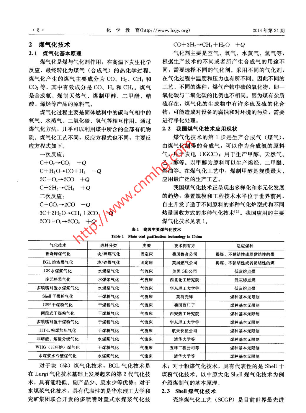 2014年第24期化學教育(http://www. hxiy. org)知識介紹我國的新型煤化工產業(yè)一煤制甲醇‘& o c secece < ccccd劉立新**謝劍軍2(1.安陽師范學院化學化工學院河南安陽45000 2.河南省煤業(yè)化工集團中原大化公司河南濮陽45704)摘要對我國新型煤化工產業(yè)煤氣化生產合成氣和煤制甲醇的生產工藝作了介紹,涉及煤資源綜合利用、低碳綠色化學工業(yè)、反應條件的選擇以及我國新型煤化工產業(yè)的發(fā)展特點和成就等。關鍵詞.新型煤化工煤氣化煤制甲醇DOI: 10. 13884/j. 1003-3807hxjy. 201 3090233通過對我國的新型煤化工產業(yè)的了解和學習,為重心。據(jù)統(tǒng)計,2013 年煤制氣產能為1900 億立可以認識到科學地利用自然資源對于我國解決能源方米,2013年甲醇產能達到5650萬噸。煤制油是問題、環(huán)境問題的特殊意義,并且能夠進- -步體會我國新型煤化工發(fā)展的重點之一,2013年中國煤和認識化學所特有的應用價值和魅力。制油產能為160萬噸,預計到2015年煤制油產能1煤化工產業(yè)概況可達1200萬噸,2020 年可達3300萬噸。煤制烯我國化石能源的特征是貧油、少氣、富煤。據(jù)烴是我國新型煤化工發(fā)展的另-一個重點,2013年統(tǒng)計,2011年我國石油和天然氣探明儲量世界排中國煤制烯烴產能為276萬噸,預計到2018年煤名第14位,同年中國煤炭探明儲量世界排名第3制烯烴產能可達2365萬噸。位[1,這就決定了我國的能源結構是以煤為主。但煤化工產業(yè)是指以煤為原料,通過多種技術的我國煤炭的利用以直接燃燒為主,不僅浪費煤炭資耦合 和集成,聯(lián)合生產多種清潔燃料、化工原料以源,而且造成對大氣的污染,因此充分利用煤炭資及熱能、電力等產品的產業(yè)。按照產業(yè)發(fā)展成熟度源、發(fā)展煤化工成為我國化學工業(yè)研究近20余年和發(fā)展歷程,煤化工可分為傳統(tǒng)煤化工和新型煤化來的重中之重。工2大類。煤化工產業(yè)鏈如圖1所示中,方框采用目前我國傳統(tǒng)煤化工各類產品生產規(guī)模均居世虛線標注的技術路線-般被認為是新型煤化工技界第一,但是傳統(tǒng)煤化工產品產能均有一定的過術,其余技術路線屬傳統(tǒng)煤化工。剩。因此,近年來我國煤化工的發(fā)展以新型煤化工PVC塑料T三麗} +[四氫呋哺]焦油+[尿素]一焦化焦炭焦爐氣F隔級南防解:.一煤氣化10十天科氣+IGCC發(fā)電PET塑料 ][防凍劑甲醛,麗酸酐,甲胺,甲基叔丁基醚+乙37丙州二上中E塑科料PP塑料L叫藏花+r:-obil技術一燃料電池[汽油添加劑Fig 1 Industry chain of coal chemical engineering圖1煤化工產業(yè)鏈,地方所屬高校 “本科教學工程”大學生校外實踐教育基地建設項目通信聯(lián)系人,E mail: slizn2002@qq. com化學教育(http://www. hxjy. org)2014年第24期2煤氣化技術CO+3H2→CH,+H2O +Q2.1煤氣化基本原理氣化劑主要是空氣、氧氣、水蒸氣、氫氣等,煤氣化是煤與氣化劑作用,在高溫下發(fā)生化學根據(jù)生產技術的不同或者所產生合成氣的用途不反應,最終轉化為煤氣(合成氣)的熱化學過程。同,需要選擇不同的氣化劑。采用不同的氣化劑,煤氣化產生的煤氣主要成分為CO、H2、 CH和在氣化過程中溫度和壓力也有所不同。因此不同的CO2等,其中有效成分是CO、H2和CH4。煤氣工藝、不同的煤種,煤氣產物中碳的氧化物,即一是合成氨、煤制天然氣、煤制甲醇、二甲醚、醋氧化碳與二氧化碳的比例也不相同。因為煤有雜質酸、烯烴等產品的原料氣。硫存在,煤氣化的生成物中有許多硫及硫的化合煤氣化過程主要是固體燃料中的碳與氣相中的物,可能造成對設備的腐蝕和對環(huán)境的污染,需要氧氣、水蒸氣、二氧化碳、氫氣等相互作用。通過進行凈化處理。煤氣化方法,幾乎可以利用煤中所含的全部有機物2.2我國煤氣化技術應 用現(xiàn)狀質。煤氣化工藝不同,反應方程式也不同,主要反煤氣化技術的第1步是生產合成氣(煤氣),應方程式如下。由煤氣化制得的合成氣,可以作為合成氨的原料-次反應:氣;用于發(fā)電(IGCC); 用于生產甲醇、天然氣、C+O2→CO2 +Q乙二醇等。以甲醇為原料可以生產烯烴、二甲醚、C+H2O-→CO+H2 -Q燃油等。在煤氣化工藝中,煤制甲醇是規(guī)模最大、2C+O2-→2CO +Q應用最廣泛的生產工藝。C+2H2→CH +Q我國煤氣化技術正呈現(xiàn)出多樣化和多元化發(fā)展二次反應:的趨勢,裝置規(guī)模和工程技術水平位于世界前列,C+COn-→2CO -Q自主開發(fā)了適于不同原料的多種氣化爐型式和不同3C+2H2O-→CH, +2CO -Q .熱量回收方式的多種氣化技術2]。我國應用的主要2CO+O2→2CO2 +Q煤氣化技術見表1。表1我國主要煤氣化技術Table 1 Main c∞oal gasifcation tchnology in China氣化技術進料分類類型技術擁有方適應煤種魯奇碎煤氣化塊/碎煤氣化固定床.德國魯奇公司褐煤、不黏結性或弱黏結性的煤BGL熔渣煤氣化英國燃氣公司GE水煤漿氣化水煤漿氣化氣流床美國GE公司.低灰熔點煤多元料漿氣化西北化工研究院多噴嘴對置水煤漿氣化華東理工大學等Shell 干煤粉氣化干煤粉氣化英荷殼牌煤種基本無限制GSP干煤粉氣化德國西門子兩段式干煤粉氣化西安熱工研究院多噴嘴對置干煤粉氣化HTL粉煤加壓氣化航天長征公司非熔渣、熔渣分級氣化清華大學等WHG (五環(huán)爐)煤氣化五環(huán)工程公司等水煤漿水冷壁煤氣化對于塊(碎)煤氣化技術,BGL氣化技術是術;對于粉煤氣化技術,具有代表性的是Shell 干在Lurgi氣化