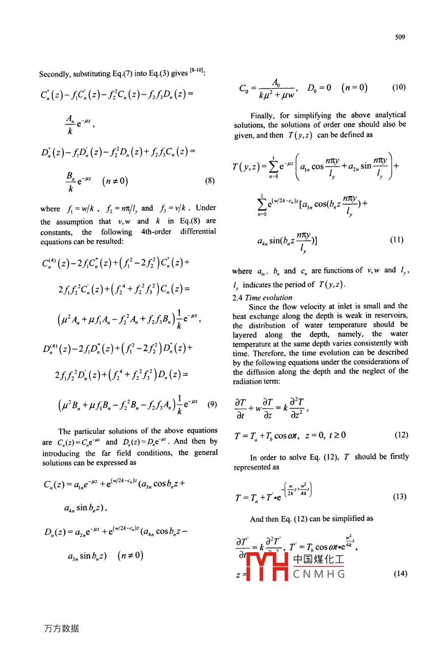 507Available online at www.sciencedirect.comScienceDirect' HHDJoumal of Hydrodynamicswww. sciencedirect com/EL SEVIER2008,20(4):507-513science/joumal/10016058FORECAST OF WATER TEMPERATURE IN RESERVOIR BASED ONANALYTICAL SOLUTION"JI Shun-wen, ZHU Yue-ming, QIANG ShengCollege of Water Conservancy and Hydroelecric Enginering, Hohai University, Nanjing 210098, China, E-mail:jishunwen@hhu.edu.cnZENG Deng-fengWater Power Plant of Sanhe Shangyoujiang, Ganzhou 341212, China(Received June 4, 2007, Revised August 20, 2007)Abstract: The water temperature in reservoirs is dificult to be predicted by numerical simulations. In this article, a statitical modelof forecasting the water temperature was proposed. In this model, the 3-D thermal conductiondiffusion equations were convertedinto a system consting of 2-D equations with the Fourier expansion and some hypotheses. Then the stistical model of forecasingthe water temperature was developed based on the analytical solution to the 2-D thermal equations. The simplified stistial modelcan elucidate the main physical mechanism of the temperature variation much more clearly than the nuimerical simulation with theNavier Stokes equations. Finally, with the presented statistical model, the distribution of water temperature in the Shangyoujiangreservoir was determined.Key words: water temperature, quasi 3-D statistical model, thermal conduction difusion equation, analytical solution, regressionanalysis, factor of radiation1. Introductionparameters into account, in the 1-D statistical modelThe major methods of forecasting the watersome different parameters were introduced for thetemperatures in reservoirs generally include empiricalempirical formulas, and the water temperature wasformulas, statistical models and numerical simulations.calculated with12].Under the assumption of periodical boundaryconditions and with the 1-D thermal equations inT(z,l)=Ce"+C2e" cos(ox-C-c2) (1)hydrodynamics, the empirical formulas presented inRef.[1] can be employed to forecast the distribution ofFurthermore, with the development of the FDMthe water temperature along the depth. However, theand FEM, numerical simulations have beenuse of the empirical formulas is limited to the flows inextensively used to calculate the distributions of thereservoirs and the method may introduce errors ofwater temperature by solving the vortex motionaliasing. In order to overcome the shortcomings ofequations of incompressible viscous fluid. Comparedempirical formulas, recently, some researchers tried towith empirical formulas and statistical models, thestudy and solve this problem from different aspects. Liamount for the numerical work is quite large. Inet al proposed a 1-D statistical model 4. Throughaddition, when there is numerical dispersion ortaking the influences of the flow pattern and the otheroscillation due to some improper treatments about theconvection terms, the prediction quality would b* Project Supported by the National Natural Sciencemuch中國煤化工- rical formulas andFoundation of China (Grant Nos. 50539010, 50539020, andstatist50579080).THCN MH Gcle, a quasi 3-DBiography: JI Shun-wen (1981- ), Malc, Ph. D. Candidatestatistican Houel IU1 uc waci temperature in508reservoirs is established, and some mathematicaldifusion equations could be converted into thedescriptions of the factors, such as the solar radiationfollowing combination of a 2-D thermal equation andand diffusivity, are given. In its second part, somea 1-D thermal equation which can be solvedtests are outlined to validate the model.individually I7:oT. JT_l 子2T。。子2T2. Governing equations+1=K-+h-+Sz(3)2.1 Thermal convectiondiffusiort equationdy)zay2)z2The 3-D thermal convection-diffusion equationswith a source term are defined as [B-6)OT+n,AT_, dT(4)ddz2aT.. T. aT . aT_n 子2TAtdx dy0zdx^2.3 Radiation factorAssume that the source term in Eq.(2) isindependent of time, and then the water temperatureaT. ,子2TJz2-+S,can be considered to reach the equilibrium state ofDy"heat exchange and satisfy Eq.(3). Based on Eq.(3), avertical 2-D numerical model for the solar radiation isT=T。+T。cosor, z=0, t20(2)established, and some mathematical descriptions ofhe factors, such as the source term and the termsrelated to the convection-diffusion, are obtained.where T is the water temperature, I is time, u,VMoreover, it is found that about 80% of theand W are respectively the components of velocityradiation could be absorbed by the superficial layer ofvectors, S denotes the source term, K=v,/σ, isthe water, and only about 5% could reach the depth ofthe thermal conductivity, v, stands for the ceofficientm, that is, the solar radiation decreasesexponentially with the depth of the water. So theof eddy viscosity, and σ, denotes the turbulentshort-wave radiation possesses the penetratingPrandtl number, T。 denotes the annual averagecapacity in water included in Eq.(3) and the sourcetemperature of the water, T is the annual variableterm can be defined as "amplitude of the temperature, 0 is the frequency.In general, the water temperature varies veryS(y,z)=e"g(y)(5)slightly along the dam axis, which meansaT/dx= 0.Firstly, for the bottom of the water, appropriateSo formeeting the requirements of predictionprecision in engineering, the 3-D thermnalconditions have to be applied to solve Eq.(3):conduction-diffusionequationscouldbeapproximately described with a system of 2-Dlim T(y,z)=0,lim S(y,z)=0(6)I→+∞.2- ++∞problems.where both of T(y,z) and S(y,z) are someSource tem:Sze* 'g(v)periodic functions in the y direction. Then, they業(yè)Boundary: T=T。+T。cosoutfollowing equations can be obtained by expandingg(y) and T(y,z) into the Fourier series in the ydirection:Reservoirg(y)=2+2.A, cos nTY+B, sinhty,F(xiàn)ig.1 Conventional diagram for 2-D thermal cquations2.2 Decomposition of the thermal convection-diffusionnty +T(y,z)=+ Z[C,(z)cosAs is shown in Fig.l, the water temperature ismainly influenced by solar radiation and air中國