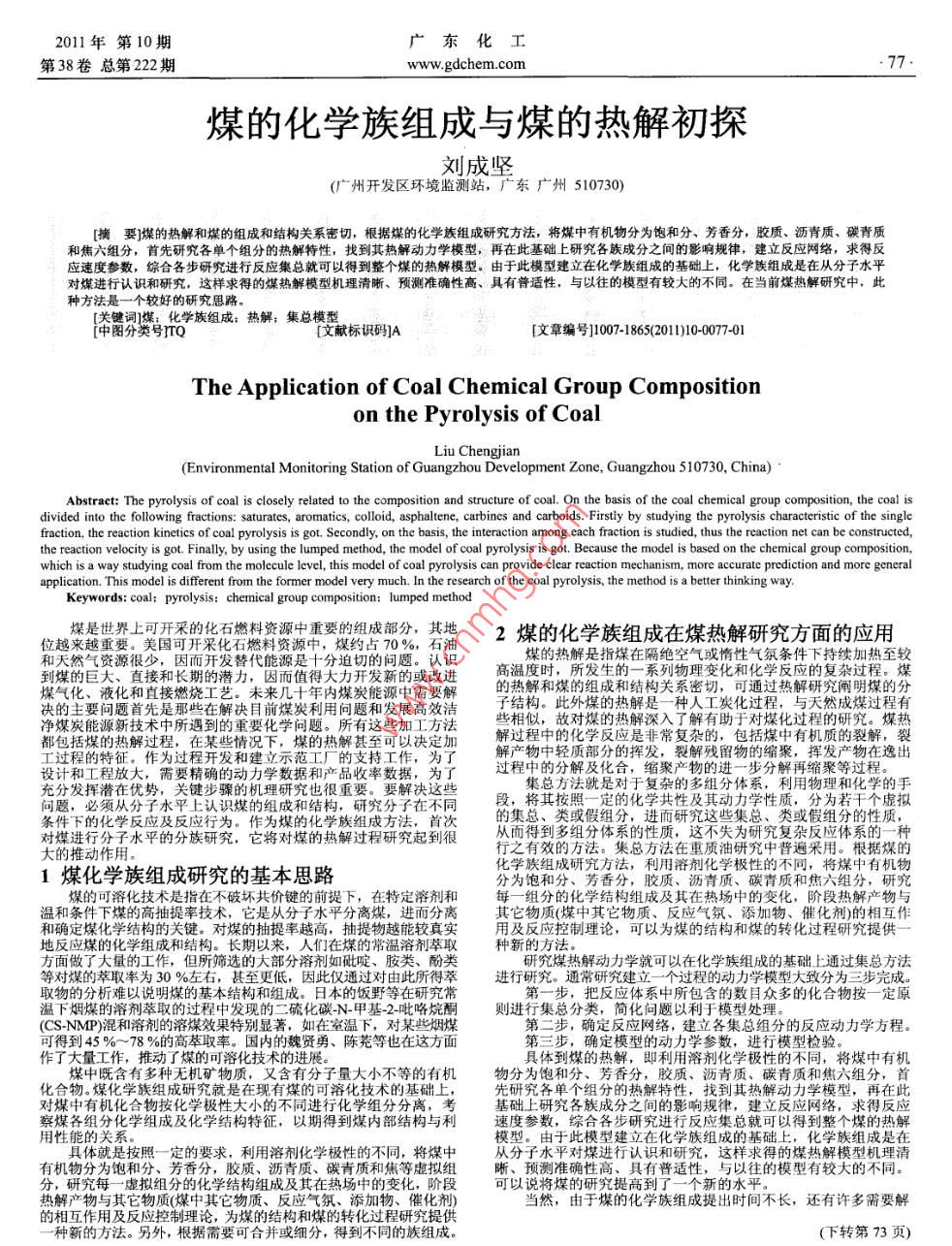 2011年第10期廣東化工第38卷總第22www.gdchem.com77煤的化學(xué)族組成與煤的熱解初探劉成堅(廣州開發(fā)區(qū)環(huán)境監(jiān)測站,廣東廣州510730)摘要煤的熱解和煤的組成和結(jié)構(gòu)關(guān)系密切,根據(jù)煤的化學(xué)族組成研究方法,將煤中有機(jī)物分為飽和分、芳香分,膠質(zhì)、瀝青質(zhì)、碳青質(zhì)應(yīng)速度參數(shù),綜合各步研究進(jìn)行反應(yīng)集總就可以得到整個煤的熱解模型。由于此模型建立在化學(xué)族組成的基礎(chǔ)上,化學(xué)族組成是在從分子水平對煤進(jìn)行認(rèn)識和硏究,這樣求得的煤熱解模型機(jī)理淸晰、預(yù)測準(zhǔn)確性高、具有普適性,與以往的模型有較大的不同。在當(dāng)前煤熱解研究中,此種方法是一個較好的研究思路[關(guān)鍵詞煤:化學(xué)族組成;熱解;集總模警6識碼A圖分類號TQ[文章編號]0071865(2011)10-007701The application of Coal Chemical Group compositionon the Pyrolysis of coalLiu Chengjian(Environmental Monitoring Station of Guangzhou Development Zone, Guangzhou 510730, ChinaAbstract: The pyrolysis of coal is closely related to the composition and structure of coal. On the basis of the coal chemical group composition, the coal isdivided into the following fractions: saturates, aromatics, colloid, asphaltene, carbines and carboids. Firstly by studying the pyrolysis characteristic of the singlefraction, the reaction kinetics of coal pyrolysis is got. Secondly, on the basis, the interaction among each fraction is studied, thus the reaction net can be constructed,the reaction velocity is got. Finally, by using the lumped method, the model of coal pyrolysis is got. Because the model is based on the chemical group composition,which is a way studying coal from the molecule level, this model of coal pyrolysis can provide clear reaction mechanism, more accurate prediction and more generalplication. This model is different from the former model very much. In the research of the coal pyrolysis, the method is a better thinking way.Keywords: coal媒是世界上可開采的化石燃料資源中重要的組成部分,其地2煤的化學(xué)族組成在煤熱解研究方面的應(yīng)用和天然氣資源很少,因而開發(fā)替代分迫切的問題。認(rèn)識煤的熱解是指煤在隔絕空氣或惰性氣氛條件下持續(xù)加熱至較到煤的巨大、直接和長期的潛力,因而值得大力開發(fā)新的或改高溫度時,所發(fā)生的一系列物理變化和化學(xué)反應(yīng)的復(fù)雜過程。煤的熱解和煤的組成和結(jié)構(gòu)關(guān)系密切,可通過熱解研究闡明煤的分決的要愿首先是那些在解決目前煤安利用間越和發(fā)展高交潔結(jié)構(gòu)此外煤的熱解是一種人工發(fā)化過程:與天然成媒過程有都包括煤的熱解過程,在某些情況下,煤的熱解甚至可以決定加解過程中的化學(xué)反應(yīng)是非常復(fù)雜的,包括煤中有機(jī)質(zhì)的裂解,裂設(shè)計和工程放大,需要精確的動力學(xué)數(shù)據(jù)和產(chǎn)品收率數(shù)據(jù),為了過程中的分解及化合,縮聚產(chǎn)物的進(jìn)一步分解再縮聚等過程。充分發(fā)揮潛在優(yōu)勢,關(guān)鍵步驟的機(jī)理研究也很重要。要解決這些集總方法就是對于復(fù)雜的多組分體系,利用物理和化學(xué)的手條件下的他學(xué)反應(yīng)反應(yīng)行為“作為度的化學(xué)族組戲方法,首次的集總,類或假組分,進(jìn)而研究這些集總、類或假組分的性質(zhì)對煤進(jìn)行分子水平的分族研究,它將對煤的熱解過程研究起到很行之有效的方法。集總方法在重質(zhì)油研究中普遍采用。根據(jù)煤的1煤化學(xué)族組成研究的基本思路化學(xué)族組成研究方法,利用溶劑化學(xué)極性的不同,將煤中有機(jī)物分為飽和分、芳香分,膠質(zhì)、瀝青質(zhì)、碳青質(zhì)和焦六組分,研究煤的可溶化技術(shù)是指在不破壞共價鍵的前提下,在特定溫和條件下煤的高抽提率技術(shù),它是從分子水平分離煤,進(jìn)清分銜組分的化學(xué)結(jié)構(gòu)組成及其在熱場中的變化,階段熱其它物質(zhì)(煤中其它物質(zhì)、反應(yīng)氣氛、添加物、催化劑)的相互作和確定煤化學(xué)結(jié)構(gòu)的關(guān)鍵。對煤的抽提率越高,抽提物越能較真實用及反應(yīng)控制理諗,可以為煤的結(jié)構(gòu)和煤的轉(zhuǎn)化過程研究提供種新的方法研究煤熱解動力學(xué)就可以在化學(xué)族組成的基礎(chǔ)上通過集總方法等對煤的萃取率為30%左右,甚至更低,因此僅通過對由此所得萃進(jìn)行研究。通常研究建立一個過程的動力學(xué)模型大致分為三步完成取物的分析難以說明煤的基本結(jié)構(gòu)和組成。日本的飯野等在研究常第一步,把反應(yīng)體系中所包含的數(shù)目眾多的化合物按一定原溫下煙煤的溶劑萃取的過程中發(fā)現(xiàn)的二硫化碳-N甲基-2-吡咯烷酮則進(jìn)行集總分類,簡化問題以利于模型處理。( CS-NMP)混和溶劑的溶煤效果特別顯著,如在室溫下,對某些煙煤第二步,確定反應(yīng)網(wǎng)絡(luò),建立各集總組分的反應(yīng)動力學(xué)方程可得到45%~78%的高萃取率。國內(nèi)的魏賢勇、陳茺等也在這方面第三步,確定模型的動力學(xué)參數(shù),進(jìn)行模型檢驗煤中既含有多種無機(jī)礦物質(zhì),又含有分子量大小不等的有機(jī)物具體到煤的熱解,即利用溶劑化學(xué)極性的不同,將煤中有機(jī)純研充圖單個組芬的熱解,潑質(zhì)舉模組在此對煤中有機(jī)化合物按化學(xué)