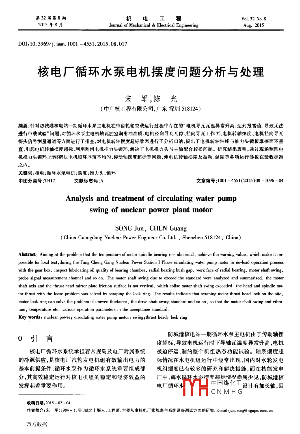 核電廠循環(huán)水泵電機(jī)擺度問(wèn)題分析與處理