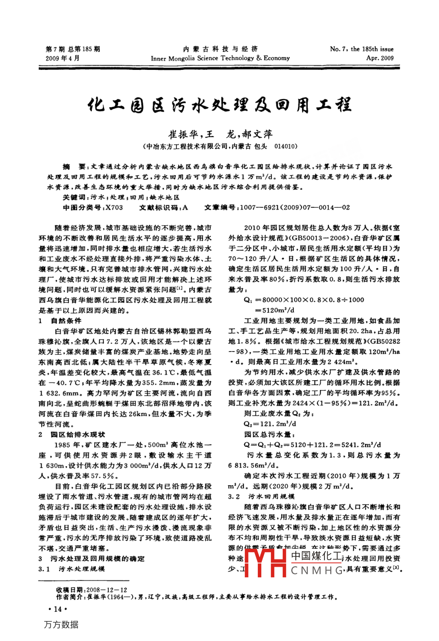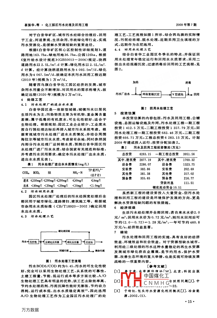 第7期總第185期內(nèi)蒙古科技與經(jīng)濟(jì)No. 7, the 185th issue2009年4月Inner Mongolia Science Technology & EconomyApr.2009化工園區(qū)污水處理及回用工程崔振華,王龍,郝文萍(中冶東方工程技術(shù)有限公司,內(nèi)蒙古包頭014010)摘要:文章通過分析內(nèi) 蒙古缺水地區(qū)西烏旗白音華化工園區(qū)給排水現(xiàn)狀,計(jì)算并論證了園區(qū)污水處理及回用工程的規(guī)模和工藝,污水回用后可節(jié)約水源水1萬m*/d.該工程的建設(shè)是節(jié)約水資源,保護(hù)水資源,改善生態(tài)環(huán)境的重大舉措,同時(shí)為缺水地區(qū)污水綜合利用提供借鑒。關(guān)鍵詞;污水;處理;回用;缺水地區(qū)中圄分類號(hào):X703文獻(xiàn)標(biāo)識(shí)碼:A文章編號(hào):1007-6921 (2009)07- -0014- -02隨著經(jīng)濟(jì)發(fā)展,城市基礎(chǔ)設(shè)施的不斷完善,城市2010年園區(qū)規(guī)劃居住總?cè)藬?shù)為8萬人。依據(jù)《窒環(huán)境的不斷改善和居民生活水平的逐步提高,用水外給水設(shè)計(jì)規(guī)范》(GB50013- 2006),白音華礦區(qū)屬量將迅速增加,同時(shí)排水量也相應(yīng)增大,若生活污水于二分區(qū)中.小城市,居民生活用水定額(平均日)為和工業(yè)廢水不經(jīng)處理直接外排,將嚴(yán)重污染水體、土70~120升/人●日,根據(jù)礦區(qū)生活區(qū)的具體情況,壤和大氣環(huán)境。只有完普城市排水管網(wǎng),興建污水處確定生活區(qū)居民生活用水定額為100升/人●日,自理廠,使城市污水達(dá)標(biāo)排放或回用才能解央上述環(huán)來水普及率80%,折污系數(shù)取0.8,則生活污水排放境問題,同時(shí)也可以緩解水資源緊張問題中。內(nèi)蒙古量為:西烏旗白音華能源化工園區(qū)污水處理及回用工程就Q = 80000X100X0.8x0.8+ 1000 ,是基于以上原因而興建的。= 5120m'/d自然條件工業(yè)用地主要規(guī)劃為-類工業(yè)用地.如食品加白音華礦區(qū)地處內(nèi)蒙古自治區(qū)錫林郭勒盟西烏工、手工藝品生產(chǎn)等,規(guī)劃用地面積20.2ha,占總用珠穆沁旗,全旗人口7.2萬人,該地區(qū)是一個(gè)以蒙古地1.8%.根據(jù)《城市給水工程規(guī)劃規(guī)范》(GB50282族為主,煤炭儲(chǔ)量豐畜的煤炭產(chǎn)業(yè)基地。地勢走向墾一98),一類工業(yè)用地工業(yè)用水量定額取120m/ha東南高西北低;屬大陸性半干旱草原氣候,冬寒夏●d.則最高日工業(yè)用水量為2424m'.炎,年溫差變化較大,最高氣溫在36.1C,最低氣溫為節(jié)約用水,減少供水水廠擴(kuò)建及供水管路的在- 40.7C;年平均降水量為355.2mm,蒸發(fā)量為投資,必須加大該區(qū)所建工廠的循環(huán)用水比例。根據(jù)1632. 6mm。高力罕河為礦區(qū)主要河流,流向自西白音華各方面因素,確定工廠的平均循環(huán)率為95%.南向北,呈蛇曲形蜿蜒于煤田東北部沼澤地帶內(nèi),該則工業(yè)補(bǔ)充水量為2424X (1-95%)= 121. 2m'/d.河流在白音華煤田內(nèi)長達(dá)26km,但水量不大,為季則工業(yè)廢水量Q;為:節(jié)性河流.Q:= 121.2m'/d2園區(qū)給排水現(xiàn)狀園區(qū)總污水量:1985年,礦區(qū)建水廠一處,500m'高位水池一Q= Q1+Q,= 5120+121.2= 5241. 2m2/d座,可供使用水資源井2眼,敷設(shè)輸水主干道污水量總變化系數(shù)為1.3.則總污水量為1 630m ,設(shè)計(jì)供水能力為300m2/d,供水人口12萬6 813. 56m'/d.人,供水普及率57.5%.確定本次污水工程近期(2010年)規(guī)模為1萬目前,白音華化工園區(qū)規(guī)劃區(qū)內(nèi)已沿部分路段m'/d.遠(yuǎn)期(2020 年)規(guī)模2萬m2/d.埋設(shè)了雨水管道、污水管逍,現(xiàn)有的城市管網(wǎng)均在超3.2 污水回用規(guī)模負(fù)荷運(yùn)行,園區(qū)未建設(shè)配套的污水處理設(shè)施,排水設(shè)隨著西烏珠穆沁旗白音華礦區(qū)人口不斷增長和施滯后于城市建設(shè)的發(fā)展。隨著建成區(qū)的逐年擴(kuò)大,經(jīng)濟(jì)飛速發(fā)展,用水量及排水量正在逐年增加,而有矛盾也日益突出,生活、生產(chǎn)污水漫潑、漫流現(xiàn)象非限的水資源又被不斷污染,加上地區(qū)性的水資源分常嚴(yán)重,污水的無序排放污染了環(huán)境,致使道路凌亂布不均和周期性干旱,導(dǎo)致淡水資源日益短缺,水資不堪,交通嚴(yán)重堵塞。源的供質(zhì)矛盾俞加小皚在過釉形勢下,需要通過多3污水處理及回用規(guī)模的確定種途中國煤化工水處理回用投資3.1污水處理規(guī)模少、C N M H G,具有重要意義田。作者簡介:崔振華(1964- ),男,遼寧,漢族,高級(jí)工程師,主要從事給水排水工程的設(shè)計(jì)管理工作?!?4●崔振華,等●化工園區(qū)污水處理及回用工程2009年第7期對(duì)于白音華礦區(qū),城市污水經(jīng)綜合治理后,回用理工藝,工藝流程如圖1所示,結(jié)合西烏旗的實(shí)際情于工業(yè)、河道景觀、生活雜用、市政綠化等行業(yè),實(shí)現(xiàn)況,污泥經(jīng)濃縮.脫水處理,近期采用衛(wèi)生填埋的方污水資源化.是緩解水資源短缺的重要途徑.式,遠(yuǎn)期作為農(nóng)肥施用.根據(jù)<白音華礦區(qū)核心區(qū)控制性詳細(xì)規(guī)劃》,道4.4回用水處理工藝路用地163. 7ha ,綠地用地36.7ha,公園126ha.根據(jù)結(jié)合白音華工業(yè)園區(qū)冬季長的特點(diǎn),并保證回《室外給水設(shè)計(jì)規(guī)范》(GB50013--2006)規(guī)定,澆灑用水處理常年穩(wěn)定運(yùn)行和回用水水質(zhì)要求,采用二道路用水以2.5L/m*.d計(jì)算;綠化用水