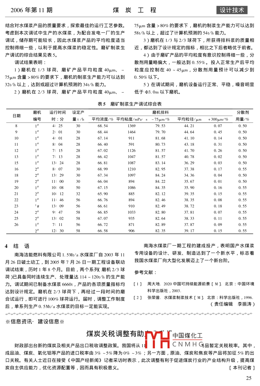 設(shè)計(jì)技術(shù)煤炭工程2006年第11期大型水煤漿廠的球磨機(jī)選型設(shè)計(jì)曾鳴,徐志強(qiáng),孫宗岳,張榮曾中國礦業(yè)大敩北京)化學(xué)與環(huán)境工程學(xué)院,北京100083)摘要:針對目前國內(nèi)規(guī)模最大1.5Mt/a)的南海潔能燃料有限公司水煤漿廠的設(shè)計(jì),介紹了Φ3.8×12m水煤漿專用球曆機(jī)的選型依據(jù)、結(jié)構(gòu)特點(diǎn)以及投料試生產(chǎn),試生產(chǎn)結(jié)果表明磨機(jī)選型合理,生產(chǎn)的水煤漿質(zhì)量指標(biāo)與預(yù)測值相符;南海水煤漿廠的建成投產(chǎn),標(biāo)志著我國水煤漿廠向大型化發(fā)展邁上了一個(gè)新臺階關(guān)鍵詞∶水煤漿廠;大型化;球磨機(jī)中圖分類號:TQ172.6*32文獻(xiàn)標(biāo)識碼:B文章編號:1671-09592006)11002204水煤漿是20世紀(jì)70年代世界石油危機(jī)后興起的一種250υh,工程項(xiàng)目采取一次性總體設(shè)計(jì),分兩期實(shí)施,每期生以煤代油的新型煤基流體燃料,它可以像油一樣泵送、霧產(chǎn)能力0.75M/a。年工作6)h,每日24h,三班生產(chǎn)。若調(diào)化、貯存及穩(wěn)定著火燃燒。我國以煤炭為基礎(chǔ)能源,煤炭整工作制度和工藝條件后,最終制漿能力可達(dá)到2.OM′a占我國已探明化石能源儲量的92.8%,在一次能源消費(fèi)結(jié)1.2原料煤來源及煤質(zhì)資料構(gòu)中,煤炭約占π0%左右,而石油資源則相對短缺,以煤經(jīng)過實(shí)地調(diào)研、方案比選以及成漿性試驗(yàn)結(jié)果等綜合代油是我國的一項(xiàng)長期國策。從1993年開始,中國就進(jìn)入因素比較,確定選用山東兗州礦業(yè)集團(tuán)公司所屬礦和選煤了石油凈進(jìn)口國的行列,而且進(jìn)口量與日俱增,到203年廠作為本工程制漿原料煤供應(yīng)基地。根據(jù)業(yè)主建議,并經(jīng)已成為世界第二大石油進(jìn)囗國,當(dāng)年進(jìn)口石油9000萬。可行性研究論證,確定南海潔能燃料有限公司水煤漿制備近年來,由于國內(nèi)外市場油價(jià)飚升,燃油電廠面臨發(fā)電成原料煤為山東省兗州礦區(qū)的2號水洗精煤。該精煤的煤質(zhì)本大幅度提高的困境,為了降低成本,一些燃油電廠開始分析委托國家煤炭質(zhì)量監(jiān)督檢驗(yàn)中心其結(jié)果見表1。改燒水煤漿。廣東龍光集團(tuán)南海發(fā)電一廠經(jīng)過深入調(diào)研,決定將該廠兩臺670/h燃油鍋爐改燒水煤漿,并配套建設(shè)1.3水煤漿的質(zhì)量指標(biāo)年產(chǎn)150~200萬t的南海潔能燃料有限公司水煤漿廠。煤漿干基重量濃度:67%±1%粒度上限300μm,-75um含量80%~85%1設(shè)計(jì)要求煤漿表觀粘度:1200±200mPas(剪切率100s-和1.1廠型及工作制度5℃時(shí))水煤漿制備廠設(shè)計(jì)生產(chǎn)能力15Ma,小時(shí)制漿能力為無硬沉淀的穩(wěn)定期:一個(gè)月以上。表1兗州2號精煤的煤質(zhì)分析水分/%灰分/%揮發(fā)份/%圍定碳/%全硫分/%發(fā)熱量/MJkg-1可磨性指數(shù)2球磨機(jī)的選型設(shè)計(jì)圖1所示。制漿專用球磨機(jī)的生產(chǎn)能力因入磨的原料煤粒度組成球曆機(jī)是制漿生產(chǎn)的關(guān)鍵設(shè)備。球磨機(jī)的選擇將對制煤的可黁性指數(shù)、霈要得到的產(chǎn)品細(xì)度、磨礦濃度及煤漿漿工藝和生產(chǎn)系列的確定、制漿廠的實(shí)際生產(chǎn)能力、工程的流變性等不同而有相當(dāng)大的差別。由中國礦業(yè)大學(xué)北投資產(chǎn)生較大的影響。根據(jù)可行性研究報(bào)告的論證,以及京)與江陰市亞特機(jī)械制造有限公司合作開發(fā)研制的水煤漿兗州2號水洗精煤成漿性試驗(yàn)的初步結(jié)果,確定采用一段專用球磨機(jī)和有183×8m42.4×8或8.5、9m及曆機(jī)高濃度曆礦制漿工藝,該廠制漿生產(chǎn)工藝流程框圖如Φ3.0中國煤化工已分別為棗莊八-、大同CNMHG收稿日期:2005-12-22作者簡介:曾呶(1957-),男,四川內(nèi)江人,工學(xué)博士,副教授,現(xiàn)在中國礦業(yè)大敩(北京)化學(xué)與環(huán)境工程掌院從事礦物加工的教學(xué)科研工作。206年第11期煤炭工程設(shè)計(jì)技術(shù)匯海、邢臺東龐、白楊河電廠、勝利油田、茂名熱電廠等置8臺Φ3.0×1lm磨機(jī)。即使不受工業(yè)場地限制,這樣大水煤漿廠所采用。對于l.5Mt/a的南海潔能燃料有限公司規(guī)模的水煤漿廠布置8臺小規(guī)格磨機(jī)也不合理。因此,我水煤漿廠而言,其單系統(tǒng)生產(chǎn)規(guī)模為國內(nèi)最大,如果選用們應(yīng)以南海水煤漿廠的建設(shè)為契機(jī),有必要開發(fā)研制更大現(xiàn)有最大規(guī)格的Φ3.0×llm水煤漿專用球曆機(jī),需用8規(guī)格的球磨機(jī),促進(jìn)我國水煤漿專用設(shè)備的大型化臺。然而,南海水煤漿廠的工業(yè)場地非常有限,不可能布制漿原料煤來白穩(wěn)定劑干粉清水碼頭卸船抓斗Ql-0.165分散劑原液Q1=2491675Ql=18500w=066002=0.665Q2=167335W=00000W=81.8340Q2=08325d=10000d=6716受煤斗w203份散劑溶液閿[滴水】穩(wěn)定劑溶液粗粒異物Ql=55500Ql=0.8325Q2=0.8325W=47175w606494W-0660轉(zhuǎn)載點(diǎn)d=1500d=2000穩(wěn)定性處理Q1=4950Q1=250.0000Q2=1675000T煤搬|W4245d=15.00球磨機(jī)W=0.4718d=1500高剪切處理Ql=248612破碎機(jī)Q2=167250381.5287d6727粗渣,回干煤棚一篩分除渣Q1=250.000緩沖倉Q2=1675000W=82.5000d=67.00周漿緩沖槽定量給料機(jī)儲漿罐不合格漿Ql=182.9681攪拌桶Q2=1665010w=164671d=91.00室外廢漿池裝船去電廠裝車外銷圖1制漿生產(