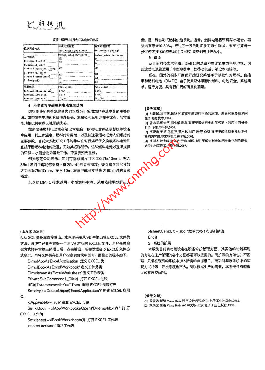 應(yīng)用科技直接甲醇燃料電池及其前景夏華丹(武漢商業(yè)服務(wù)學(xué)院機(jī)電工程系,湖北武漢430056)[摘要]直接甲醇燃料電池0MFC)因其體積小、能量密度大等優(yōu)點(diǎn)已成為最具發(fā)展前景的燃料電池之一。本文以介紹燃料電池的歷史,燃料電池的種類,和直接甲醇燃料電池的工作原理為主,主要論述了直接甲醇燃料電池的優(yōu)勢(shì)及其發(fā)展前景。而因直接甲醇燃料的優(yōu)勢(shì),使其更多的使用于便攜式設(shè)備中。[關(guān)鍵詞]燃料電池;直接甲醇燃料電池;原理;應(yīng)用燃料電池是一種將燃料與 氧化劑的化學(xué)能通過(guò)電化學(xué)反應(yīng)直接轉(zhuǎn)燃料電池直接使用甲醇而無(wú)需預(yù)先重整。甲醇在陽(yáng)極轉(zhuǎn)換成二氧化碳和變?yōu)殡娔艿陌l(fā)電裝置。燃料電池有許多優(yōu)點(diǎn),由于它不受卡諾循環(huán)的氫,如同標(biāo)準(zhǔn)的質(zhì)子交換膜燃料電池-樣,之后氫再與氧反應(yīng)。限制,與傳統(tǒng)的能量轉(zhuǎn)換系統(tǒng)相比能量轉(zhuǎn)換效率高。它一般用氯作燃這種電池的期望工作溫度為120C,略高于標(biāo)準(zhǔn)的質(zhì)子交換膜燃料,氧氣為氧化劑,而產(chǎn)物為水,因而對(duì)環(huán)境的污染很小。由于不同類料電池,效率大約是40%。其缺點(diǎn)是需要更多的白金催化劑。型的燃料電池在不同場(chǎng)合的應(yīng)用,使燃料電池有著廣泛的用途。24再生型燃料電池(RFC)燃料電池的歷史再生型燃料電池技術(shù)相對(duì)較新,但全球有許多研究小組正在從事燃料電池的歷史可以追溯到第19世紀(jì)英國(guó)法官和科學(xué)家William這方面的研究。它與普通燃料電池的相同之處在于也用氫和氧來(lái)生成RobertGrove 爵士的工作。1839 年,Grove所進(jìn)行的電解作用實(shí)電、熱和水。其不同之處是它還進(jìn)行電解。燃料電池中生成的水再送回驗(yàn)--使用電將水分解成氫和氧一 是人們后來(lái)稱之為燃料電池的第到以太陽(yáng)能為動(dòng)力的電解池中,在那兒分解成氫和氧組分,然后這種組-個(gè)裝置。分再送回到燃料電池。這-技術(shù)目前仍有許多問(wèn)題尚待解決, 例如成本劍橋大學(xué)的工程師Francis Thomas Bacon博士完成了燃料電池歷以及進(jìn)步改進(jìn)太陽(yáng)能利用的穩(wěn)定性等問(wèn)題。史的主要-章。1932年,Bacon 博士發(fā)明了Bacon電池,它也就是第3直接甲醇燃料電池的運(yùn)怍原理一個(gè)堿性燃料電池 (alkaline fuelcell AFC)。20世紀(jì)初期,飛機(jī)制造所謂直接甲醇燃料電池(DirectMethanolFuelCell, 它屬于質(zhì)商Pratt&Whitney獲得Bacon的堿性燃料電池專利執(zhí)照。之后,這種子交換膜燃料電池(PEMFCI 中之一類,系直接使用液態(tài)甲醇為燃料堿性電池便用于大多數(shù)飛行任務(wù)。它能產(chǎn)生可飲用水作為副產(chǎn)品是使用供給來(lái)源,而不需透過(guò)重組器重組甲醇、汽油及天然氣等再取出氫以燃料電池作為能源的另一好處。在整個(gè)20世紀(jì)的70、80年代,人們供發(fā)電。相較于質(zhì)子交換膜燃料電池(PEMFC),直接甲醇燃料電池大量研究開發(fā)所需的材料,探紫最佳的燃料源,同時(shí)迅速降低燃料電池(DMFC)低溫生電、燃料成分危險(xiǎn)性低、生電結(jié)構(gòu)簡(jiǎn)單等特性使直接技術(shù)的成本。直到20世紀(jì)90年代,一種廉價(jià)的,清潔的,可再生的甲醇燃料電池DMFQ成為便攜式電子產(chǎn)品應(yīng)用的主流。能源最終成為事實(shí)。31 直接甲 醇燃料電池的運(yùn)作原理目前,許多公共設(shè)施都用了燃料電池,很多汽車公司也已經(jīng)設(shè)計(jì)直接甲醇燃料電池含有陰陽(yáng)兩個(gè)電極,而兩個(gè)電極之間由具有滲出燃料電池汽車。在北美和歐洲的許多城市,以燃料電池為動(dòng)力的公共透性的薄膜所構(gòu)成。離子交換膜為其電解質(zhì),薄膜的表面則涂有可以加汽車也已進(jìn)入試用。在今后的幾十年中,鑒于人們對(duì)能源危機(jī)的擔(dān)心,速反應(yīng)的觸媒。甲醇溶液透過(guò)陽(yáng)極進(jìn)入燃料電池,氧氣由陰極進(jìn)入燃以及大量使用石油燃料對(duì)環(huán)境的破壞已受到愈來(lái)愈多人的關(guān)注,這必將料電池。經(jīng)由觸媒的作用使甲醇所含的氫原子(hydrogen) 裂解成質(zhì)促進(jìn)燃料電池的發(fā)展。子(proton) 與電子(electron), 其中質(zhì)子被氧吸引到薄膜的另-2燃料電池的種類邊,電子則經(jīng)由外電路形成電流后到達(dá)陰極,與氧(O2) 形成水燃料電池依據(jù)其電解質(zhì)的性質(zhì)而分為不同的類型,每類燃料電池(H20)。需要特殊的材料和燃料,且用于其特殊的應(yīng)用。直接甲醇燃料電池DMFQ反應(yīng)式如下:21質(zhì)子 交換膜燃料電池(PEMFC)陽(yáng)極反應(yīng): CH.OH+H.0→CO+ 6H+6e-該技術(shù)是General Electric公司在20世紀(jì)50年代發(fā)明的,被陰極反應(yīng): 3/20+ 6H'+ 6e~→3H2ONASA用來(lái)為其Gemini空間項(xiàng)目提供動(dòng)力。目前這種燃料電池被汽車電池反應(yīng): CH2OH+3/202-→CO2+2H2O公司用來(lái)取代原來(lái)使用的內(nèi)燃機(jī)。工作多理當(dāng)然,要使該技術(shù)廣泛應(yīng)用仍需解決一系列的問(wèn)題。 其中制造成本是最主要的問(wèn)題,因?yàn)槟げ牧虾痛呋瘎┒际职嘿F。同時(shí)這種電池需要純凈的氫方能工作,因?yàn)樗鼈儤O易受到一氧化碳和其它雜質(
