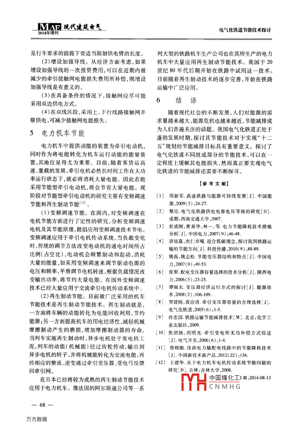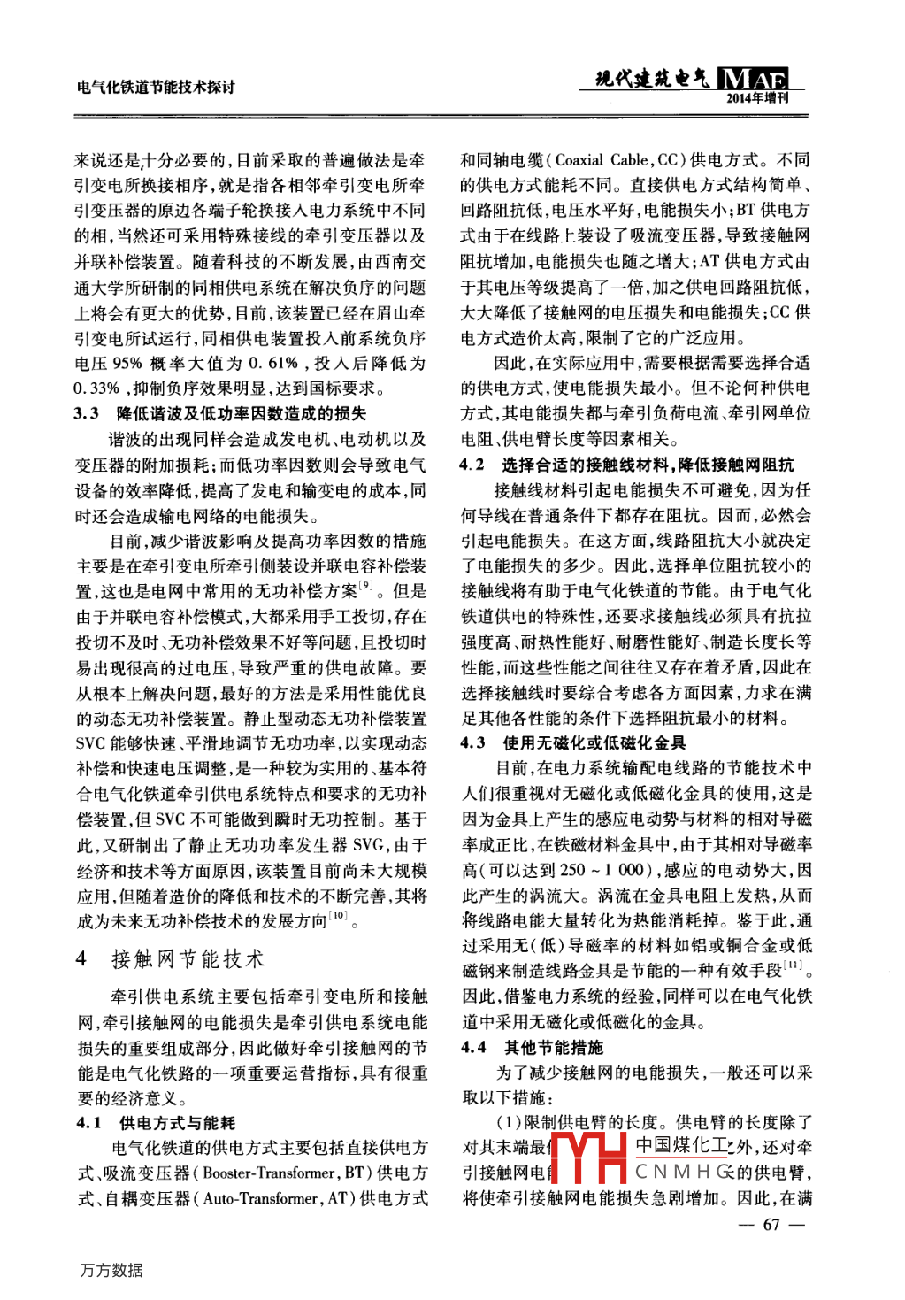 電氣化鐵道節(jié)能技術探討現(xiàn)代建筑電氣MAE2014年增刊電氣化鐵道節(jié)能技術探討趙琛,韓正慶(西南交通大學電氣工程學院,四川成都610031)摘要:近年來由于能源短缺和環(huán)境污染,節(jié)能減排越來越被人們所重視。作為耗能大戶的電氣化鐵道,探討其節(jié)能技術具有重要意義。介紹了電氣化鐵道的基本概念及其組成,針對每一部分的具體特點,分別介紹了外部電源、牽引變電所接觸網(wǎng)以及電力機車中的節(jié)能技術。最后對電氣化鐵道未來的發(fā)展作了展望關鍵詞:節(jié)能減排;電氣化鐵道;外部電源;牽引變電所;接觸網(wǎng);電力機車0引言能源危機與環(huán)境污染是當今世界面臨的兩大牽引變電所難題。我國早在“十一五”規(guī)劃綱要中就提出了電分相“節(jié)能減排”。2012年8月國務院印發(fā)了《節(jié)能減排“十二五”規(guī)劃》,作為指導和推動“十二五”節(jié)回流線列車能減排工作的綱領性文件。Q(鋼軌因此,為了構建資源節(jié)約型、環(huán)境友好型社圖1電氣化鐵道示意圖會,切實貫徹和落實國家關于節(jié)能減排的政策,全國各行各業(yè)都必須行動起來。鐵路在交通行業(yè)中算,內燃機車牽引鐵路為2.86,電力牽引鐵路為占有舉足輕重的地位,但同時它也是消耗能源資1.93,高速公路為22.05,飛機為44.1。顯然,源的重點行業(yè),做好鐵路行業(yè)的節(jié)能減排工作,以電氣化鐵路的能耗最低。因此,大力發(fā)展電氣化最小的投入獲取最大的運輸效益,對于緩解我國鐵路有助于優(yōu)化能源結構,實現(xiàn)節(jié)能減排。我國當前能源緊缺、環(huán)境惡化等問題具有重要的戰(zhàn)略在2008年新修訂的《中長期鐵路規(guī)劃》指出,到意義。2020年底我國鐵路的電氣化率要達到60%以上,1電氣化鐵道概述截止2013年底我國電氣化鐵路總里程已突破56萬km,躍居世界第一。然而,隨著電氣化鐵路電氣化鐵路,是指以電能作為牽引動力的一的快速發(fā)展,其用電量也在不斷攀升,作為節(jié)能型種軌道交通運輸形式,主要由牽引變電所、牽引網(wǎng)的交通運輸方式,其能耗量還是比較高的。因此,和電力機車三大元件組成,如圖1所示。其中牽若能進一步提高其能源利用率,將產(chǎn)生可觀的節(jié)引變電所從地方電力系統(tǒng)引入的110kV或能減排效益。220kV高壓,通過牽引變壓器降至適合電力機車運行的27.5kV電壓,送至接觸網(wǎng),供給電力機車2外部電源節(jié)能技術運行。其作用是接收、分配、輸送電能。牽引網(wǎng)主我國電氣化鐵道的外部電源來自電力系統(tǒng),要包括饋電線、接觸網(wǎng)、鋼軌、回流線和大地回路,因此外部電源的節(jié)能須要鐵路部門和電力部門的接觸網(wǎng)是其核心,是電氣化鐵道的主要供電設施,通力協(xié)作,共同完成。其功能是全天候不間斷地向電力機車供電。1)外部電源電壓等級的選擇。電氣化鐵道由于電氣化鐵路采用的是電力二次能源,較外部電源是一項綜合、復雜的系統(tǒng)課題,關于其電其他牽引方式其本身就具有很高的能源利用率,壓等級的選V凵中國煤化工我國電氣化屬于節(jié)能型交通運輸方式。參照日本新干線及法鐵道外部電丬CNMH(等級,部分國TG和國內有關資料,按人·km標準能耗計采用220kV。文獻2指出,從全系統(tǒng)的角度來看AE現(xiàn)代建筑電氣電氣化鐵道節(jié)能技術探討2014年增刊將牽引供電系統(tǒng)看作電力系統(tǒng)的末端用戶,采用無氧銅桿拉拔的導線,提高導電系數(shù)。適當降低220kV進線減少了電能的中間變換環(huán)節(jié),既節(jié)省電流密度,改善絕緣結構、采用半油道、預制絕緣了輸變電設備容量,也降低了電能損耗,對提高整件、繞組整體套裝、自粘線、自粘紙,縮小絕緣體個電力系統(tǒng)的經(jīng)濟運行指標,減少國家的能耗是積、提高繞組填充系數(shù)、減小繞組尺寸來減小負載較為有利的。所以,單從節(jié)能的角度考慮,選擇損耗。220kV的外部電源是有利的。然而,電壓等級的③降低其他部件損耗。改進鐵心結構,以降升高會導致變電所造價增加,所以在電壓等級的低油箱等結構件的雜散損耗。用波紋油箱、片式選擇上還需綜合各方面因素,尋求一種最佳方式。散熱器代替管式散熱器,提高散熱效率。2)發(fā)展新能源技術。新能源發(fā)電技術主要④利用機械的工作特性降低損耗。包括太陽能發(fā)電、風力發(fā)電、生物質能發(fā)電潮汐(2)合理選擇變壓器容量。合理選擇變壓器能發(fā)電等方式。由于目前技術上還不是很成熟,的容量,對于減少其電能損失具有很大意義。文各種新能源都還存在著一定風險,加上電力市場獻[6]指出,通常情況大容量變壓器的空載損耗上,電力物資生產(chǎn)廠家眾多,電力產(chǎn)品質量良莠不要大于小容量變壓器,但對同一負載功率,大容量齊,鐵路部門應該加強與供電單位的銜接,從源頭變壓器的負載損耗往往小于小容量變壓器。因此著手,加強電力質量的管理,進而逐步轉變用能結變壓器容量的選擇要根據(jù)其臨界負載系數(shù)確定,構,實現(xiàn)用能的多元高效、清潔化3-4。使得其空載損耗和負載損耗相等時,運行最經(jīng)濟3牽引變電所節(jié)能技術文獻[刁]指出變壓器容量的選擇要根據(jù)其臨界負載決定:當實際負載小于臨界負載時,小容量變壓牽引變電所中可以采取的節(jié)能措施主要有