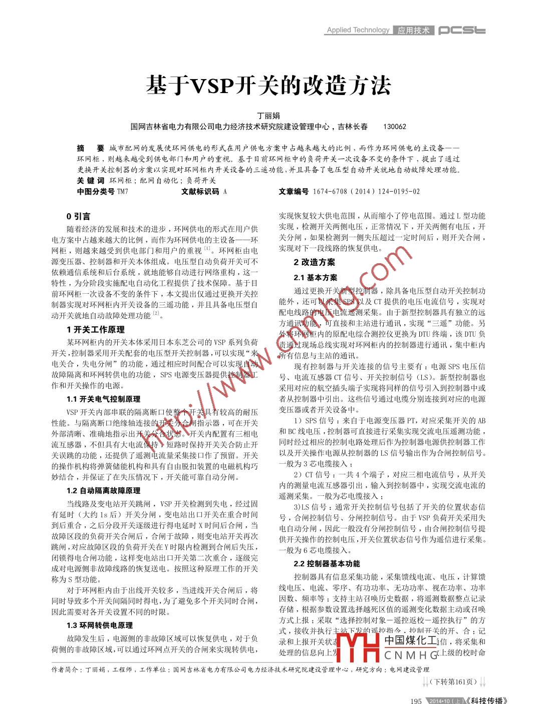 Applied Technolog用技術(shù)基于SP開關(guān)的改造方法丁麗娟國網(wǎng)吉林省電力有限公司電力經(jīng)濟技術(shù)研究院建設(shè)管理中心,吉林長春130062摘要城市配網(wǎng)的發(fā)展使環(huán)網(wǎng)供電的形式在用戶供電方策中占越來越大的比例,而作為環(huán)網(wǎng)供電的主設(shè)備環(huán)網(wǎng)柜,則越來越受到供電部門和用戶的重視?;谀壳碍h(huán)網(wǎng)柜中的負荷開關(guān)一次設(shè)備不變的條件下,提出了通過更換開關(guān)控制器的方案以實現(xiàn)對環(huán)網(wǎng)柜內(nèi)開關(guān)設(shè)備的三遙功能,并且具備了電壓型自動開關(guān)就地自動故障處理功能關(guān)鍵詞環(huán)網(wǎng)柜;配網(wǎng)自動化;負荷開關(guān)中圖分類號TM7文獻標識碼A文章編號1674-6708(2014)124-0195-020引言實現(xiàn)恢復(fù)較大供電范圍,從而縮小了停電范圍。通過L型功能隨著經(jīng)濟的發(fā)展和技術(shù)的進步,環(huán)網(wǎng)供電的形式在用戶供實現(xiàn),檢測開關(guān)兩側(cè)電壓,正常情況下,開關(guān)兩側(cè)有電壓,開電方案中占越來越大的比例,而作為環(huán)網(wǎng)供電的主設(shè)備一—環(huán)關(guān)分閘,如果檢測到一側(cè)失壓超過一定時間后,則開關(guān)合閘,網(wǎng)柜,則越來越受到供電部門和用戶的重視。環(huán)網(wǎng)柜由電實現(xiàn)對下一段線路的恢復(fù)供電源變壓器、控制器和開關(guān)本體組成。電壓型自動負荷開關(guān)可不2改造方案依賴通信系統(tǒng)和后臺系統(tǒng),就地能夠自動進行網(wǎng)絡(luò)重構(gòu),這-特性,為分階段實施配電自動化工程提供了技術(shù)保障。基于目21基本方案前環(huán)網(wǎng)柜一次設(shè)備不變的條件下,本文提出僅通過更換開關(guān)控通過更換開關(guān)新型控制器,除具備電壓型自動開關(guān)控制功」器實現(xiàn)對環(huán)網(wǎng)柜內(nèi)開關(guān)設(shè)備的三遙功能,并且具備電壓型自能外,還可以采集SPS以及CT提供的電壓電流信號,實現(xiàn)對動開關(guān)就地自動故障處理功能2配電線路的電壓電流遙測采集。由于新型控制器具有獨立的遠1開關(guān)工作原理方通訊功能,可直接和主站進行通訊,實現(xiàn)“三遙”功能。另外將環(huán)網(wǎng)柜內(nèi)的原配電綜合測控儀更換為DTU終端,該DTU負某環(huán)網(wǎng)柜內(nèi)的開關(guān)本體采用日本東芝公司的wSP系列負荷責(zé)通過現(xiàn)場總線實現(xiàn)對環(huán)網(wǎng)柜內(nèi)的控制器進行通訊,集中柜內(nèi)開關(guān),控制器采用開關(guān)配套的電壓型開關(guān)控制器,可以實現(xiàn)“來所有信息與主站的通訊。電關(guān)合,失電分閘”的功能,通過相應(yīng)時間配合可以實現(xiàn)自動現(xiàn)有控制器與開關(guān)連接的信號主要有:電源SPS電壓信故障隔離和環(huán)網(wǎng)轉(zhuǎn)供電的功能,SPS電源變壓器提供控制器工號、電流互感器CT信號、開關(guān)控制信號(LS)。新型控制器也作和開關(guān)操作的電源采用對應(yīng)的航空插頭端子實現(xiàn)將同樣的信號引入到控制器中或11開關(guān)電氣控制原理者從控制器中引出。這些信號通過電纜分別連接到對應(yīng)的電源VsP開關(guān)內(nèi)部串聯(lián)的隔離斷口使整個開關(guān)具有較高的耐壓變壓器或者開關(guān)設(shè)備中。性能。與隔離斷口絕緣軸連接的開關(guān)分合閘指示器,可在開關(guān)1)SPS信號:來自于電源變壓器PT,對應(yīng)采集開關(guān)的AB外部清晰、準確地指示出開關(guān)分合狀態(tài)。開關(guān)內(nèi)配置有三相電和BC線電壓,控制器可直接進行釆集實現(xiàn)交流電壓遙測功能互感器,不但具有大電流保持,短路時保持開關(guān)關(guān)合防止開同時經(jīng)過相應(yīng)的控制電路處理后作為控制器電源供控制器工作關(guān)誤跳的功能,還提供了遙測電流量采集接口作了預(yù)留。開關(guān)以及開關(guān)操作電源從控制器的LS信號輸出作為合閘控制信號的操作機構(gòu)將彈簧儲能機構(gòu)和具有自由脫扣裝置的電磁機構(gòu)巧般為3芯電纜接入妙結(jié)合,并保證了在失壓情況下,開關(guān)能可靠自動分閘2)CT信號:一共4個端子,對應(yīng)三相電流信號,從開關(guān)1.2自動隔離故障原理內(nèi)的測量電流互感器引出,輸入到控制器中,實現(xiàn)交流電流的遙測采集。一般為芯電纜接入當線路及變電站開關(guān)跳閘,VSP開關(guān)檢測到失電,經(jīng)過固LS信號:通常開關(guān)控制信號包括了開關(guān)的位置狀態(tài)信有延時(大約1s后)開關(guān)分閘,變電站出口開關(guān)在重合時間號,合閘控制信號、分閘控制信號。由于VSP負荷開關(guān)采用失到后重合,之后分段開關(guān)逐級進行得電延時X時間后合閘,當電自動分閘,因此一般沒有分閘控制信號,由合閘控制信號提故障區(qū)段的負荷開關(guān)合閘后,合閘于故障,則變電站開關(guān)再次供開關(guān)操作的控制電壓,開關(guān)位置狀態(tài)信號作為遙信進行采集跳閘,對應(yīng)故障區(qū)段的負荷開關(guān)在Y時限內(nèi)檢測到合閘后失壓,般為6芯電纜接入閉鎖得電合閘功能,這樣變電站出口開關(guān)第二次重合,逐級完成對電源側(cè)非故障線路的恢復(fù)送電。按照這種原理工作的開關(guān)22控制器基本功能控制器具有信息采集功能,采集饋線電流、電壓,計算饋對于環(huán)網(wǎng)