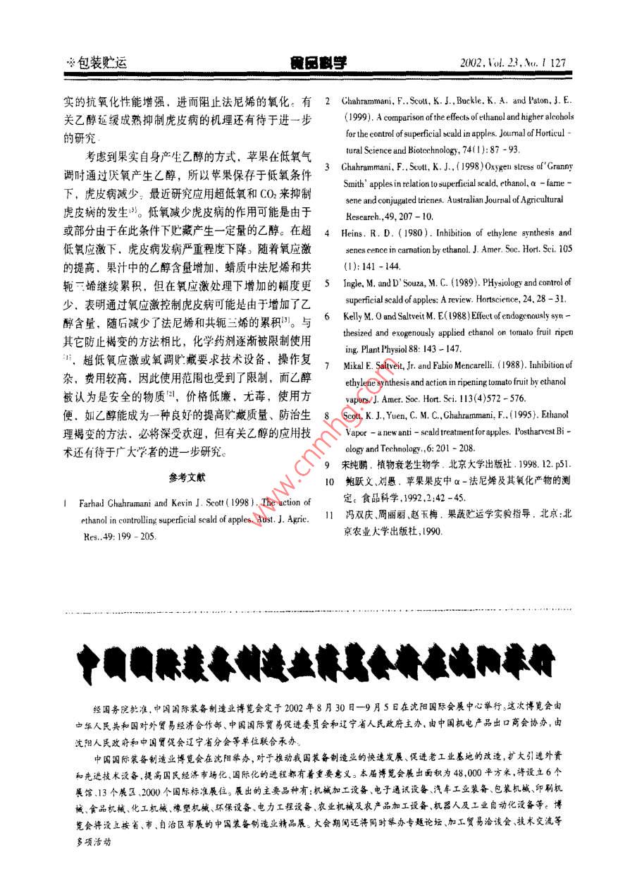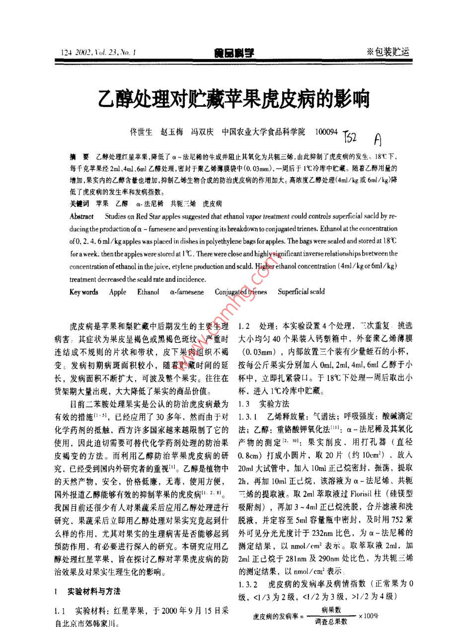 1242)2,vd.23,Vo.JE獸※包裝貯運乙醇處理對貯藏蘋果虎皮病的影響佟世生趙玉梅馮雙慶中國農(nóng)業(yè)大學(xué)食品科學(xué)院10004摘要乙醇處理紅星蘋果,降低了a-法尼稀的生成并阻止其氧化為共軛三烯,由此抑制了虎皮病的發(fā)生,18℃下每千克蘋果經(jīng)2ml4l,6ml乙醇處理,密封于聚乙烯薄膜袋中(0.03mm),一周后于1℃冷庫中貯藏,隨著乙醇用量的增加果實內(nèi)的乙醇含量也增加抑制乙烯生物合成的防治虎皮病的作用加大高濃度乙醇處理(4ml/kg或6m/kg)降低了虎皮病的發(fā)生率和發(fā)病指數(shù)關(guān)健詞蘋果乙醇a-法尼稀共軛三烯虎皮病Abstract Studies on Red Star apples suggested that ethanol vapor ireatment could controls superficial sacld by re-ducing the production of a-famesene and preventing its breakdown to conjugated trienes. Ethanol at the concentrationof0,2.4.6 ml/kg apples was placed in dishes in polyethylene bags for apples. The bags were sealed and stored at 18Tfor a week. then the apples were stored at IC. There were close and highly significant inverse relationships between theconcentration of ethanol in the juice, etylene production and scald. Higher ethanol concentration(4ml/kg or 6ml/kg)decreased the scald rate and incidenceKey words Apple Ethanol a-farmesene Conjugated trienes Superficial scald虎皮病是蘋果和梨貯藏中后期發(fā)生的主要生理1.2處理:本實驗設(shè)置4個處理,次重復(fù)挑選病害:其癥狀為果皮呈褐色或黑褐色斑紋,嚴(yán)重時大小均勻40個果裝入鈣塑箱中,外套聚乙烯薄膜連結(jié)成不規(guī)則的片狀和帶狀,皮下果肉組織不褐(0.03mm),內(nèi)部放置三個裝有少量蛭石的小杯變:發(fā)病初期病斑面積較小,隨著貯藏時間的延按每公斤果實分別加人0m,2m,4m,6ml乙醇于小長,發(fā)病面積不斷擴大,可波及整個果實。往往在杯中,立即扎緊袋口。于18℃下處理一周后取出小貨架期大量出現(xiàn),大大降低了果實的商品價值。杯,進入1℃冷庫中貯藏。目前二苯胺處理果實是公認(rèn)的防治虎皮病最為1.3實驗方法有效的措施-s,已經(jīng)應(yīng)用了30多年,然而由于對1.3.1乙烯釋放量:氣譜法;呼吸強度:酸堿滴定化學(xué)藥劑的抵觸,西方許多國家越來越限制了它的法;乙醇:重鉻酸鉀氧化法:a-法尼稀及其氧化使用,因此迫切需要可替代化學(xué)藥劑處理的防治果產(chǎn)物的測定2.:果實削皮,用打孔器(直徑皮褐變的方法。而利用乙醇防治蘋果虎皮病的研0.8cm)打成小圓片,取20片(約10m2).放入究,已經(jīng)受到國內(nèi)外研究者的重視。乙醇是植物中20ml大試管中,加入10ml正己烷密封,振蕩,提取的天然產(chǎn)物,安全,價格低廉,無毒,使用方便,2h,再加10ml正已烷,該溶液為a-法尼烯、共軛國外報道乙醇能夠有效的抑制蘋果的虎皮病12"。三烯的提取液。取2ml萃取液過Foil柱(硅鎂型我國目前還很少有人對果蔬采后應(yīng)用乙醇處理進行吸附劑),再加3~4ml正已烷洗脫,合并濾液和洗研究、果蔬采后立即用乙醇處理對果實究竟起到什脫液,并定容至5ml容量瓶中密封,及時用752紫么樣的作用,尤其對果實的生理病害是否能夠起到外可見分光光度計于232mn比色,為α-法尼稀的預(yù)防作用,有必要進行深入的研究。本研究應(yīng)用乙測定結(jié)果,以nmol/cm2表示。取萃取液2ml,加醇處理紅星蘋果,旨在探討乙醇對蘋果虎皮病的防2ml正己烷于28m及290nm處比色,為共軛三烯治效果及對果實生理生化的影響。的測定結(jié)果,以mol/cm2表示1.3.2虎皮病的發(fā)病率及病情指數(shù)(正常果為01實驗材料與方法級,<1/3為2級,<1/2為3級,>1/2為4級)1.1實驗材料:紅星蘋果,于2000年9月15日采病果數(shù)虎皮病的發(fā)病率100%調(diào)查總果數(shù)※包裝貯運E獸202.Vu.3,.J125虎皮病病情指數(shù)=x(病果數(shù)x病果數(shù))x10查總數(shù)x最高級數(shù)2結(jié)果與分析2.1乙醇處理對草果呼吸和果實乙烯釋放量的影響如211182513742506370從呼吸曲線(見圖1)可以看出紅星蘋果經(jīng)乙醇處理后天數(shù)(d)處理后果實的呼吸量較對照有明顯的增加,并隨著2ml/kg4ml/kg6ml/kg乙醇處理濃度的增加而增大。增加幅度前期較大圖2乙醇處理紅星蘋果乙烯釋放量的變化而后期增加較小。另外從處理時所監(jiān)測的袋內(nèi)氣體成分也可以看出(見表1),乙醇處理時迅速地降低500了環(huán)境中的氧氣,增加了二氧化碳的含量,密封袋中的氧氣和二氧化碳的含量在第二天對照的17.8%、3.3%,6ml/kg處理為15.0%、5.8%;而廣藏財?shù)谒奶鞂φ战MO2和CO2分別為18.6%、3.3%,6m/kg乙醇處理為13.8%和8.6%,表明乙醇處理促進∫前期果實的呼吸。應(yīng)用乙醇處理后的果實乙oml/kg·2ml/kguml/kg烯釋放量比未用乙醇處理的乙烯釋放量降低,尤其以較高濃度的乙醇處理降低的幅度較大,表明乙醇圖3乙醇處理蘋果a-法尼烯含量變化處理抑制成了乙烯的生物合成(見圖2)。15EE5Uml/kg21118253}37圖4乙醇處理蘋果共軛三烯的變化處理后天數(shù){d)Oml/k-+-2ml/ke -+4ml/kg --6ml/kk6ml/kg乙醇處理的法尼烯含量分別為475.23nmol/圖1乙醇處理紅星蘋果呼吸(1℃)的變化cm2、423.63mol/cm2、330.3 Inmos/cm,表明紅星2.2乙醇處理對共軛三烯和α-法泥稀的影響蘋果應(yīng)用乙醇處理可抑制成α-法尼烯的生物合成。果皮內(nèi)α-法泥烯含量的變化見圖3:α-法泥稀乙醇處理蘋果中共軛三烯含量的變化趨勢與α的含量在貯藏的前二個月內(nèi)增加較為迅速,在貯藏兩法尼烯相似(見圖4)。蘋果采收后,α-法尼烯的氧個月后含量開始下降。乙醇處理阻