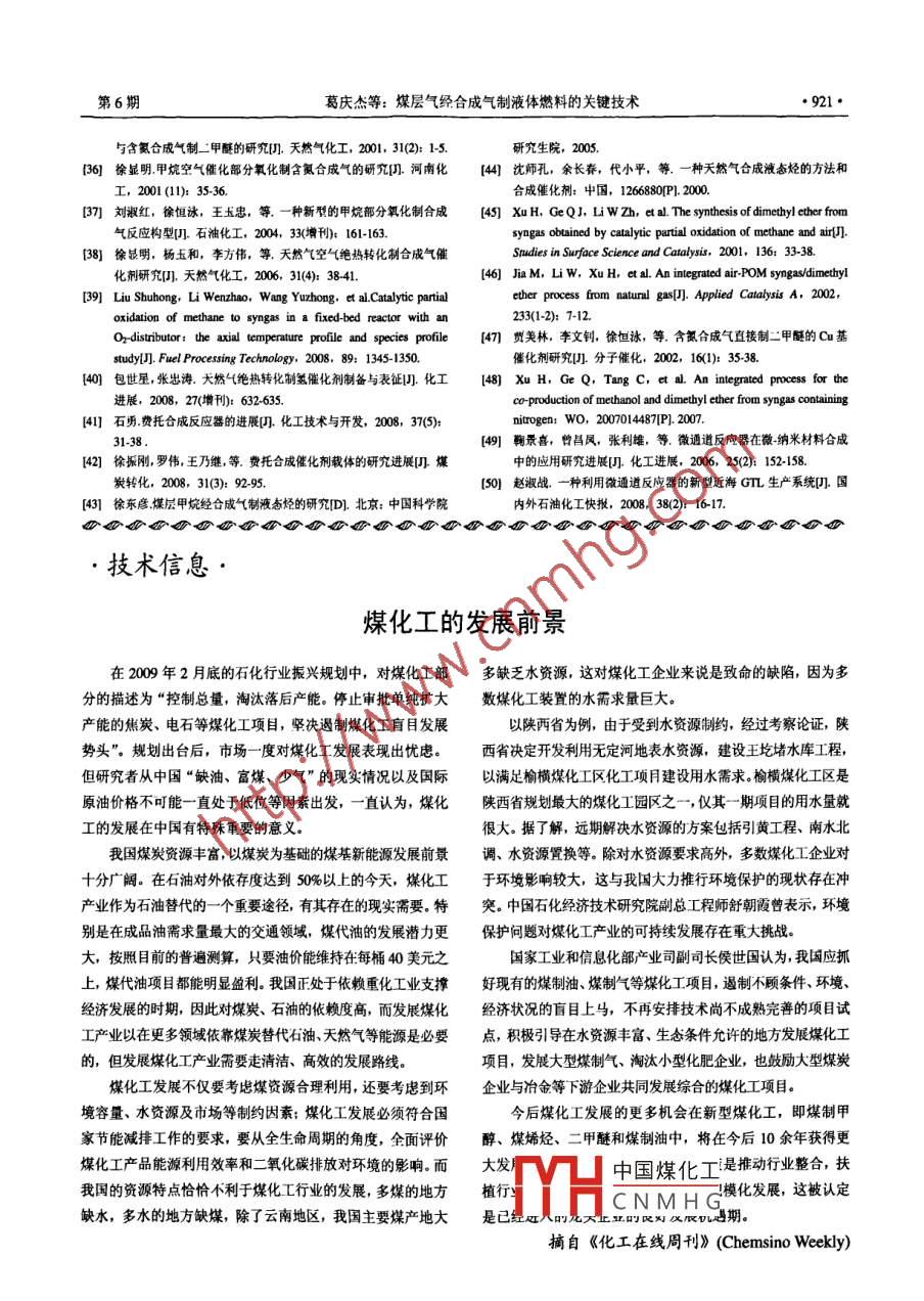 化工進(jìn)展2009年第28卷第6期CHEMICAL INDUSTRY AND ENGINEERING PROGRESS917·特約評(píng)述煤層氣經(jīng)合成氣制液體燃料的關(guān)鍵技術(shù)葛慶杰,徐恒泳,李文釗中國科學(xué)院大連化學(xué)物理研究所,潔凈能源國家實(shí)驗(yàn)室,遼寧大連116023)摘要:介紹了煤層氣、煤礦瓦斯抽放氣的治理和利用現(xiàn)狀及存在的問題,同時(shí)討論了煤層氣制取液體燃料的重要性及其關(guān)鍵技術(shù),并對(duì)其發(fā)展前景進(jìn)行了展望。煤層氣經(jīng)合成氣制取液體燃料的可移動(dòng)裝置將成為分散的煤層氣轉(zhuǎn)化利用的主要遼徑,緊湊造氣技術(shù)與微通道反應(yīng)器合成技術(shù)是提高效率并實(shí)現(xiàn)移動(dòng)轉(zhuǎn)化裝王的關(guān)鍵關(guān)鍵詞:煤層氣;液體燃料;可移動(dòng)裝置中圖分類號(hào):TQ54文獻(xiàn)標(biāo)識(shí)碼:A文章編號(hào):100-6613(200906-0917-05Key techniques of liquid fuel synthesis from coal-bed methaneGE Qingjie, XU Hengyong, LI Wenzhao(Dalianof Chemical Physics, Chinese Academy of Sciences, Dalian National Laboratory of Energy, Dalian116023, Liaoning, China)Abstract: The management and utilization of coal-bed methane and drained coal mine gas are discussedtogether with existing problems. The importance and key techniques from coal-bed methane to liquidfuels are addressed and prospected for future development. a mobile installation will become a mainroute to liquid fuels via syngas from distributed coal-bed methane conversion and utilization. Techniquesof compact syngas production and multi-channel synthesis would be crucial for the realization of amobile installation with increased production efficiencyKey words: coal-bed methane: liquefied fuel synthesis; mobile installation煤層氣是一種以吸附狀態(tài)賦存于煤層中的非常污染的需要規(guī)天然氣,也稱“煤礦瓦斯”,其主要成分是甲烷,從資源角度考慮,我國是僅次于俄羅斯、加拿有煤礦“第一殺手”之稱。數(shù)據(jù)顯示,我國近10大的世界第三大煤層氣儲(chǔ)藏國,煤層氣最新探明儲(chǔ)年煤炭生產(chǎn)百萬噸死亡率平均為4802人,是美國量是367萬億立方米與陸上常規(guī)天然氣儲(chǔ)量相當(dāng)和世界平均水平的近百倍。每年因煤礦事故死亡人從資源地域分布上看,煤層氣與天然氣資源有良好數(shù)占世界的80%,在國內(nèi)煤礦重大惡性事故中,瓦的互補(bǔ)性,我國天然氣資源主要分布在西部地區(qū),斯爆炸引起的事故占70%~80%。因此,煤層氣治而煤層氣資源則分布在中部地區(qū)和天然氣缺乏的東理和利用是煤礦安全生產(chǎn)的需要部地區(qū),其中華北地區(qū)煤層氣約占總資源量的62%從安全環(huán)保的角度來看,煤層氣直接排放到大隨著我國能源結(jié)構(gòu)的進(jìn)一步優(yōu)化,到2020年,天然氣中,其溫室效應(yīng)約為CO2的21倍,對(duì)臭氧層的氣將有8億~220億立方米供需缺口,而屆時(shí)的煤破壞能力是CO2的7倍,因此其對(duì)生態(tài)環(huán)境破壞收稿日性極強(qiáng);資料顯示,對(duì)于淺層煤層氣,全國平均基金1YH中國煤化工0-16所有人計(jì)劃資助項(xiàng)目每開采1噸煤將造成1~11m3的甲烷排放,由此KoCNMHG可見,因采煤每年排放到大氣中的甲烷量是十分薯作者讀介:狀杰(1大男:周1究主研可觀地。因此,煤層氣的治理和利用是減少環(huán)境918·化工進(jìn)展2009年第28卷層氣產(chǎn)量預(yù)計(jì)將達(dá)到220億立方米,從而成為天然瓦斯抽放氣制合成氣,合成氣轉(zhuǎn)化制潔凈液體燃料氣的戰(zhàn)略補(bǔ)充能源。因此,煤層氣的治理和利用是以及二者集成三方面的關(guān)鍵技術(shù)。其技術(shù)難點(diǎn)為含合理利用資源的需要。有空氣和二氧化碳的煤層氣如何制合成氣、含氮合綜上所述,煤層氣治理和利用產(chǎn)業(yè)化前景看成氣如何高效制取液體燃料。采用現(xiàn)有的商業(yè)化技好,不僅潛力巨大,而且對(duì)煤礦安全生產(chǎn)、節(jié)約資術(shù)如蒸氣重整制合成氣技術(shù)和合成氣制取液體燃源、保護(hù)環(huán)境,彌補(bǔ)中國清潔能源不足等都具有深料01,如醇醚和液態(tài)烴等,無疑對(duì)可移動(dòng)裝置規(guī)遠(yuǎn)意義模的液體燃料的生產(chǎn)是不合適的,其生產(chǎn)成本將遠(yuǎn)1我國煤層氣治理存在的問題高于傳統(tǒng)液體燃料生產(chǎn)成本,經(jīng)濟(jì)性極不合理。因此適合可移動(dòng)裝置的煤層氣轉(zhuǎn)化利用制取液體燃料世界主要產(chǎn)煤國都十分重視開發(fā)煤層氣,英國、新技術(shù)的開發(fā)就顯得尤為迫切。本文將重點(diǎn)介紹幾德國、前蘇聯(lián)、波蘭等國主要釆用煤炭開采前抽放條有可能實(shí)現(xiàn)煤層氣有效轉(zhuǎn)化的技術(shù)路線和采空區(qū)封閉抽放方式抽放煤層氣。20世紀(jì)80年代2.1煤層氣轉(zhuǎn)化制合成氣技術(shù)初,美國開始試驗(yàn)應(yīng)用常規(guī)油氣井(即地面鉆井)目前,國際上用于甲烷制取合成氣的技術(shù),不外開采煤層氣并獲得突破性進(jìn)展,標(biāo)忐著世界煤層氣乎有甲烷水蒸氣重整制合成氣:、甲烷部分氧化開發(fā)進(jìn)入一個(gè)新階段。1983~1995年的12年間,美制合成氣2以及甲烷CO2重整制合成氣22,國煤層氣年產(chǎn)量從17億立方米猛增到250億立方如結(jié)合煤層氣資源特點(diǎn)以及各個(gè)工藝的研究特點(diǎn)米,基本形成產(chǎn)業(yè)化規(guī)模。2003年美國煤層氣年產(chǎn)本文介紹兩條有可能用于可移動(dòng)裝置的