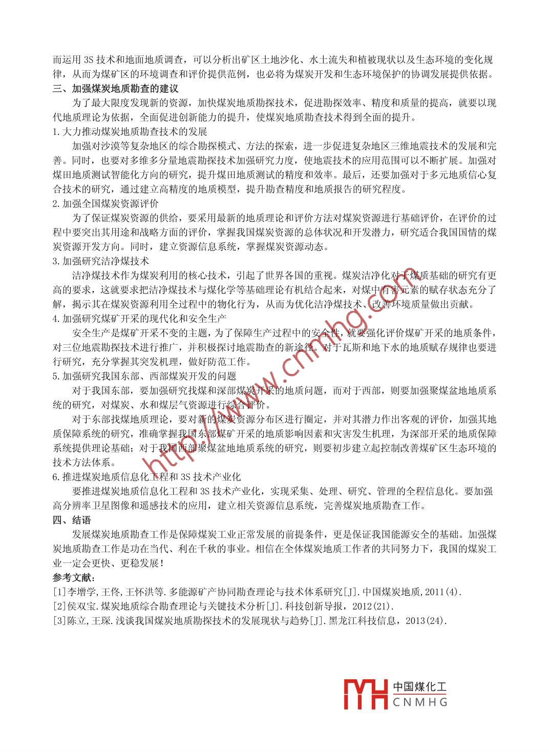 加強(qiáng)煤炭地質(zhì)勘查的研究孫培軒/重慶地質(zhì)礦產(chǎn)研究院[摘要]煤炭是我國的基礎(chǔ)能源,在一次性能源構(gòu)成中占據(jù)七成以上。隨著經(jīng)濟(jì)的高速發(fā)展,我國的煤炭需求量日益增大,而加強(qiáng)煤炭地質(zhì)勘查的工作也迫在眉睫。本文就我國的煤炭地質(zhì)勘查工作進(jìn)行論述,并對當(dāng)前形勢下加強(qiáng)煤炭地質(zhì)勘查提出建議。[關(guān)鍵詞]煤炭地質(zhì);勘查;研究煤炭作為我國的主體能源,是能源安全的基石。雖然我國煤炭資源儲量豐富、品種齊全,但是其賦存規(guī)律和開采條件相對復(fù)雜。為了確保煤炭工業(yè)的健康、可持續(xù)性發(fā)展,就必須要加強(qiáng)煤炭地質(zhì)勘查工作。一、 煤炭地質(zhì)勘查的重要性我國的煤田地質(zhì)工作開始于19世紀(jì)的中期,距今已有150多年的歷史。隨著我國工業(yè)化、城市化進(jìn)程的加快和人口的快速增長,對能源的需求量也越來越大。而由于我國能源資源狀況的限制,煤炭將長期占據(jù)我國能源的首要地位。但是隨著煤炭開發(fā)量的持續(xù)增加,煤炭供給也面臨更大的挑戰(zhàn)。煤炭地質(zhì)勘查工作是煤炭工業(yè)的基礎(chǔ),貫穿于整個煤炭工業(yè)、國民經(jīng)濟(jì)和社會發(fā)展。它為煤炭工業(yè)的發(fā)展提供保障,也為煤炭的開發(fā)利用、環(huán)境保護(hù)提供地質(zhì)服務(wù)。煤炭地質(zhì)勘查工作在煤炭工業(yè)中有著無可取代的作用和意義。因此,必須以科學(xué)發(fā)展觀為指導(dǎo),依照資源與環(huán)境并重的原則,提高資源的保障能力,加強(qiáng)煤炭地質(zhì)勘查工作。二、我國煤炭地質(zhì)勘查的主要成果我國的煤田地質(zhì)工作開始于19世紀(jì)的中期,距今已有150多年的歷史,并在煤田地質(zhì)工作者的共同努力下,形成了有著鮮明特點的煤田地質(zhì)理論和勘查體系。1.煤田地質(zhì)基礎(chǔ)研究我國的煤田地質(zhì)基礎(chǔ)研究已逐漸由傳統(tǒng)地質(zhì)走向地球系統(tǒng)科學(xué)研究階段,很多學(xué)者相繼針對華北、華南、鄂爾多斯盆地和東北中生代斷陷盆地聚煤規(guī)律進(jìn)行了課題研究和資源評價,從而對我國聚煤盆地的演化規(guī)律和煤炭資源的賦存規(guī)律有了- -定的掌握。在含煤地層劃分和聚煤規(guī)律的研究中創(chuàng)造性地運用了層序地層理論和方法,開拓了我國煤田地質(zhì)研究的新思路。在這些研究課題中,《中國聚煤作用系統(tǒng)分析》建立起了-套聚煤作用系統(tǒng),形成了系統(tǒng)分析方法,并應(yīng)用此系統(tǒng)的方法分析了我國的聚煤作用;“中國東.部煤田滑脫構(gòu)造與找煤研究”則為滑脫構(gòu)造理論領(lǐng)域帶來了新的進(jìn)展,對我國東部的找煤工程帶來了重大的進(jìn)展;《中國潔凈煤地質(zhì)研究》則在潔凈煤技術(shù)的發(fā)展上取得了突破,系統(tǒng)總結(jié)了我國煤中的有害微量元素的賦存特征,編制了我國歷史上第一-張潔凈煤資源分布圖。2.煤炭地質(zhì)勘查技術(shù)成果我國的地質(zhì)工作者以我國煤田的地形和地質(zhì)特點為基礎(chǔ),通過對地質(zhì)填圖、遙感、物探、鉆探、測試等技術(shù)手段的合理選擇,對各種地質(zhì)信息加以利用,并綜合了煤層賦存規(guī)律和對應(yīng)開采所需的技術(shù)條件,建立起了-套煤炭綜合勘探技術(shù)體系。這套體系不僅在國際上很先進(jìn),最重要的是它是依據(jù)我國的地形地質(zhì)特點而建立起來的,對我國的資源綜合勘探技術(shù)有著明確的指導(dǎo)意義。這套體系的建立使煤田三維地震技術(shù)得到了迅速的發(fā)展,同時大幅度提升了勘測的精度;實現(xiàn)了在復(fù)雜山區(qū),沙漠、厚層黃土、水上、沼澤以及采空區(qū)等地震施工禁區(qū)的作業(yè),拓寬了工作領(lǐng)域;解釋了斷層、陷落柱、煤層宏觀結(jié)構(gòu)以及其厚度變化趨勢,勘查能力得到進(jìn)一-步加強(qiáng)。同時,鉆探設(shè)備和鉆探工藝也不斷更新和完善,使我國煤田鉆探事業(yè)達(dá)到了國際先進(jìn)水平。3.煤炭地質(zhì)勘查信息化程度和3S技術(shù)隨著科學(xué)技術(shù)的發(fā)展,計算機(jī)信息技術(shù)也在煤炭地質(zhì)勘查中得到了廣泛的應(yīng)用。無論是在野外的數(shù)據(jù)采集方面還是在地質(zhì)報告的編制方面,都基本實現(xiàn)了數(shù)字化和信息化。依托地理信息系統(tǒng)平臺,還在全國范圍內(nèi)建立了煤炭地質(zhì)工作程度數(shù)據(jù)庫,同時煤炭資源信息系統(tǒng)和煤炭地質(zhì)主流程信息系統(tǒng)的建立也都已經(jīng)起步。遙感技術(shù)也在煤炭資源和煤礦區(qū)環(huán)境評價的領(lǐng)域中得到廣泛的應(yīng)用,而高分辨率圖像也使地質(zhì)填圖的效率和精度得到提高。高光譜技術(shù)和遙感信息快速提取技術(shù)的研空也和得了點越進(jìn)屈中國煤化工4.資源評價和環(huán)境評價煤炭及煤層氣的資源評價為我國煤炭工業(yè)的宏觀決策、大型煤炭CNMH G決策依據(jù)。而運用3S技術(shù)和地面地質(zhì)調(diào)查,可以分析出礦區(qū)土地沙化、水土流失和植被現(xiàn)狀以及生態(tài)環(huán)境的變化規(guī)律,從而為煤礦區(qū)的環(huán)境調(diào)查和評價提供范例,也必將為煤炭開發(fā)和生態(tài)環(huán)境保護(hù)的協(xié)調(diào)發(