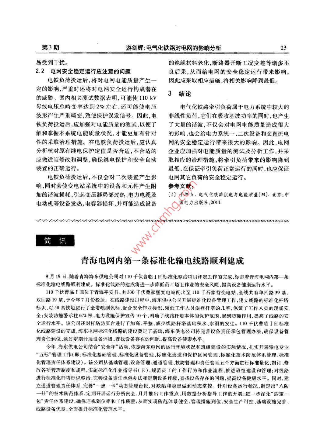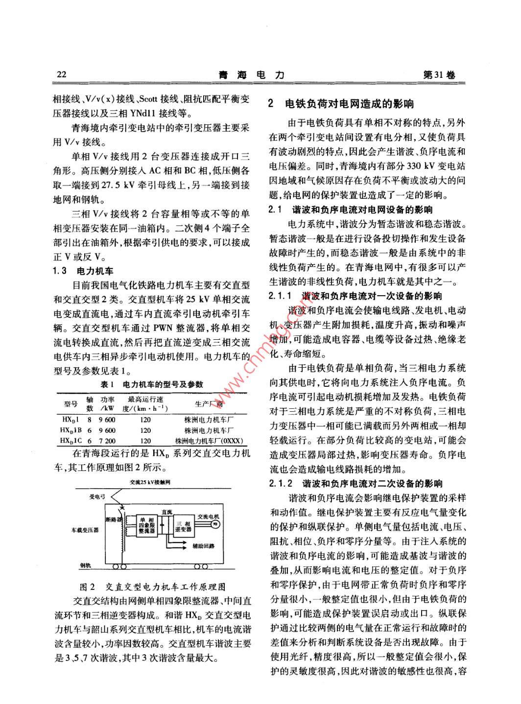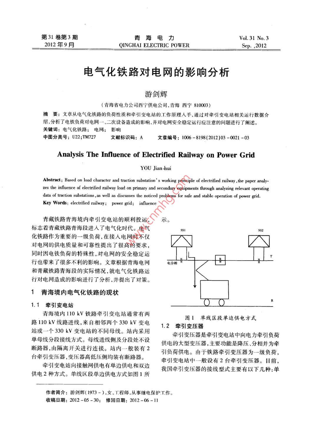 第31卷第3期青海電力Vol.31 No.32012年9月QINCHAI ELECTRIC POWERSep.,2012電氣化鐵路對(duì)電網(wǎng)的影響分析游劍輝(青海省電力公司西寧供電公司,青海西寧810003)商要:文章從電氣化鐵路的負(fù)荷性質(zhì)和牽引變電站的工作原理人手,通過對(duì)牽引變電站相關(guān)運(yùn)行數(shù)據(jù)介紹,分析了電鐵負(fù)荷對(duì)電網(wǎng)-、二次設(shè)備造成的影響,并對(duì)電網(wǎng)安全穩(wěn)定運(yùn)行應(yīng)注意的問題進(jìn)行了闡述。關(guān)鍵詞:電氣化鐵路;電網(wǎng); 影響中圖分類號(hào): U22;TM727文獻(xiàn)標(biāo)識(shí)碼: A文章編號(hào): 1006 -8198(2012)03 -0021 -03Analysis The Influence of Electrified Railway on Power GridYOU Jian -huiAbstract: Based on load character and traction substation ' s working principle of electrified railway , the paper analy-zes the infuence of electrified railway load on primary and secondary equipments through analyzing relevant operatingdata of traction substations ,as well as discuses the noticed problems for safe and stable operation of power grid.Key Words: eletrified railway; power grid; infuence青藏鐵路青海境內(nèi)牽引變電站的順利投運(yùn),示。標(biāo)志著青藏鐵路青海段進(jìn)入了電氣化時(shí)代。電氣ssS2化鐵路作為重要的一級(jí)負(fù)荷,在接人電網(wǎng)時(shí)不僅對(duì)電網(wǎng)的供電質(zhì)量和可靠性提出了很高的要求,同時(shí)因電鐵負(fù)荷的特殊性,對(duì)電網(wǎng)的安全穩(wěn)定運(yùn)行也帶來了很多不利的影響。文章根據(jù)青海電網(wǎng)電分相田和青藏鐵路青海段的實(shí)際情況,就電氣化鐵路運(yùn)行對(duì)電網(wǎng)造成的影響進(jìn)行了分析,并提出了對(duì)策。1青海境內(nèi)電氣化鐵路的現(xiàn)狀.1 牽引變電站O0R青海境內(nèi)110kV鐵路牽引變電站通常有兩圖1單線區(qū)段單邊供電方式路110kV線路進(jìn)線,來自相鄰兩個(gè)330kV變電1.2 牽引變壓器站或一一個(gè)330 kV變電站的不同母線。站內(nèi)采用牽引變壓器是牽引變電站中向電力牽引負(fù)荷單母線分段接線方式。母線進(jìn)線側(cè)及分段處不設(shè)供電的大型變壓器,主要功能是降壓、分相并為牽斷路器,由隔離開關(guān)進(jìn)行連接。站內(nèi)- -般裝有2引負(fù)荷供電。由于鐵路牽引變壓器為- -級(jí)負(fù)荷,臺(tái)牽引變壓器,變壓器高低壓側(cè)均裝有斷路器。牽引變電站中一般設(shè)有2臺(tái)牽引變壓器。目前,牽引變電站向接觸網(wǎng)供電有單邊供電和雙邊我國牽引變壓器的接線型式主要有以下幾種:單供電2種方式。單線區(qū)段單邊供電方式如圖1所作者簡介:游劍輝( 1973-> ,女,工程師,從事繼電保護(hù)工作。收稿日期: 2012-05 -30;修回日期: 2012-06-112:青.海電力第31卷相接線、V/v( x)接線、Scott接線、阻抗匹配平衡變2電鐵負(fù)荷對(duì)電網(wǎng)造成的影響壓器接線以及三相YNd11接線等。.青海境內(nèi)牽引變電站中的牽引變壓器主要采由于電鐵負(fù)荷具有單相不對(duì)稱的特點(diǎn),另外在兩個(gè)牽引變電站間設(shè)置有電分相,又使負(fù)荷具用V/v接線。單相V/v接線用2臺(tái)變壓器連接成開口三有波動(dòng)劇烈的特點(diǎn),因此會(huì)產(chǎn)生諧波、負(fù)序電流和角形。高壓側(cè)分別接人AC相和BC相,低壓側(cè)各電壓偏差。同時(shí),青海境內(nèi)有部分330 kV變電站取一-端接到27.5kV牽引母線上,另-端接到接因地域和氣候原因存在負(fù)荷不平衡或波動(dòng)大的問題,給電網(wǎng)的保護(hù)裝置也造成了一定的影響。地網(wǎng)和鋼軌。.三相V/v接線將2臺(tái)容量相等或不等的單2.1諧波和負(fù)序電流對(duì)電網(wǎng)設(shè)備的影響相變壓器安裝在同-油箱內(nèi)。二次側(cè)4個(gè)端子全電力系統(tǒng)中,諧波分為暫態(tài)諧波和穩(wěn)態(tài)諧波。部引出在油箱外,根據(jù)牽引供電的要求,可以接成暫態(tài)諧波一般是在進(jìn)行設(shè)備投切操作和發(fā)生設(shè)備故障時(shí)產(chǎn)生的,而穩(wěn)態(tài)諧波一般是由系統(tǒng)中的非正V或反V。1.3 電力機(jī)車線性負(fù)荷產(chǎn)生的。在青海電網(wǎng)中,有很多可以產(chǎn)目前我國電氣化鐵路電力機(jī)車主要有交直型生諧波的非線性負(fù)荷,電力機(jī)車就是其中之一。和交直交型2類。交直型機(jī)車將25 kV單相交流2.1.1 諧波和負(fù)序電流對(duì)一-次設(shè)備的影響電變成直流電,通過車內(nèi)直流牽引電動(dòng)機(jī)牽引車諧波和負(fù)序電流會(huì)使輸電線路、發(fā)電機(jī)、電動(dòng)輛。交直交型機(jī)車通過PWN整流器,將單相交機(jī)、變壓器產(chǎn)生附加損耗,溫度升高,振動(dòng)和噪聲流電轉(zhuǎn)換成直流,然后再把直流逆變成三相交流增加,可能造成電容器、電纜等設(shè)備過熱、絕緣老電供車內(nèi)三相異步牽引電動(dòng)機(jī)使用。電力機(jī)車的化壽命縮短。型號(hào)及參數(shù)見表1。由于電鐵負(fù)荷是單相負(fù)荷,當(dāng)三相電力系統(tǒng)表1 電力機(jī)車的型號(hào)及參數(shù)向其供電時(shí),它將向電力系統(tǒng)注人負(fù)序電流。負(fù)型號(hào)軸功率最高運(yùn)行速生產(chǎn)廠商序電流可引起電動(dòng)機(jī)損耗增加及發(fā)熱。電鐵負(fù)荷數(shù)/kW度/(km.h-')對(duì)于三相電力系統(tǒng)是嚴(yán)重的不對(duì)稱負(fù)荷,三相電HXp1 8 9600120HXp1B 6 9600株洲電力機(jī)車廠力變壓器中