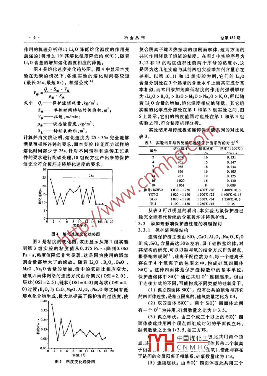 第4期總第182 期冶金叢刊Sum. 182 No. 42009年8月METALLURGICAL COLLECTIONSugust 2009添加劑對無氟連鑄保護(hù)渣性能影響的實(shí)驗(yàn)研究邱斌'袁守謙'曹余良'宋美娟'梁德安張啟業(yè)2(1.西安建筑科技大學(xué)冶金工程學(xué)院,陜西西安710055; 2.振德窯業(yè)有限責(zé)任公司,河南焦作454001)摘要在研究了國內(nèi)外無氟連鑄結(jié)晶器保護(hù)渣發(fā)展?fàn)顩r的基礎(chǔ)上,優(yōu)化實(shí)驗(yàn)配方,對無氟保護(hù)渣的熔化溫度、熔化速度和粘度進(jìn)行了實(shí)驗(yàn)研究。通過與傳統(tǒng)的板坯連鑄保護(hù)渣系的對比,實(shí)驗(yàn)結(jié)果完全滿足現(xiàn)代板坯連鑄的工藝要求。關(guān)鍵詞板坯連鑄; 無氟保護(hù)渣;添加劑中圖分類號:T777.1文獻(xiàn)標(biāo)識碼:A文章編號 :1671 -3818(2009)04 -0004 -04EXPERIMENTAL STUDY ON EFFECT OF ADDITIVESON FLUORINE-FREE MOLD POWDERQiu Bin Yuan Shouqian Cao Yuliang Song Meijuan( School of Metallurgical Engineering, Xian University of Architecture and Technology, Xian 710055 , Shanxi)Liang Dean Zhang Qiye( Jiaozhou Zhengde Refractory Co. , Ltd. , Jiaozuo 454001 , Henan)Abstract Based on study of development condition of fluorine-free continuous casting mold powder, theexperimental formula was optimized. The meling temperature , meling rate and viscosity of fluoride-freemold powder were studied. Compared with the powder of traditional slab continuous casting, the experi-mental results have been fully met the requirements of the modern slab continuous casting process.Key words slab continuous casting; fluoride-free mold powder ; additives1前言未引起廠家足夠的重視,要想解決氟化物的污染問在連鑄技術(shù)發(fā)展過程中,結(jié)晶器保護(hù)渣起著極題,必須開發(fā)出低氟或無氟保護(hù)渣。從環(huán)保角度看,為關(guān)鍵的作用,可以說連鑄能達(dá)到目前的水平是與無氟或低氟保護(hù)渣是今后保護(hù)渣發(fā)展的-一個趨勢。結(jié)晶器保護(hù)渣技術(shù)密不可分的。因此,連鑄保護(hù)渣因此,開展連鑄無氟保護(hù)渣的應(yīng)用研究對于發(fā)展連技術(shù)已成為現(xiàn)代連鑄技術(shù)的重要組成部分。從保護(hù)鑄環(huán)保型保護(hù)渣技術(shù)具有重要的現(xiàn)實(shí)意義[5)。渣技術(shù)的發(fā)展過程看,目前其研究和應(yīng)用主要集中2實(shí)驗(yàn) 內(nèi)容與方法于含氟連鑄保護(hù)渣領(lǐng)域”".2]。傳統(tǒng)的保護(hù)渣中通常2.1無氟保護(hù)渣的制備要加入一定量的氟化物如NaF、CaF2、NagA,F.(冰實(shí)驗(yàn)用保護(hù)渣成分(見表1)是在充分研究國內(nèi)晶石)等充當(dāng)助熔劑調(diào)節(jié)保護(hù)渣的粘度和熔化溫度外無氟連鑄結(jié)晶器保護(hù)渣,并進(jìn)行了一系列探索性等性能,由于其效果比較顯著,一直被冶金工作者所實(shí)驗(yàn)的基礎(chǔ)上配制而成的。實(shí)驗(yàn)用保護(hù)渣采用化學(xué)采用。但在連鑄生產(chǎn)中,保護(hù)渣中的氟化物有20%純試劑配制而成,因?yàn)槠渲械难趸?、氧化鉀價格比~30%溶入二冷水中,使其呈酸性,造成水的污染,較昂貴,所以用碳酸鹽代替,將各原料研磨成粒度小污染水質(zhì)的循環(huán)使用,腐蝕鑄機(jī),縮短了鑄機(jī)的壽于100目的粉料.將物料充分混勻,再稱取160g裝命川。如果不慎將含有氟化物的保護(hù)渣泄漏,還會入10(中國煤化工式電阻爐內(nèi)進(jìn)行惡化現(xiàn)場的操作環(huán)境'4。雖然問題比較嚴(yán)重,但還預(yù)熔|Y片CNMHG捧充分?jǐn)嚢?保溫作者簡介:邱斌(1983-),男,碩士研究生,2009年畢業(yè)于西安建筑科技大學(xué)冶金工程學(xué)院.從事保護(hù)渣研究工作.第4期邱斌等:添加劑對無氟連鑄保護(hù)渣性能影晌的實(shí)驗(yàn)研究戰(zhàn)1 實(shí)驗(yàn)用保護(hù)渣的化學(xué)成分范圍各化學(xué)成分含量/%堿度Al2O,Mg0Li20BaOKzO Na20B2OFe2O,K2O0.7-1.20-84-130~53-102-112-52~510min后立即將坩堝從爐中取出,迅速冷卻液渣,將表2實(shí)驗(yàn)結(jié)果冷卻后的保護(hù)渣粉碎,并用200目的篩子篩分以備編號熔化溫度/心熔化速度/8粘度/Pa.s使用。1167240.3752.2熔化溫度與熔化速度的測定9690.2318540.065由于保護(hù)渣是多種氧化物組成的多組元體系,9650.247因此,它沒有固定的熔點(diǎn),而是一一個從開始軟化到流9220. 108動的溫度區(qū)間,通常用半球點(diǎn)法來定義和測試保護(hù)8920.1559660.234渣的熔化溫度與熔化速度。對不同配比的預(yù)熔保護(hù)9560.105渣的熔化溫度進(jìn)行測量,實(shí)驗(yàn)裝置見圖1。每個測.9080.1339020. 157試實(shí)驗(yàn)重復(fù)做3次,并用秒表記錄試樣變形了1/69480. 136到變形1/2之間所用時間,推測試樣的熔化時間。8800.102取測試試樣的熔化溫度平均值作為該試樣的熔化溫139110.1509610. 125度;取試樣熔化時間平均值做為試樣的熔化速度。9050. 10110200.1308930.074I f pthuugpI 0610.0893.2 結(jié)果分析圖3是熔化溫度變化趨勢圖。從圖3中可以看1-屏幕:2-目鏡;3-物鏡;4-熱電偶;5-支撐管;6-電爐;7到從第1組實(shí)驗(yàn)到第3組實(shí)驗(yàn)的熔化溫度1 167C-試樣;:8-墊片;9 -投光燈降到854C ,熔化溫度降低非常顯著,這是因?yàn)槭褂脠D1 保護(hù)渣熔化溫度測定裝置示意圖的添加劑都從較低含量增加到較高含量的緣故。隨2.3粘度 的測定著LiO、B,0,、BaO、MgO 、Na,O 含量的增加,提高對18組配方進(jìn)行1300C時的粘度的測定,所了熔渣的硅氧比,使得熔渣的網(wǎng)絡(luò)強(qiáng)度不斷減弱;用裝置(見圖2)為RTW-1