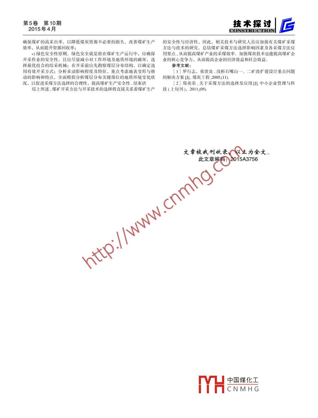 技術(shù)探討第5卷第10期后|CONSTRUCTION2015年4月煤礦采煤方法與技術(shù)分析王文達山西晉煤集團陽城晉圣固隆煤業(yè)有限公司山西省 晉城市048000摘要:隨著中國經(jīng)濟的飛速發(fā)展,煤礦產(chǎn)業(yè)成為了促進中國經(jīng)濟發(fā)展的重要支柱。煤礦在進行采煤時應(yīng)遵循安全性、經(jīng)濟性、高產(chǎn)性的原則,更新改革煤礦采煤方法和技術(shù)是提高采煤效率的有效途徑。本文對目前煤礦采礦的技術(shù)以及開采方法進行了分析,期望能有助于煤礦采礦企業(yè)選擇恰當(dāng)?shù)拈_采技術(shù)與方法來落實采礦工程。關(guān)鍵詞:煤礦;采煤方法;技術(shù)分析中圖分類號: X752文獻標(biāo)識碼: A煤礦開采方法與技術(shù)的合理化應(yīng)用不僅關(guān)系著現(xiàn)代煤礦開采的效采高 2m ~ 3m的長壁工作面,用綜合機械化采煤工藝進行回采,利用率與安全性,還直接影響著煤礦企業(yè)的經(jīng)濟效益與可持續(xù)發(fā)展。在當(dāng)?shù)V山壓力的作用或輔以人工松動方法使支架上方的頂煤破碎成散體后前煤礦開采規(guī)模不斷擴大的條件下,煤礦開采技已逐漸朝向集約化、由支架后方 (或上方)放出,并予以回收的一-種采煤方法。精細化與機械化方向推進,特別是部分大型開采設(shè)備的應(yīng)用,大幅度放頂采煤技術(shù)是針對煤層較厚的礦區(qū),主要通過在煤層底部開采改善了煤礦企業(yè)生產(chǎn)的安全性,促進了煤礦生產(chǎn)自動化程度的提高。1 個工作面,然后使用普通采煤方式回采煤炭,利用煤礦的壓力,把頂因此,加強有關(guān)煤礦采煤方法與技術(shù)的分析,對于改善煤礦生產(chǎn)的質(zhì)煤 破碎部分放出。這種采煤方式的優(yōu)點就是經(jīng)濟性好、工作效率高,量具有重要現(xiàn)實意義:缺點就是煤:炭回收率低,該方法能作為輔助技術(shù),與條帶開采技術(shù)進1煤礦采煤方法與技術(shù)分析行融合運用。煤礦采煤技術(shù)研究直接影響煤礦生產(chǎn)效率,對采煤技術(shù)進行合理化1.5 離層注漿技術(shù)管理也能有效提高煤礦的采煤效率,針對不同煤層的分布情況,企業(yè)實離層注漿技術(shù)是當(dāng)前采煤工作中的重要采煤技術(shù),其主要用于調(diào)際人員可以根據(jù)煤礦生產(chǎn)情況的不同設(shè)計出有效、合理的采煤方式。整覆巖及地表下沉速率,基本操作步驟為:對地面采空區(qū)上部的覆巖1.1長臂采煤法進行鉆孔處理,利用高壓將液體填充材料通過鉆眼充填到采空區(qū)中,針對煤層分布理想、煤儲量大、地質(zhì)條件優(yōu)質(zhì)的煤田,煤礦企業(yè)以減 小采空區(qū)下沉。同直接在采空區(qū)填充漿液的方法相比,離層注漿采用長壁采煤技術(shù),其主要特征就是對工作面進行長壁推進、長壁布技 術(shù)的施工不在井下開展,對于安裝好的生產(chǎn)系統(tǒng)不會產(chǎn)生影響,且置。為了提高開采作業(yè)穩(wěn)定性,在采空區(qū)預(yù)留煤柱的空間,在開采推該技 術(shù)具有更高的煤炭回收率和經(jīng)濟性進出- -段距離后,保留-部分煤柱,從而達到促進間歇性推進的目的。2煤礦采煤方法與技術(shù)選擇的影響因素及選擇原則現(xiàn)階段,長壁采煤的主要方法工藝有三種,分別是:炮采、綜采、普采。2.1煤礦采煤方法與技術(shù)選擇的影響因素這三種工藝的區(qū)分方式是以機械化程度的不同為標(biāo)準,在煤礦采煤時a)經(jīng)濟性因素。煤礦生產(chǎn)的經(jīng)濟效益是采煤方法選擇的重要考慮具體采用何種工藝按照煤層分布的實際情況進行選擇。因素之-。先進的采煤設(shè)備應(yīng)用需大量成本投入,依據(jù)投入與產(chǎn)出之a(chǎn))炮采主要針對較薄煤層及邊角煤層塊段,其操作方式主要是在間的關(guān)系,恰當(dāng)選擇采煤方法與技術(shù)是保證煤礦開采高效益的基礎(chǔ)。煤壁上打出炮眼,然后利用爆破方式使煤層破碎,通過人工裝煤或機在 采煤方法選擇時,還需對材料供應(yīng)狀況進行分析,如對于假頂材料械運煤方式進行運輸。煤礦頂板采用摩擦式金屬支柱對煤礦進行安全及 填充材料的取材成本能否有效降低,材料可否進行就地取材等; b)防護。炮采機械化程度不高,所以工作效率不高;技術(shù)性因素。技術(shù)水平,尤其是生產(chǎn)設(shè)備供應(yīng)及裝備水平等是采煤方b)綜采是一種機械化程度較高的采煤方式,其中采煤、裝煤、運法 選擇的限制性條件因素。在現(xiàn)代科技水平的不斷發(fā)展下,國內(nèi)的采煤及防護裝置都是使用機械化手段。綜采是一一種 全機械化的采煤技術(shù),煤 方法與采煤技術(shù)也在不斷創(chuàng)新,高效、高可靠性與安全性的采煤方其生產(chǎn)效率也優(yōu)于另外兩種采煤方式;法也會逐漸涌現(xiàn); c) 地質(zhì)條件因素。(a) 煤層地質(zhì)構(gòu)造。當(dāng)煤層地質(zhì)條c)普采主要針對煤層塊段,在儲量小、地勢復(fù)雜的環(huán)境下,普采件比較穩(wěn)定時 ,通常采用綜采,而當(dāng)煤層條件不穩(wěn)定時,通常采用普采;的機械化程度較高,通常使用采煤機完成落煤及裝煤,運煤及頂板防在 采煤方法選擇前應(yīng)先勘察開采區(qū)域內(nèi)的地質(zhì)構(gòu)造狀況; ()煤層厚度。護裝置與炮采工藝相同。要根據(jù)煤層厚度的不同選擇對應(yīng)的采煤方法,對于厚及特厚煤層應(yīng)選1.2傾斜長壁采煤法用分層