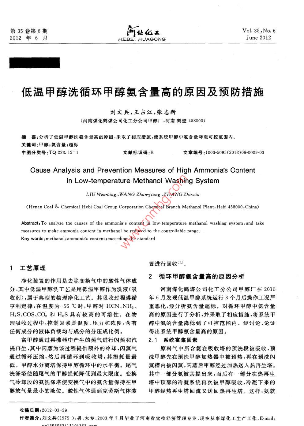第35卷第6期Vol 35, No 62012年6月HEBEI HUAGONGJune 2012低溫甲醇洗循環(huán)甲醇氨含量高的原因及預(yù)防措施劉文兵,王占江,張志新(河南煤化鶴煤公司化工分公司甲醇廠,河南鶴壁458000)摘要:分析了低溫甲醇洗氨含量高的原因,采取了相應(yīng)措施,使系統(tǒng)甲醇中氨含量降至可控范圍內(nèi)關(guān)鍵詞:甲醇;氨含量;超標(biāo)中圖分類號(hào):TQ223.12+1文獻(xiàn)標(biāo)識(shí)碼:B文章編號(hào):1003-5095(2012)06-000903Cause Analysis and Prevention Measures of High Ammonia's Contentin Low-temperature Methanol Washing SystemLIU Wen-bing, WANG Zhanjiang, ZHANG Zhi-zin(Henan Coal & Chemical Hebi Coal Group Corporation Chemical Branch Methanol Plant, Hebi 458000, China)Abstract: To analyze the causes of the ammonias content in low-temperature methanol washing system, and takemeasures to make ammonia content in methanol be reduced to the controllable rangeKey words: methanol; ammonias content; exceeding the standard1工藝原理置進(jìn)行回收凈化裝置的作用是去除變換氣中的酸性氣體成2循環(huán)甲醇氨含量高的原因分析分,其中低溫甲醇洗工藝是用低溫甲醇作為洗液(吸河南煤化鶴煤公司化工分公司甲醇廠在2010收劑),屬于典型的物理凈化工藝。其吸收過(guò)程遵循年6月發(fā)現(xiàn)低溫甲醇系統(tǒng)運(yùn)行3個(gè)月后操作工況嚴(yán)亨利定律在溫度為-56℃時(shí),甲醇對(duì) HCN NH3、重惡化,經(jīng)分析氨含量超標(biāo)。對(duì)循環(huán)甲醇中氨含量H2S、COS、CO2和H2S具有較高的可溶性。在物高的原因進(jìn)行了分析,并采取了相應(yīng)措施,將系統(tǒng)甲理吸收過(guò)程中,控制因素是溫度、壓力和濃度,含有醇中氨的含量降低到了可控范圍內(nèi)。經(jīng)討論、論證任何成分的液體負(fù)載均與成分的分壓成比例。得出系統(tǒng)甲醇氨含量高的原因富甲醇通過(guò)再沸器中產(chǎn)生的蒸氣進(jìn)行閃蒸和汽2.1系統(tǒng)富集因素提再生,其中閃蒸為該過(guò)程提供額外的冷卻,閃蒸氣原料氣中所含氨在吸收塔的預(yù)洗段被吸收,預(yù)通過(guò)循環(huán)壓縮,然后再循環(huán)到吸收塔,其損耗量最洗甲醇先在預(yù)洗甲醇加熱器中被預(yù)熱,再在預(yù)洗閃低。甲醇水分離塔保持甲醇循環(huán)中的水平衡。尾氣蒸槽內(nèi)被閃蒸,閃蒸后甲醇經(jīng)過(guò)加熱送入熱再生塔。洗滌塔使隨尾氣的甲醇損耗降低到最大限度。變換其中一部分氨被其提出來(lái),而后有一部分在熱再生氣冷卻段的氨洗滌塔使變換氣中的氨含量保持在甲塔中頂部的冷凝系統(tǒng)再次被甲醇吸收,冷凝下來(lái)的醇放氣量最小的液位。酸性氣體通到克勞斯氣體裝甲醇經(jīng)熱再生塔回流又送回?zé)嵩偕_@樣,氨就收稿日期:2012-03-29作者簡(jiǎn)介:劉文兵(1975-),男,大專,2003年7月畢業(yè)于河南省黨校經(jīng)濟(jì)管理專業(yè),現(xiàn)在從事煤化工生產(chǎn)工作, E-mail:10河北化工 Hebei Chemical Industry第35卷會(huì)在甲醇系統(tǒng)中富集,且一部分以弱物理鍵,另一部常生產(chǎn)。分以強(qiáng)化學(xué)鍵方式溶解于甲醇中。氨的富集在達(dá)到一定含量后,會(huì)導(dǎo)致熱再生塔4預(yù)防措施中段用于氣提H2S的甲醇蒸汽不足以氣提氨,氨最4.1原料氣冷卻及氨的脫除終會(huì)在熱再生塔中段與H2S相結(jié)合形成(NH4)2S冷卻原料氣,使氨在原料氣中的含量降低,以防存在于熱再生甲醇中,當(dāng)將再生甲醇送入吸收塔時(shí)止氨在熱再生塔系統(tǒng)中富集,同時(shí)減少甲醇的排放。再生甲醇中(NH4)2S會(huì)受到吸收塔頂段凈化氣的原料氣在合成氣換熱器內(nèi)被合成氣冷卻,氨制冷劑分壓作用,使(NH4)2S分解再次釋放出H2S,使凈在深冷器殼側(cè)被加壓蒸發(fā)(溫度為5℃),其出口溫化氣H2S含量超標(biāo)。度和蒸發(fā)壓力控制器串級(jí)調(diào)節(jié),以避免溫度過(guò)低而2.2洗氨塔因素導(dǎo)致管程結(jié)冰堵塞換熱器。變換氣經(jīng)過(guò)洗氨塔的一股鍋爐水冷卻器換熱至原料氣攜帶的大部分氨將在氨再洗塔內(nèi)被逆流40℃后,進(jìn)入洗氨塔。經(jīng)過(guò)3層塔盤來(lái)吸收原料氣接觸的40℃鍋爐給水吸收脫除,若原料氣流量或其中的大部分氨,減少進(jìn)入吸收塔的氨含量。中的氨含量增加,需通過(guò)鍋爐給水流量控制器來(lái)提2.2.1鍋爐水器換熱因素髙鍋爐給水流量以確保大部分氨被脫除。在日常生產(chǎn)中,由于鍋爐水冷卻器換熱效率問(wèn)題4.2吸收塔的預(yù)洗段氨的脫除造成鍋爐水溫度達(dá)不到設(shè)計(jì)要求時(shí),會(huì)影響到對(duì)原料為了避免原料氣中一些微量的氨、氫氰酸及其氣中氨的洗滌吸收效果。此外,進(jìn)入洗氨塔的原料氣它物質(zhì)對(duì)整個(gè)甲醇循環(huán)系統(tǒng)的污染,在吸收塔預(yù)洗溫度控制過(guò)高也會(huì)使系統(tǒng)中甲醇氨含量升高。段應(yīng)將其脫除。由于這些成分溶解度高,不需要大2.2.2流量因素量的甲醇溶劑,因此,預(yù)洗甲醇流量應(yīng)由流量控制器鍋爐給水與入地溫甲醇洗的流量不相匹配,使控制。通過(guò)吸收塔的預(yù)洗段分析點(diǎn)來(lái)分析HCN、原料氣中氨沒有被完全在洗氨塔洗下來(lái),從而使原NH3含量,再通過(guò)流量調(diào)整把出自預(yù)洗段氣體中的料氣中的氨超標(biāo)進(jìn)入原料氣洗滌塔。因而,氨在洗HCN、NH3控制在指標(biāo)內(nèi)(NH3為5mg)。滌甲醇不斷吸收下而不斷積累,致使系統(