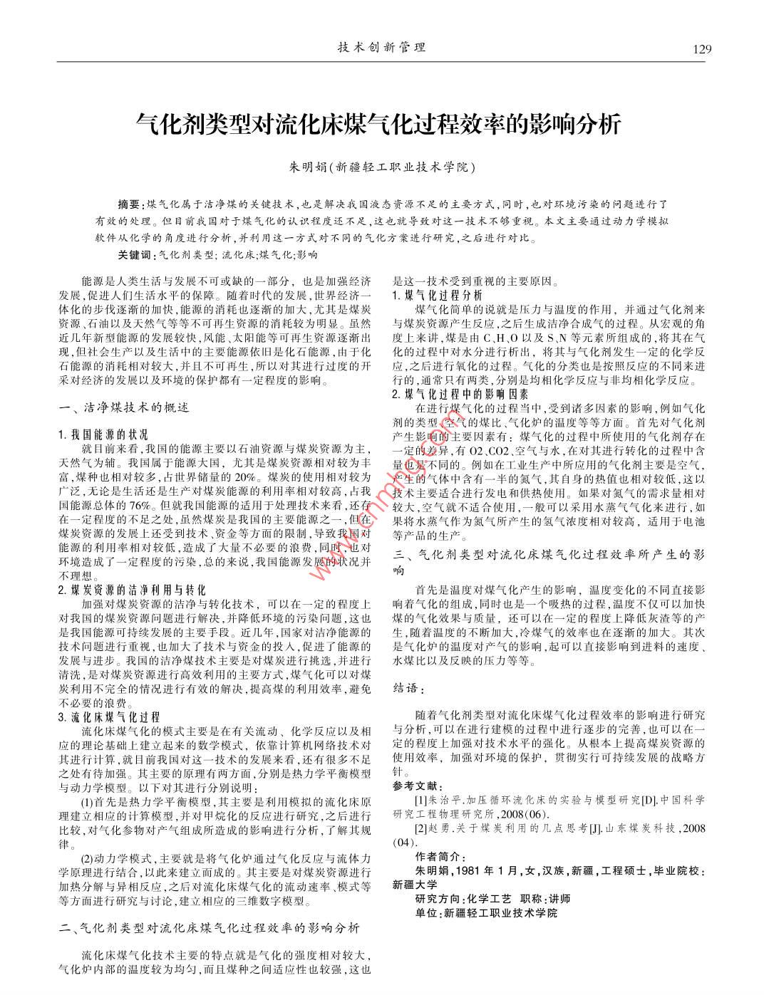 技術(shù)創(chuàng)新管理129氣化劑類型對流化床煤氣氣化過程效率的影響分析朱明娟(新疆輕工職業(yè)技術(shù)學院)摘要:煤氣化屬于潔凈煤的關(guān)鍵技術(shù),也是解決我國液態(tài)資源不足的主要方式,同時,也對環(huán)境污染的問題進行了有效的處理。但目前我國對于煤氣化的認識程度還不足,這也就導致對這一技術(shù)不夠重視。本文主要通過動力學模擬:軟件從化學的角度進行分析,并利用這一方式對不同的氣化方案進行研究,之后進行對比。關(guān)鍵詞:氣化劑類型;流化床;煤氣化;影響能源是人類生活與發(fā)展不可或缺的一部分,也是加強經(jīng)濟是這一 -技術(shù)受到重視的主要原因。發(fā)展,促進人們生活水平的保障。隨著時代的發(fā)展,世界經(jīng)濟一1.煤氣化過程分析體化的步伐逐漸的加快,能源的消耗也逐漸的加大,尤其是煤炭煤氣化簡單的說就是壓力與溫度的作用,并通過氣化劑來資源、石油以及天然氣等等不可再生資源的消耗較為明顯。雖然與煤炭資源產(chǎn)生反應(yīng),之后生成潔凈合成氣的過程。從宏觀的角近幾年新型能源的發(fā)展較快,風能、太陽能等可再生資源逐漸出度 上來講,煤是由C.H、O以及S.N等元素所組成的,將其在氣現(xiàn),但社會生產(chǎn)以及生活中的主要能源依舊是化石能源,由于化化的過程中對水分進行析出,將其與氣化劑發(fā)生一-定的化學反石能源的消耗相對較大,并且不可再生,所以對其進行過度的開應(yīng),之后進行氧化的過程。氣化的分類也是按照反應(yīng)的不同來進采對經(jīng)濟的發(fā)展以及環(huán)境的保護都有一定程度的影響。行的,通常只有兩類,分別是均相化學反應(yīng)與非均相化學反應(yīng)。2.煤氣化過程中的影響因素一、潔凈煤技術(shù)的概述在進行煤氣化的過程當中,受到諸多因素的影響,例如氣化劑的類型、空氣的煤比、氣化爐的溫度等等方面。首先對氣化劑產(chǎn)生影響的主要因素有:煤氣化的過程中所使用的氣化劑存在就目前來看,我國的能源 主要以石油資源與煤炭資源為主,一定的差異 有02.C02、空氣與水,在對其進行轉(zhuǎn)化的過程中含天然氣為輔。我國屬于能源大國,尤其是煤炭資源相對較為豐量也是不同的。例如在工業(yè)生產(chǎn)中所應(yīng)用的氣化劑主要是空氣,富,煤種也相對較多,占世界儲量的20%。煤炭的使用相對較為產(chǎn)生的氣體中含有一-半的氮氣,其自身的熱值也相對較低,這以廣泛,無論是生活還是生產(chǎn)對煤炭能源的利用率相對較高,占我技術(shù)主要適合進行發(fā)電和供熱使用。如果對氮氣的需求量相對國能源總體的76%。但就我國能源的適用于處理技術(shù)來看,還存較大,空氣就不適 合使用,一股可以采用水蒸氣氣化來進行,如在一定程度的不足之處,雖然煤炭是我國的主要能源之一- ,但在果將 水蒸氣作為氮氣所產(chǎn)生的氫氣濃度相對較高,適用于電池煤炭資源的發(fā)展上還受到技術(shù)、資金等方面的限制,導致我國對等產(chǎn)品的生產(chǎn)。能源的利用率相對較低,造成了大量不必要的浪費,同時,也對三、氣化劑類型對流化床煤氣化過程效率所產(chǎn)生的影環(huán)境造成了一定程度的污染,總的來說,我國能源發(fā)展的狀況并不理想。2.煤炭資源的潔凈利用與轉(zhuǎn)化首先是溫度對煤氣化產(chǎn)生的影響,溫度變化的不同直接影加強對煤炭資源的潔凈與轉(zhuǎn)化技術(shù),可以在-定的程度上響著氣化的組成,同時也是一個吸熱的過程,溫度不僅可以加快對我國的煤炭資源問題進行解決,并降低環(huán)境的污染問題,這也煤的氣化效果與質(zhì)量,還可以在-.定的程度上降低灰渣等的產(chǎn)是我國能源可持續(xù)發(fā)展的主要手段。近幾年,國家對潔凈能源的生,隨著溫度的不斷加大,冷煤氣的效率也在逐漸的加大。其次技術(shù)問題進行重視,也加大了技術(shù)與資金的投人,促進了能源的是氣化爐的溫度對產(chǎn)氣的影響,起可以直接影響到進料的速度、發(fā)展與進步。我國的潔凈煤技術(shù)主要是對煤炭進行挑選并進行水煤 比以及反映的壓力等等。清洗,是對煤炭資源進行高效利用的主要方式,煤氣化可以對煤.炭利用不完全的情況進行有效的解決,提高煤的利用效率,避免結(jié)語:不必要的浪費。3.流化床煤氣化過程隨著氣化劑類型對流化床煤氣化過程效率的影響進行研究流化床煤氣化的模式主要是在有關(guān)流動、化學反應(yīng)以及相與分 析,可以在進行建模的過程中進行逐步的完善,也可以在一應(yīng)的理論基礎(chǔ)上建立起來的數(shù)學模式,依靠計算機網(wǎng)絡(luò)技術(shù)對定的程度 上加強對技術(shù)水平的強化。從根本上提高煤炭資源的其進行計算,就目前我國對這- -技術(shù)的發(fā)展來看,還有很多不足使用效率, 加強對環(huán)境的保護,貫徹實行可持續(xù)發(fā)展的戰(zhàn)略方之處有待加強。其主要的原理有兩方面,分別是熱力學平衡模型:與動力學模型。以下對其進行分別說明:參考文獻:(1)首先是熱力學平衡模型,其主要是利用模擬的流化床原[]朱治平,加壓循環(huán)流化床的實驗與模型研究[D]中國科學理建立相應(yīng)的計算模型,并對甲烷化的反應(yīng)進行研究,之后進行研究工程物理研究所,2008(06).比較,對氣化參物對產(chǎn)氣組成所造成的影響進行分析,了解其規