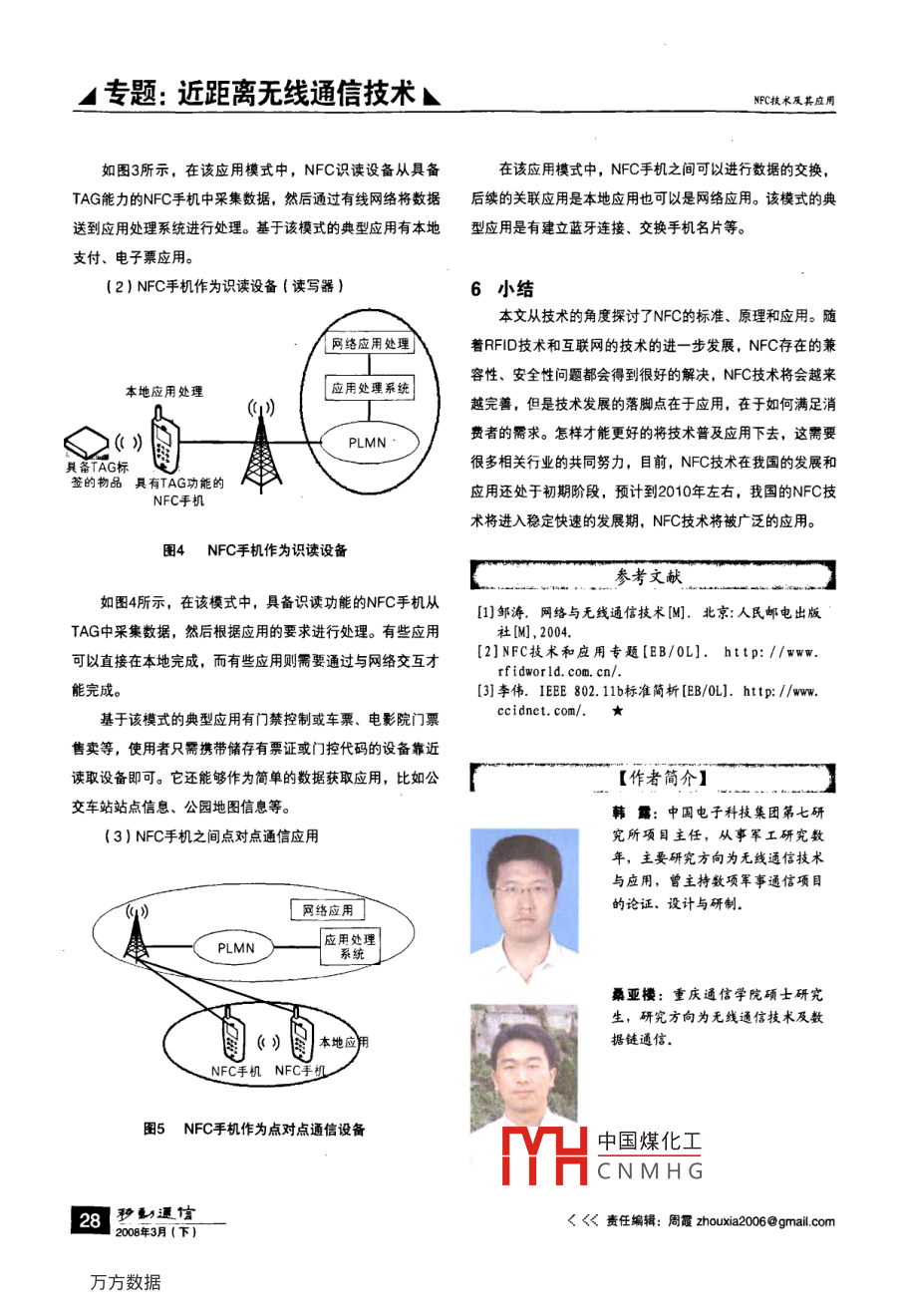 A專題:近距離無線通信技術(shù)NFc技術(shù)及其應(yīng)用韓露中國電子科技集團(tuán)第七研究所桑亞檯重慶通信學(xué)院【摘要】文章介紹了NFC技術(shù)標(biāo)準(zhǔn),探討了NFC技術(shù)的原理,論述了其技術(shù)特點(diǎn),并對(duì)此技術(shù)的應(yīng)用模式作了分析?!娟P(guān)鍵詞】NFC技術(shù)標(biāo)準(zhǔn)RF|D1概述兼容的設(shè)備彼此距離為十幾厘米遠(yuǎn)時(shí),它們之間就可進(jìn)行通在射頻識(shí)別(RFD)及互聯(lián)互通技術(shù)發(fā)展的推動(dòng)下信為了滿足電子設(shè)備間近距離通信的需求,飛利浦、諾基亞NFC的最初設(shè)想是將RF|D技術(shù)和互聯(lián)網(wǎng)絡(luò)技術(shù)進(jìn)行簡索尼等著名廠商聯(lián)合推出了的一項(xiàng)新的無線通信技術(shù)單的合并,隨著這兩項(xiàng)技術(shù)的發(fā)展和用戶對(duì)此技術(shù)能力需求NFC,即近場通信技術(shù)。的增加,目前已經(jīng)演變成一種具有相應(yīng)標(biāo)準(zhǔn)的近距離無線通NFC是一種基于標(biāo)準(zhǔn)的近距離無線連接技術(shù),能夠在信技術(shù)。多個(gè)電子設(shè)備之間實(shí)現(xiàn)簡單而安全的雙向交互,當(dāng)兩臺(tái) NFC NFC的短距離交互大大簡化了整個(gè)認(rèn)證識(shí)別過程,使電子設(shè)備間互相訪問更直接、更安全和更清楚。通過NFC,電收稿日期:2008年1月11日腦、數(shù)碼相機(jī)、手機(jī)、PDA等多個(gè)設(shè)備之間可以很方便快捷參考文獻(xiàn)【作者簡介】[1]方波,李楠,高鵬.RFID技術(shù)現(xiàn)狀及其在移動(dòng)通信中方詖:工學(xué)博士,畢業(yè)于北京郵的應(yīng)用[C].2006年度無線及移動(dòng)通信委員會(huì)學(xué)術(shù)年電大學(xué),北京通信信息協(xié)會(huì)高級(jí)會(huì)會(huì)論文集員。現(xiàn)就職于中國移動(dòng)通信集團(tuán)設(shè)[2]方波,李劼。移動(dòng)增值業(yè)務(wù)現(xiàn)狀及發(fā)展趨勢[冂].移動(dòng)通信,2007(6)計(jì)院有限公司,主要從事無線通3]李劼,宋俊德.國內(nèi)移動(dòng)終端產(chǎn)業(yè)面臨的機(jī)遇[J信、移動(dòng)增值業(yè)務(wù)相關(guān)技術(shù)研究移動(dòng)通信,2006(4)曾作為主要技術(shù)方案設(shè)計(jì)者參與了4] Klaus Finkenzeller[德].射頻識(shí)別技術(shù)].電子基于RFID技術(shù)的電信增值業(yè)務(wù)系工業(yè)出版社,2002統(tǒng)研發(fā)”等項(xiàng)目并獲獎(jiǎng)5]射頻識(shí)別(RFID)技術(shù)研究[R].CCSA研究報(bào)告,SR04-2005[6]信息產(chǎn)業(yè)部無[2007]205號(hào),關(guān)于發(fā)布800/900MHz頻段射頻識(shí)別(RFID)技術(shù)應(yīng)用試行規(guī)定的通知[S中國煤化工2007.★CNMHG責(zé)任編輯:周霞zhouxia2006@gmail.com》>秒甄還信2008年3月(下)A專題:近距離無線通信技術(shù)NPC技術(shù)及其應(yīng)用地進(jìn)行無線連接,進(jìn)而實(shí)現(xiàn)數(shù)據(jù)交換和服務(wù);將NFC芯片裝特?cái)?shù)應(yīng)該是8的倍數(shù)。在手機(jī)上,可以實(shí)現(xiàn)小額電子支付和讀取其它NFC設(shè)備或標(biāo)為了防止干擾正在工作的其它NFC設(shè)備(包括工作在此簽的信息頻段的其它電子設(shè)備),NFC標(biāo)準(zhǔn)規(guī)定任何NFC設(shè)備在呼叫前都要進(jìn)行系統(tǒng)初始化以檢測周圍的射頻場。當(dāng)周圍NFC頻2技術(shù)標(biāo)準(zhǔn)段的射頻場小于規(guī)定的門限值(01875Am)時(shí),該NFC設(shè)隨著短距離無線數(shù)據(jù)業(yè)務(wù)迅速膨脹,NFC于2004年4備才能呼叫。如果在NFC射頻場范圍內(nèi)有兩臺(tái)以上NFC設(shè)備被批準(zhǔn)為國際標(biāo)準(zhǔn)。NFC技術(shù)符合ECMA340與 ETSI TS同時(shí)開機(jī)的話,需要采用單用戶檢測來保證NFC設(shè)備點(diǎn)對(duì)點(diǎn)102190V1.11以及 SO/EC18092標(biāo)準(zhǔn)。這些標(biāo)準(zhǔn)詳細(xì)規(guī)通信的正常進(jìn)行,單用戶識(shí)別主要是通過檢測NFC設(shè)備識(shí)別定了物理層和數(shù)據(jù)鏈路層的組成,具體包括NFC設(shè)備的工作碼或信號(hào)時(shí)隙完成的模式、傳輸速度、調(diào)制方案、編碼等,以及主動(dòng)與被動(dòng)NFC模式初始化過程中,數(shù)據(jù)沖突控制機(jī)制所需的初始化方案和3工作原理?xiàng)l件。此外,這些標(biāo)準(zhǔn)還定義了傳輸協(xié)議,其中包括協(xié)議啟NFC工作模式存在兩種:主動(dòng)模式和被動(dòng)模式,其工作動(dòng)和數(shù)據(jù)交換方法等。原理是有所區(qū)別的。在主動(dòng)模式下,每臺(tái)設(shè)備要向另一臺(tái)設(shè)備標(biāo)準(zhǔn)規(guī)定NFC技術(shù)支持三種不同的應(yīng)用模式:(1)卡發(fā)送數(shù)據(jù)時(shí),都必須產(chǎn)生自己的射頻場。如圖1所示,發(fā)起設(shè)模式(如同F(xiàn)eCa和sO14443 AMIFARE卡的通信);(2)備和目標(biāo)設(shè)備都要產(chǎn)生自己的射頻場,以便進(jìn)行通信。這是對(duì)讀寫模式(對(duì)FeCa或|SO14443A卡的讀寫);(3)NFC等網(wǎng)絡(luò)通信的標(biāo)準(zhǔn)模式,可以獲得非??焖俚倪B接設(shè)置。模式(NFC芯片間的通信)。度可以選擇102減c在連C后電產(chǎn)生發(fā)并的標(biāo)備一主設(shè)音標(biāo)準(zhǔn)規(guī)定了NFC的工作頻率是1356MHh,數(shù)據(jù)傳輸速主設(shè)“發(fā)若-初始命令一日標(biāo)為數(shù)字處理還可切換其它高速通信方式。傳輸速度取決于工作距離,作距離最遠(yuǎn)可為20厘米,在大多數(shù)應(yīng)用中,實(