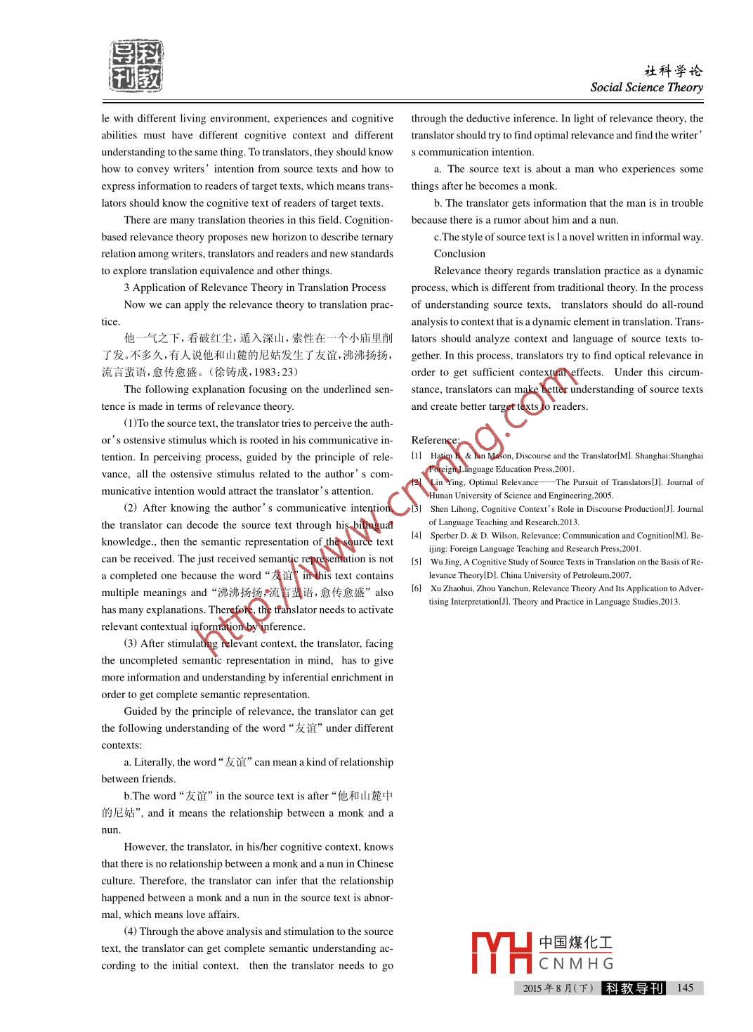 社科學(xué)論Social Science TheoryA Study on Translation ProcessBased on Relevance Theory吳競(jìng)(Harbin University of Commerce, Haerbin, Heilongjiang 150028)Abstract Relevance theory belongs to the field of pragmatics. Translation is a kind of communicative activity in nature. Inthe frame of relevance theory, translation is the process of cognition and inference. This paper focuses on the study of trans-lation process on the basis of relevance theory in order to improve the practice of translation.Key words relevance theory; inference; optimal relevance中圖分類號(hào):H315.9文獻(xiàn)標(biāo)識(shí)碼:ADOI:10.16400/j.cnki.kjdkx.2015.08.069Introductiontexts. According to relevance theory, context of source texts isTranslation is a kind of transcultural and translingual activ-very important if translators want to interpret source texts exactly.ity of communication essentially. Based on relevance theory,Translators need to find optimal relevance of context by analysistranslation can be seen as an ostensive-inferential process. Trans-of context in order to get cognitive effects of source texts. Contextlators should know the intention of communicators and expecta-in relevance theory refers to cognitive context in which com-The quality of target texts relies on convergence of relevant ele-cessful communication relies on assumptions that speakers wantments between source texts and target texts.to convey and that hearers select from cognitive context. Transla-1 Introduction of Relevance Theorytion is an inferential process which includes communicative in-Sperber & Wilson first introduced relevance theory in Rele-tention from communicators' ostensiveness. Relevance theoryvance: Communication and Cognition in 2001. This theory rese-proposes lingual communication is mutual manifestness fromarches inferential process of information communication, espe-cognition to inference.cially discourse interpretation principle in exploring lingual com-The second step is to find relevance, which depends on themunication.information that translators possess and source texts offer. As we1.1 Ostensiveness and Inferenceknow, the degree of relevance is related to inferential efforts andRelevance theory takes lingual ccognitive effects. Everyone has a potential context in their brainsive-inferential cognitive activity, a process in which communi- where lots of information is stored. Translators should try to ma-cators recognize cognitive context again and do mutual manifes-tch intention from writers of source texts with expectation of re-tness. Ostensiveness from writers of source texts can offer someaders of target textsrelevant information and cognitive context that translators can in-Optimal relevance in translation process is a dynamic con-fer. Translators can find optimal relevance and infer communicat-cept. Translators should find the assumptions that writers of sou-ive intention from cognitive context of writer' s ostensive stimu- rce texts convey to readers of source texts. In this process, trans-lation. In different cognitive contexts, the understanding of thelators should infer from the source texts. At the same time, trans-same source text is different. Because different translators have lators should know the cognitive context of readers from targetdifferent cognitive contexts and structures, implicit conclusionstexts, that is, whether contextual assumption that writers of sou-can reach from the discourse interpretation.rce texts want to convey exists in the potential context of readers1.2 Optimal Relevanceof target texts. Context formed in source texts cannot be changed,According to relevance theory, successful communicationand meanings in that context is fixed in source texts. Therefore,needs two conditions: one is mutual manifestness from two-sidetranslators cannot add new understanding to meanings in sourcecommunicators, the other is optimal cognitive mode- relevance.texts randomly. In translation, writers of source texts have differ-Relevance is a relative concept, which depends on cognitive ef-fect and degree of inference. Here is a formula: degree of rele-rce texts is unequal to that from target texts. Moreover, informa-vance= cognitive effect/ inferential efforts.tion from target texts is based on the understanding of readers2 Translation Process on the Basis of Relevance Theorywhen they read target texts. In translation, writers of source texts,Translation is seen as a communicative activity in terms of translators and中國(guó)煤化Ieractive with eachrelevance theory. In translation, the first step is to interpret sourceother, formingMYHCNMHGance theory, peop-144 科教導(dǎo)刊 2015年8月(下)社科學(xué)論:Social Science Theoryle with different living environment, experiences and cognitive through the deductive inference. In light of relevance theory, theabilities must have different cognitive context and different translator should try to find optimal relevance and find the writer'understanding to the same thing. To translators, they should know s communication intention.how to convey writers' intention from source texts and how to .express information to readers of target texts, which means trans- things after he becomes a monk.lators should know the cognitive text of readers of target texts.b. The translator gets information that the man is in troubleThere are many translation theories in this field. Cognition- because there is a rumor about him and a nun.based relevance theory proposes new horizon to describe ternaryc.The style of source text is la novel written in informal way.relation among writers, translators and readers and new standardsConclusionto explore translation equivalence and other things.Relevance theory regards translation practice as a dynamic3 Application of Relevance Theory in Translation Processprocess, which is different from traditional theory. In the processNow we can apply the relevance theory to translation prac- of understanding 