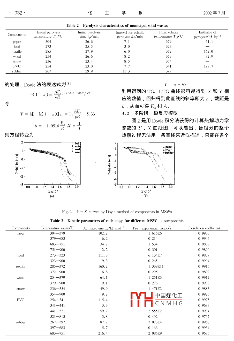 第53卷第7期化工報(bào)Vol 53 No72002年7月Chemical Industry and Engineering China)July 2002CCCCCCC二研究簡報(bào)8城市生活垃圾熱解特性的TG-DSC分析李季張錚楊學(xué)民姚建中林偉剛中國科學(xué)院過程工程研究所多相反應(yīng)開放研究實(shí)驗(yàn)室,北京100080)關(guān)鍵詞城市生活垃圾熱重分析差示掃描量熱分析熱解特性動力學(xué)參數(shù)中圖分類號Ⅹ705文獻(xiàn)標(biāo)識碼文章編號0438-1157(2002)07-0759-0TG-DSC STUDY ON PYROLYSIS CHARACTERISTICSOF MUNICIPAL SOLID WASTESLI Ji, ZHANG Zheng, YANG Xuemin, YAO Jianzhong and Lin WeigangMulti-phase Reaction Laboratory, Institute of Process Engineering, Chinese Academy of Sciences, Beijing 100080, ChinaAbstract Seven typical componentssolid wastes( MSWs )paper, food, textiletraw plastic and rubber were chosen as the thermogravimetric analysis samples in this paper to study thepyrolysis characteristics. By the thermogravimetry and differential scanning calorimetry( Tg-DSC analysispyrolysis characteristics of Msws components and pyrolysis endothermal enthalpy were obtained. The kineticof pyrolysis were determined with the doyle method and a multi-stage first order pyrolysis modelsed. The simulated results by this model showed good agreement with the tg experimental data. THpyrolysis characteristics provide significant parameters to a new concept of circulating fluidized bed incineratorwhich can simultaneously restrain the high-temperature HCl corrosion and emission of dioxinsKeywords MSWs, thermogravimetry differential scanning calorimetry pyrolysis characteristics, kineticrameters圾揮發(fā)分含量高,熱解過程對整個(gè)垃圾焚燒過程有重要影響,國內(nèi)外學(xué)者也對不同城市垃圾的熱解特城市生活垃圾旳焚燒處理可實(shí)現(xiàn)垃圾的減量性做了相關(guān)研究-5.由于城市生活垃圾的組分多化、無害化和資源化,目前國外正大力普及這項(xiàng)技且復(fù)雜,熱解特性差別較大,因此本文重點(diǎn)針對術(shù),以獲取其中的能量用于供熱或發(fā)電.2000年種典型的可燃垃圾組分進(jìn)行了TG-DSC分析,目日本垃圾發(fā)電裝機(jī)容量已達(dá)到2000MW,并計(jì)劃的在于研究城市生活垃圾的熱解特性,獲得垃圾熱在2010年達(dá)到4000MW,2002年前在每個(gè)百萬人解的反應(yīng)動力學(xué)參數(shù)口以上的大中型城市建2~3座現(xiàn)代化垃圾發(fā)電廠裝機(jī)容量不低于30MW.目前我國也積極進(jìn)行垃圾1熱分析方法焚燒技術(shù)和焚燒設(shè)備的研究和研制.北京市朝陽區(qū)1.1實(shí)驗(yàn)儀器日處理量為1300t生活垃圾的綠色環(huán)保電站即將開中國煤化工IRAM公司的LAB工,預(yù)計(jì)并網(wǎng)后年發(fā)電量可達(dá)1.36×108kWh.SYSCNMHG行熱重-差熱(TG垃圾焚燒可分為熱解和燃燒兩個(gè)階段,由于垃DTA)和熱重左式刊描量烈TG-DSC分析2001-04-16收到初稿,2001-12-20收到修改稿Received date: 2001-04-16聯(lián)系人:林偉剛.第一作者:李季,男,28歲,博士Corresponding author: LIN Weigang, E- mail: wolin( home760化工學(xué)2002年7月12實(shí)驗(yàn)物料氣體.溫度超過250℃后,開始大量析出揮發(fā)分城市生活垃圾中的可燃組分主要可分為紙、廚主要是各類飽和烴和不飽和烴以及CO和CO,等氣余、纖維、木竹、塑料、橡膠類.本文針對這幾類體,此時(shí)的TG曲線有一個(gè)明顯的失重階段.揮發(fā)垃圾選取了紙、廚余、布料、木屑、秸稈、塑料、分在400℃左右基本析出完全,殘余的半焦在此溫橡膠這7種典型的垃圾組分進(jìn)行熱分析實(shí)驗(yàn).表1度下也開始分解,產(chǎn)生部分焦油和氣體,紙、塑料給出了各種垃圾組分的工業(yè)分析數(shù)據(jù)和橡膠的熱解過程則明顯不同:在250~450℃溫Table 1 Proximate analysis of experimental度區(qū)間揮發(fā)分大量析出;溫度繼續(xù)升高,組分中較samples( dry basis , %穩(wěn)定的聚合物開始裂解,經(jīng)歷了另一個(gè)明顯的失重ComponentsAsIFixed carbo階段.DSC曲線則顯示了各組分在整個(gè)熱解過程12.702.94中的吸、放熱過程,可以看出,布料、木屑等只有0.04個(gè)吸熱峰,紙、塑料等有兩個(gè)失重階段的組分相應(yīng)地有兩個(gè)吸熱峰.而DSC曲線吸熱峰的位置和wood0.2712.28straw82,45DTG曲線中峰的位置相吻合,表明垃圾組分在大83.7312.77量析出揮發(fā)分和聚合物裂解的過程要吸收部分32.92熱量熱解過程中揮發(fā)分的大量析出階段是整個(gè)熱解1.3實(shí)驗(yàn)條件過程中的一個(gè)重要階段.對于本實(shí)驗(yàn)中的組分,此選取的垃圾組分在N2氣氛下進(jìn)行了TG階段是熱解過程中活化能E最高的階段,并且此( thermogravimetry)和DC( differential scanning階段的失重量都較大,廚余、布料、木屑、秸稈、calorimetry)分析.反應(yīng)容器為№lO3坩堝;載氣為紙、塑料橡膠此段的失重量分別占總失重量的純度99.99%的N2,其流量為35 mf min1;升51%、74%、68%、60%、66%、64%、68%溫速率(g)為10Kmin-1;試樣主要為粉未狀表2給出了城市生活垃圾典型組分熱解的特征(0.28-0.45mm),其中紙和布料為薄片狀最大參數(shù).在g=10Kmin-的條件下(根據(jù)g的不同直徑不超過1mm);試樣的質(zhì)量為9.5-11.0mg,熱解特征參數(shù)會有所變化7),熱解起始溫度秸稈保證反應(yīng)過程中試樣的溫度均勻61;試樣在實(shí)驗(yàn)最低,紙最高,分別為236℃和304℃;揮發(fā)分析前放入105℃的恒溫爐中干燥1h出的持續(xù)時(shí)間廚余最短,橡膠最長,分別為3min2垃圾熱解特性和11min.而揮發(fā)分全部析出的溫度基本在400℃之內(nèi).同時(shí)表2也給出由D