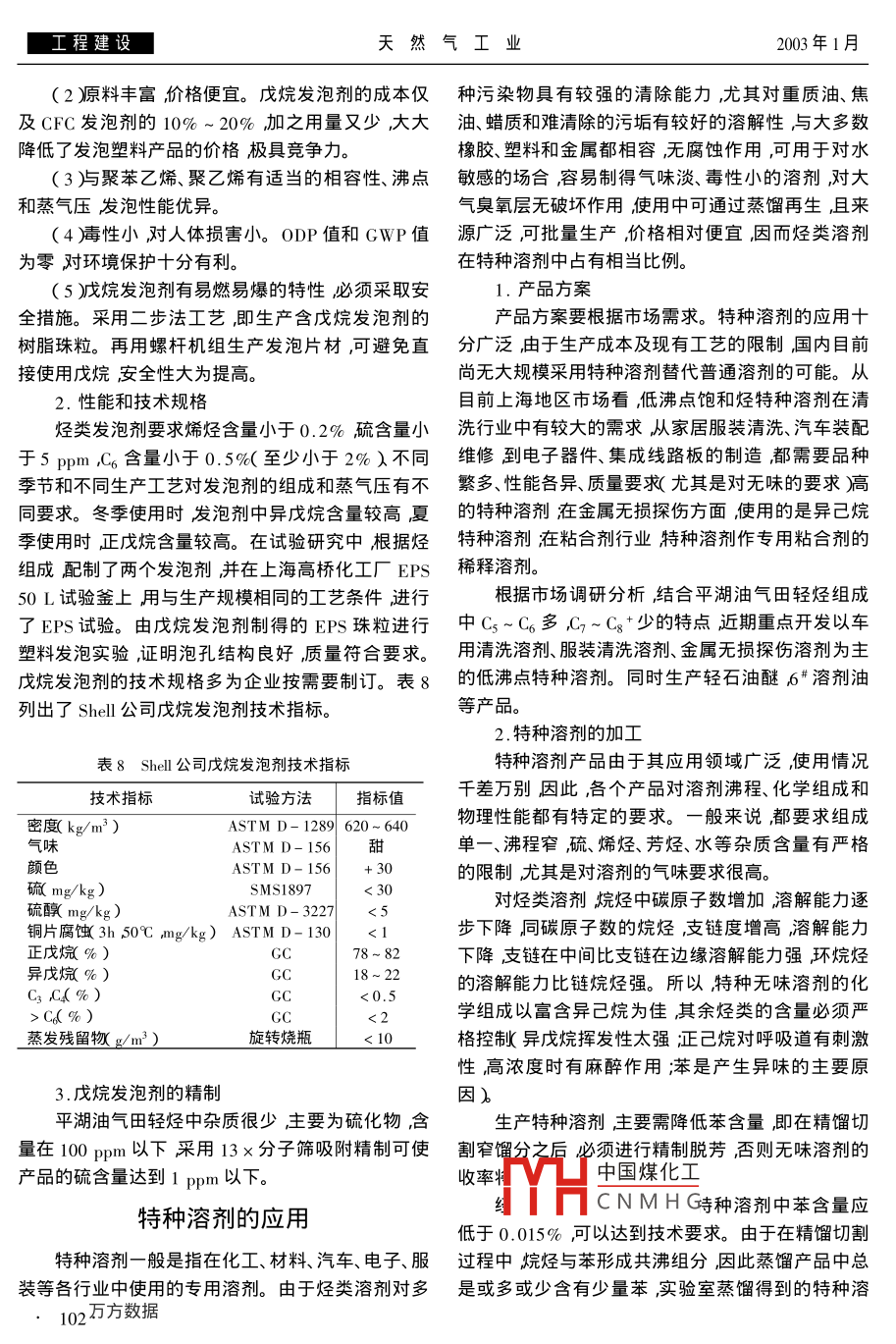 工程建設(shè)天然氣工業(yè)2003年1月天然氣凝液的綜合利用郭揆常(上海石油天然氣總公司)郭揆常.天然氣凝液的綜合利用.天然氣工業(yè)200323(1)98~103摘要天然氣是以甲烷為主的烴類氣體混合物。其組成中除甲烷外常含有不同數(shù)量的C2~Cs等低碳烷烴以及二氧化碳、氮氣、硫化物等非烴類。天然氣既可作為清潔能源又可作為優(yōu)質(zhì)化工原料。為了提高資源綜合利用程度提高經(jīng)濟效益除重視甲烷旳合理利用外積極拓展天然氣中其他低碳烷烴的綜合利用不僅可增加企業(yè)經(jīng)濟效益而且還會產(chǎn)生顯著的社會效益。平湖油氣田是我國東海第一個正式投入開發(fā)的油氣田,為了綜合利用從其天然氣中回收的凝液對該凝液的組成特性、利用方案、產(chǎn)品開發(fā)等進行了課題研究并調(diào)查了上海地區(qū)市場需求進而制定燃料一溶劑型的利用方案:以生產(chǎn)環(huán)保型氣霧劑推進劑、塑料發(fā)泡劑以及特種溶劑等為主取得了初步成果。主題詞天然氣低碳烷烴綜合利用平湖氣田凝液是從天然氣或油田伴生氣沖回收的除甲綜合利用烷以外的低碳烷烴。從資源綜合利用角度講,凝液綜合利用是天然氣利用的一部分。由于低碳烷烴具平湖油氣田凝液的組成有良好的環(huán)境特性其衍生產(chǎn)品的應(yīng)用對保護臭氧天然氣中除甲烷外的低碳烷烴的含量隨氣藏成層、減少溫室效應(yīng)效果顯著,因此凝液的綜合利用因的不同而不同。一般來說凝析氣和油田伴生氣不僅能提高經(jīng)濟效益而且還可以產(chǎn)生顯著的社會中C3+的含量比較高因而其利用價值更大。平湖效益。因此從天然氣生產(chǎn)開始就應(yīng)同步實施輕烴油氣田是凝析氣藏其天然氣的組成見表1。表1平湖油氣田天然氣組分表組分H2OCO2N2C2摩爾分?jǐn)?shù)0.0733.8690.65581.37.4874.0731.0150.82570.2920.8920.19910.0892由表1可見平湖油氣田天然氣中,、丁烷含0.l%以上。液化氣LPG戊烷和穩(wěn)定輕烴的組成量為6%左右戊烷含量為0.5%左右,C6+含量在分別見表2~5。0.1%~0.2%。該油氣田陸上天然氣處理廠采用了穩(wěn)定輕烴的組成一般隨脫戊烷塔的操作情況而膨脹外加丙烷制冷的冷凝回收工藝投產(chǎn)3年來先變化。其中,C餾分含量很少小于1%:餾分含后經(jīng)過了三分之一負(fù)荷到滿負(fù)荷的生產(chǎn)運行穩(wěn)定。量小于20%已烷、庚烷、辛烷及其以上烷烴含量分該廠產(chǎn)品除了甲、乙烷作銷售氣輸入城市管網(wǎng)外尚有用作車用和民用燃料的丙、丁烷混合氣戊烷和穩(wěn)表2LPG組成摩爾分?jǐn)?shù)定輕好。對于這些產(chǎn)品的利用,首先是要確定其產(chǎn)組分CCmm量和組成。為此曾對投產(chǎn)兩年來天然氣中的輕烴樣品101159.712.9117.670.570.03進行分析進一步明確了C6+輕烴含量在0.1%左樣品Ⅱ0.1155642.9218.013.020.30右且隨季節(jié)變化,上半年在0.1%以下,下半年在中國煤化工作者簡介郭揆常1942年生教授級高級工程師;964年畢業(yè)于原CNMH小,攻力于石油天然氣工程設(shè)計與建設(shè)從1992年至今從事海上油氣田開發(fā)建設(shè)工作擔(dān)任平湖油氣田的技術(shù)負(fù)責(zé)人發(fā)表論文30多篇擔(dān)任本刊第五屆編委會委員。地址(200041)海市江寧路336號。電話(021)2555078第23卷第1期天然氣工業(yè)工程建設(shè)表3戊烷組成摩爾分?jǐn)?shù)組分icnC4 iCs nC22-二甲基丁烷C環(huán)戊烷nC。3-甲基戊烷甲基環(huán)戊烷樣品I0.113.2762.8331.890.25樣品Ⅱ0.662.648235.940.90注+中包含23-二甲基丁烷+2-甲基戊烷表4穩(wěn)定輕烴組成摩爾分?jǐn)?shù)組分200年1月2000年3月2000年5月2007月2000年9月2000年11月8.94418.487.38CGC41.955955.5229.4424.7815.148.366.576.5745.515甲苯4.6835.334注表中數(shù)值為當(dāng)月平均值年月表示取樣日期。表5穩(wěn)定輕烴單體烴組成摩爾分?jǐn)?shù)組分1999年10月1999年11月2000年9月11日2000年9月27日2001年4月16日異丁烷正丁烷0.03異戊烷1.690.742.471.9正戊烷3.995.794.8122-二甲基丁烷0.54C烷烴)+環(huán)戊烷17.9415.303-甲基戊烷6.756.785.885.778.1122-二甲基戊烷0.58甲基環(huán)戊烷9,04l1.198.9510.30.570.770.580.13223-三甲基丁烷苯2.494.155.81C烷烴2)+環(huán)己烷19.9920.48ll.12王庚烷甲基環(huán)己烷10.607.38乙基環(huán)戊烷0.40.471.330.830.69甲苯5.876.794.31注年月日表示取樣日期庖含23-二甲基丁烷+2-甲基戊烷衛(wèi)庖含3、3-二甲基戊烷+2-甲基己烷ρ、4-二甲基戊烷、1二甲基環(huán)戊烷♂-甲基己烷μ、順3-二甲基環(huán)戊烷l、反3-二甲基環(huán)戊烷,l、反2-二甲基環(huán)戊烷3-乙基戊烷別為40%~60%,25%~35%和5%~20%,苯、甲利用有了較好的基礎(chǔ)。輕烴的進一步加工方案按產(chǎn)苯和總芳烴含量分別為2%~6%3%~7%和6%品類型可以分為燃料型、燃料一溶劑型和化工合成11%。穩(wěn)定輕烴組成的波動較大其原因除了處理廠的原料氣組成變化引起外,與脫戊烷塔操作不燃料型是國內(nèi)輕烴回收裝置初期較多采用的平穩(wěn)也有關(guān)。單體烴分析結(jié)果顯示穩(wěn)定輕烴中豐度品方從天氣或原油伴生氣沖回收的凝最高的是異己烷組分可達(dá)20%~30%。液再中國煤化工LPG銷售為民用或凝液綜合利用方案車用CNMHG天然汽油)作調(diào)和汽油。由于這種辛烷值較低的烴餾分不易調(diào)和成90天然氣處理廠對輕烴已進行了初加工形成了號汽油因而單一的燃料型利用近年來逐漸向燃料液化石油氣、戊烷和穩(wěn)定輕烴等產(c