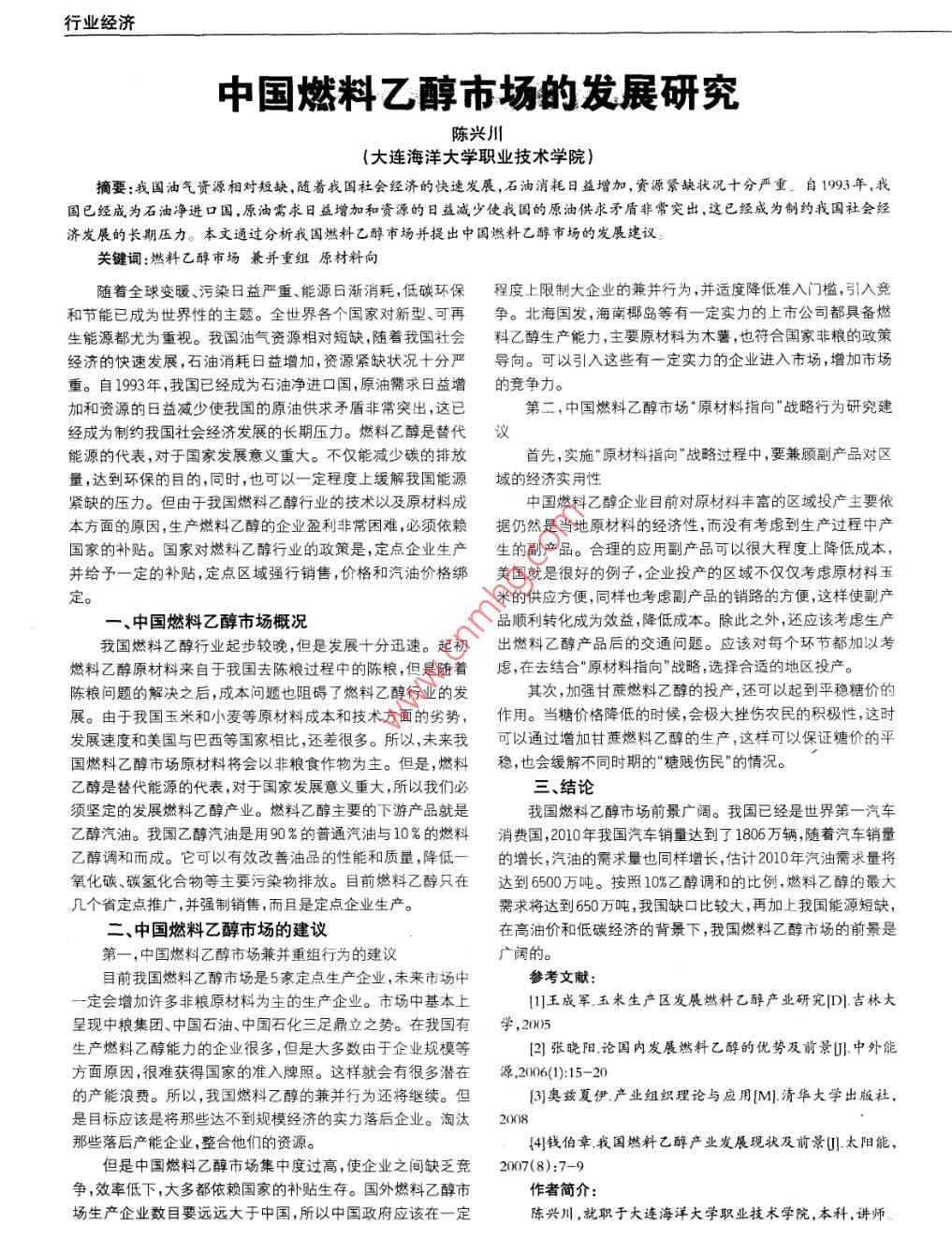 行業(yè)經(jīng)濟(jì)中國(guó)燃料乙醇市場(chǎng)的發(fā)展研究陳興川(大連海洋大學(xué)職業(yè)技術(shù)學(xué)院)摘要:我國(guó)油氣資源相對(duì)短缺,隨著我國(guó)社會(huì)經(jīng)濟(jì)的快速發(fā)展,石油消耗日益增加,資源緊缺狀況十分嚴(yán)重。自1993年,我國(guó)已經(jīng)成為石油凈進(jìn)口國(guó),原油需求日益增加和資源的日益減少使我國(guó)的原油供求矛盾非常突出,這已經(jīng)成為制約我國(guó)社會(huì)經(jīng)濟(jì)發(fā)展的長(zhǎng)期壓力。本文通過分析我國(guó)燃料乙醇市場(chǎng)并提出中國(guó)燃料乙醇市場(chǎng)的發(fā)展建議關(guān)鍵詞:燃料乙醇市場(chǎng)兼并重組原材料向隨著全球變暖污染日益嚴(yán)重能源日漸消耗低碳環(huán)保程度上限制大企業(yè)的兼并行為,并適度降低準(zhǔn)入門檻,引入競(jìng)和節(jié)能已成為世界性的主題。全世界各個(gè)國(guó)家對(duì)新型、可再爭(zhēng)。北海國(guó)發(fā),海南椰島等有一定實(shí)力的上市公司都具備燃生能源都尤為重視。我國(guó)油氣資源相對(duì)短缺,隨著我國(guó)社會(huì)料乙醇生產(chǎn)能力,主要原材料為木薯,也符合國(guó)家非糧的政策經(jīng)濟(jì)的快速發(fā)展,石油消耗日益增加,資源緊缺狀況十分嚴(yán)導(dǎo)向??梢砸脒@些有一定實(shí)力的企業(yè)進(jìn)入市場(chǎng),增加市場(chǎng)重。自1993年,我國(guó)已經(jīng)成為石油凈進(jìn)口國(guó),原油需求日益增的競(jìng)爭(zhēng)力加和資源的日益減少使我國(guó)的原油供求矛盾非常突出,這已第二,中國(guó)燃料乙醇市場(chǎng)原材料指向戰(zhàn)略行為研究建經(jīng)成為制約我國(guó)社會(huì)經(jīng)濟(jì)發(fā)展的長(zhǎng)期壓力燃料乙醇是替代議能源的代表,對(duì)于國(guó)家發(fā)展意義重大。不僅能減少碳的排放首先,實(shí)施“原材料指向戰(zhàn)略過程中,要兼顧副產(chǎn)品對(duì)區(qū)量,達(dá)到環(huán)保的目的,同時(shí),也可以一定程度上緩解我國(guó)能源域的經(jīng)濟(jì)實(shí)用性緊缺的壓力。但由于我國(guó)燃料乙醇行業(yè)的技術(shù)以及原材料成中國(guó)燃料乙醇企業(yè)目前對(duì)原材料豐富的區(qū)域投產(chǎn)主要依本方面的原因,生產(chǎn)燃料乙醇的企業(yè)盈利非常困難,必須依賴據(jù)仍然是當(dāng)?shù)卦牧系慕?jīng)濟(jì)性,而沒有考慮到生產(chǎn)過程中產(chǎn)國(guó)家的補(bǔ)貼。國(guó)家對(duì)燃料乙醇行業(yè)的政策是,定點(diǎn)企業(yè)生產(chǎn)生的副產(chǎn)品。合理的應(yīng)用副產(chǎn)品可以很大程度上降低成本,并給予一定的補(bǔ)貼,定點(diǎn)區(qū)域強(qiáng)行銷售,價(jià)格和汽油價(jià)格綁美國(guó)就是很好的例子,業(yè)投產(chǎn)的區(qū)域不僅僅考慮原材料玉定。米的供應(yīng)方便,同樣也考慮副產(chǎn)品的銷路的方便,這樣使副產(chǎn)一、中國(guó)燃料乙醇市場(chǎng)概況品順利轉(zhuǎn)化成為效益,降低成本。除此之外,還應(yīng)該考慮生產(chǎn)我國(guó)燃料乙醇行業(yè)起步較晚,但是發(fā)展十分迅速。起初出燃料乙醇產(chǎn)品后的交通問題。應(yīng)該對(duì)每個(gè)環(huán)節(jié)都加以考燃料乙醇原材料來自于我國(guó)去陳糧過程中的陳糧,但是隨著慮,在去結(jié)合原材料指向戰(zhàn)略,選擇合適的地區(qū)投產(chǎn)。陳糧問題的解決之后,成本問題也阻礙了燃料乙醇行業(yè)的發(fā)其次,加強(qiáng)甘蔗燃料乙醇的投產(chǎn),還可以起到平穩(wěn)糖價(jià)的展。由于我國(guó)玉米和小麥等原材料成本和技術(shù)方面的劣勢(shì),作用。當(dāng)糖價(jià)格降低的時(shí)候,會(huì)極大挫傷農(nóng)民的積極性,這時(shí)發(fā)展速度和美國(guó)與巴西等國(guó)家相比,還差很多。所以,未來我可以通過增加甘蔗燃料乙醇的生產(chǎn),這樣可以保證糖價(jià)的平國(guó)燃料乙醇市場(chǎng)原材料將會(huì)以非糧食作物為主但是,燃料穩(wěn),也會(huì)緩解不同時(shí)期的“糖賤傷民的情況。乙醇是替代能源的代表,對(duì)于國(guó)家發(fā)展意義重大,所以我們必三、結(jié)論須堅(jiān)定的發(fā)展燃料乙醇產(chǎn)業(yè)。燃料乙醇主要的下游產(chǎn)品就是我國(guó)燃料乙醇市場(chǎng)前景廣闊。我國(guó)已經(jīng)是世界第一汽車乙醇汽油。我國(guó)乙醇汽油是用90%的普通汽油與10%的燃料消費(fèi)國(guó),2010年我國(guó)汽車銷量達(dá)到了1806萬輛,隨著汽車銷量乙醇調(diào)和而成。它可以有效改善油品的性能和質(zhì)量,降低一的增長(zhǎng),汽油的需求量也同樣增長(zhǎng)估計(jì)2010年汽油需求量將氧化碳、碳?xì)浠衔锏戎饕廴疚锱欧?。目前燃料乙醇只在達(dá)到6500萬噸。按照1%乙醇調(diào)和的比例,燃料乙醇的最大幾個(gè)省定點(diǎn)推廣,并強(qiáng)制銷售,而且是定點(diǎn)企業(yè)生產(chǎn)。需求將達(dá)到650萬噸,我國(guó)缺口比較大,再加上我國(guó)能源短缺,中國(guó)燃料乙醇市場(chǎng)的建議在高油價(jià)和低碳經(jīng)濟(jì)的背景下,我國(guó)燃料乙醇市場(chǎng)的前景是第一,中國(guó)燃料乙醇市場(chǎng)兼并重組行為的建議廣闊的。目前我國(guó)燃料乙醇市場(chǎng)是5家定點(diǎn)生產(chǎn)企業(yè),未來市場(chǎng)中參考文獻(xiàn):一定會(huì)增加許多非糧原材料為主的生產(chǎn)