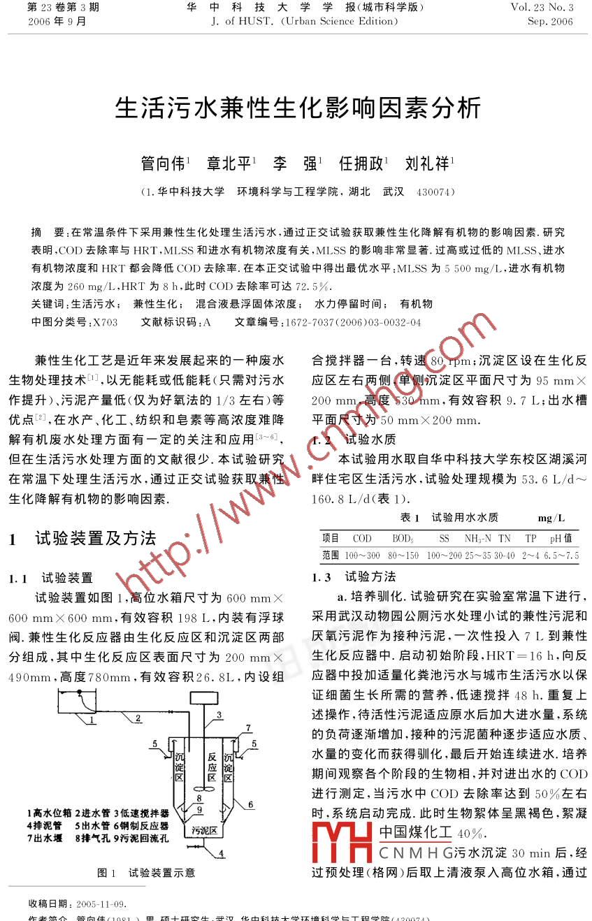 第23卷第3期華中科技大學(xué)學(xué)報(bào)(城市科學(xué)版)Vol. 23 No.32006年9月J. of HUST. (Urban Science Edition)Sep. 2006 .生活污水兼性生化影響因素分析管向偉’章北平1李強(qiáng)’任擁政劉禮祥'(1.華中科技大學(xué)環(huán)境科學(xué)與工程學(xué)院, 湖北武漢430074)摘要:在常溫條件下采用兼性生化處理生活污水,通過正交試驗(yàn)獲取兼性生化降解有機(jī)物的影響因素.研究表明,COD去除率與HRT,MLSS和進(jìn)水有機(jī)物濃度有關(guān),MLSS的影響非常顯著.過高或過低的MLSS、進(jìn)水有機(jī)物濃度和HRT都會降低COD去除率.在本正交試驗(yàn)中得出最優(yōu)水平:MLSS為5500mg/L,進(jìn)水有機(jī)物濃度為260 mg/L.HRT為8 h,此時(shí)COD去除率可達(dá)72. 5%.關(guān)鍵詞:生活污水;兼性生化; 混合液懸浮固體濃度;水力停留時(shí)間, 有機(jī)物中圖分類號:X703文獻(xiàn)標(biāo)識碼:A文章編號:1672-7037 (2006 )03- 0032-04兼性生化工藝是近年來發(fā)展起來的一種廢水合攪拌器一臺,轉(zhuǎn)速80 rpm;沉淀區(qū)設(shè)在生化反生物處理技術(shù)1,以無能耗或低能耗(只需對污水應(yīng)區(qū)左右兩側(cè),單側(cè)沉淀區(qū)平面尺寸為95 mmX作提升)、污泥產(chǎn)量低(僅為好氧法的1/3左右)等200 mm,高度530 mm,有效容積9. 7 L;出水槽優(yōu)點(diǎn)[2],在水產(chǎn)、化工、紡織和皂素等高濃度難降平面尺寸為50mmX200mm.解有機(jī)廢水處理方面有一定的關(guān)注和應(yīng)用[3~0],1.2試驗(yàn)水質(zhì)但在生活污水處理方面的文獻(xiàn)很少.本試驗(yàn)研究本試驗(yàn)用水取自華中科技大學(xué)東校區(qū)湖溪河在常溫下處理生活污水,通過正交試驗(yàn)獲取兼性畔住宅區(qū)生活污水,試驗(yàn)處理規(guī)模為53.6 L/d~生化降解有機(jī)物的影響因素.160.8 L/d(表1).表1試驗(yàn)用水水質(zhì)1試驗(yàn)裝置及方法項(xiàng)目CODB0D:NH-N TN TP pH值范圍100~300 80~150 100~200 25~3530-40 2~4 6. 5~7.51.1試驗(yàn)裝置1.3試驗(yàn)方法試驗(yàn)裝置如圖1,高位水箱尺寸為600mmXa.培養(yǎng)馴化.試驗(yàn)研究在實(shí)驗(yàn)室常溫下進(jìn)行,600 mmX 600 mm,有效容積198 L,內(nèi)裝有浮球采用武漢動物園公廁污水處理小試的兼性污泥和閥.兼性生化反應(yīng)器由生化反應(yīng)區(qū)和沉淀區(qū)兩部厭氧污泥作為接種污泥,一次性投入7 L到兼性分組成,其中生化反應(yīng)區(qū)表面尺寸為200 mm x生化反應(yīng)器中.啟動初始階段,HRT=16 h,向反490mm,高度780mm,有效容積26.8L,內(nèi)設(shè)組應(yīng)器中投加適量化糞池污水與城市生活污水以保:證細(xì)菌生長所需的營養(yǎng),低速攪拌48h.重復(fù)上述操作,待活性污泥適應(yīng)原水后加大進(jìn)水量,系統(tǒng)1\2的負(fù)荷逐漸增加,接種的污泥菌種逐步適應(yīng)水質(zhì)、5反水量的變化而獲得馴化,最后開始連續(xù)進(jìn)水.培養(yǎng)設(shè)|期間觀察各個(gè)階段的生物相,并對進(jìn)出水的COD.區(qū)進(jìn)行測定,當(dāng)污水中COD去除率達(dá)到50%左右1高水位箱2進(jìn)水管3低速攪拌器9時(shí),系統(tǒng)啟動完成.此時(shí)生物絮體呈黑褐色,絮凝4排泥管5出水管 6鋼制反應(yīng)器污泥區(qū)中國煤化工40%.7出水堰8排氣孔 9污泥回流孔4YHCNMHG污水沉淀30min后,經(jīng)圖1試驗(yàn)裝置示意過預(yù)處理(格網(wǎng))后取上清液泵入高位水箱,通過收稿日期: 2005-11-09.作者簡介:管向偉(1981-).男.碩士研究生;武漢.華中科技大學(xué)環(huán)境科學(xué)與工程學(xué)院(430074).基金項(xiàng)目:國家“十五”863課題基金資助項(xiàng)目(2003AA601110).第3期管向偉等:生活污水兼性生化影響因素分析●33●計(jì)量設(shè)備投入兼性生化反應(yīng)器中.利用兼性微生表4方差分析物的攝取、代謝與利用,高效去除污水中的COD,方差來源偏差平方和自由度 均方F比顯著性BOD;及ss,其出水經(jīng)過后續(xù)處理達(dá)標(biāo)后排放.由HRT/h330. 309 .165. 155 2. 870相關(guān)的研究叮得知,在常溫下,溫度對兼性生化反MLSS/mg●L-' 683. 709341. 8545. 940應(yīng)的影響較小根據(jù)單因素試驗(yàn)結(jié)果,確定試驗(yàn)以CODx/mg●L-1 132. 596.66. 2981. 152 *115. 096 .反應(yīng)區(qū)的水力停留時(shí)間(HRT)、混合液懸浮固體總和1 261.71濃度(MLSS)和進(jìn)水有機(jī)物濃度(COD,)為因素,進(jìn)行正交試驗(yàn)(表2).試驗(yàn)過程中,HRT通過進(jìn).水流量來控制,進(jìn)水有機(jī)物濃度可以通過投加適84020量葡萄糖或稀釋的方法來調(diào)配,MLSS通過定量gA, A, A,B,B,B, CC2C排泥來控制.試驗(yàn)?zāi)康闹饕窃诔叵驴疾旆磻?yīng)圖2效應(yīng) 曲線器的進(jìn)水有機(jī)物濃度、HRT及污泥濃度對有機(jī)物極差分析可知,本試驗(yàn)中極差Re> Rx> Rc處理效果的影響.當(dāng)反應(yīng)器運(yùn)行穩(wěn)定后,開始記錄> Ro,則各因素對去除率影響作用為B>A>C>實(shí)驗(yàn)數(shù)據(jù),試驗(yàn)期間每天測定進(jìn)出水的指標(biāo).D,即MLSS的影響最大,試驗(yàn)誤差影響最小,進(jìn)表2因素水平水有機(jī)物濃度次之.由圖2可知最佳水平搭配為因素A.B.Cz,即HRT=8 h, MLSS= 5 500 mg/L,HRTMLSSCOD.r水平/H/mg●L-1COD,r= 180 mg/L.ABC進(jìn)行方差分析得知,因Fo.10=3. 110,Fo.os=水平184 0001004.460,Fo.1o HRT>進(jìn)水有機(jī)物濃度,其中物的正常攝取、代謝和利用,-些有機(jī)物不經(jīng)微生MLSS的影響是非常顯著的.b.本試驗(yàn)的最佳水平搭配為HRT為8 h,物代謝就流出反應(yīng)