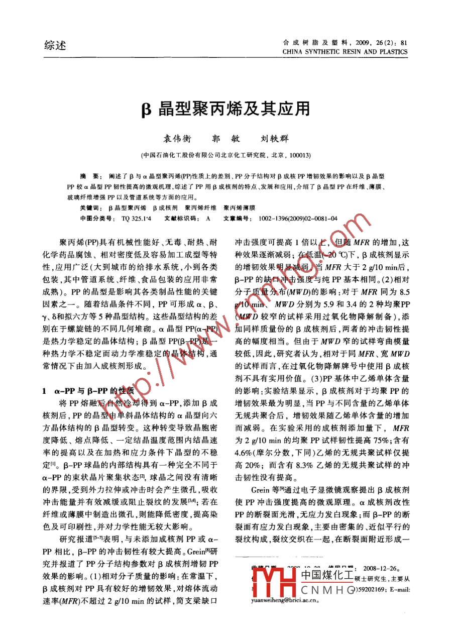 綜述合成樹脂及塑2009,26(2):81CHINA SYNTHETIC RESIN AND PLASTICSβ晶型聚丙烯及其應用袁偉衡郭敏劉軼群(中國石油化τ股份有限公司北京化工研究院,北京,100013)要:闡述了β與α晶型聚丙烯(PP性質(zhì)上的差別、PP分子結(jié)構(gòu)對β成核PP增韌效果的影響以及B晶型α晶型PP韌性提高的微觀機理,綜述了PP用β成核劑的特點、發(fā)展和應用,介紹了β晶型PP在纖維、薄膜玻璃纖維增強PP以及管道系統(tǒng)等方面的應用。關(guān)鍵詞:β品型聚丙烯β成核劑聚丙烯纖維聚丙烯薄膜中圖分類號:TQ325.14文獻標識碼:A文章編號:1002-139602009)02-0081-04聚丙烯(PP具有機械性能好、無毒、耐熱、耐沖擊強度可提高1倍以上,但隨MFR的增加,這化學藥品腐蝕、相對密度低及容易加工成型等特種效果逐漸減弱;在低溫(-20℃下,β成核劑」性,應用廣泛(大到城市的給排水系統(tǒng),小到各類的增韌效果明顯減弱,當MFR大于2g/10min后,包裝,其中管道系統(tǒng)、纖維、食品包裝的應用非常B-PP的缺口沖擊強度與純PP基本相同。(2)相對成熟)。P的晶型是影響其各類制品性能的關(guān)鍵分子質(zhì)量分布(MWD的影響:對于MFR同為85因素之一。隨著結(jié)晶條件不同,PP可形成α、β、g/10min、MWD分別為59和34的2種均聚PPY、δ和擬六方等5種晶型結(jié)構(gòu)。這些晶型結(jié)構(gòu)的差(MWD較窄的試樣采用過氧化物降解制備),添別在于螺旋鏈的不同幾何堆砌。α晶型PPα-PP)加同樣質(zhì)量份的β成核劑后,兩者的沖擊韌性提是熱力學穩(wěn)定的晶體結(jié)構(gòu);β晶型PP(β-PD是一高的幅度相當。但由于MWD窄的試樣彎曲模量種熱力學不穩(wěn)定而動力學準穩(wěn)定的晶體結(jié)構(gòu),通較低,因此,研究者認為,相對于同MFR、寬MWD常情況下由加入成核劑形成。的試樣而言,在過氧化物降解牌號中使用β成核劑不具有實用價值。(3)PP基體中乙烯單體含量a-PP與β-PP的性質(zhì)的影響:實驗結(jié)果顯示,B成核劑對于均聚PP的將PP熔融后自然冷卻得到a-PP,添加B成增韌效果最為明顯,當PP與不同含量的乙烯單體核劑后,PP的晶型由單斜晶體結(jié)構(gòu)的α晶型向六無規(guī)共聚合后,增韌效果隨乙烯單體含量的增加方晶體結(jié)構(gòu)的β晶型轉(zhuǎn)變。這種轉(zhuǎn)變導致晶胞密而減弱。在實驗采用的成核劑添加量下,MFR度降低、熔點降低、一定結(jié)晶溫度范圍內(nèi)結(jié)晶速為2g1Omin的均聚P試樣韌性提高75%;含有率的提高以及在加熱和應力條件下晶型的不穩(wěn)4.6%(摩爾分數(shù),下同)乙烯的無規(guī)共聚試樣僅提定。β-PP球晶的內(nèi)部結(jié)構(gòu)具有一種完全不同于高20%;而含有8.3%乙烯的無規(guī)共聚試樣的沖α-PP的束狀晶片聚集狀態(tài)四,球晶之間沒有清晰擊韌性沒有提高的界限,受到外力拉伸或沖擊時會產(chǎn)生微孔,吸收Grein等咧通過電子顯微鏡觀察提出B成核劑沖擊能量并有效減緩或阻止裂紋的發(fā)展;若在使PP沖擊強度提高的微觀原理。a成核劑改性纖維或薄膜中制造出微孔,則能降低密度,提高染PP的斷裂面光滑,無應力發(fā)白現(xiàn)象;而β-PP的斷色及可印刷性,并對力學性能無較大影響。裂面有應力發(fā)白現(xiàn)象,主要由密集的、近似平行的研究報道表明,與未添加成核劑P或a-裂紋構(gòu)成,裂紋交織在一起,在斷裂面附近形成PP相比,B-PP的沖擊韌性有較大提高。 Grein研究并報道了PP分子結(jié)構(gòu)參數(shù)對β成核劑增韌P:2008-12-26效果的影響。(1)相對分子質(zhì)量的影響:在常溫下成核劑對PP具有較好的增韌效果,對熔體流動H中國煤化工碩士研究生,主要從CNMH速率(MF)不超過2g/10min的試樣,簡支梁缺口合樹及塑料2009年第26卷個連續(xù)的纖維結(jié)構(gòu)。這說明β晶型獨特的束狀聚成功合成出用于PP樹脂的均苯三甲酸衍生物集體在材料受到?jīng)_擊力時可引發(fā)銀紋,吸收大量的類β晶型成核劑。山西省化工研究院研制開發(fā)的沖擊能。同時,由于裂紋之間應力場的相互干擾,β成核劑主要為酰胺類(TMB系列),添加后樹又可阻止裂紋的進一步發(fā)展,提高材料的韌性脂結(jié)晶較快,β晶型轉(zhuǎn)化率高,適用于無規(guī)共聚由于β-PP再次受熱后易轉(zhuǎn)變成α-PP,在實PP熱水管、汽車注塑件等領(lǐng)域,具有沖擊強度高際使用中,β-PP的熱穩(wěn)定性是較為關(guān)注的問題。和熱變形溫度高等特點。秦亞偉等分別使用稀土類和酰胺類成核劑改2.4稀土類β成核劑性PP,經(jīng)過多組實驗得出結(jié)論:經(jīng)歷多次熱處理稀土應用于聚烯烴材料的改性還是新領(lǐng)域。后,β-PP的相對含量基本不變,顯示出β-PP具2002年,馮嘉春利用鑭、鈰、鐠等輕稀土元素與有良好的加工穩(wěn)定性。此外,相對α-PP,β-PP具有機化合物混合形成配合物,用于使PP以B晶有優(yōu)良的抗腐蝕性(由于結(jié)晶度高且晶粒細小)、型結(jié)晶。之后,多篇文獻報道了使用稀土類β成突出的耐長期蠕變性和抗應力開裂性,優(yōu)異的耐核劑(WBG系列,廣東煒林納功能材料有限公司壓性、耐表面磨損性和易焊接性等使β-PP更加和中國科學院廣州化學所合作開發(fā))使PP的沖擊受到青睞。強度、斷裂伸長率和熱變形溫度大幅度提高。在wv(WBG)為0.15%時,結(jié)晶度可達到90%以上4;2β成核劑w(WBG)為0.10%時,可使初始結(jié)晶溫度升高目前,獲得β-PP的方法主要有:(1)溫度梯度10℃以上;并且WBG具有很好的成核穩(wěn)定性4法;(2)剪切取向;(3)