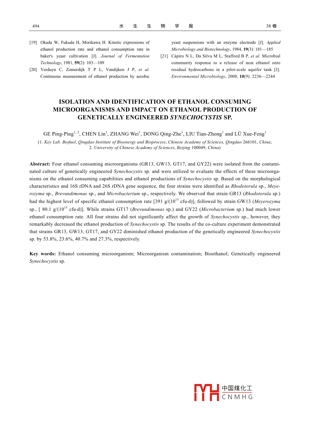 第38卷第3期水生生物學(xué)報Vol. 38. No. 32014年5月ACTA HYDROBIOLOGICA SINICAMay,2014doi:10.7541/2014.69乙醇消耗菌的分離鑒定及其對基因工程集胞藻乙醇產(chǎn)量的影響葛平平·2陳林1張維董慶喆劉天中呂雪峰(1.中國科學(xué)院青島生物能源與過程研究所,生物燃料重點實驗室,青島266101;2.中國科學(xué)院大學(xué),北京100049)摘要:為研究產(chǎn)乙醇基因工程集胞藻培養(yǎng)液中的乙醇消耗菌污染情況及其對乙醇產(chǎn)量的影響,從污染的培養(yǎng)液中分離岀4株乙醇消耗菌,通過16SrNA、26 SrNA序列分析對分離岀的菌株進(jìn)行鑒定,并研究其乙醇消耗能力及對基因工程集胞藻乙醇產(chǎn)量的影響。結(jié)果表明,分離岀的4株菌分別為紅酵母( Rhodotorulap)、季也蒙酵母( Meyerozyma guilliermondii)、短波單胞菌( Brevundimonas sp.)、微桿菌( Microbacterium sp.)。其中乙醇消耗能力最強的是紅酵母,乙醇比消耗速率達(dá)到391g(10-3cfud);其次為季也蒙酵母,乙醇比消耗速率為80.1g(10 cfu.d);短波單胞菌和微桿菌的乙醇比消耗速率遠(yuǎn)低于紅酵母和季也蒙酵母。將分離出的菌株與產(chǎn)乙醇集胞藻共培養(yǎng)πd后,污染紅酵母、季也蒙酵母、短波單胞菌、微杄菌的實驗組乙醇產(chǎn)量分別下降了53.8%、23.6%、40.7%、27.3%。4株菌對基因工程集胞藻的生長無明顯影響,均通過直接消耗乙醇而降低集胞藻的乙醇產(chǎn)量。關(guān)鍵詞:乙醇消耗菌;微生物污染;生物乙醇;基因工程集胞藻中圖分類號:Q949,22文獻(xiàn)標(biāo)識碼:A文章編號:1000-3207(2014)03-0487-08生物乙醇是重要的生物液體燃料之一,可作為巴氏醋桿菌、門多薩假單胞菌等都可代謝乙醇61,汽油替代品或可再生交通燃料添加劑。應(yīng)用基因其中巴氏醋桿菌的乙醇消耗速率達(dá)到2.3mL/d。而工程藍(lán)藻直接利用太陽能和CO2一步法生物合成乙在管囊酵母2、釀酒酵母叫中,乙醇的合成代謝和醇具有獨特的優(yōu)勢,因此成為各界關(guān)注的熱點2分解代謝同時存在。如果污染了這些微生物,也可目前,用于生產(chǎn)乙醇的基因工程藍(lán)藻主要有聚球藻能嚴(yán)重影響乙醇產(chǎn)量。目前,關(guān)于微生物污染對基( Synechococcus sp.PCC7942)和集胞藻(Sme-因工程集胞藻乙醇產(chǎn)量的影響還未有報道。chocystis sp.PCC6803)3等,最高乙醇產(chǎn)量達(dá)到本研究從污染的產(chǎn)乙醇基因工程集胞藻的培養(yǎng)5.5g冮,顯示出太陽能生物轉(zhuǎn)化直接合成乙醇的液中分離出4株乙醇消耗菌,評價各菌的乙醇消耗巨大潛力。然而,有研究表明基因工程集胞藻的乙能力以及對基因工程集胞藻的生長和乙醇產(chǎn)量的影醇產(chǎn)量很不穩(wěn)定,在培養(yǎng)后期培養(yǎng)液中的乙醇濃度響,并采用形態(tài)觀察和基因序列分析手段鑒定污染急劇下降5,因此研究確定影響乙醇產(chǎn)量穩(wěn)定性菌的種類,以期能為藍(lán)藻乙醇的培養(yǎng)工藝及污染控的因素對生產(chǎn)工藝的建立有重要意義。制提供理論參考。在我們的前期工作中發(fā)現(xiàn),基因工程集胞藻在培養(yǎng)過程中易發(fā)生食藻生物和微生物污染,尤其是1材料與方法在放大培養(yǎng)階段這種污染尤為嚴(yán)重。食藻生物會吞1.1藻種及培養(yǎng)方法食藻細(xì)胞,使生物量迅速下降,從而降低乙醇產(chǎn)量。產(chǎn)乙醇基因工程集胞藻 Synechocystis sp.PCC自然界中存在著多種能利用乙醇的微生物,例如醋6803Syn-zG25,由中國科學(xué)院青島生物能源與過酸菌、面包酵母、嗜有機甲基桿菌、枯草芽孢桿菌、程研究所構(gòu)建。集胞藻在250mL三角搖瓶(裝液收稿日期:2013-04-10;修訂日期:2013-12基金項目:國家高技術(shù)發(fā)展計劃(863)(2012AA052103)資助作者簡介:葛平平(1988),女,河北保定人;碩士研究生;主要從事生物化工TYH中國煤化工通信作者:陳林,Te:0532-80662737;E-mail:chenlin(@qibebt.ac.cnCNMHG488水生生物學(xué)報38卷量100mL)或直徑30mm的氣泡柱式光反應(yīng)器(裝液提取的基因組DNA為模板,用高保真aq酶進(jìn)行量200mL)中培養(yǎng),通入含5%CO2的空氣混合氣,PCR擴增。反應(yīng)條件為:95℃5min;94℃30s,55℃通氣速率(102)Lh,光強100μmol(m2s),培養(yǎng)溫1min,72℃lmin,34個循環(huán);72℃10min。PCR產(chǎn)物度(302)℃。培養(yǎng)基為BGlⅠ培養(yǎng)基,其中含用0.8%瓊脂糖凝膠電泳進(jìn)行檢驗。目的基因片段克20mg/L壯觀霉素( Spectinomycin, Sigma)4隆:將PCR產(chǎn)物用DNA純化試劑盒( Cycle-Pure Kit1.2乙醇消耗菌的分離純化美國 Omega公司)進(jìn)行純化,產(chǎn)物與pMDl8-TⅤec-培養(yǎng)基(1)初篩培養(yǎng)基:牛肉膏3gL,蛋白胨tor連接后轉(zhuǎn)化到E. coli dh5α感受態(tài)細(xì)胞中,涂布10g,NaCl5gL,乙醇2g/L,壯觀霉素20mg,到Amp抗性平板上培養(yǎng)9-16h挑取3個單克隆瓊脂15g/;(2)復(fù)篩培養(yǎng)基: BGll培養(yǎng)基中添加擴繁后送上海桑尼生物科技有限公司測序,將測2g/L的乙醇,20mg/L的壯觀霉素,15g/L的瓊脂;序結(jié)果與 Gen bank中已有序列進(jìn)行比對和同源性(3)純化培養(yǎng)基:牛肉膏3gL,蛋白胨10g/L,NaC1分析5g冮,乙醇2gL,瓊脂15g/L(4)發(fā)酵培養(yǎng)基:牛1.4乙醇消耗菌的生長及乙醇消耗速率測定肉膏3gL,蛋白胨10gL,NaCl5gL,乙醇23g乙醇消耗菌生長曲線的測定挑取純化后的單壯觀霉素20mg/L菌落接種于發(fā)酵培養(yǎng)基中培養(yǎng)24h,取適量培養(yǎng)液乙醇消耗菌的分離及純化(1)初篩:集胞藻在在6600nm下測定其吸光度(A6o),然后稀釋至A6o=氣