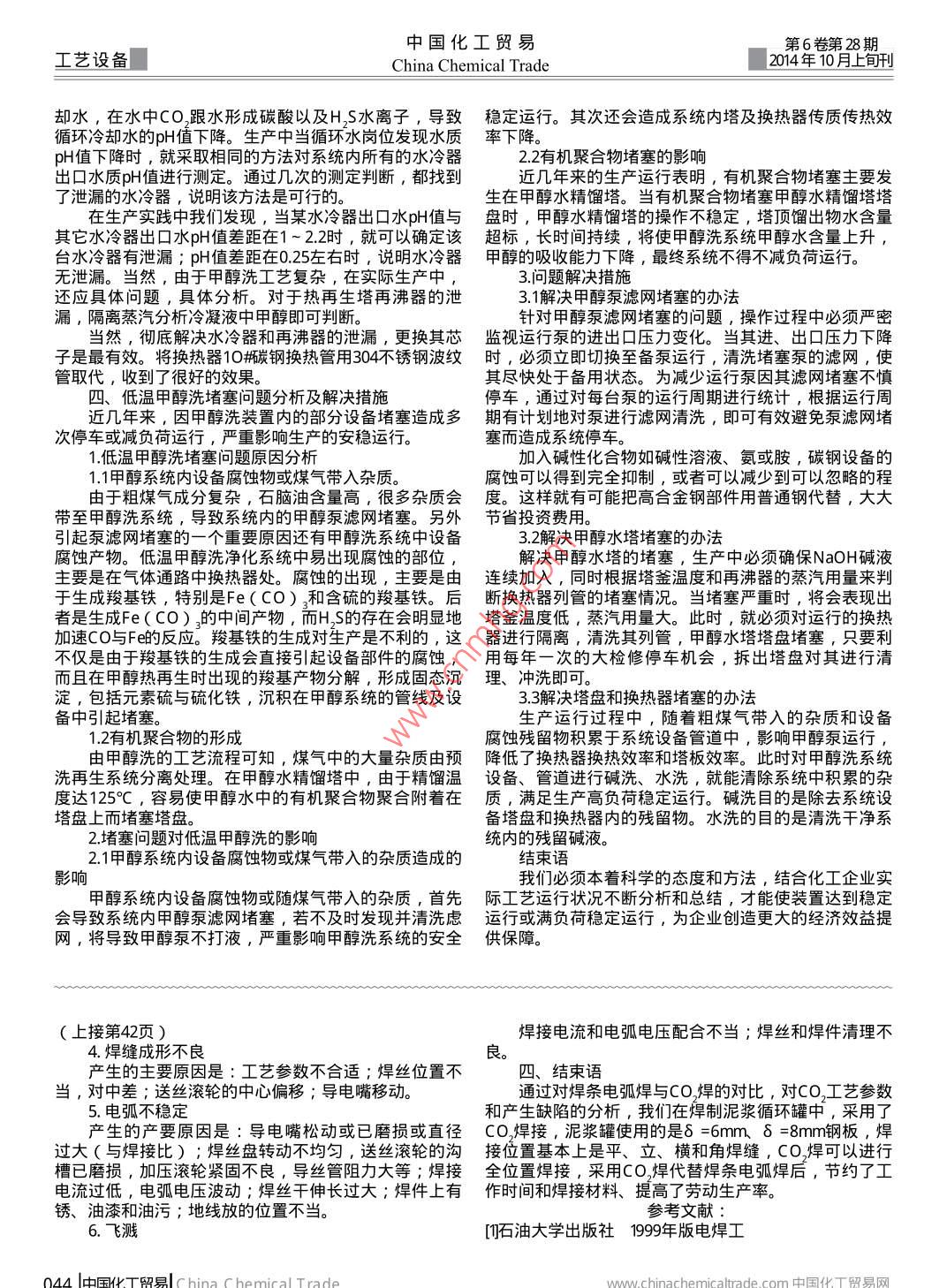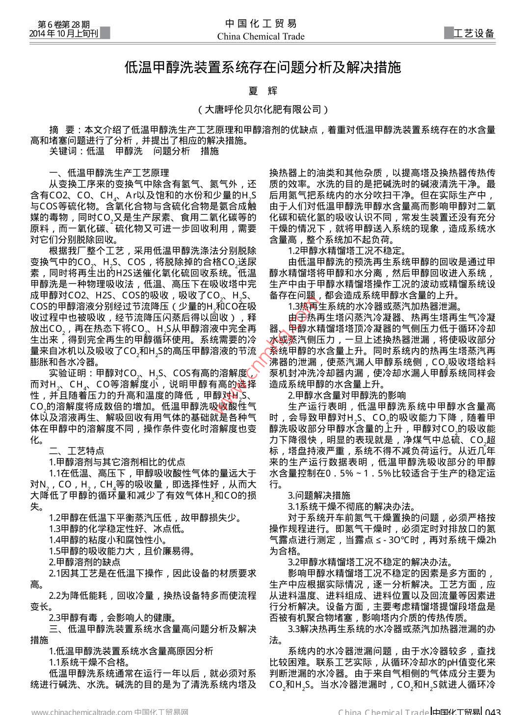 第6卷第28期中國化工貿(mào)易201410月上刊China Chemical trade工藝設(shè)備低溫甲醇洗裝置系統(tǒng)存在問題分析及解決措施夏輝(大唐呼倫貝爾化肥有限公司)摘要∶本文介紹了低溫甲醇洗生產(chǎn)工藝原理和甲醇溶劑旳優(yōu)缺點(diǎn),著重對(duì)低溫甲醇洗裝置系統(tǒng)存在的水含量高和堵塞問題進(jìn)行了分析,并提岀了相應(yīng)的解決措施。關(guān)鍵詞∶低溫甲醇洗問題分析措施低溫甲醇洗生產(chǎn)工藝原理換熱器上的油類和其他雜質(zhì),以提高塔及換熱器傳熱傳從變換工序來的變換氣中除含有氬氣、氮?dú)馔?還質(zhì)的效率。水洗的目的是把堿洗時(shí)的堿液清洗干凈。最含有CO2、CO、CHAr以及飽和的水份和少量的H2S后用氮?dú)獍严到y(tǒng)內(nèi)的水分吹掃干凈。但在實(shí)際生產(chǎn)中,與CoS等硫化物。含氧化合物與含硫化合物是氨合成觸由于人們對(duì)低溫甲醇洗甲醇水含量高而影響甲醇對(duì)二氧媒的毒物,同時(shí)CO2又是生產(chǎn)尿素、食用二氧化碳等的化碳和硫化氫的吸收認(rèn)識(shí)不同,常發(fā)生裝置還沒有充分原料,而一氧化碳、硫化物又可進(jìn)一步回收利用,需要干燥的情況下,就將甲醇送入系統(tǒng)的現(xiàn)象,造成系統(tǒng)水對(duì)它們分別脫除回收。含量高,整個(gè)系統(tǒng)加不起負(fù)荷。根據(jù)我廠整個(gè)工藝,采用低溫甲醇洗滌法分別脫除1.2甲醇水精餾塔工況不穩(wěn)定。變換氣中的CO2、H2S、CoS,將脫除掉的合格CO送尿由低溫甲醇洗的預(yù)洗再生系統(tǒng)甲醇的回收是通過甲素,同時(shí)將再生岀的H2S送催化氧化硫回收系統(tǒng)。低溫醇水精餾塔將甲醇和水分離,然后甲醇回收進(jìn)入系統(tǒng)甲醇洗是一種物理吸收法,低溫、高壓下在吸收塔中完生產(chǎn)中由于甲醇水精餾塔操作工況的波動(dòng)或精餾系統(tǒng)設(shè)成甲醇對(duì)co2、H25、COS的吸收,吸收了CO、H2S、備存在問題,都會(huì)造成系統(tǒng)甲醇水含量的上升。CoS的甲醇溶液分別經(jīng)過節(jié)流降壓(少量的H和CO在吸1.3熱再生系統(tǒng)的水冷器或蒸汽加熱器泄漏收過程中也被吸收,經(jīng)節(jié)流降壓閃蒸后得以回收),釋由于熱再生塔閃蒸汽冷凝器、熱再生塔再生氣冷凝放岀C2,再在熱態(tài)下將CO、H2S從甲醇溶液中完全再器、甲醇水精餾塔塔頂冷凝器的氣側(cè)壓力低于循環(huán)冷卻生岀來,得到完全再生的甲醇循環(huán)使用。系統(tǒng)需要的冷水或蒸汽側(cè)壓力,一旦上述換熱器泄漏,將使吸收部分量來自冰機(jī)以及吸收了℃o和HS的高壓甲醇溶液的節(jié)流系統(tǒng)甲醇的水含量上升。同時(shí)系統(tǒng)內(nèi)的熱再生塔蒸汽再膨脹和各水冷器沸器的泄漏,使蒸汽漏人甲醇系統(tǒng)側(cè),Co吸收塔給料實(shí)驗(yàn)證明∶甲醇對(duì)CO2、H2S、COS有高的溶解度泵機(jī)封沖洗冷卻器內(nèi)漏,使冷卻水漏人甲醇系統(tǒng)同樣會(huì)而對(duì)H、CH、Co等溶解度小,說眀甲醇有高的選擇造成系統(tǒng)甲醇的水含量上升。性,并且隨著壓力的升高和溫度的降低,甲醇對(duì)H2S2.甲醇水含量對(duì)甲醇洗的影響Co的溶解度將成數(shù)倍的增加。低溫甲醇洗吸收酸性氣生產(chǎn)運(yùn)行表明,低溫甲醇洗系統(tǒng)中甲醇水含量高體以及溶液再生、解吸回收有用氣體的基礎(chǔ)就是各種氣時(shí),會(huì)導(dǎo)致甲醇對(duì)H2S、CO2的吸收能力下降,隨著甲體在甲醇中的溶解度不同,操作糸件變化時(shí)溶解度也變醇洗吸收部分甲醇水含量的上升,甲醇對(duì)CO2的吸收能力下降很快,明顯的表現(xiàn)就是,凈煤氣中總硫、CO,超二、工藝特點(diǎn)標(biāo),塔盤持液嚴(yán)重,系統(tǒng)不得不減負(fù)荷運(yùn)行。從近幾年1甲醇溶劑與其它溶劑相比的優(yōu)點(diǎn)來的生產(chǎn)運(yùn)行數(shù)據(jù)表明,低溫甲醇洗吸收部分的甲醇1.1在低溫、高壓下,甲醇吸收酸性氣體的量遠(yuǎn)大于水含量控制在0.5%~1.5%比較適合于生產(chǎn)的穩(wěn)定運(yùn)對(duì)N2,CO,H2,CH等的吸收量,即選擇性好,從而大行。大降低了甲醇的循環(huán)量和減少了有效氣體H和CO的損3問題解決措施3.1系統(tǒng)干燥不徹底的解決辦法。1.2甲醇在低溫下平衡蒸汽壓低,故甲醇損失少。對(duì)于系統(tǒng)開車前氮?dú)飧稍镏脫Q的問題,必須嚴(yán)格按1.3甲醇的化學(xué)穩(wěn)定性好、冰點(diǎn)低。操作規(guī)程進(jìn)行。即氮?dú)飧稍飼r(shí),必須定時(shí)對(duì)排放口的氮1.4甲醇的粘度小和腐蝕性小。氣露點(diǎn)進(jìn)行測(cè)定,當(dāng)露點(diǎn)≤-30℃時(shí),再對(duì)系統(tǒng)干燥2h1.5甲醇的吸收能力大,且價(jià)廉易得。為合格。2.甲醇溶劑的缺點(diǎn)3.2甲醇水精餾塔工況不穩(wěn)定的解決辦法。2.1因其工藝是在低溫下操作,因此設(shè)備的材質(zhì)要求影響甲醇水精餾塔工況不穩(wěn)定的因素是多方面的,生產(chǎn)中應(yīng)根據(jù)實(shí)際情況,逐一分析解決。工藝方面,應(yīng)2.2為降低能耗,回收冷量,換熱設(shè)備特多而使流程從進(jìn)料溫度、進(jìn)料組成、進(jìn)料位置以及回流量等因素進(jìn)變長。行分析解決。設(shè)備方面,主要考慮精餾塔提餾段塔盤是2.3甲醇有毒,會(huì)影響人的健康。否被有機(jī)聚合物堵塞,影響塔內(nèi)介質(zhì)的傳熱傳質(zhì)三、低溫甲醇洗裝置系統(tǒng)水含量高問題分析及解決3.3解決熱再生