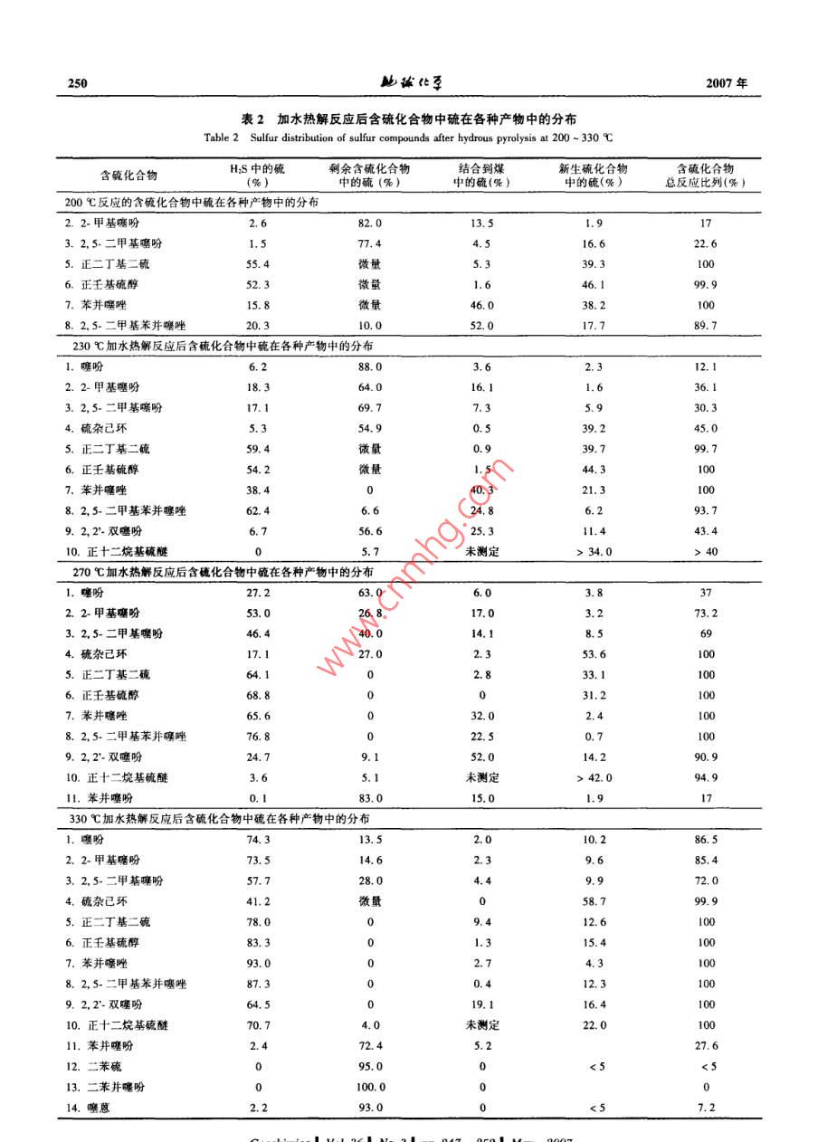 第36卷第3期鮑琳化孕Vol. 36, No.3, 247 ~ 2522007年5月GEOCHIMICAMay, 2007典型有機(jī)硫化合物熱演化的加水熱解實(shí)驗(yàn)研究宋之光'",王茂春',劉祖發(fā)2(I.中國(guó)科學(xué)院廣州地球化學(xué)研究所有機(jī)地球化學(xué)國(guó)家重點(diǎn)實(shí)驗(yàn)室,廣東廣州510640; 2.中山大學(xué)地理科學(xué)與規(guī)劃學(xué)院,廣東廣州510275)摘要:14種典型含硫化合物在200~330C溫度區(qū)間、在有低硫褐煤和硫抑制劑存在條件下的加水熱模擬實(shí)驗(yàn)結(jié)果表明,大多數(shù)結(jié)構(gòu)類型的含硫化合物是結(jié)構(gòu)不穩(wěn)定的化合物,它們的熱穩(wěn)定性差異很大,不同結(jié)構(gòu)類型的含硫化合物所對(duì)應(yīng)的熱解溫度不同,它們?cè)诓煌瑴囟榷萎a(chǎn)物的分布也不盡相同,這表明單個(gè)硫化合物的地球化學(xué)行為差異很大,而單個(gè)有機(jī)硫化合物在有機(jī)質(zhì)熱成熟過(guò)程中的轉(zhuǎn)換特征基本上可以依據(jù)其生成硫化氫、二次含硫化合物以及大分子含硫化合物的量來(lái)描述。另一方面,硫化氫作為主要熱解產(chǎn)物表明硫化合物分解生成硫化氫是有機(jī)硫化合物成熟轉(zhuǎn)化的主要機(jī)理性過(guò)程。在所調(diào)查的化合物中,苯并噻吩、二苯并噻吩、二苯硫和噻蔥等在最高熱解溫度下也不發(fā)生任何化學(xué)反應(yīng),表明這些化合物代表了穩(wěn)定型結(jié)構(gòu)的硫化合物,這與這些化合物廣泛存在于成熟原油和沉積有機(jī)質(zhì)中的狀況是一致的。 上述結(jié)果還顯示含硫化合物的種類和結(jié)構(gòu)類型是受有機(jī)質(zhì)的成熟度或演化階段控制的。關(guān)鍵詞:有機(jī)硫化合物;加水熱模擬實(shí)驗(yàn);熱解產(chǎn)物;硫化氫中團(tuán)分類號(hào): P593文獻(xiàn)標(biāo)識(shí)碼: A文章編號(hào): 0379 - 1726(2007)03 - 0247 -06Thermal evolution of typical organic sulfur compounds studied by hydrous pyrolysisSONG Zhi-guang'", WANG Mao-chun' and LIU Zu-fa21. Stale Key Laboratory of Organic Ceochemsiry, Guanghou Institute of Geochemistry, Chinese Academy of Sciences, Guangzhou 510640,。School of Geography and Planning, Sun Ya-Sen Unirersity, Guangzhou 510275, ChinaAbstract: A total of fourteen individual model sulfur compounds were investigated using laboratory hydrouspyrolysis under conditions of constant temperature between 200 and 330 C and in the presence of low sulfur browncoal. The results show that most of the compounds were reactive with great variation in their thermal stabilities, andin their maximum temperature of thermal decomposition and as well as in their sulfur product distribution, thesedemonstrate that the geochemical behaviors of the individual sulfur compounds are also in great variation. However,analysis of sulfur species in the pyrolysis products of the reactive compounds suggests that the geochemicaltransformation of organic sulfur could be principally characterized in terms of the formation and distribution ofhydrogen sulfide, secondary sulfur compounds and macromolecular sulfur. Also, as hydrogen sulfide is thepredominant pyrolysis product, its formation proves to be the primary and the most significant mechanism for organicsulfur transformation during the maturation process. Among these investigated compounds, benzothiophene,dibenzothiophene and thianthrene are stable at the highest pyrolysis temperature and suggest that these compoundsare geochemical stable compounds and this is consistent with that these compounds are widely existence in themature petroleum and sedimentary organic matter. Above results also suggest that the speciation and structural typesof sulfur compounds identified in petroleum and sedimentary organic matter may largely controlled by the organicmatter maturity and evolution stages.Key words: organic sulfur compounds; hydrous pyrolysis; sulfur products; hydrogen sulfide收稿日期(Received): 2006 - 10- 23;改回日期(Rerised): 2007 -01 - 22;接受日期(Accepted); 2007 -03 -09基金項(xiàng)目:國(guó)家自然科學(xué)基金(40373028)作者簡(jiǎn)介:宋之光(1962-).男,博士,地球化學(xué)專業(yè)。*通訊作者(Corresponding author): SONG Zhi- guang, E-mail: zsong@ gig. ac. cn, Tel: + 86-20-85290861248地球化李2007年化的作用研究提供重要的信息。因此,本研究的主0引言要目的是分析上述典型有機(jī)硫化合物在加水熱模擬條件下所發(fā)生的變化及產(chǎn)物,進(jìn)而研究其熱演化過(guò)硫是生物體所必須的重要生命元素之- -,但其程和反應(yīng)機(jī)理。在生物殘?bào)w及其活動(dòng)產(chǎn)物即沉積有機(jī)質(zhì)中的含量并不高。因此,沉積有機(jī)質(zhì)中相對(duì)高含量的有機(jī)硫主1樣品及實(shí)驗(yàn)方法要來(lái)自硫酸鹽的生物地球化學(xué)還原作用所產(chǎn)生的硫化氫等含硫自由基與有機(jī)質(zhì)之間的化學(xué)反應(yīng)11-71。實(shí)驗(yàn)所選取的標(biāo)型有機(jī)硫化合物主要是以能代由于碳一硫鍵之間鍵能相對(duì)較弱而易斷開,有機(jī)硫表煤及沉積(物)巖中普遍存在的主要硫化合物結(jié)構(gòu)被認(rèn)為對(duì)于有機(jī)質(zhì)的成熟轉(zhuǎn)化和石油烴的生成都有類型為原則,共選取了可代表硫醇硫醚、噻吩、苯并著極為重要的控制作用17-81。然而,缺少有關(guān)有機(jī)硫噻吩及多芳苯并噻吩等基本結(jié)構(gòu)類型的14種化合化合物在沉積有機(jī)質(zhì)成熟作用過(guò)程中演化機(jī)理的基物。這些化合物的名稱和加水熱解實(shí)驗(yàn)溫度情況分礎(chǔ)性研究來(lái)支持這-理論假設(shè)。造