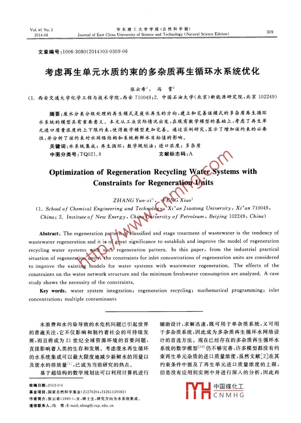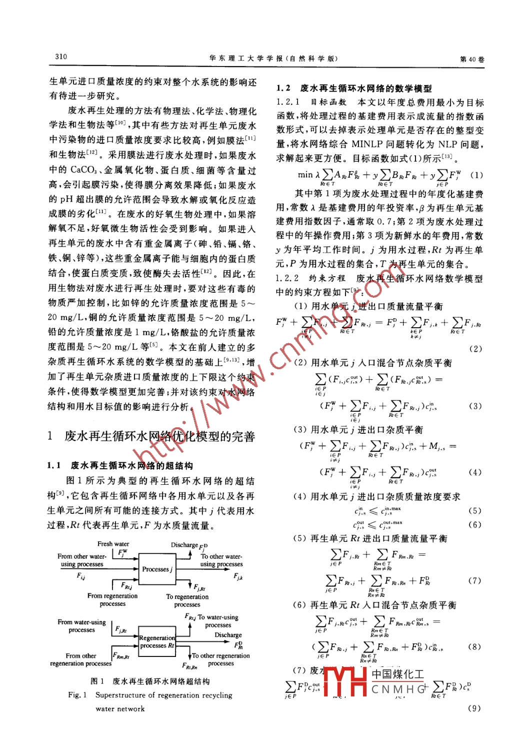 Vol. 40 No.3華東理工大學(xué)學(xué)報(自然科學(xué)版)3092014-06Journal of East China University of Science and Technology ( Natural Science Edition)文章編號:1006 3080( 2014)03- 0309-06考慮再生單元水質(zhì)約束的多雜質(zhì)再生循環(huán)水系統(tǒng)優(yōu)化張云希',馮霄(1.西安交通大學(xué)化學(xué)工程與技術(shù)學(xué)院,西安710049;2. 中國石油大學(xué)(北京)新能源研究院,北京102249)摘要:廢水分類分級處理的再生模式是廢水再生的方向,建立和完善該模式的多雜質(zhì)再生循環(huán)水系統(tǒng)的模型具有重要意義。本文從工業(yè)實際情況出發(fā),在現(xiàn)有數(shù)學(xué)模型的基礎(chǔ)上,考慮了再生單元進口質(zhì)量濃度的上下限約束,使得數(shù)學(xué)模型更加完善。通過實例研究,顯示了增加該約束的必要性,并分析了該約柬對水網(wǎng)絡(luò)結(jié)構(gòu)和系統(tǒng)新鮮水目標值的影響。.關(guān)鍵詞:水系統(tǒng)集成;再生循環(huán);數(shù)學(xué)規(guī)劃法;進口濃度;多雜質(zhì)中圖分類號:TQ021.8文獻標志碼:AOptimization of Regeneration Recycling Water Systems withConstraints for Regeneration UnitsZHANG Yun-xi',F(xiàn)ENG Xiao2(1. School of Chemical Engineering and Technology, Xi'an J iaotong University, Xi'an 710049,China; 2. Institute of New Energy, China University of Petroleum ,Beijing 102249, China)Abstract: The regeneration pattern of classified and stage treatment of wastewater is the tendency ofwastewater regeneration and it is of great significance to establish and improve the model of regenerationrecycling water systems with such regeneration pattern. In this paper, from the industrial practicalsituation of regeneration units, the constraints for inlet concentrations of regeneration units are consideredto improve the existing models for water systems with wastewater regeneration. The effects of theconstraints on the water network structure and the minimum freshwater consumption are analyzed. A casestudy shows the necessity of the constraints. .Key words: water system integration; regeneration recycling; mathematical programming; inletconcentration; multiple contaminants水浪費和水污染導(dǎo)致的水危機問題已引起世界輔助設(shè)計,求解迅速,既可用于單雜質(zhì)系統(tǒng),又可用的普遍關(guān)注,它不僅影響和制約著社會的可持續(xù)發(fā)于多雜質(zhì)系統(tǒng),因此成為多雜質(zhì)再生循環(huán)水網(wǎng)絡(luò)設(shè)展,而且將成為21世紀全球資源環(huán)境的首要問題,計的首選方法?,F(xiàn)在已經(jīng)存在的多雜質(zhì)再生循環(huán)水直接影響著人類的生存和發(fā)展。考慮廢水再生循環(huán)系統(tǒng)的數(shù)學(xué)模型[2-9]仍不夠完善,許多模型都沒有約的水系統(tǒng)集成可以最大限度地減少新鮮水的用量以束再生單元雜質(zhì)的進口質(zhì)量濃度,雖然文獻[2]在其及廢水的排放量1,已成為當前研究的熱點。約束條件中提及了再生單元進口質(zhì)量濃度的上限,基于超結(jié)構(gòu)的數(shù)學(xué)規(guī)劃法可以利用計算機進行但是沒有應(yīng)用到實例中并進行深人的分析,因此再收稿日期:2013-0-0中國煤化工基金項目:國家自然科學(xué)基金(21276204;21261130583)MYHCNMHG作者簡介:張云希(1990-),女,碩士生,研究方向為水系統(tǒng)集成。通信聯(lián)系人:馮霄 .E- mail: xfeng@ cup. edu. cn華東理工大學(xué)學(xué)報(自然科學(xué)版)第40卷生單元進口質(zhì)量濃度的約束對整個水系統(tǒng)的影響還1.2 廢水再生循環(huán)水網(wǎng)絡(luò)的數(shù)學(xué)模型有待進一步研究。1.2.1 目標函數(shù)本文以年度總費用最小為目標廢水再生處理的方法有物理法、化學(xué)法、物理化函數(shù),將處理過程的基建費用表示成流量的指數(shù)函學(xué)法和生物法等[10] ,其中有些方法對再生單元廢水數(shù)形式,可以去掉表示處理單元是否存在的整型變中污染物的進口質(zhì)量濃度要求比較高,例如膜法[1量,將水網(wǎng)絡(luò)綜合MINLP問題轉(zhuǎn)化為NLP問題,和生物法[12]。采用膜法進行廢水處理時,如果廢水.求解起來更方便。目標函數(shù)如式(1)所示(。中的CaCO3、金屬氧化物、蛋白質(zhì)、細菌等含量過minxAnFh +>ZBnFn+yZF" (1)高,會引起膜污染,使得膜分離效果降低;如果廢水其中第1項為廢水處理過程中的年度化基建費的pH超出膜的允許范圍會導(dǎo)致水解或氧化反應(yīng)造用,常數(shù)λ是基建費用的年投資率,β為再生單元基成膜的劣化1。在廢水的好氧生物處理中,如果溶建費用指數(shù)因子,通常取0.7;第2項為廢水處理過解氧不足,好氧微生物活性會受到影響。如果進入程中的年操作費用;第3項為新鮮水的年費用,常數(shù)再生單元的廢水中含有重金屬離子(砷、鉛、鎘、鉻、y為年平均工作時間。j為用水過程,Rt為再生單鐵、銅、鋅等),這些重金屬離子能與細胞內(nèi)的蛋白質(zhì)元,P為用水過程的集合,T為再生單元的集合。結(jié)合,使蛋白質(zhì)變質(zhì),致使酶失去活性(12]。因此,在1.2.2 約束方程廢水再生循環(huán)水網(wǎng)絡(luò)數(shù)學(xué)模型用生物法對廢水進行再生處理時,要對這些有毒的中的約束方程如下0:物質(zhì)嚴加控制,比如鋅的允許質(zhì)量濃度范圍是5~(1)用水單元j進出口質(zhì)量流量平衡20 mg/L, 銅的允許質(zhì)量濃度范圍是5~ 20 mg/L,F+ EF.,+ EFm,=印+ 2F.+ SF.a鉛的允許質(zhì)量濃度是1mg/L,鉻酸鹽的允許質(zhì)量濃度范圍是5~20 mg/L等[5]。本文在前人建立的多雜質(zhì)