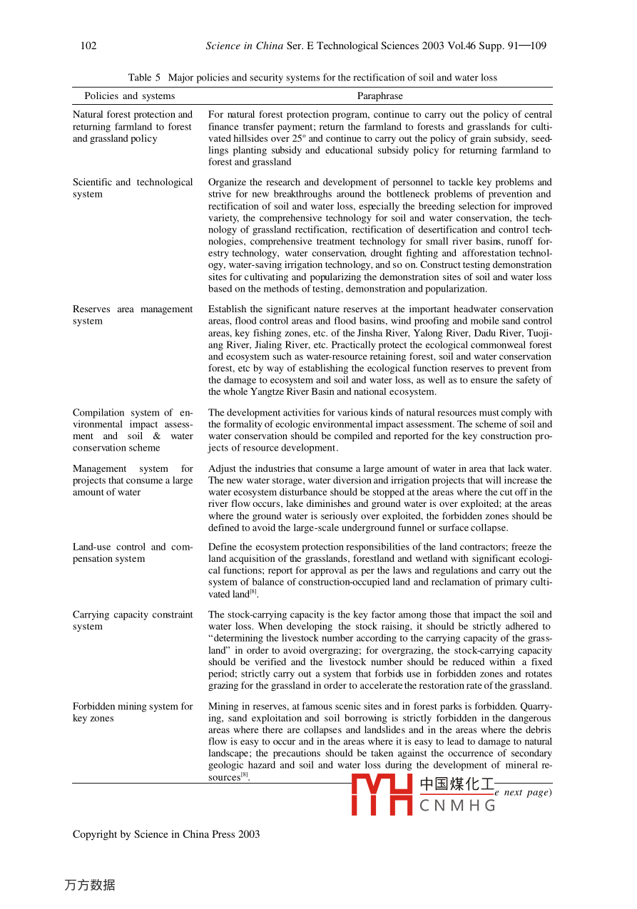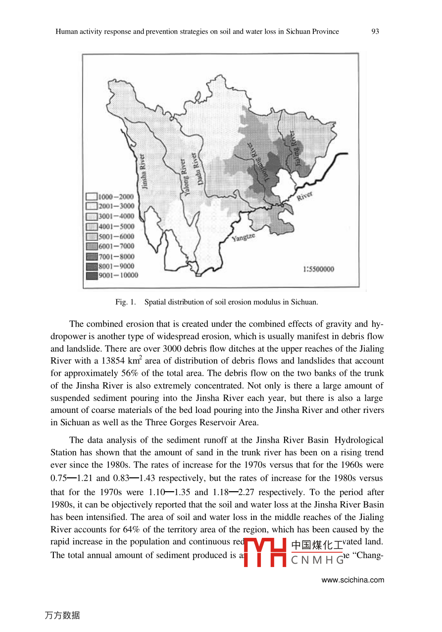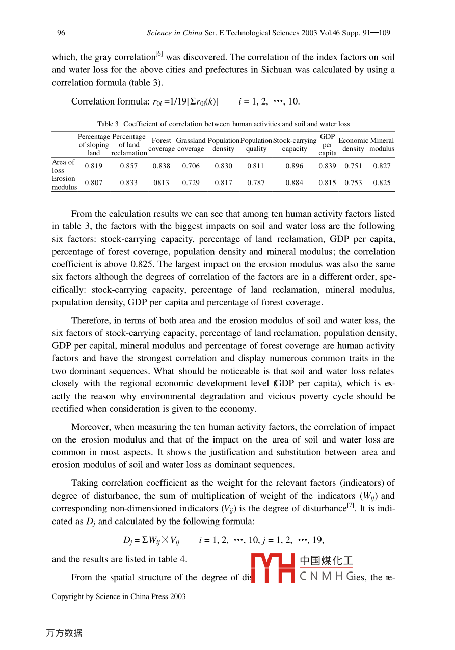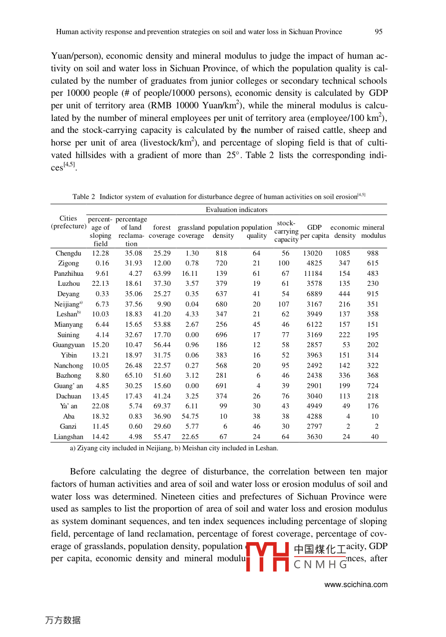 Science in China Ser. E Technological Sciences 2003 Vol.46 Supp.91-10991Human activity response and preventionstrategies on soil and water loss inSichuan ProvinceFANG Yiping & CHEN GuojeInstitute of Mountain Hazards and Environment, Chinese Academy of Sciences and Ministry of WaterResources, Chengdu 610041, ChinaCorrespondence should be addressed to Fang Yiping (email: ypfang@imde.ac.cn)Received August 11, 2003Abstract Ten major factors have been selected to judge the degree of disturbance fromhuman activity and the corresponding relationship of the impact on soil and water loss inSichuan Province. Correlation analysis has demonstrated that stock-carrying apacity,percentage of land reclamation, population density, GDP per capita, mineral modulus andpercentage of forest coverage are the 6 most relevant human activity factors. Theanalysis on the degree of disturbance has shown that population pressure, excessive orunreasonable activities in development of resources and destructive behavior of humansare the main causes of soil and water loss. Consequently, solving the various problems inthe negative activity of humans and regulating human behavior are the first tasks thatshould be tackled in the conservation of water and soil. In the new era, the prevention andrectification of soil and water loss are measures based on the foundation of theecosystem, which is a kind of management strategy for sustainable development. Thefoundation of this method is made up of the system innovations and breakthroughs interms of aims, philosophy, measures, and aspects of the prevention and rectification ofsoil and water loss, simultaneous advance from the conceptual, policy, spatial, technicaland mode levels and system integration on the treatment strategies.Keywords: Sichuan, degree of disturbance, soil and water loss, system innovation.DOI: 10.1360/03ez00111 Basic situation of soil and water loss in Sichuan ProvinceSichuan Province is located at the upper reaches of the Yangtze River with 96.5%of the territory area of the province belonging to the Y angtze River Basin, which is a keyregion in ecosystem construction in the entire nation. Protecting and building up theecosystem in Sichuan is not only an objective requirement of the economic and socialdevelopment of Sichuan but also of extreme signifi中國煤化土he ecosystem and social-economic development of the Threand the 1e-TYHCNMH GCopyright by Science in China Press 200392Science in China Ser. E Technological Sciences 2003 Vol.46 Supp. 91-109gions of the middle and lower reaches of the Yangtze River.According to the measurements and calculations from the data of the second soilsurvey, the area of soil and water loss in the entire province has reached 199800 km*,which accounts for 40.87% of the territory area. The total annual amount of soil erosionis 950 million tons and the average soil loss is 4754 t/km2 1.21 (see table1).Table 1 Situation of soil erosion in Sichuan"CitiesArea ofArea of soil Percentage of soilMean erosionAmount of soil(prefecture) territory/km2 erosion/10* hm2 erosion area (%) modulus/t 1 km2 ! al erosion/10*tChengdu12105.0234.7128.6769432410Zigong4373.0127.4862.8462481717Panzhihua7437.5436.5349.111710625Luzhou12231.4080.8766.124937Deyang5860.4520.6935.3064291330Neijiang"13347.2291.2968.4084427707Leshan'19754.03113.8657.6459526777Mianyang20263.69101.6650.1765336642Suining5323.2536.6768.8998313605Guangyuan16313.8797.1259.5341474027Yibin13297.9281.9661.6354204442Nanchong12479.3180.3464.3873175879Bazhong2500.9877.2562.8058084487Guang' an6339.5640.812986Dachuan16579.10104.126047Ya' ar15097.0258. 1438.5142122449Aba83279.14258.1731.0025476575Ganzi152307.26440.0228.89308113557Liangshan60193.99232.3538.601912a) Ziyang City included in Neijiang. b) Meishan City included in Leshan.To different types of erosion, surface erosion accounts for a large amount and ex-tensive area in water erosion and usually occurs on cultivated hillsides, barren mountainsand slopes as well as sparse and young woodlands. This type of erosion is the main typewithin Sichuan. Approximately, 70% of the cultivated land in the region of the upperreaches of the Jialing River is found on cultivated hillsides and the degree of slope isusually between 20° and 30° with a small portion with 40° slopes. Intense soil and waterloss and damage to the soil fertility occur when it rains or there is a thunderstorm, whichhas become a major source of river sediment. The sloping field at the lower reaches ofthe Jinsha River accounts for 50%一90% of the total amount of the cultivated lands, andthe cultivated lands with a degree of slope of more than 25° account for more than 1/3 ofthe total. As for increase in gully erosion, according to a preliminary representative 1e-gional survey, the annual amount of soil loss on sloping field is as high as 9.36X 107thm2, which, when converted to the surface erosion modulus, is as high as 9000- -36000t(km-. a), and the loss along the Jialing Riv中國煤化工especiallyintense. The spatial characteristics of the erosion mi:MYHCNMHGCopyright by Science in China Press 2003Human activity response and prevention strategies on soil and water loss in Sichuan Province)3置]1000 -2000giset]2001-3000]3001-4000]4001-5000]5001- 6000Yangize]6001-7000]7001-80008001-900015500009001- 10000Fig. 1. Spatial distribution of soil erosion modulus in Sichuan.The combined erosion that is created under the combined effects of gravity and hy-dropower is another type of widespread erosion, which is usually manifest in debris flowand landslide. There are over 3000 debris flow ditches at the upper reaches of the JialingRiver with a 13854 km- area of distribution of debris flows and landslides that accountfor approximately 56% of the total area. The debris flow on the two banks of the trunkof the Jinsha River is also extremely concentrated. Not only is there a large amount ofsuspended sediment pouring into the Jinsha River each year, but there is also a largeamount of coarse