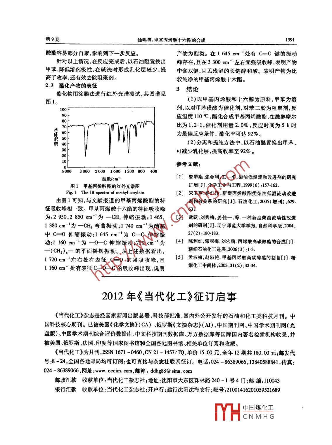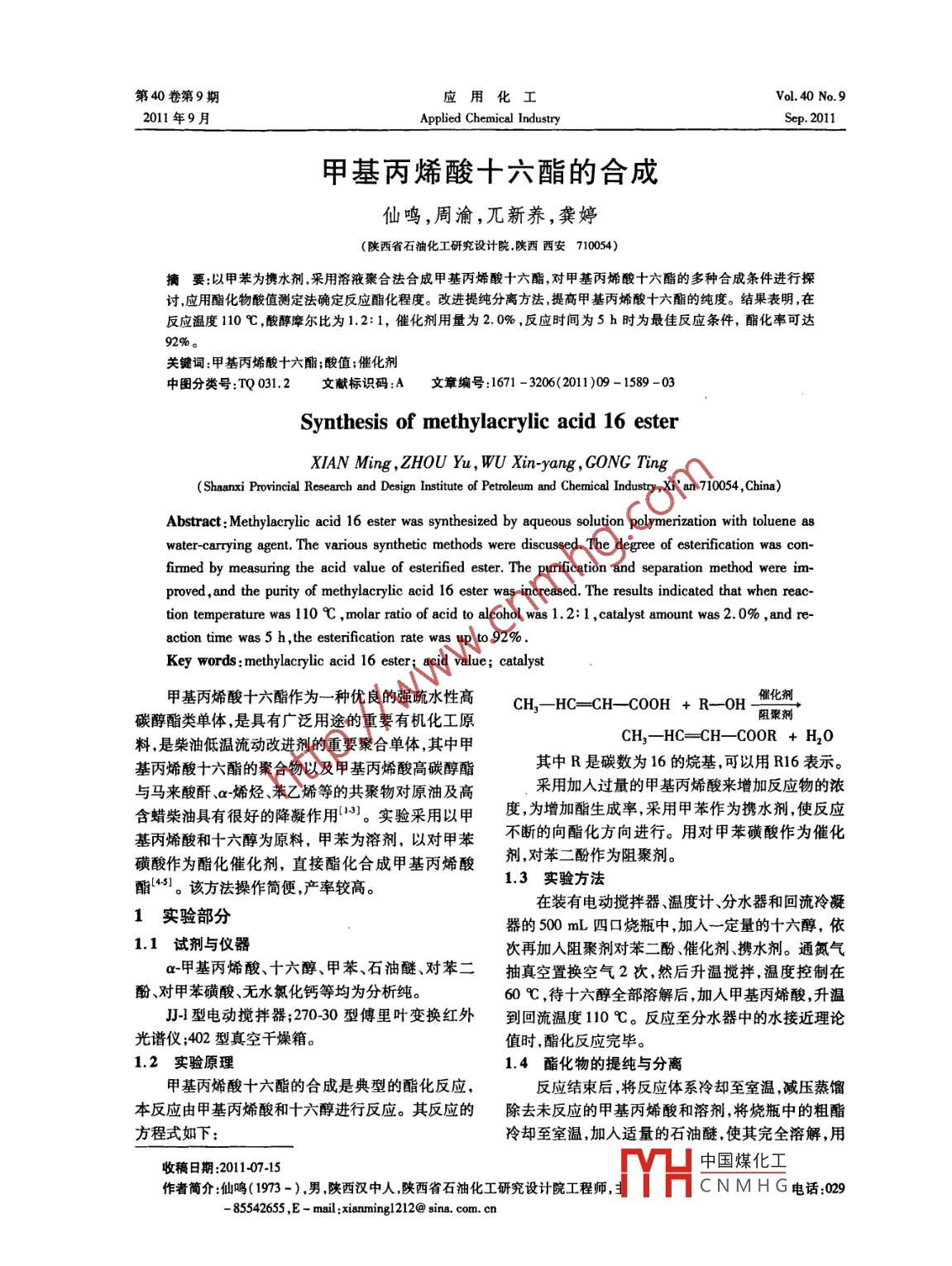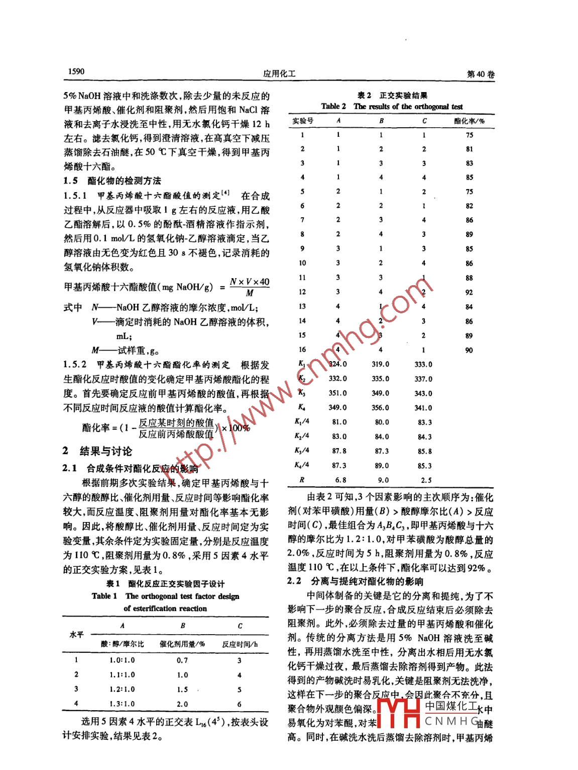 第40卷第9期應(yīng)用化工Vol 40 No 92011年9月Applied Chemical IndustSep.2011甲基丙烯酸十六酯的合成仙鳴,周渝,兀新養(yǎng),龔婷(陜西省石油化工研究設(shè)計院陜西西安710054)摘要以甲苯為攜水劑,采用溶液聚合法合成甲基丙烯酸十六酯對甲基丙烯酸十六酯的多種合成條件進(jìn)行探討應(yīng)用酯化物酸值測定法確定反應(yīng)酯化程度。改進(jìn)提純分離方法,提高甲基丙烯酸十六酯的純度。結(jié)果表明,在反應(yīng)溫度110℃,酸醇摩爾比為12:1,催化劑用量為2.0%,反應(yīng)時間為5h時為最佳反應(yīng)條件,酯化率可達(dá)92%。關(guān)鍵詞:甲基丙烯酸十六酯;酸值;催化劑中圖分類號:TQ0312文獻(xiàn)標(biāo)識碼A文章編號:1671-3206(2011)09-158903Synthesis of methylacrylic acid 16 esterXIAN Ming, ZHOU Yu, wU Xin-yang, GONG TingShaanxi Provincial Research and Design Institute of Petroleum and Chemical Industry, Xi'an 710054, China)Abstract: Methylacrylic acid 16 ester was synthesized by aqueous solution polymerization with tolueneater-carrying agent. The various synthetic methods were discussed. The degree of esterification was corfirmed by measuring the acid value of esterified ester. The purification and separation method were im-proved, and the purity of methylacrylic acid 16 ester was increased. The results indicated that when reac-tion temperature was 110 C, molar ratio of acid to alcohol was 1. 2: 1, catalyst amount was 2. 0%, and re-action time was 5 h, the esterification rate was up to 929Key words: methylacrylic acid 16 ester; acid value; catalyst甲基丙烯酸十六酯作為一種優(yōu)良的強(qiáng)疏水性高CH2HC=CH-COOH+R-0H催化碳醇酯類單體,是具有廣泛用途的重要有機(jī)化工原阻聚劑料,是柴油低溫流動改進(jìn)劑的重要聚合單體,其中甲CH -HC=CH--cooR +H,O基丙烯酸十六酯的聚合物以及甲基丙烯酸高碳醇酯其中R是碳數(shù)為16的烷基,可以用R6表示與馬來酸酐、α-烯烴、苯乙烯等的共聚物對原油及高采用加入過量的甲基丙烯酸來增加反應(yīng)物的濃含蠟柴油具有很好的降凝作用13)。實驗采用以甲度,為增加酯生成率采用甲苯作為攜水劑,使反應(yīng)基丙烯酸和十六醇為原料,甲苯為溶劑,以對甲苯不斷的向酯化方向進(jìn)行。用對甲苯磺酸作為催化磺酸作為酯化催化劑,直接酯化合成甲基丙烯酸劑,對苯二酚作為阻聚劑。酯4。該方法操作簡便,產(chǎn)率較高。13實驗方法在裝有電動攪拌器、溫度計、分水器和回流冷凝1實驗部分器的500mL四口燒瓶中,加入一定量的十六醇,依11試劑與儀器次再加人阻聚劑對苯二酚、催化劑、攜水劑。通氮氣冬a甲基丙烯酸、十六醇、甲苯、石油醚、對苯二抽真空置換空氣2次,然后升溫攪拌溫度控制在對甲苯磺酸、無水氯化鈣等均為分析純60℃,待十六醇全部溶解后,加人甲基丙烯酸,升溫J型電動攪拌器;270-30型傅里葉變換紅外到回流溫度110℃。反應(yīng)至分水器中的水接近理論光譜儀;402型真空干燥箱。值時,酯化反應(yīng)完畢。1.2實驗原理1.4酯化物的提純與分離甲基丙烯酸十六酯的合成是典型的酯化反應(yīng),反應(yīng)結(jié)束后,將反應(yīng)體系冷卻至室溫,減壓蒸餾本反應(yīng)由甲基丙烯酸和十六醇進(jìn)行反應(yīng)。其反應(yīng)的除去未反應(yīng)的甲基丙烯酸和溶劑,將燒瓶中的粗酯方程式如下:冷卻至室溫,加入適量的石油醚,使其完全溶解,用收稿日期:2011407-15YH中國煤化工作者簡介:仙鳴(1973-),男陜西漢中人,陜西省石油化工研究設(shè)計院工程師,CNMHG電話:02985542655,E-mail:xianmingl212@sina.com.cn1590應(yīng)用化工第40卷5%NaOH溶液中和洗滌數(shù)次,除去少量的未反應(yīng)的表2正交實驗結(jié)果甲基丙烯酸、催化劑和阻聚劑,然后用飽和NaCl溶Table 2 The results of the orthogonal test液和去離子水浸洗至中性,用無水氯化鈣干燥12h實驗號AC酯化率/%左右。濾去氯化鈣,得到澄清溶液,在高真空下減壓蒸餾除去石油醚,在50℃下真空干燥,得到甲基丙22烯酸十六酯。15酯化物的檢測方法1.5.1甲基丙烯酸十六酯酸值的測定(在合成過程中,從反應(yīng)器中吸取1g左右的反應(yīng)液,用乙酸567892526乙酯溶解后,以0.5%的酚酞酒精溶液作指示劑,然后用0.1moL的氫氧化鈉乙醇溶液滴定,當(dāng)乙223醇溶液由無色變?yōu)榧t色且308不褪色,記錄消耗的氫氧化鈉體積數(shù)。甲基丙烯酸十六酯酸值( mg NaOH/1)sNxV×40o123333412式中N—NaOH乙醇溶液的摩爾濃度,mo/LV—滴定時消耗的NaOH乙醇溶液的體積M——試樣重,g3211.5.2甲基丙烯酸十六酯酯化率的測定根據(jù)發(fā)319.0333.0生酯化反應(yīng)時酸值的變化確定甲基丙烯酸酯化的程56KgK32.0335.0337.0度。首先要確定反應(yīng)前甲基丙烯酸的酸值,再根據(jù)351.0349.0343.0不同反應(yīng)時間反應(yīng)液的酸值計算酯化率。349.0341.0酯化率=(1-反應(yīng)某時刻的酸值×100%K181.0K,/483.084.084.32結(jié)果與討論Ky/85.82.1合成條件對酯化反應(yīng)的影響K4489085.3根據(jù)前期多次實驗結(jié)果,確定甲基丙烯酸與十9.02.5六醇的酸醇比、催化劑用量、反應(yīng)時間等影響酯化率由表2可知,3個因素影響的主次順序為:催化較大而反應(yīng)溫度、阻聚劑用量對酯化率基本無影劑(對苯甲磺酸)用量(B)>酸醇摩爾比(A)>反應(yīng)響。因此將酸醇比、催化劑用量、反應(yīng)時間定為實時間(C),最佳組合為A3B2C3,即甲基丙烯酸與十六驗變量,其余條件定為實驗固定量,分別是反應(yīng)溫度醇的摩爾比為1.2:1.0,對甲苯磺酸為酸醇總量的為10℃阻聚