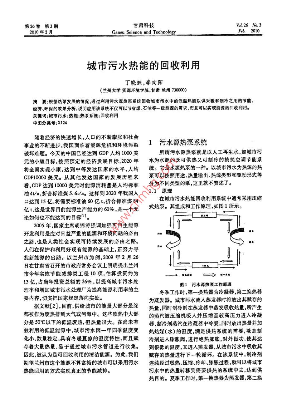 第26卷第3期甘肅科技Vol.26 No.32010年2月Cansu Science and TechnologyFeb.2010城市污水熱能的回收利用丁曉妹,李向陽(yáng)(蘭州大學(xué)資源環(huán)境學(xué)院,甘肅蘭州70000)摘要:根據(jù)熱泵發(fā)展的情況,通過(guò)利用污水源熱泵系統(tǒng)回收城市污水中的低溫?zé)崮芤怨┎膳椭评渲玫墓?jié)能、經(jīng)濟(jì)、環(huán)保的效果分析,說(shuō)明應(yīng)用該系統(tǒng)不僅可以節(jié)省煤、石油等-級(jí)能源的需求,而且可以實(shí)現(xiàn)能源的回收利用。關(guān)鍵詞:城市污水;熱能;熱泵系統(tǒng);回收利用中國(guó)分類號(hào):X124隨著經(jīng)濟(jì)的快速增長(zhǎng),人口的不斷膨脹和社會(huì)事業(yè)的不斷進(jìn)步,我國(guó)面臨著能源危機(jī)和環(huán)境污染1污水源熱泵系統(tǒng)破壞難題。今天的中國(guó)已經(jīng)達(dá)到GDP人均1000美所謂污水源熱泵就是以人工再生水,如城市污元的小康目標(biāo),按照預(yù)定的經(jīng)濟(jì)發(fā)展目標(biāo),2020年水為水源的既可供熱又可制冷的搞笑空調(diào)節(jié)能系將全面實(shí)現(xiàn)小康,達(dá)到中等發(fā)達(dá)國(guó)家的水平,人均統(tǒng)。 它是水源熱泵的一-種。以城市污水為熱源的熱CDP10000美元。從其他發(fā)達(dá)國(guó)家的發(fā)展歷程來(lái)泵可以按照用途熱量輸出、熱源類型和驅(qū)動(dòng)形式等看,GDP達(dá)到10000美元時(shí)能源消耗量是人均標(biāo)準(zhǔn)分為不同類型的泵,這里就不贅述了。油4Va,折合標(biāo)準(zhǔn)煤5.6Va。這樣到2020年我國(guó)人1.1 原理口達(dá)到15億,將需要標(biāo)準(zhǔn)油60億t,折合標(biāo)準(zhǔn)煤84在城市污水熱能回收利用系統(tǒng)中通常采用壓縮億,這是世界目前能源生產(chǎn)能力的60% ,是一個(gè)無(wú)式熱泵。其組成和工作原理,如圖1所示。論如何也不能達(dá)到的目標(biāo)”。2005年,國(guó)家主席胡錦濤強(qiáng)調(diào)加強(qiáng)可再生能源■開(kāi)發(fā)利用是應(yīng)對(duì)日益嚴(yán)重的能源和環(huán)境問(wèn)題的必由之路,也是人類社會(huì)實(shí)現(xiàn)可持續(xù)發(fā)展的必由之路。人們?cè)诒Wo(hù)和利用好現(xiàn)有能源的基礎(chǔ)上,正努力尋找新能源的出路。以蘭州市為例, 2009年2月26日在甘肅省召開(kāi)的市政府常務(wù)會(huì)議上明確提出蘭州市今年實(shí)施節(jié)能減排類工程10項(xiàng),估算投資約為口==>謝橫13億,占當(dāng)年投資總額的26%,以提高城市污水處圍1污水源熱泵工作原理理率和增加城市污水處理廠為提高能源利用率的主冬季工作時(shí),第一換熱器為冷凝器,第二換熱器要內(nèi)容,切實(shí)把國(guó)家規(guī)定落向?qū)嵦?。為蒸發(fā)器。城市污水流人蒸發(fā)器時(shí)將放出其賦存的據(jù)文獻(xiàn)[2],目前,供給城市的能量大部分最終熱量,同時(shí)制冷劑在蒸發(fā)器中蒸發(fā)吸收熱量,所產(chǎn)生都被作為廢熱排到大氣或河海中。這些廢熱中大部的蒸汽被壓縮機(jī)吸入并壓縮至較高壓力進(jìn)人冷凝分是50以下的低溫廢熱,但熱量很大。在尚未有器,制冷劑蒸汽在冷凝器中冷凝,同時(shí)放出熱量并加效利用的低溫能源中,城市污水因-年四季溫度變熱熱媒(水)的溫度,滿足供熱系統(tǒng)的需要,液態(tài)制化小,數(shù)量穩(wěn)定,具有冬暖夏涼的溫度特性,而且賦冷劑進(jìn)入膨脹閥,進(jìn)行絕熱膨脹,對(duì)外做功,使其達(dá)存著大量熱量,易于通過(guò)城市污水管道進(jìn)行收集。到很低的溫度,又進(jìn)入蒸發(fā)器,從城市污水中吸收其因此,被認(rèn)為是可回收利用的清潔能源。為此,我們賦存的熱量進(jìn)行下- -輪循環(huán)。在該系統(tǒng)中,制冷劑期望蘭州市這個(gè)能源不算富裕的城市可以采用污水連續(xù)經(jīng)過(guò)吸熱、壓縮、冷卻、膨脹過(guò)程,就可以將城市熱能回用的方式實(shí)現(xiàn)真正的節(jié)能減排。污水中的熱量轉(zhuǎn)移到需要供熱的系統(tǒng)中去,達(dá)到供熱目的。夏季工作時(shí),第- -換熱器為蒸發(fā)器,第二換第3期丁曉妹等:城市污水熱能的回收利用7熱器為冷凝器,工作流程正好與冬季時(shí)的相反。制潔防止堵塞;保護(hù)設(shè)備的同時(shí)也要考慮到系統(tǒng)運(yùn)行冷劑連續(xù)經(jīng)過(guò)膨脹、冷卻、壓縮和吸熱過(guò)程,就可以后,污水熱量變化對(duì)后續(xù)處理工藝的影響。將城市污水中的冷量轉(zhuǎn)移到需要制冷的系統(tǒng)中去,達(dá)到制冷的目的(2。3應(yīng)用熱泵 系統(tǒng)回收污水熱能的意義1.2國(guó)內(nèi)外的應(yīng)用和發(fā)展情況有效利用城市污水中的熱量,是使蘭州污水資城市污水源熱泵是污水熱能利用的- -種形式,源化的一項(xiàng)先進(jìn)技術(shù),具有明顯的節(jié)能、經(jīng)濟(jì)和環(huán)保是一種從城市污水等低品位熱源中提取熱量,將其效果,它對(duì)提高人民生活質(zhì)量、促進(jìn)經(jīng)濟(jì)發(fā)展、推動(dòng)轉(zhuǎn)換成高品位清潔能源,并向外提供供暖熱源空調(diào)社會(huì)進(jìn)步也有重要的應(yīng)用價(jià)值。冷源或生活熱水的熱泵系統(tǒng)。該系統(tǒng)在北歐很多國(guó)1)采用污水熱能利用系統(tǒng),可以代替一部分高家,日本發(fā)展較早。如1983年,揶威奧斯陸建成利位能源的使用,可以合理配置城市能源利用的情況,用未處理污水作為熱源的熱泵區(qū)域供熱系統(