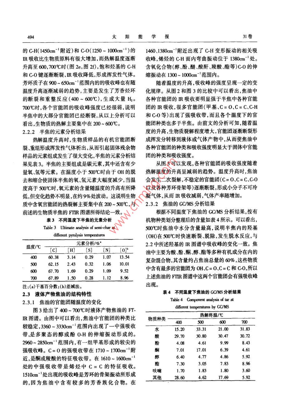 第31卷第4期太陽(yáng)能學(xué)報(bào)Vol 31, No 42010年4月ACTA ENERGIAE SOLARIS SINICA文章編號(hào):025406(2010)040491-6溫度對(duì)生物質(zhì)熱解產(chǎn)物有機(jī)結(jié)構(gòu)的影響肖瑞瑞,陳雪莉,周志杰,于廣鎖(華東理工大學(xué)煤氣化教育部重點(diǎn)實(shí)驗(yàn)室,上海20037)摘要:在管式爐上研究了生物質(zhì)在不同溫度下的熱解過(guò)程,采用傅立葉紅外光譜儀研究了熱解溫度對(duì)稻草熱解固體產(chǎn)物半焦和液體產(chǎn)物焦油的有機(jī)結(jié)構(gòu)變化的影響,用色質(zhì)聯(lián)用儀(cCMS)分析了焦油的主要成分隨溫度的變化。研究表明,生物質(zhì)的熱解主要集中在200~600℃,高溫有利于氣體產(chǎn)物的析出,半焦的量及其所含的有機(jī)官能團(tuán)(C=0,C=C,cH,CO和OH等)隨熱解溫度的升高快速減少;焦油的量隨溫度的升高先增大后減小,在500℃時(shí)達(dá)到最大值焦油中官能團(tuán)的種類較穩(wěn)定但是吸收峰強(qiáng)度隨溫度的升高呈減弱的趨勢(shì)。關(guān)鍵詞:稻草;熱解溫度;半焦;焦油;FIR中圖分類號(hào):TK6文獻(xiàn)標(biāo)識(shí)碼:A0引言其工業(yè)分析和元素分析結(jié)果見表1。表1稻草的工業(yè)分析和元素分析熱解作為生物質(zhì)氣流床氣化的前處理階段,可Table 1 Proximate analysis and ultimate analysis of straw以將生物質(zhì)轉(zhuǎn)化為高品位的固體半焦、液體焦油和工業(yè)分析/%元素分析/%富氫氣體產(chǎn)物”。熱解過(guò)程與運(yùn)行條件密切相關(guān),"vFCA4[(C][H][N][oy[s其產(chǎn)物分布不僅依賴于生物質(zhì)的物性,還受溫度粒717018.589.7243.685.700.939.720.21徑、壓力和升溫速率等影響,其中溫度的影響最為顯注:(a)干基百分?jǐn)?shù);(b)差減法著24。近來(lái)國(guó)外許多研究者在多種裂解反應(yīng)器1.2流程及方法上研究了溫度對(duì)生物質(zhì)熱解產(chǎn)物分布特性的影熱解實(shí)驗(yàn)流程如圖1所示。生物質(zhì)原料放入響,但是關(guān)于生物質(zhì)熱解過(guò)程中液固產(chǎn)物有機(jī)38m的特制反應(yīng)器中進(jìn)行熱解反應(yīng)器外部由電結(jié)構(gòu)的變化卻鮮有研究。本文從微觀角度著手,在爐加熱,熱解溫度由置于反應(yīng)器的熱電偶顯示。熱管式爐上研究了不同溫度下生物質(zhì)的熱解過(guò)程,并解后的固體產(chǎn)物半焦留在反應(yīng)器內(nèi)實(shí)驗(yàn)結(jié)束冷卻著重分析了熱解固體產(chǎn)物半焦和液體產(chǎn)物焦油的結(jié)后取出稱重。液體產(chǎn)物焦油經(jīng)過(guò)一系列冷凝裝置和構(gòu)和組成特性,對(duì)生物質(zhì)能源的轉(zhuǎn)化和利用具有重除塵裝置后收集并稱取其總重。熱解產(chǎn)生的氣體由要的指導(dǎo)作用。載氣N2帶出,通過(guò)除焦除塵凈化后,用氣相色譜1實(shí)驗(yàn)個(gè)國(guó)1.1原料稻草(取自上海寶山區(qū))經(jīng)粉碎過(guò)篩后,取80目的篩間物放置在105℃烘箱內(nèi)干燥3h,備用。1.溫控儀2N2鋼瓶3.流量計(jì)4.管式電爐5.熱解筐采用德國(guó) Elementar公司生產(chǎn)的 Vario MACRo ChN6磁力攪拌器7洗瓶8.過(guò)濾裝量9,10.控制閥CHs元素分析儀測(cè)定原料和半焦中C、H、NS的質(zhì)l1濕式流量計(jì)12.氣相色譜儀量含量。參考GB212、GB/T2l3、CB/T214、CB476、圖1熱解實(shí)驗(yàn)流程圖GB483等煤炭分析國(guó)家標(biāo)準(zhǔn),對(duì)稻草進(jìn)行成分分析Fig. I Flow diagram of pyrolysis收稿日期:20080902通訊作者:于廣鎖(1900),男,教授、博士生導(dǎo)師,主要從事水煤漿氣流床氣化方面的研究。gyu@eus,t492太陽(yáng)能學(xué)報(bào)31卷儀分析其組成,并用氣體流量計(jì)計(jì)量累積的熱解氣較尖的吸收峰是飽和烴基的CH的伸縮振動(dòng)形成體積。的。C=0的吸收峰在1720cm-附近,在1650~采用傅立葉變換紅外光譜儀(FTHR)(美國(guó)Ther1640cm處有一中強(qiáng)吸收帶,是乙烯基型的C=C的mo熱電 Nicolet neXUs6700測(cè)定固體和液體產(chǎn)物的特征吸收。在1460cm1、1380cm2附近也出現(xiàn)了CHFTIR圖譜,制樣方法為KBr壓片和涂層制樣。采用變形振動(dòng)的一組相關(guān)吸收峰。烯烴的CH面內(nèi)彎曲美國(guó) PerkinElmer公司生產(chǎn)的cans600cCMS分析振動(dòng)位于140~1300cm范圍,該區(qū)域有一組中強(qiáng)儀來(lái)測(cè)定焦油中各組分的含量。吸收帶。羥基的面內(nèi)變形振動(dòng)在1420~1260cmCO的伸縮振動(dòng)在1250-1000m1范圍內(nèi),COC的2結(jié)果和討論伸縮振動(dòng)位于1250~1060cm范圍內(nèi)。21熱解產(chǎn)物的產(chǎn)率隨溫度的變化含氧官能團(tuán)的高活性和低活化能的特性使得生不同熱解溫度下稻草熱解產(chǎn)物的產(chǎn)率如表2所物質(zhì)在低溫下較容易熱解并且低溫下不穩(wěn)定含氧示。隨著熱解溫度的升高生物質(zhì)的裂解程度增大,官能團(tuán)的裂解或重組,形成大量CO和CO2等可揮揮發(fā)分大量析出,從而使半焦的產(chǎn)率降低,氣體的產(chǎn)發(fā)性氣體,因此熱解溫度對(duì)生物質(zhì)樣品的有機(jī)官能率增加。焦油的產(chǎn)率隨熱解溫度的升高先增加后減團(tuán)的存在有很大影響小,因?yàn)楫?dāng)熱解溫度較低時(shí),揮發(fā)分析出較慢,反應(yīng)組成生物質(zhì)的3種組分(纖維素、半纖維素和木主要停留在炭化階段隨著溫度的逐步提高熱解反質(zhì)素)熱分解的溫度范圍不同其中半纖維素首先在應(yīng)速率急速提高,揮發(fā)分大量析出以致于在某個(gè)合180~2