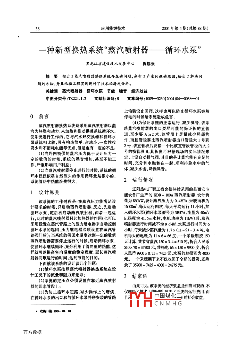 38應(yīng)用能源技術(shù)2004年第4期(總第88期)--種新型換熱系統(tǒng)“蒸汽噴射器循環(huán)水泵”黑龍江省建設(shè)技術(shù)發(fā)展中心祝錫強(qiáng)摘要指出了蒸汽噴射器供熱系統(tǒng)存在的問題,分析了產(chǎn)生問題的原因,給出了解決問題的方法,并且根據(jù)工程實(shí)例進(jìn)行了技術(shù)經(jīng)濟(jì)發(fā)分析。.關(guān)鍵詞蒸汽噴射器循環(huán)水泵節(jié)能噪音經(jīng)濟(jì)效益中圖分類號(hào):TK224.1.2文獻(xiàn)標(biāo)識(shí)碼:B文章編號(hào):1009- -3230(2004)04- -0038- -01上均裝設(shè)止回閥,這樣也可以防止循環(huán)水泵突然0前言停電的時(shí)候給系統(tǒng)造成危害;蒸汽噴射器換熱系統(tǒng)是采用蒸汽噴射器以蒸(4)為保證系統(tǒng)的正常運(yùn)行,減少噪音,該系汽為熱煤和動(dòng)力,來(lái)加熱和推動(dòng)供暖系統(tǒng)循環(huán)水,統(tǒng)蒸汽噴射器的出口要盡可能的保證長(zhǎng)的直管使系統(tǒng)進(jìn)行工作的,它與汽水熱交換器和循環(huán)水道,至少要A≥2米,該管段上盡量減少局部構(gòu)泵系統(tǒng)相比較,具有構(gòu)造簡(jiǎn)單、占地小一次性投件,而且管徑要比蒸汽噴射器出口管徑大1號(hào)到資少和不消耗電能等優(yōu)點(diǎn),但是也有一定的不足: .2號(hào),該直管段后要接一個(gè)比該直管段管徑的大2(1)當(dāng)外網(wǎng)提供的蒸汽壓力低于設(shè)計(jì)壓力一號(hào)的橫管段B,其長(zhǎng)度可根據(jù)現(xiàn)場(chǎng)的實(shí)際情況來(lái)定的數(shù)值的時(shí)候,系統(tǒng)的噪音增加,甚至不能工定,上設(shè)自動(dòng)排氣閥,其目的是讓蒸汽能有充足的時(shí)間,充分和水融和在一起,順利排除水中的氣作,嚴(yán)重影響用戶利益;(2)當(dāng)蒸汽噴射器停止運(yùn)行的時(shí)候,系統(tǒng)的循體,減少水擊,降低噪音。環(huán)水僅僅依靠自然壓頭的作用循環(huán)量是很小的,2運(yùn)行情況.系統(tǒng)管路中熱能浪費(fèi)很大。遼陽(yáng)熱電廠職工宿舍換熱站采用的是西安節(jié)1設(shè)計(jì)原則能設(shè)備廠生產(chǎn)的XDB - 100A蒸汽噴射器,設(shè)計(jì)負(fù)該系統(tǒng)的工作過程是:在蒸汽壓力能滿足設(shè)荷為860kW ,設(shè)計(jì)蒸汽壓力為0. 4MPa,采暖面積為計(jì)要求的時(shí)候,只啟動(dòng)蒸汽噴射器;反之,先啟動(dòng)16000m2 ,每天運(yùn)行四次,每天平均運(yùn)行11小時(shí),加循環(huán)水泵,隨后再啟動(dòng)蒸汽噴射器,兩者一起運(yùn)人循環(huán)水泵(循環(huán)水泵型號(hào)為3BS7A,流量為40m21行,此時(shí)的蒸汽噴射器只起加熱器的作用(也可以h,揚(yáng)程為41.5m水柱,電機(jī)功率為11kW)后,蒸汽采用設(shè)置在蒸汽管路上的壓力繼電器來(lái)自動(dòng)控制噴射器運(yùn)行時(shí)間減不為9小時(shí),水泵運(yùn)行時(shí)間為6循環(huán)水泵的起閉,壓力繼電器必須設(shè)置在蒸汽管小時(shí),每天減少蒸汽量為1.7x(11-9)=3.4噸,電.路閥門后);當(dāng)系統(tǒng)的供回水溫度達(dá)到一定的數(shù)值機(jī)每天的電耗為11x6=66度,-一個(gè)采暖期按150蒸汽噴射器需要停止運(yùn)行的時(shí)候,啟動(dòng)循環(huán)水泵,天計(jì)算,共節(jié)省蒸汽150x3.4= 510噸,折合人民幣使循環(huán)水繼續(xù)循環(huán),充分利用了管網(wǎng)里的熱能,這510x 70= 35700元,共耗電6x 150=9900度,折合樣就可以提高室內(nèi)溫度的穩(wěn)定程度,延長(zhǎng)蒸汽噴人民幣9900x0.75 = 7425元,水泵的總投資為4000射器間歇運(yùn)行的時(shí)間,達(dá)到節(jié)能的目的。元。-個(gè)采暖期下來(lái)不僅收回了全部的投資,還剩下面就該系統(tǒng)的設(shè)計(jì)談幾個(gè)問題: .余了35700- 7425 - 4000= 24275元。(1)循環(huán)水泵按照蒸汽噴射器換熱系統(tǒng)在設(shè)計(jì)工況下的流量和阻力來(lái)選取;3結(jié)束語(yǔ)(2)系統(tǒng)的定壓點(diǎn)必須設(shè)置在靠近蒸汽噴射器的回水管段上;由此可見,該系統(tǒng)的經(jīng)濟(jì)效益是相當(dāng)可觀的,不(3)為防止循環(huán)水短路,減少操作上的麻煩,僅解蟲了技術(shù)上的問題減小了統(tǒng)的運(yùn)行費(fèi)用,而在循環(huán)水泵的出口和與循環(huán)水泵并聯(lián)安裝的管路助 I中國(guó)煤化工的社會(huì)效益。TYHCNMHG●收稿日期200-04 -01