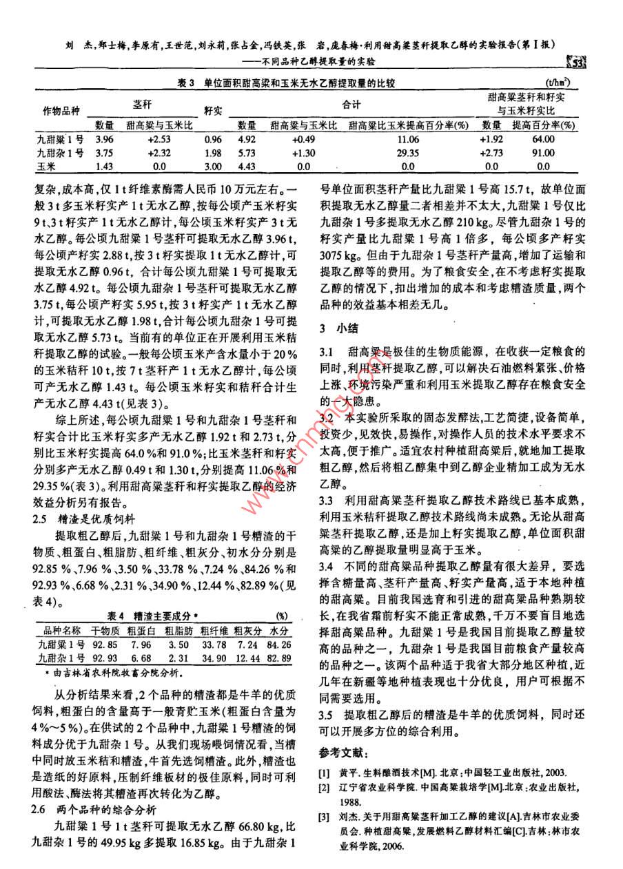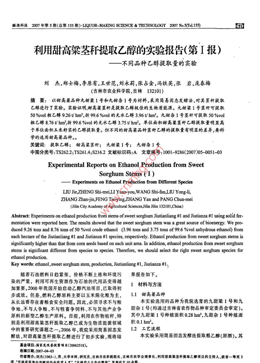 利用甜高粱莖稈提取乙醇的實驗報告(第Ⅰ報)——不同品種乙醇提取量的實驗