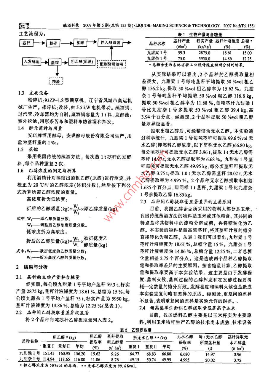 釀酒科技2007年第5期(總第155期) LIQUOR- MAKING SCIENCE& TECHNOLOGY2007No.5(ol159利用甜高梁莖稈提取乙醇的實驗報告(第Ⅰ報)不同品種乙醇提取量的實驗劉杰,鄭士梅,李原有,王世范,劉永莉,張占金,馮鐵英,張巖,龐春梅(吉林市農(nóng)業(yè)科學(xué)院吉林132101)摘要:以甜高梁品種九甜粱1號和九甜雜1號為材料,采用簡易固態(tài)發(fā)酵法,對其莖稈提取乙醇進行了實驗。實驗誣明,甜高梁莖稈是提取乙醇極佳的生物質(zhì)能源。九甜粱1號莖稈可提取50%vl粗乙醇9.26thm2,折99.6%ol的無水乙醇396thm2。九甜雜1號莖稈可提取50%vol粗乙醇876thm3,折99.6%ol的無水乙醇3.75thm3。單位面積甜高粱莖稈乙醇提取量明顯高于單位面積玉米籽實的乙醇提取量。但不同的甜高粱品種莖稈乙醇的提取量有明顯的差異,要科學(xué)的選用甜高粱品種。關(guān)鍵詞:提取乙醇;甜高粱莖稈;九甜粱1號;九甜雜1號中圖分類號:TS2622;TS2614;S2162文獻標(biāo)識碼:A文章編號:1001-9286(2007)05-0051-03Experimental Reports on Ethanol Production from Sweetghum Stems (I)Experiments on Ethanol Production from Different SpeciesLIU Jie, ZHENG Shi-mei, LI Yuan-you, WANG Shi-fan, LIU Yong-li,ZHANG Zhan- jin, FENG Tie-ying, ZHANG Yan and PANG Chun-mei(ilin City Academy of Agricultural Sciences, Jilin Jilin 132101, China)Abstract: Experiments on ethanol production from stems of sweet sorghum Jiutianliang #1 and Jiutianza #I using solid fer-mentation were reported here. The results showed that the sweet sorghum stem was a great source of bioenergy. We pro-duced 9.26 tons and 8 76 tons of 50 %vol crude ethanol(3.96 tons and 3.75 tons of 99.6%vol anhydrous ethanol) fromeach hectare of the Jiutianliang #l and Jiutianza #l species, respectively. Ethanol production from sweet sorghum stems issignificantly higher than that from com seeds based on each unit area. In addition, ethanol production from sweet sorghumstems is significant different from species to species. Therefore, we should select the right sweet sorghum species forKey words: ethanol, sweet sorghum stem, production, Jiutianliang #1, Jiutianza #1隨著石油燃料日趨緊張,價格不斷上漲和環(huán)境污果報告如下。染的嚴(yán)重,利用可再生資源作為石油的代用品變得越1材料與方法加重要。2000年我國開始啟動乙醇汽油項目,已取得初步成效。但是,燃料乙醇原料主要以玉米陳化糧為主,11甜高梁品種從長遠看存在著糧食安全問題。因此,必須尋求不與糧本實驗選用的品種為我院選育的九甜粱1號和九爭地、不與人爭糧、不與牲畜爭飼料、不與其他產(chǎn)業(yè)爭甜雜1號(均通過吉林省農(nóng)作物品種審定委員會審定)。原料的新型乙醇生產(chǎn)原料。目前,利用農(nóng)作物秸稈,特其中九甜梁1號種植面積028hm,九甜雜1號種植面別是利用甜高粱莖稈提取乙醇已成為生物質(zhì)能源領(lǐng)域積01hm2中的重要研究課題之一。2006年,我院采用簡易固態(tài)發(fā)12工藝流程酵法,對甜高粱莖稈提取乙醇進行了初步實驗,現(xiàn)將結(jié)本實驗采用簡易固態(tài)發(fā)酵法提取粗乙醇(原酒)。其基金項目:國家發(fā)改委投資項目(20062518)。收稿日期:20070403作者簡介:劉杰(1963-),男大學(xué)本科研究員吉林市農(nóng)科院院長吉林市農(nóng)學(xué)會理事長利用甜高粱莖稈提取乙醇項目的主持人獲省一等獎3s2釀灌酒科技2007年第5期(總第155期) LIQUOR- MAKING SCIENCE& TECHNOLOGY2007No.(To155)工藝流程為:表1生物產(chǎn)量與含糖量莖桿→[粉碎]個抵啼→[#入品種名稱莖稈產(chǎn)量籽實產(chǎn)量莖稈汁液錘度總糖Whm)(kg/hu,)(%)(九甜粱1號593287501861發(fā)酵池}蒸餾]租乙醇原兒!:配制酵母溶液甜雜1號5950.0486·總糖含量為吉林省輕工業(yè)設(shè)計院發(fā)酵所分析的結(jié)果從實際結(jié)果可以看出,2個品種的乙醇提取量相差很大,九甜粱1號每噸莖稈平均提取50%Vl粗乙13主要設(shè)備醇1562kg,提取50%Vol粗乙醇率為1562%。九甜雜1號每噸莖稈平均提取50%vol粗乙醇1168kg,粉碎機:93ZP-18型鍘草機,遼寧省風(fēng)城市奧運機提取50%vl粗乙醇率為168%,每噸莖稈九甜粱械廠生產(chǎn)。揉碎機改裝,由55kW電機帶動。蒸酒鍋、號比九甜雜1號多提取50%粗乙醇394kg,高過汽管冷卻器均為自制。蒸酒鍋容量為1t料。發(fā)酵池394個百分點。經(jīng)測定,2個品種提取50%vl粗乙醇室外挖池,用彩條苫布和塑料布防滲漏和揮發(fā)量差異極顯著。14酵母菌種與用量提取出粗乙醇后,可經(jīng)精餾為無水乙醇。本實驗通安琪牌酒用酵母:安琪酵母股份有限公司生產(chǎn),用過科學(xué)統(tǒng)計,九甜粱1號每噸莖稈可提取96%無量為莖稈重的1‰。1.5蒸餾水乙醇(即燃料乙醇濃度,以下簡稱無水乙醇)6680kg每公頃莖稈可提取無水乙醇396t,提取1t無水乙醇需采用我國傳統(tǒng)的蒸酒方法。每次蒸1t莖稈的發(fā)酵莖稈1497t,無水乙醇提取率為668%。九甜雜1號莖料,每個品種重復(fù)2次稈每噸可提取無水乙醇49.95kg,每公頃莖稈可提取無1.6乙醇濃度的測定與折算水乙醇35t,提取10t無水乙醇需莖稈2002t,無水利用酒精計對蒸餾出的粗乙醇(原酒)進行測定,并乙醇提取率為4995%。2個品種無水乙醇提取率相差校正為20℃時的乙醇濃度(體積分?jǐn)?shù)),然后按下列公1.685個百分點即同樣1t莖稈九甜粱1號比九甜雜,式折算所需乙醇濃度的重量。高濃度折為低濃度:1號多提取乙醇16.85kg。23品種間乙醇提取量顯著差異的主要原因折后的乙醇質(zhì)量(g)x原乙醇質(zhì)量(目前,我國乙醇企業(yè)所采用的物料大部分是玉米,式中:W—原