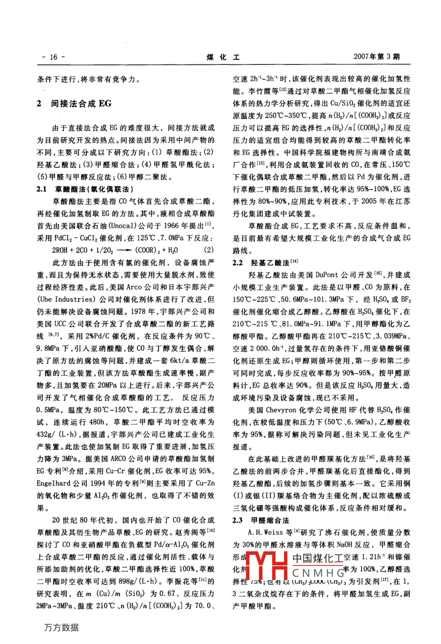 第3期(總第130期)煤化工No. 3(Total No. 130)2007年6月al Chemical IndustryJun.2007煤化工路線合成乙二醇技術(shù)研究進展李新柱陳瑤陳吉強(山東紅日阿康化工股份有限公司,臨沂276021)摘要煤制合成氣合成乙二醇的方法包括合成氣直接合成法及草酸酯法等間接合成法,介紹了合成乙二醇的工藝進展,并對各種方法的工藝技術(shù)特點進行了評述,提出煤化工替代石油合成路線制備乙二醇是具有發(fā)展前景的途徑。綜合考慮經(jīng)濟技術(shù)等條件,草酸酯法合成乙二醇工業(yè)化前景較好關(guān)鍵詞乙二醇合成氣草酸酯甲醇甲醛文章編號:1005-9598(2007)03-0015-04中圖分類號:TQ223.162文獻標識碼乙二醇(EG)是一種重要的石油化工基礎(chǔ)有機原C0+3H2催化劑 HOCHECH2料,主要用于生產(chǎn)聚酯纖維、防凍劑、不飽和聚酯樹該工藝的技術(shù)關(guān)鍵就在于催化劑的選擇。20世脂、潤滑劑、增塑劑、非離子表面活性劑以及炸藥涂紀70年代,美國聯(lián)碳公司UC)首先公布用羰基銠配料、油墨等行業(yè),此外,還可用于生產(chǎn)特種溶劑乙二醇合物作催化劑,從合成氣制EG.2,但所需壓力太高醚等,用途十分廣泛。目前,工業(yè)合成EG的主要方法(340MPa),催化劑活性不高且不穩(wěn)定。后使用三烷基是先經(jīng)石油路線合成乙烯,再氧化乙烯生產(chǎn)環(huán)氧乙膦和胺改性的銠作催化劑,并使用添加劑或促進劑,烷,最后由環(huán)氧乙烷非催化水合反應得到EG,此生產(chǎn)結(jié)果顯示其活性和選擇性明顯優(yōu)于羰基銠催化劑。實工藝的經(jīng)濟效益由于受石油價格的制約,波動較大°驗在56.OMPa、240℃、n(H2)/n(C0)為1的條件下進行特別是在當前石油價格持續(xù)走高的形式下,必然要求液相反應,EG選擇性為70%-85%,時空收率為280g/人們尋求更為經(jīng)濟的EG合成路線。而基于煤化工的(L·h)。該工藝具有能耗低的特點,但合成氣整體的EG合成工藝,以其原料來源廣泛和低廉、技術(shù)經(jīng)濟性轉(zhuǎn)化率和選擇性仍然很低。德士古公司把三價乙酰丙高等多項優(yōu)點,已經(jīng)成為研究熱點。尤其是對于我國酮化釘、乙酰丙酮化銠懸浮在四丁基膦溴化物上,構(gòu)這樣一個煤多、油少的國家來說開發(fā)煤工藝路線有成釕-銠雙金屬催化劑,在220℃C、286Ma、n(H)n著格外重要的意義。(C0)為1的條件下,也獲得了較高的EG收率。日本C1現(xiàn)有的媒合成EG工藝路線,是從媒制得的合成化學技術(shù)研究協(xié)作組通過在銠催化劑中加入特殊的氣出發(fā)制EG,其工藝分為直接工藝和間接工藝。直接添加劑和輔助材料23),可使C轉(zhuǎn)化率達到60%,時空工藝即由合成氣直接合成EG;間接工藝是合成氣經(jīng)收率大于250g/(L·h)。研究還表明,當采用銠和釕均某種中間化合物,如甲醇、甲醛等后再轉(zhuǎn)化為EG。相系催化劑時,EG選擇性達57%,時空收率達259g1直接法合成EGMatsuda t等以鈷、銠為催化劑的研究表明,EG選擇性隨氫分壓的增大而顯著增大。而對于反應機理從理論上講,由合成氣一步合成EG是一種最為的研究,則普遍認為HCHO·是反應過程的中間體,生簡單和有效的方法,即使反應選擇性和轉(zhuǎn)化率較低成該中間體的過程及其形態(tài)決定了催化反應的活性也具有很大的實際應用價值,反應方程式如下和選擇性。M凵中國煤化工是合成壓力太高收稿日期:200702-08所用CNMHG,但在高溫下穩(wěn)定作者簡介:李新柱(1975-),男,1999年畢業(yè)于山東礦業(yè)性變左,惟化們助們,開發(fā)在較低壓力和學院化工工藝專業(yè),工程師,主要從事煤化工產(chǎn)品深加工溫度下顯示高活性且穩(wěn)定的催化劑,將仍是直接法研技術(shù)開發(fā)。究的重點,但是如果有所突破,使反應在比較溫和的007年第3期條件下進行,將非常有競爭力??账?h~3h時,該催化劑表現(xiàn)出較高的催化加氫性能。李竹霞等2通過對草酸二甲酯氣相催化加氫反應2間接法合成EG體系的熱力學分析研究,得出Cu/Si02催化劑的適宜還原溫度為250℃-350℃,提高n(H)/n[(C00)2或反應由于直接法合成EG的難度很大,間接方法就成壓力可以提高EG的選擇性,n(H2)/m[(CO02和反應為目前研究開發(fā)的熱點。間接法因為采用中間產(chǎn)物的壓力的適宜組合均能得到較高的草酸二甲酯轉(zhuǎn)化率不同,主要可分成以下研究方向:(1)草酸酯法;(2)和FG選擇性。中國科學院福建物構(gòu)所與南靖合成氨羥基乙酸法;(3)甲醛縮合法;(4)甲醛氫甲?;?廠合作1,利用合成氨裝置回收的C0,在常壓、150℃(5)甲醛與甲醇反應法;(6)甲醇二聚法下催化偶聯(lián)合成草酸二甲酯,然后以Pd為催化劑,進2.1草酸酯法(氧化偶聯(lián)法行草酸二甲酯的低壓加氫,轉(zhuǎn)化率達95%~100%,EG選草酸酯法主要是指C0氣體首先合成草酸二酯,擇性為80%-90%,應用此專利技術(shù),于2005年在江蘇再經(jīng)催化加氫制取EG的方法。其中,液相合成草酸酯丹化集團建成中試裝置首先由美國聯(lián)合石油(noca)公司于1966年提出,草酸酯合成EG,工藝要求不高,反應條件溫和,采用PdCl2-CuC12催化劑,在125℃、7.OMPa下反應是目前最有希望大規(guī)模工業(yè)化生產(chǎn)的合成氣合成EG2ROH+2C0+1/202(CO0R)2+H0(2)路線。此方法由于使用含有氯的催化劑,設(shè)備腐蝕嚴22羥基乙酸法重,而且為保持無水狀態(tài),需要使用大量脫水劑,致使羥基乙酸法由美國 DuPont公司開發(fā),并建成過程經(jīng)濟性差。此后,美國Arco公司和日本宇部興產(chǎn)小規(guī)